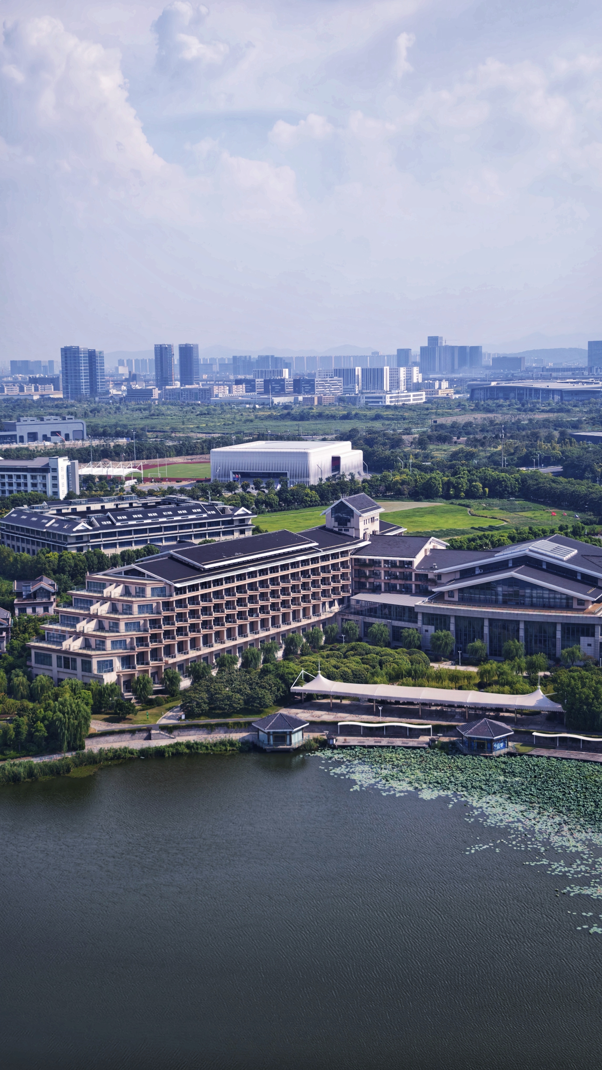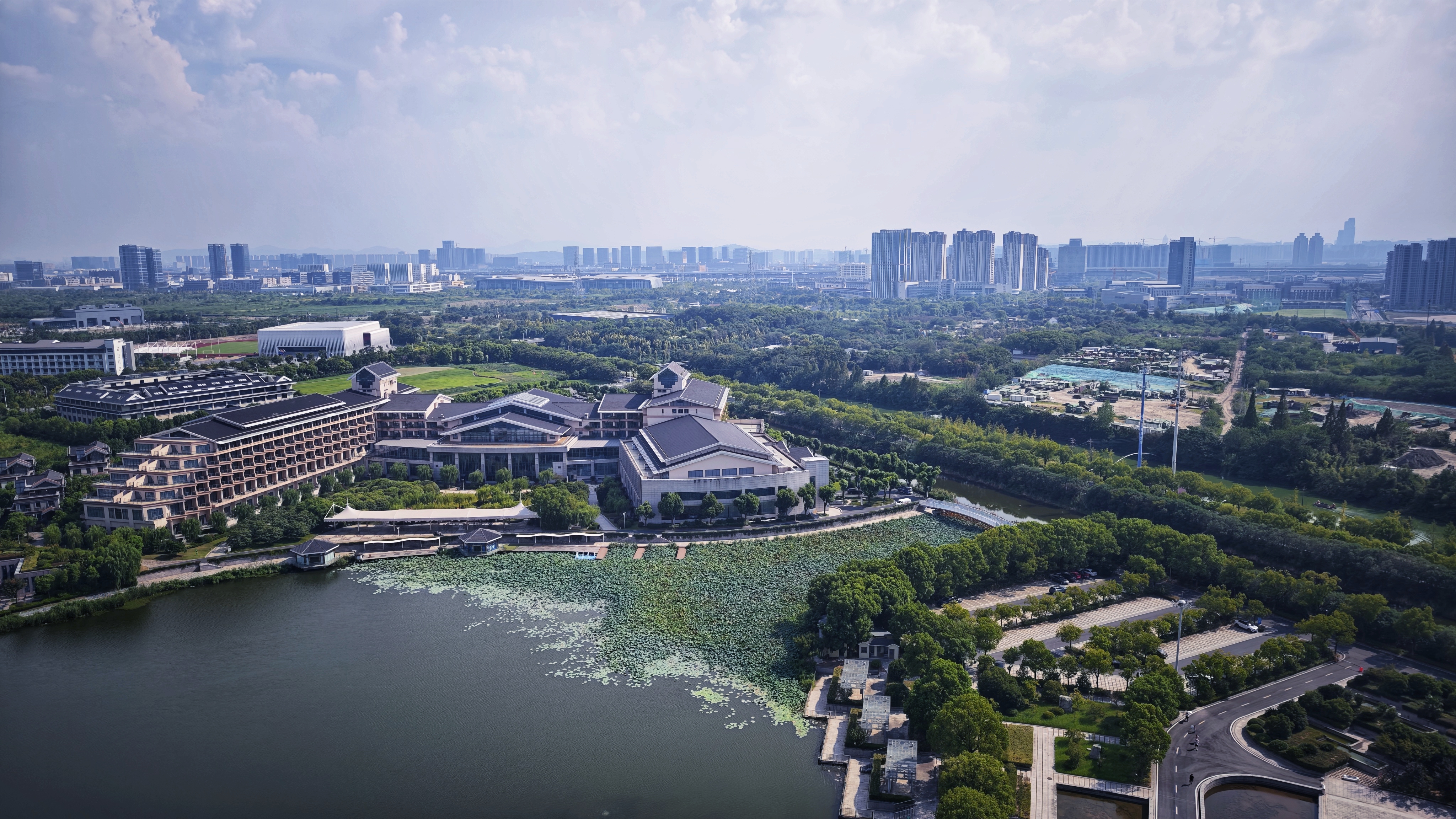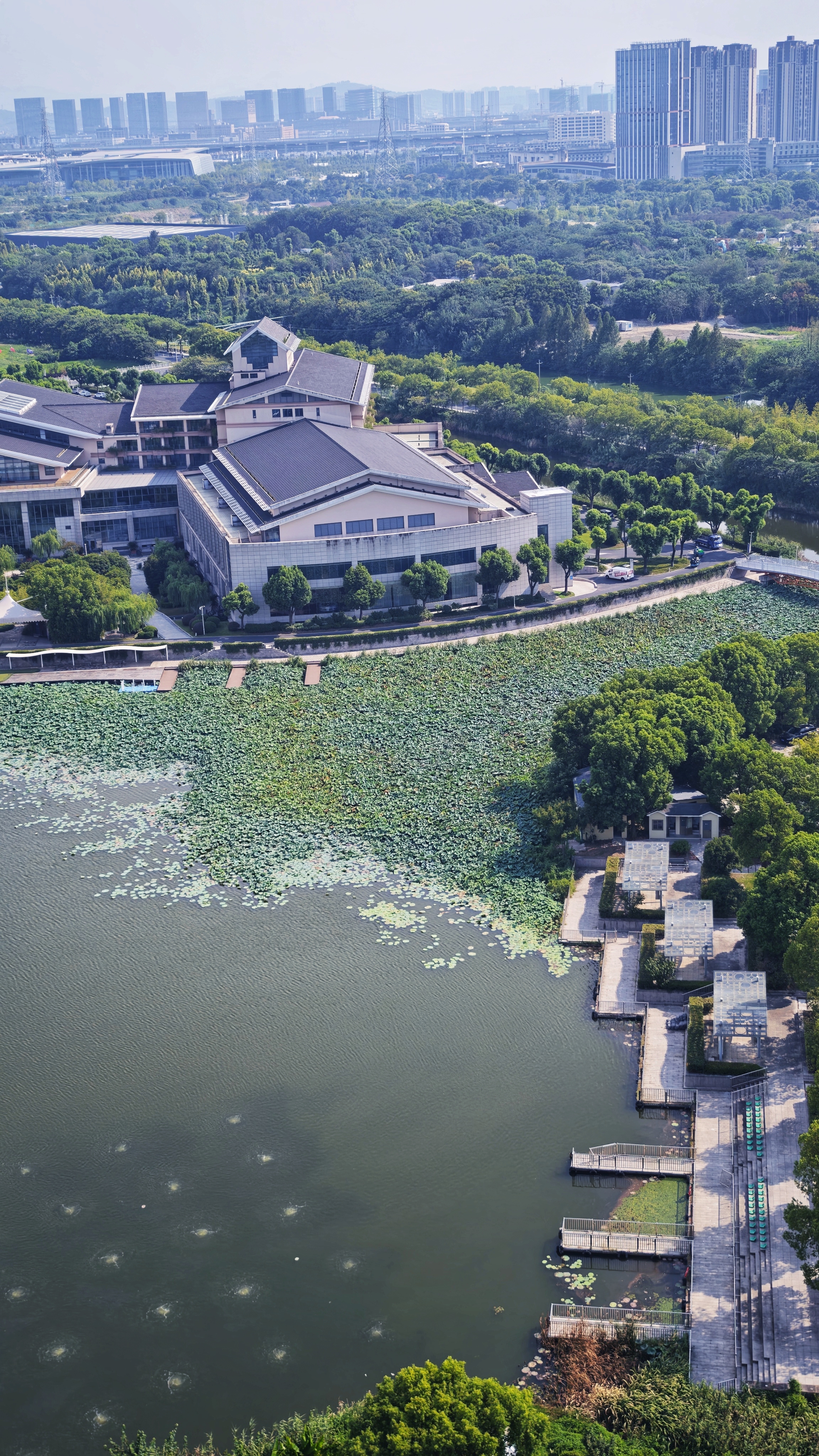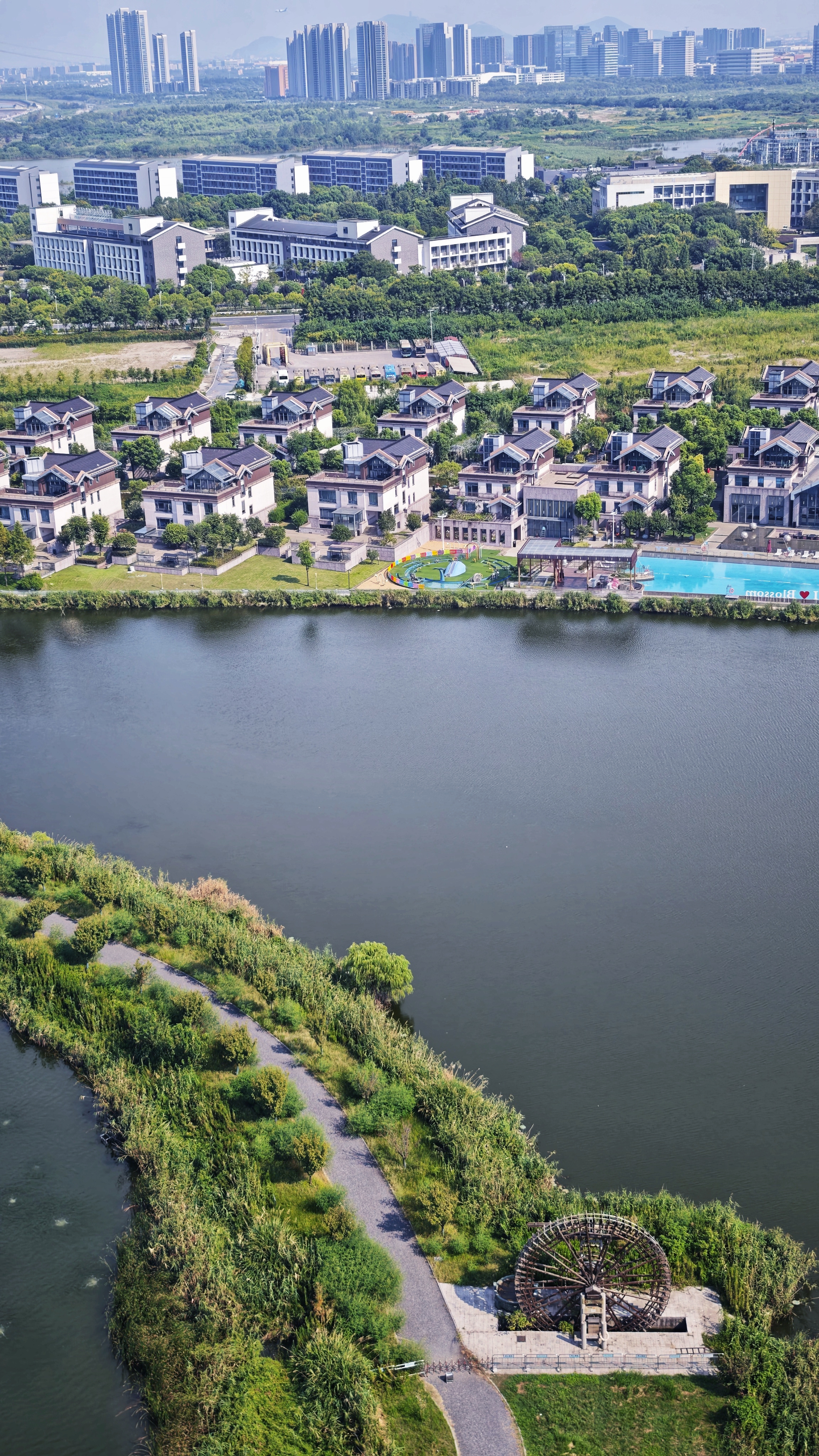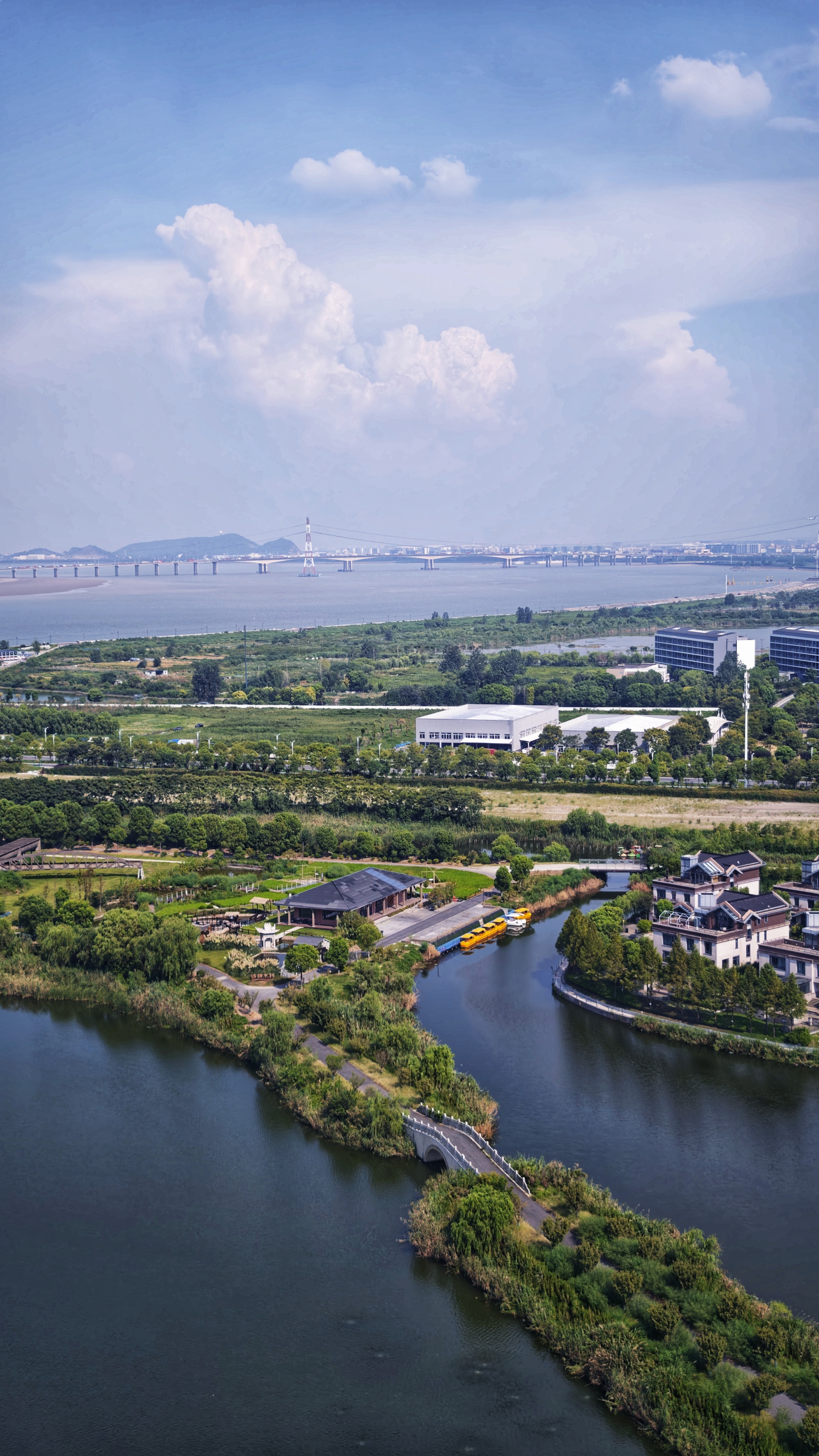 上帝视角看城市,河湖如镜,建筑与自然相融,远处桥梁横跨江面,勾勒出一幅现代与生态共生的画卷。
