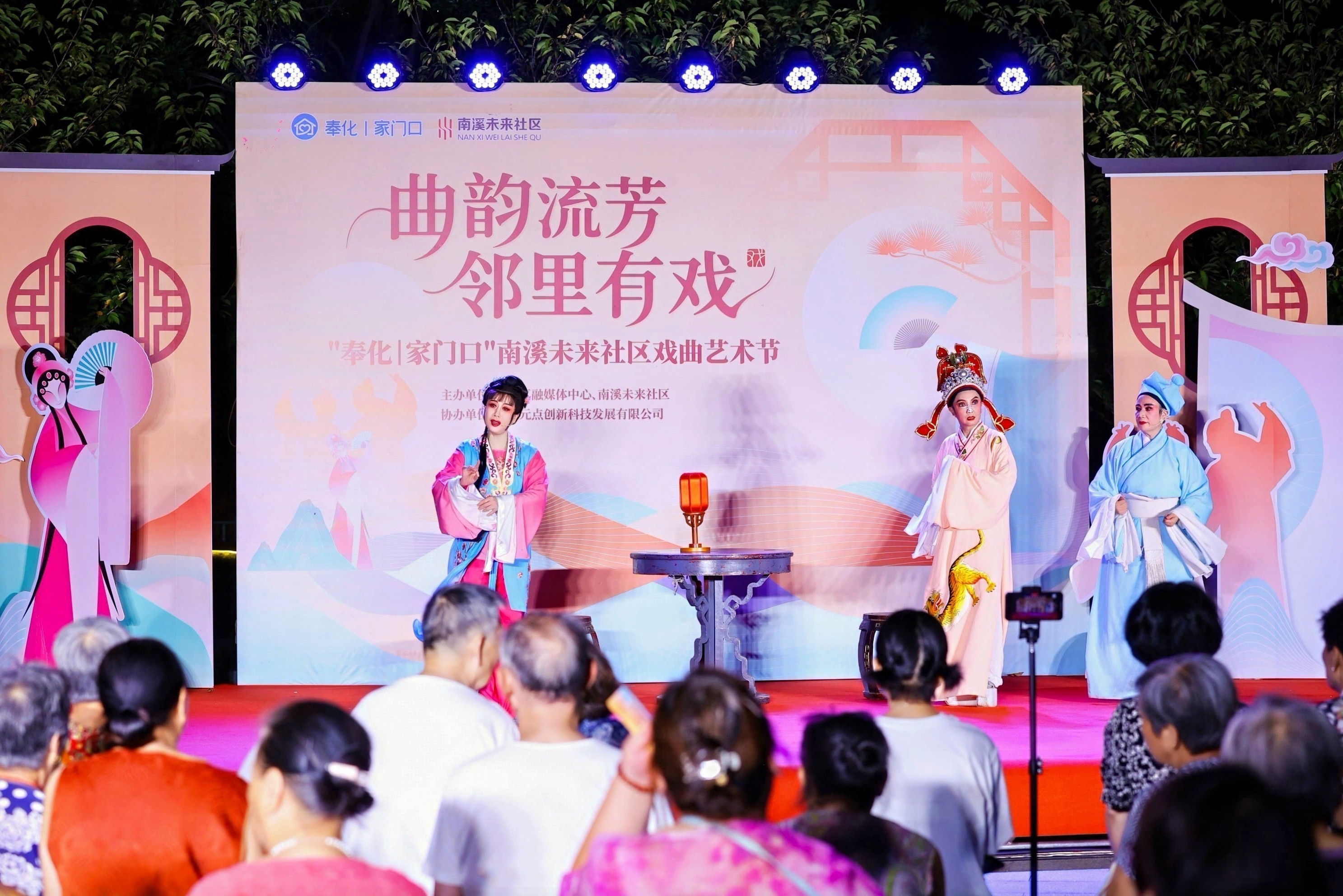 丝竹声声入耳,唱腔婉转悠扬。8月22日晚,锦屏街道南溪公园灯火璀璨,欢声笑语不断,由“奉化丨家门口”社区平台和南溪未来社区联合举办的戏曲艺术节在这里盛大举行。本次戏曲艺术节以“曲韵流芳·邻里有戏”为主题,融合了传统戏曲精粹、互动体验与市集烟火气,为社区居民带来一个沉浸于吴侬软语、沉醉于夏夜温情的难忘夜晚。