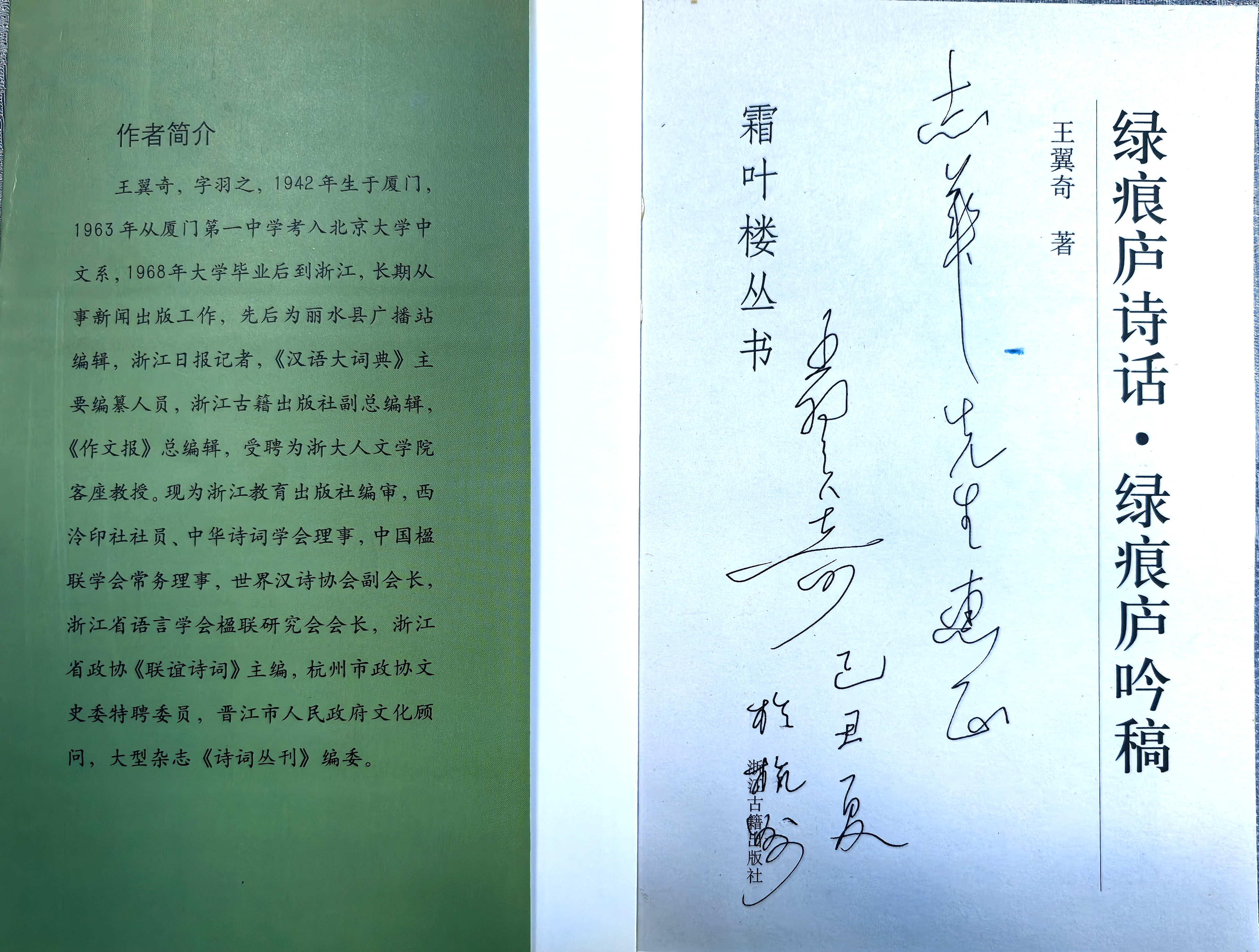 鹧鸪天 痛悼王翼奇先生 诗话吟稿岁月钟,亦师亦友赐吾功。文坛播雨花如锦,痕绿薪传情似虹。 才八斗,德千重,龙蛇走笔阁亭中。当年妙说行行行,今思佳联泪洒空。 【注】行行行读“hanghangxing”