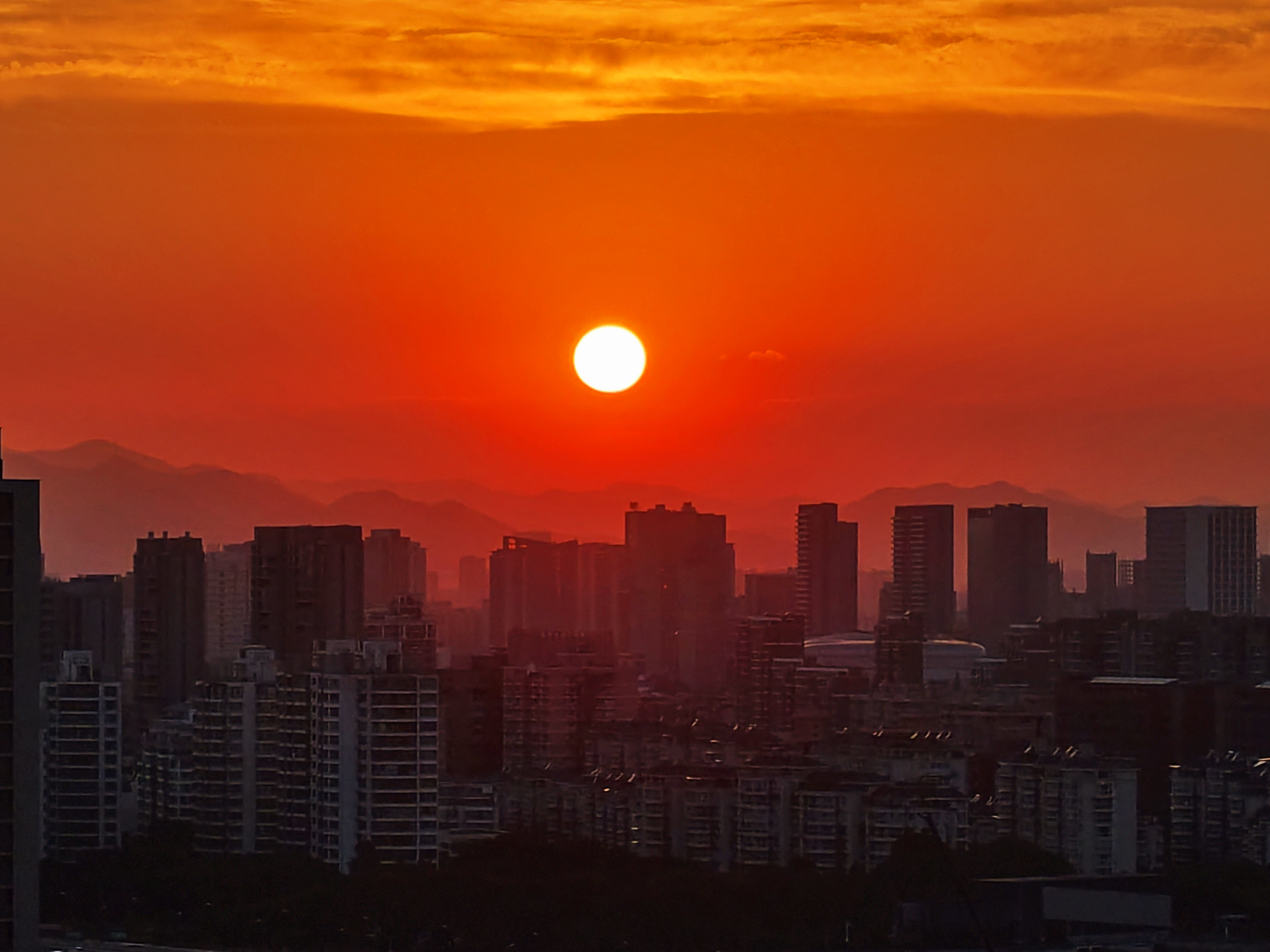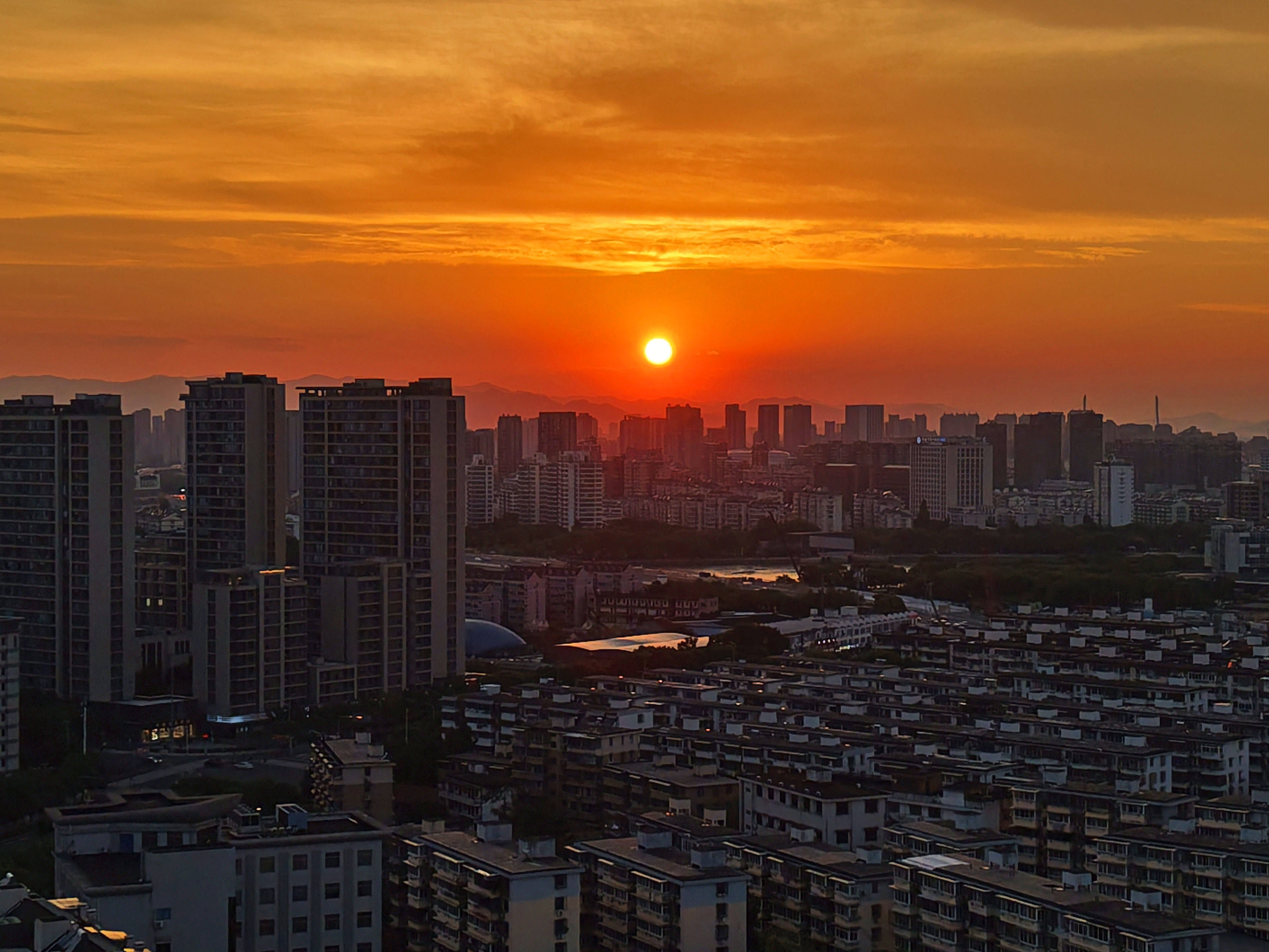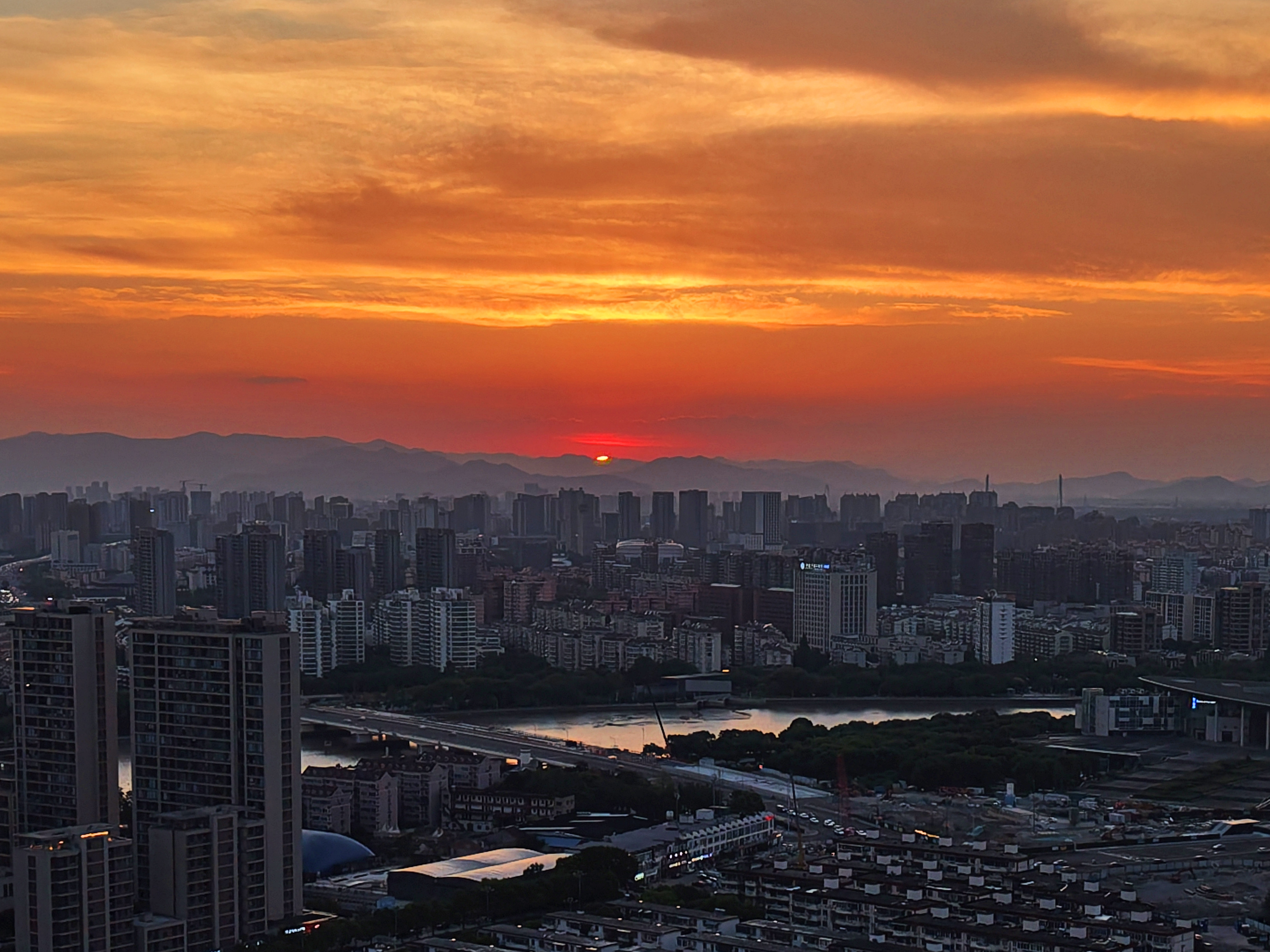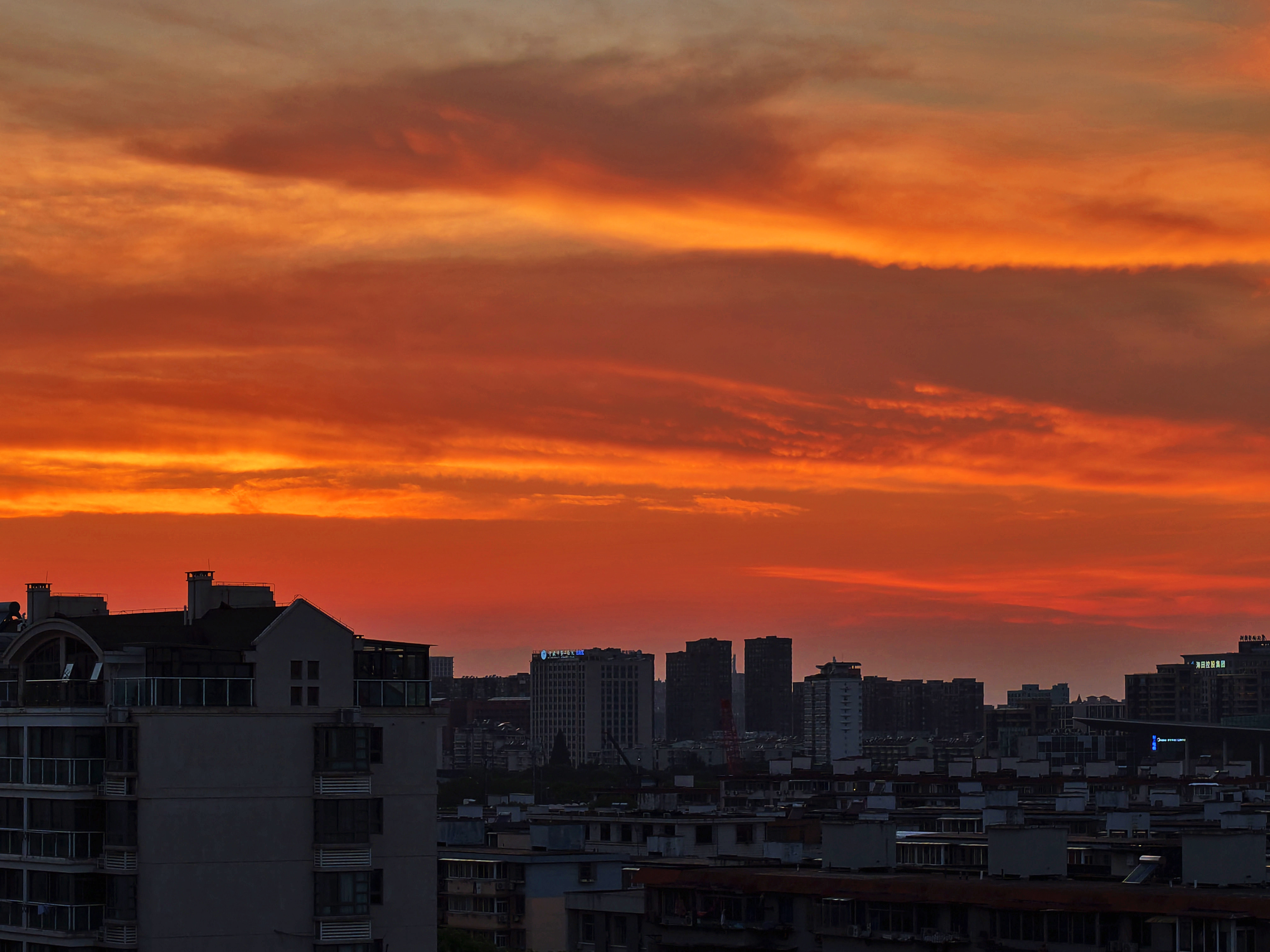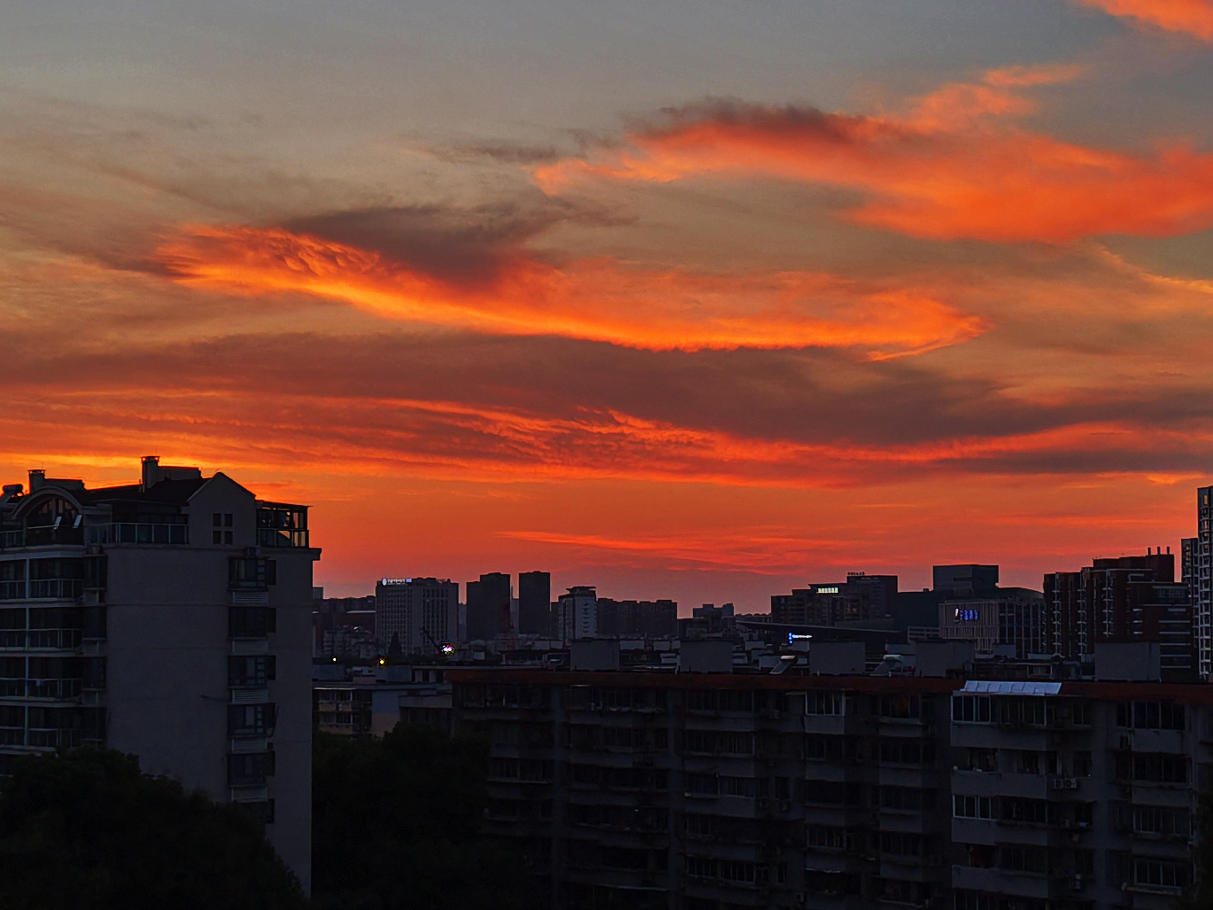 今日处暑,甬城天空火红晚霞,热并绚丽着。