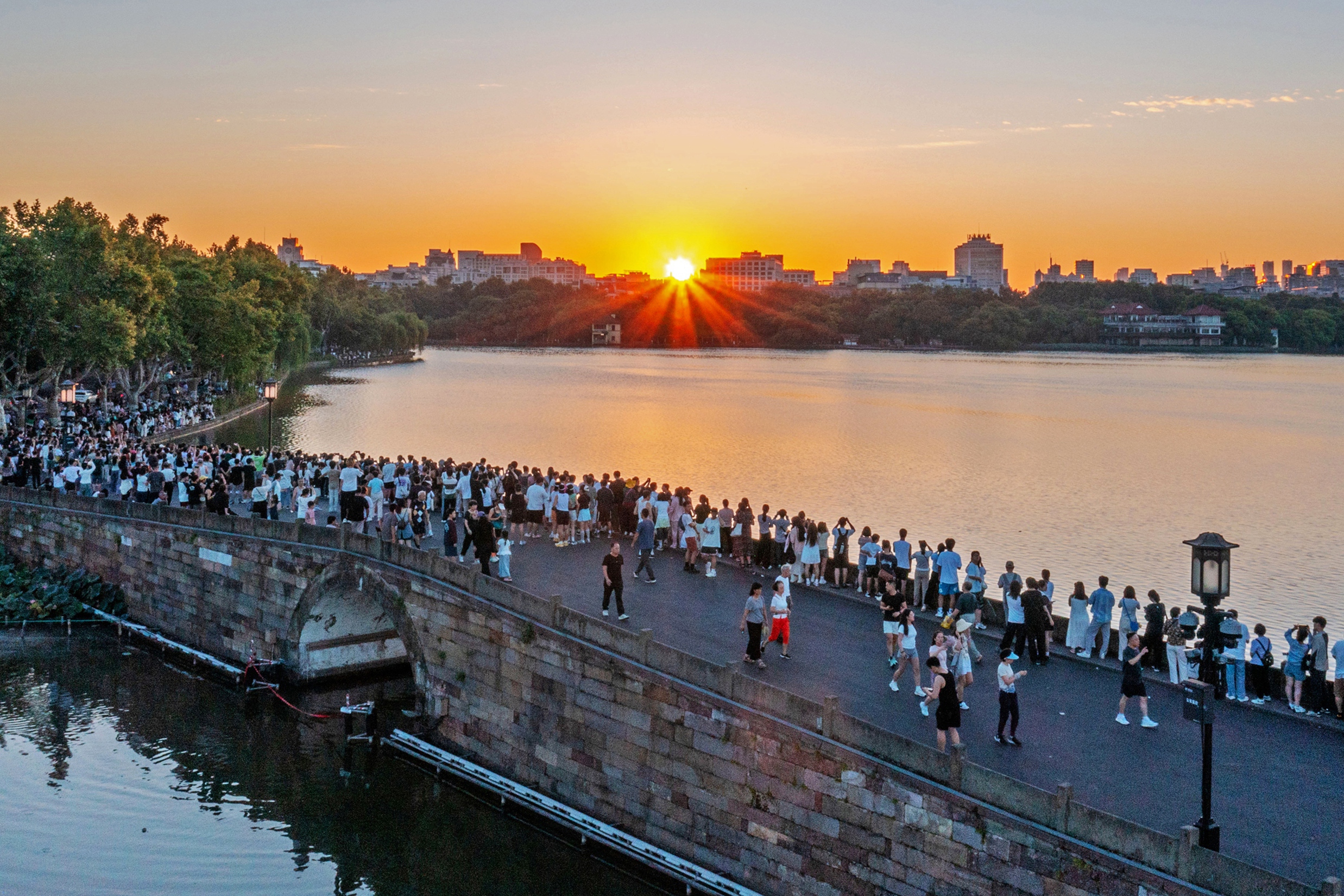 今天清晨西湖断桥上赏日出的游客。摄于8月24日