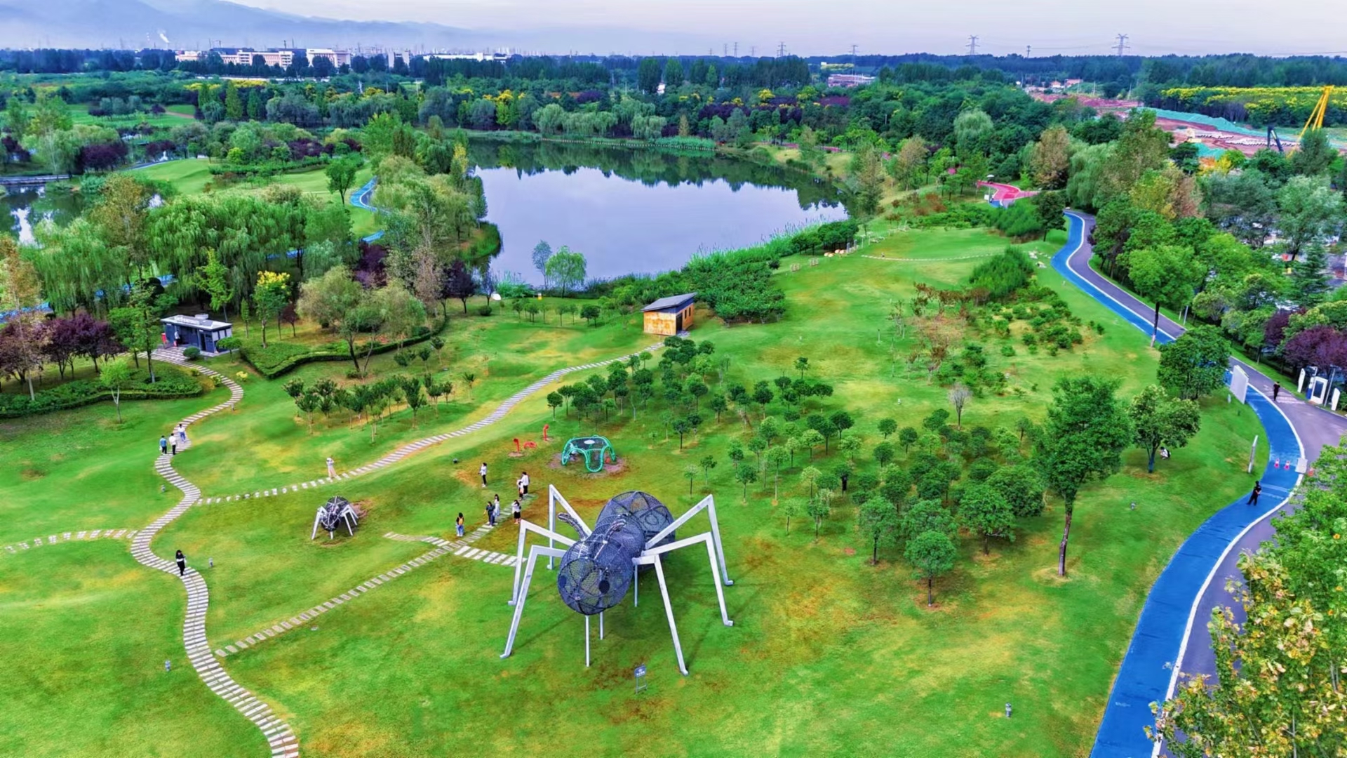 今日闲逛西安高新区梁家滩湿地公园,仿佛走进了一幅生动的画卷!湿地公园里,人工湖碧波荡漾,荷花与荷叶轻摇,水生植物点缀其间,一派悠然自得的生态美景。漫步绿道,沿途的景观小品和蜘蛛雕塑趣味横生。抬头远望,山景与城市绿地交织,休闲步道上欢声笑语不断。儿童游乐区里,孩子们的笑声清脆悦耳。草坪上,树木葱郁,空中俯瞰,公园全景尽收眼底。这里真是城市中的绿肺,现代园林设计与自然风光完美融合,户外活动的好去处!