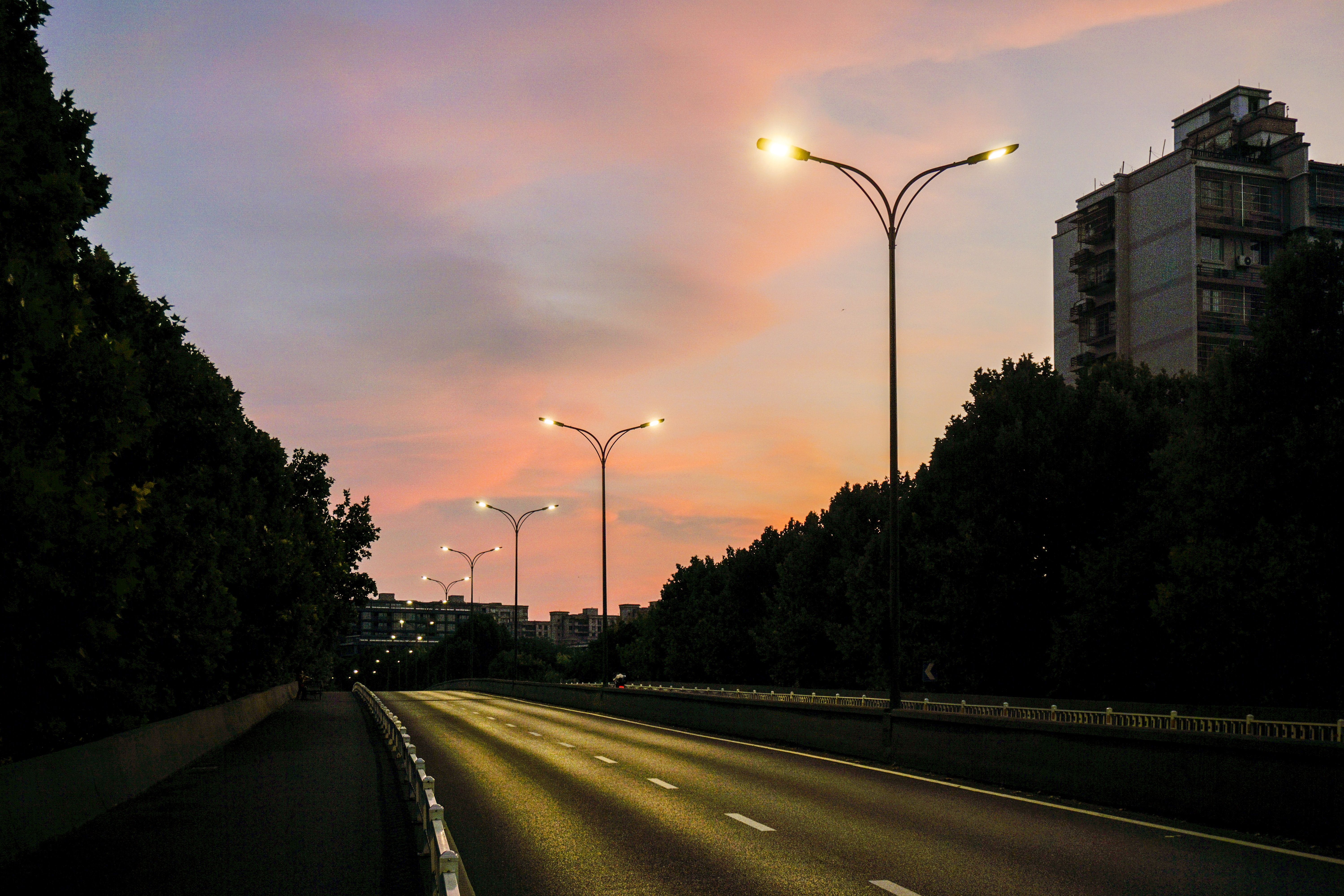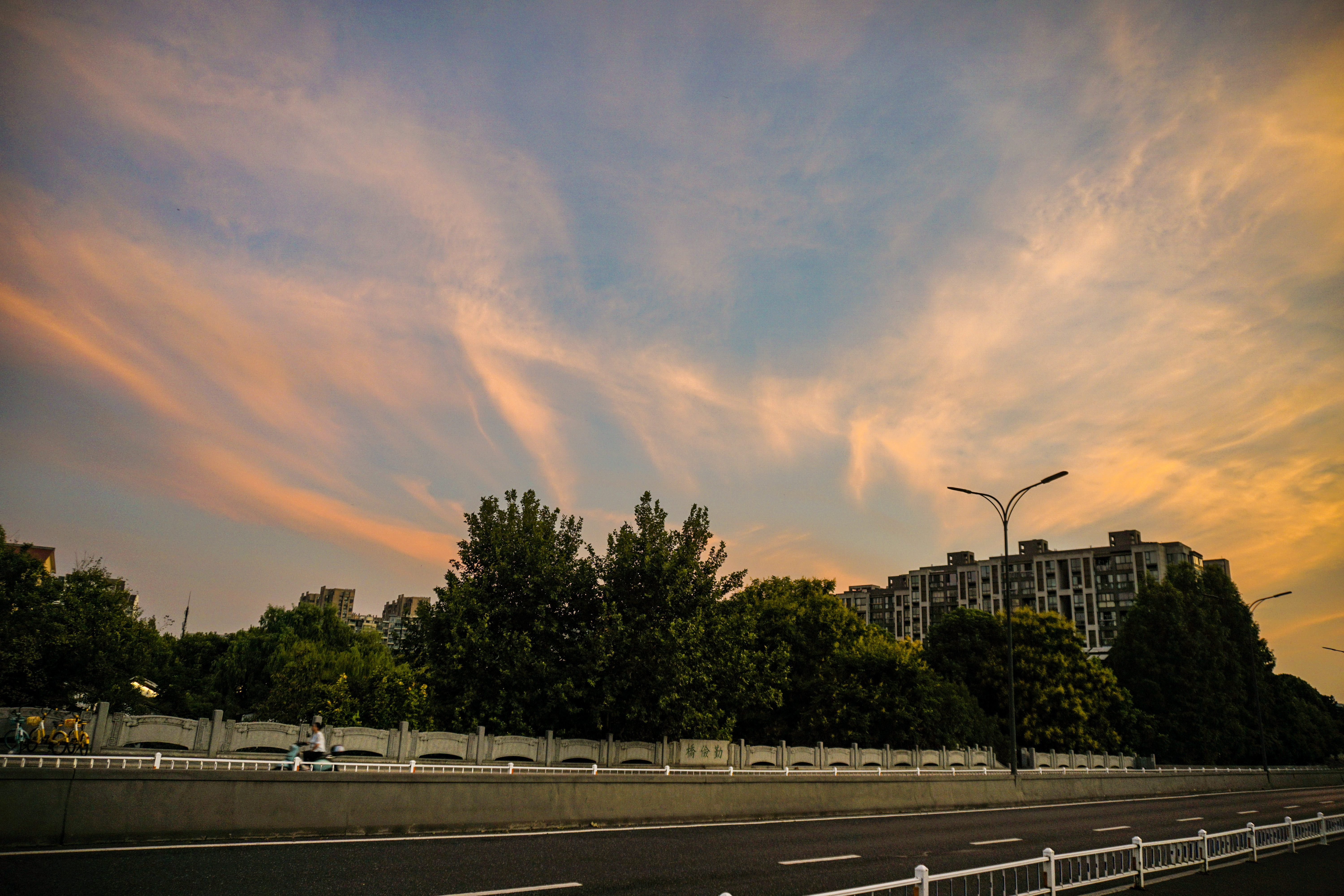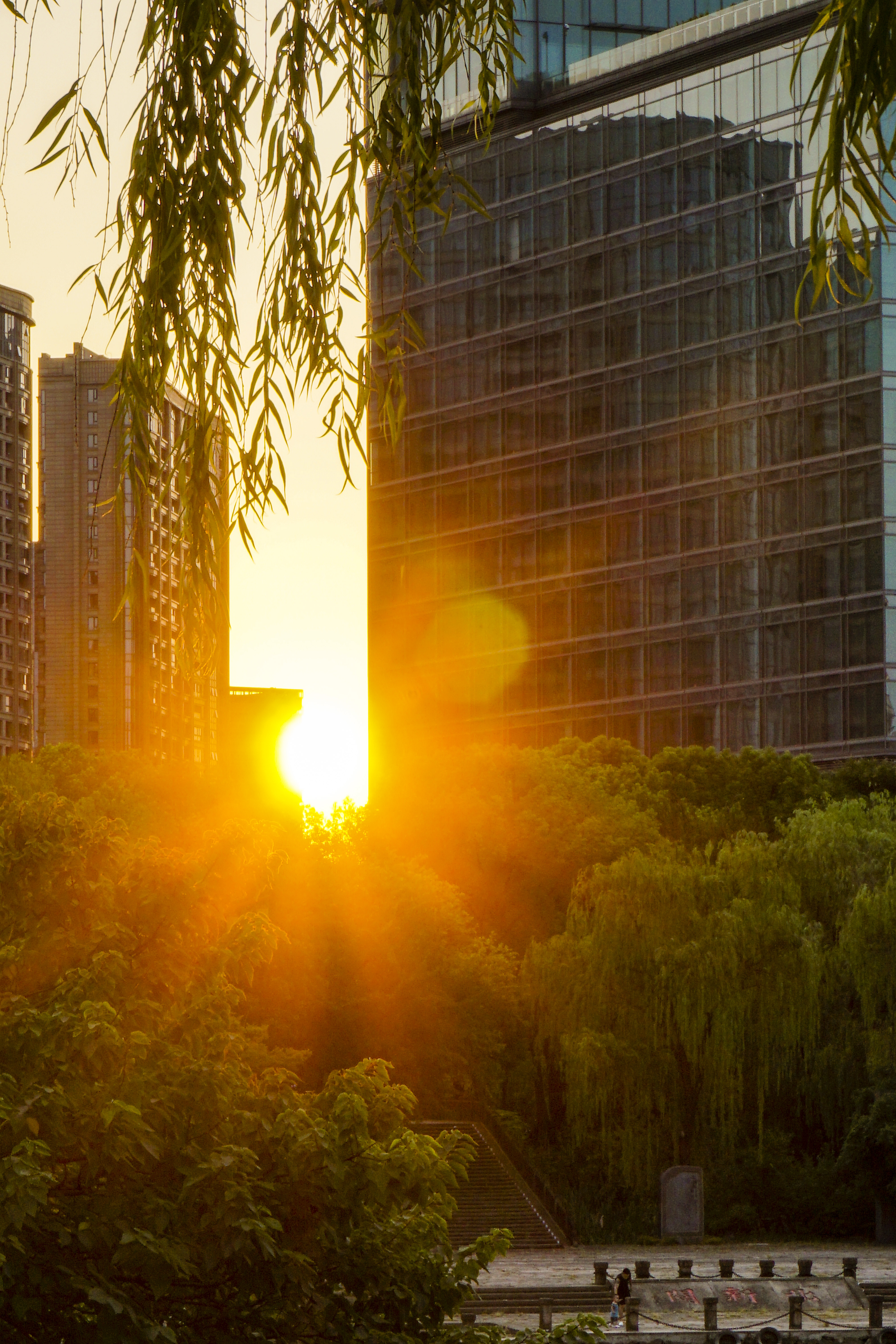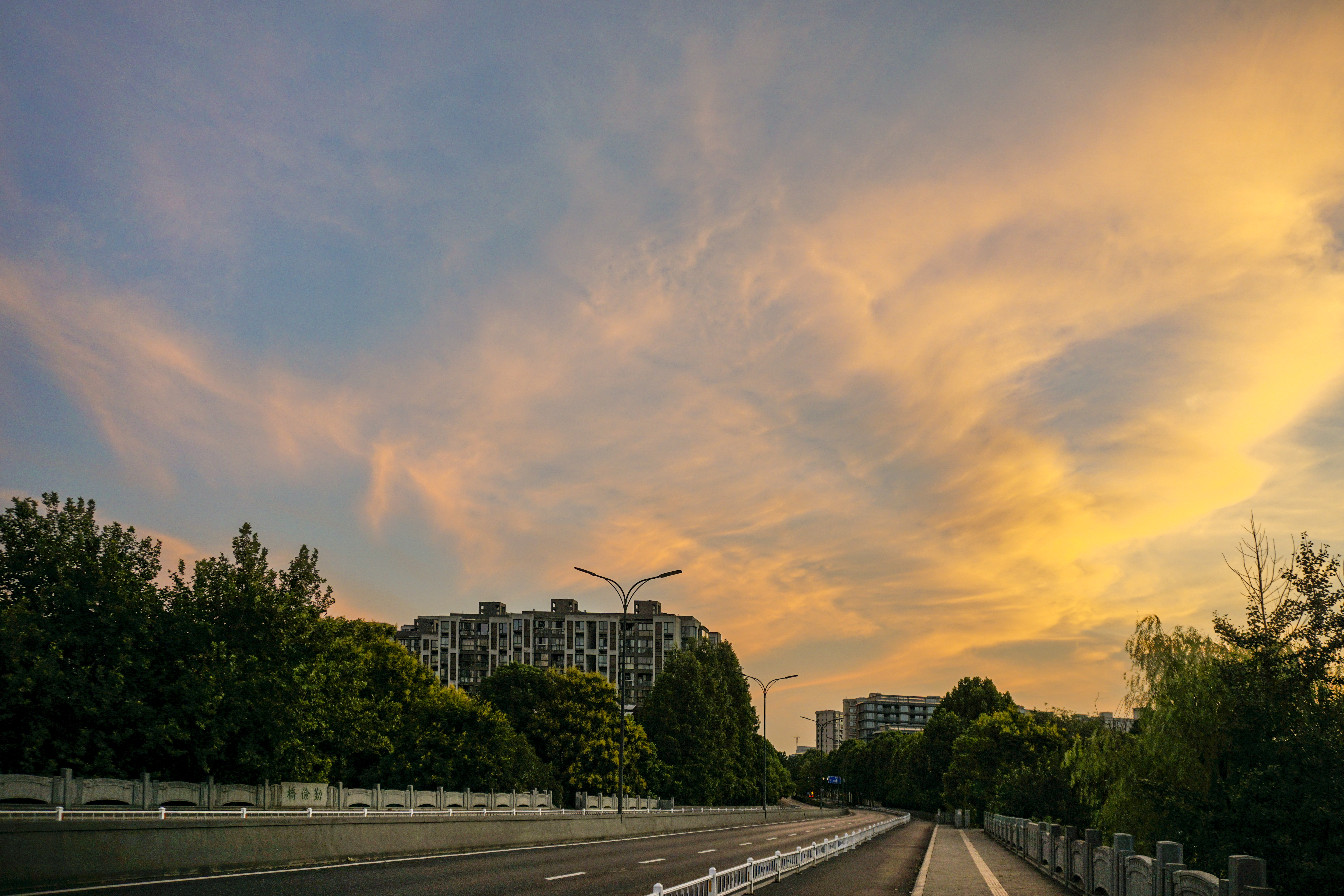 静谧的清晨,勤俭桥上红霞满天,康家桥,初升太阳贴着建筑夹缝喷薄而出。
