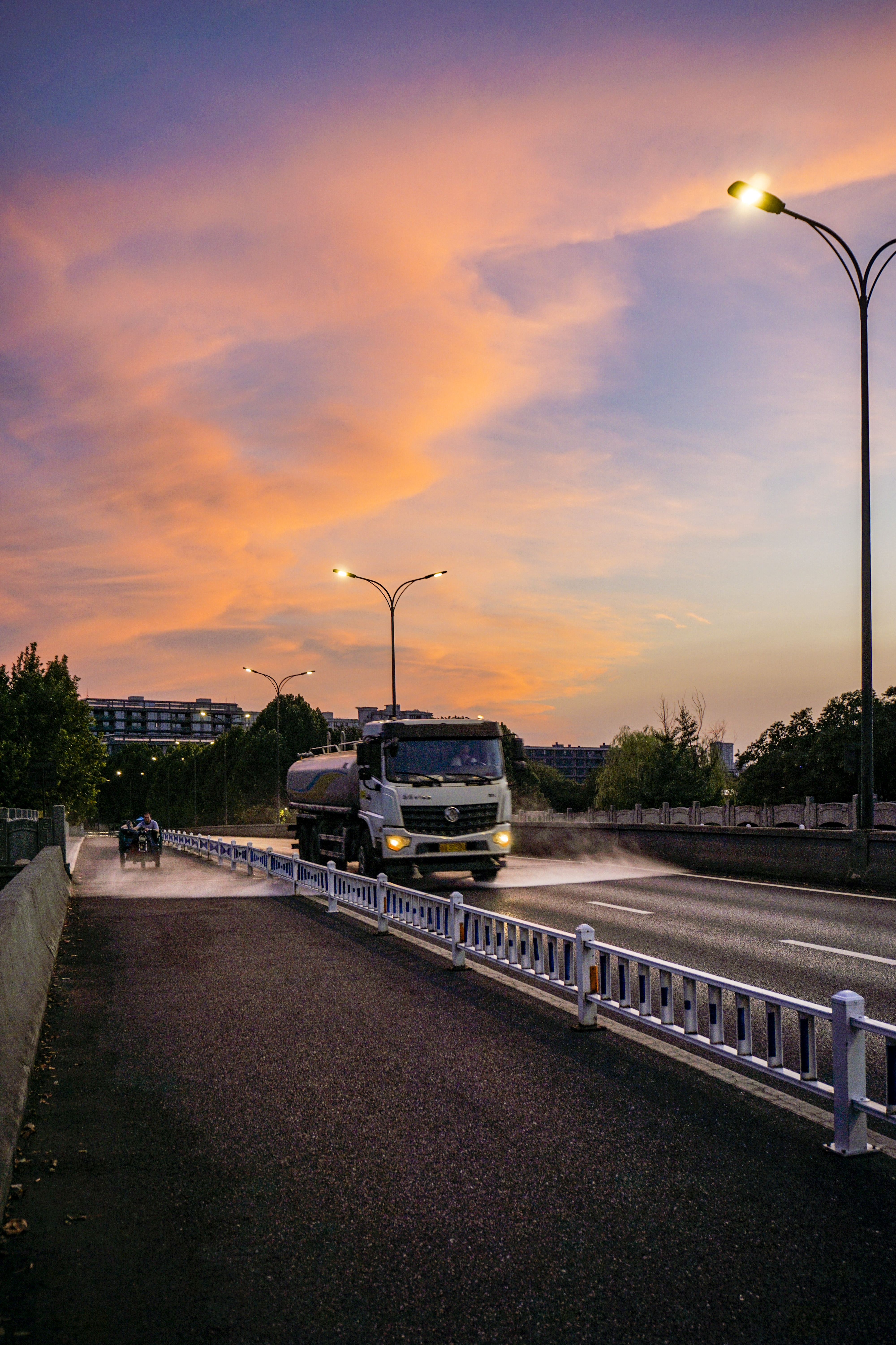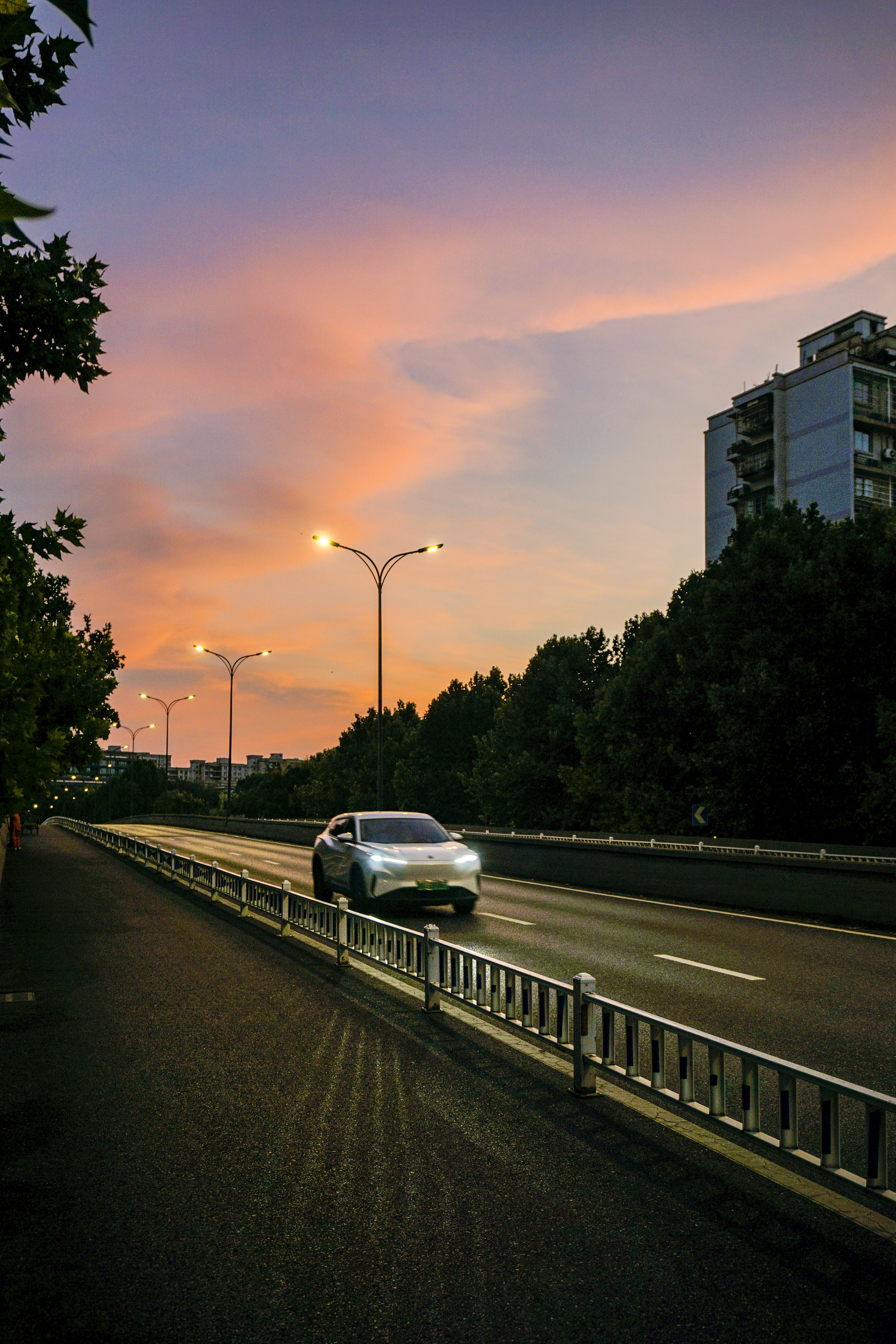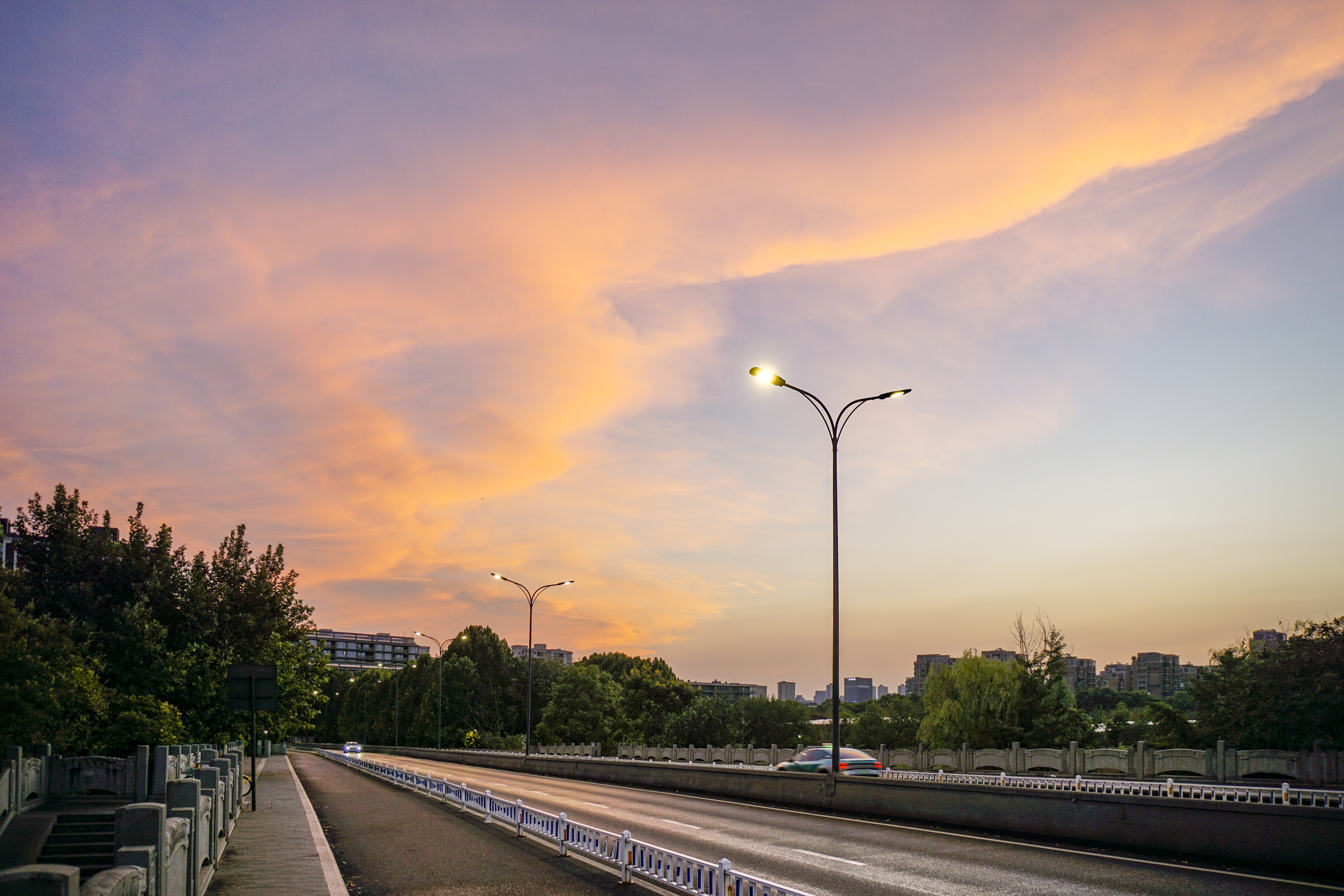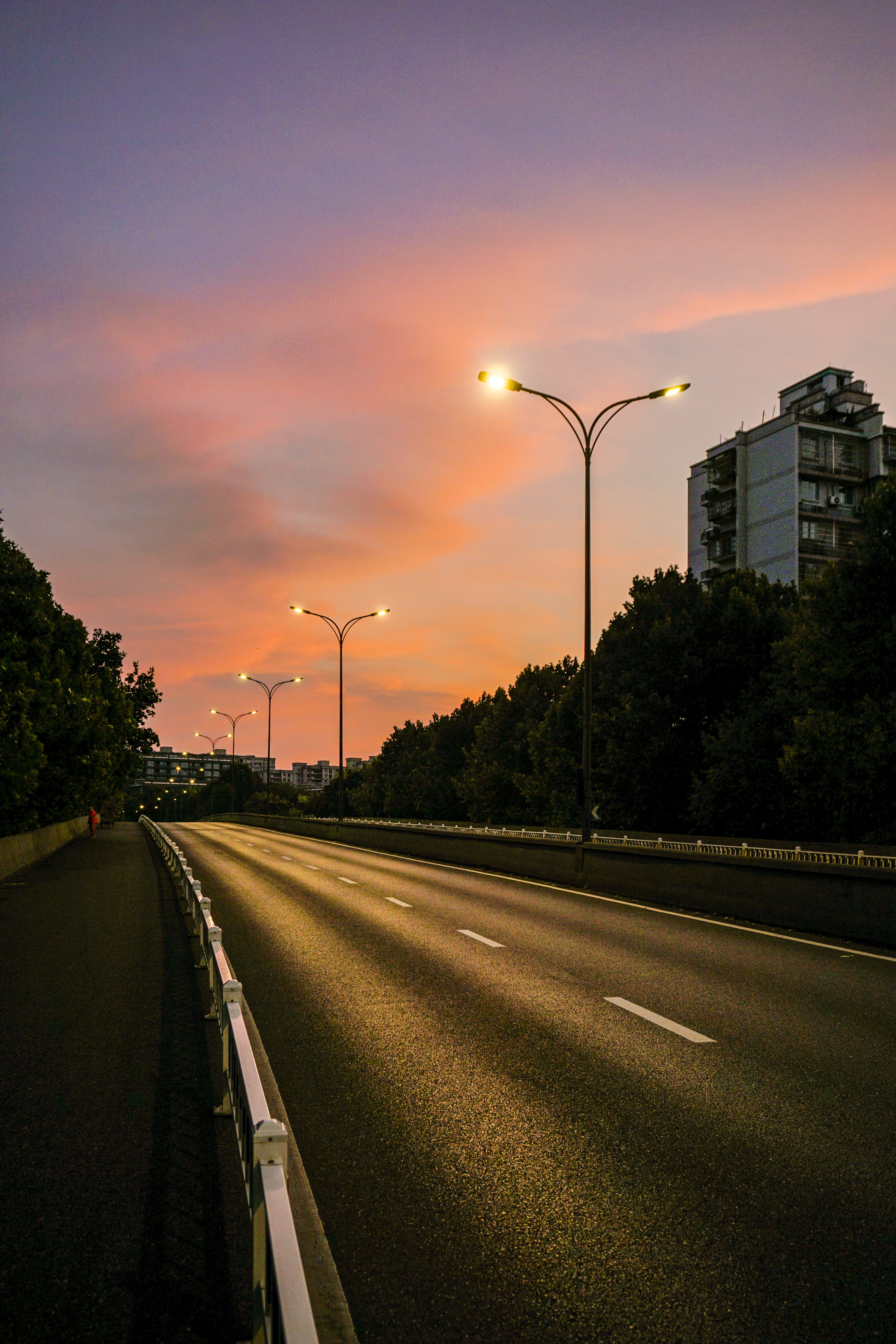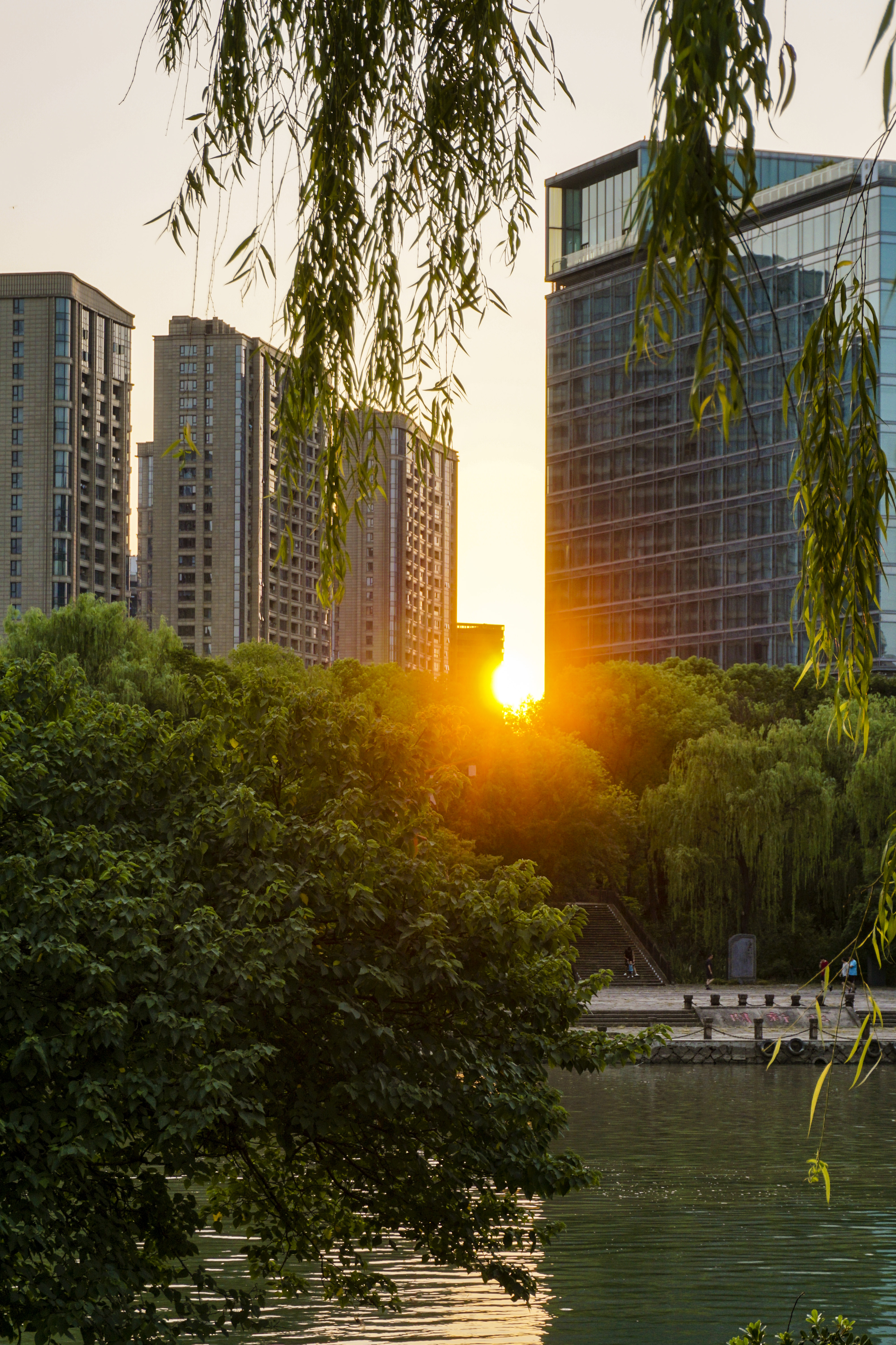静谧的清晨,勤俭桥上红霞满天,康家桥,初升太阳贴着建筑夹缝喷薄而出。