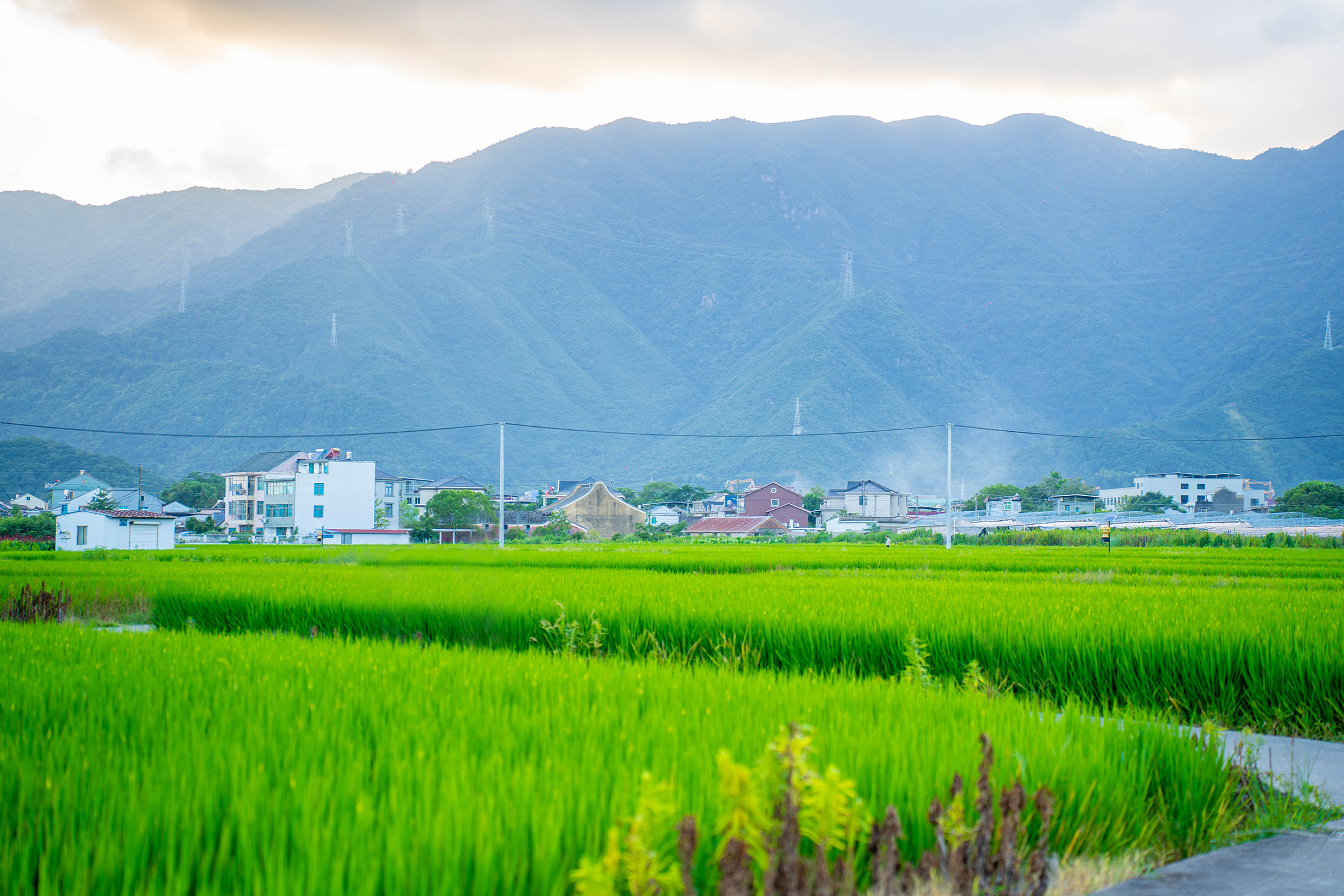 稻乡如画 心归自然 远山如黛,稻浪翻涌,屋舍点缀其间,于此悠然之境,让山风与稻香拂去所有疲惫。(杨学凯/摄)