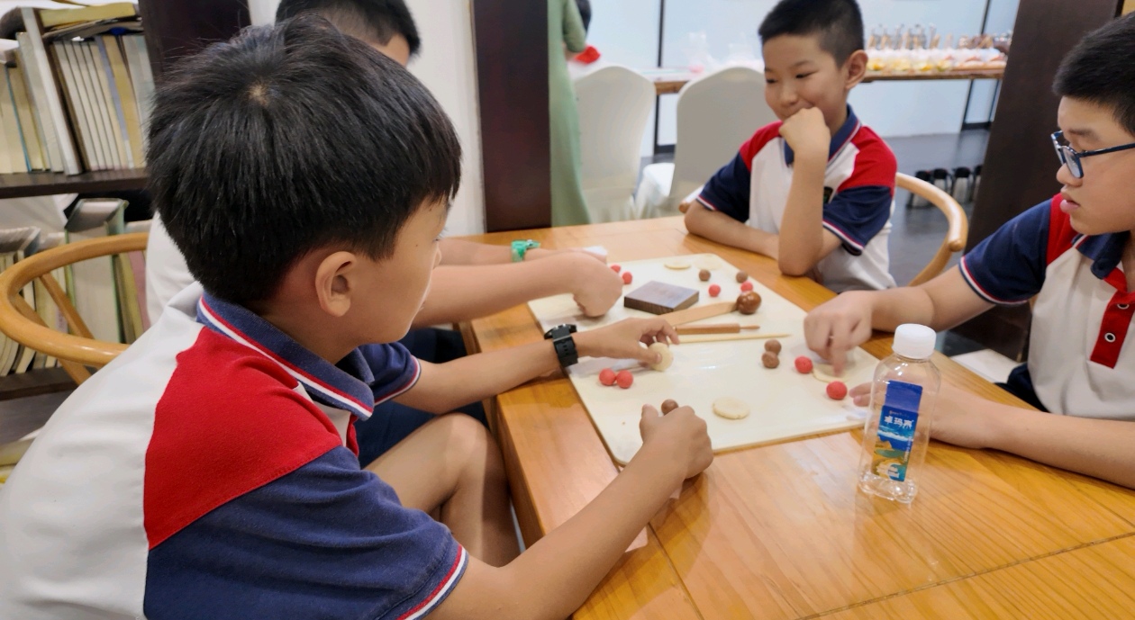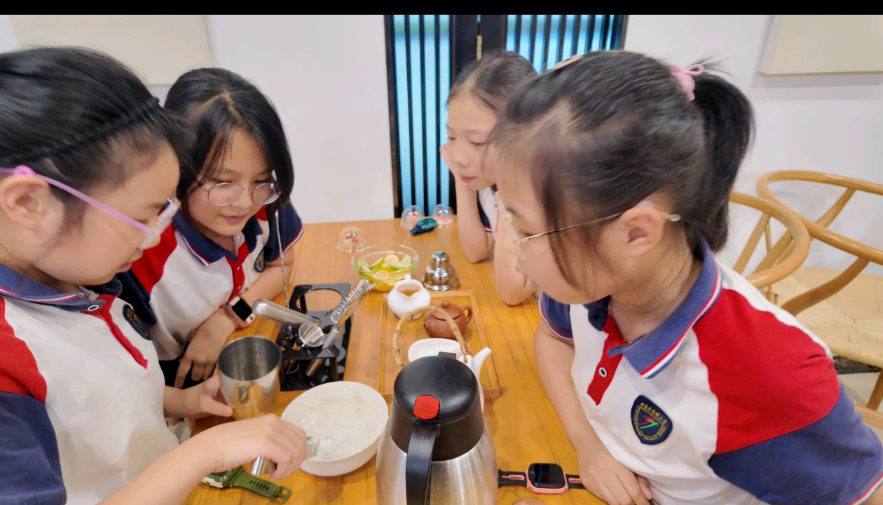 #潮闻小记者#绍兴新昌县南明小学章晋晨 “美育润童心 非遗伴童年 ” 南明小学四(3)班暑期实践非遗茶果活动 8月18号下午,我们南明小学四(3)班的同学可开心啦,因为我们要去唐诗之路研学营地,体验超有意思的非遗茶果子制作!早就听说茶果子是传统文化里的宝贝,不仅好吃,还藏着好多文化故事,一想到能亲手做,我心里就美滋滋的。 到了营地,老师先给我们讲了茶果子的做法,然后我们就化身小小“点心匠人”,开始动手啦。你看,我们拿着软糯的馅料和面皮,小心翼翼地揉啊揉,先搓成圆滚滚的小球,再轻轻压扁,把馅料包进去。最神奇的是,不用那些花里胡哨的现代模具,就靠一双手,再加上木棒、木蛋这些简单的工具,就能做出各种好看的造型。我旁边的同学正皱着眉头,一点点捏花瓣的棱角,那认真的样子,好像在完成什么大工程;还有人眼睛亮晶晶的,用工具压出了小兔子的耳朵,别提多可爱了!还有人突发奇想,做了个“肥牛卷”,大家看了都笑说太像了,简直能以假乱真。虽然我们的手法还有点生涩,但每一个动作都藏着我们对这门老手艺的喜欢呀。 做好了茶果子,当然得配茶才完美!老师说要教我们做夏季冷饮——冰镇柠檬红茶,用的都是家里常见的柠檬、红茶、冰块和蜂蜜,健康又好喝。我赶紧拿起雪克杯,把柠檬和冰块放进去,然后拿起小锤子“暴打”柠檬,虽然动作笨手笨脚的,但听着冰块碰撞的声音,还有大家的笑声,整个教室都热热闹闹的。接着倒入泡好的红茶,加上适量的糖,一杯带着我们手印的柠檬茶就做好啦,喝一口,哇,太清爽了! 这次体验真的好棒,我们不仅学会了做茶果子和柠檬茶,更感受到了传统文化的魅力。原来用心去做一件事,能收获这么多快乐呀!