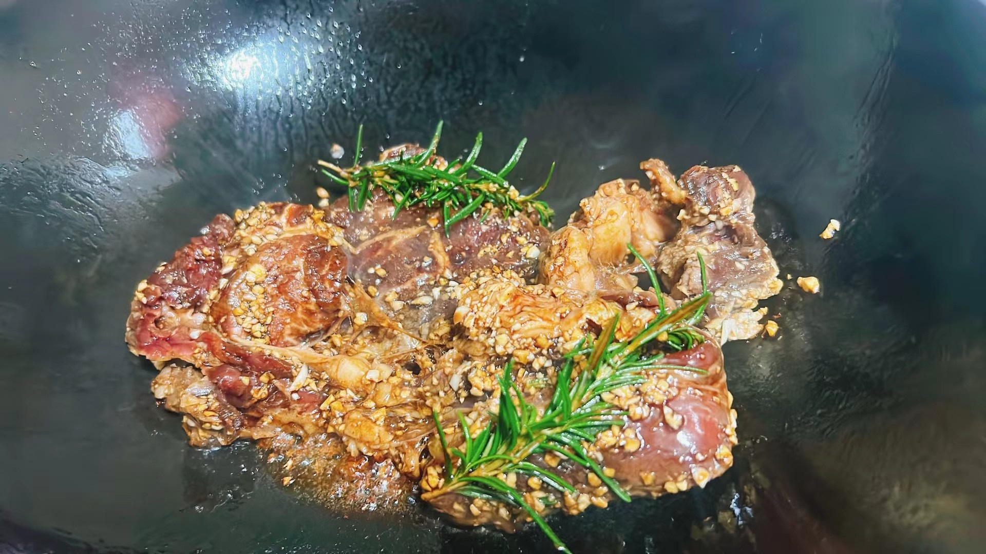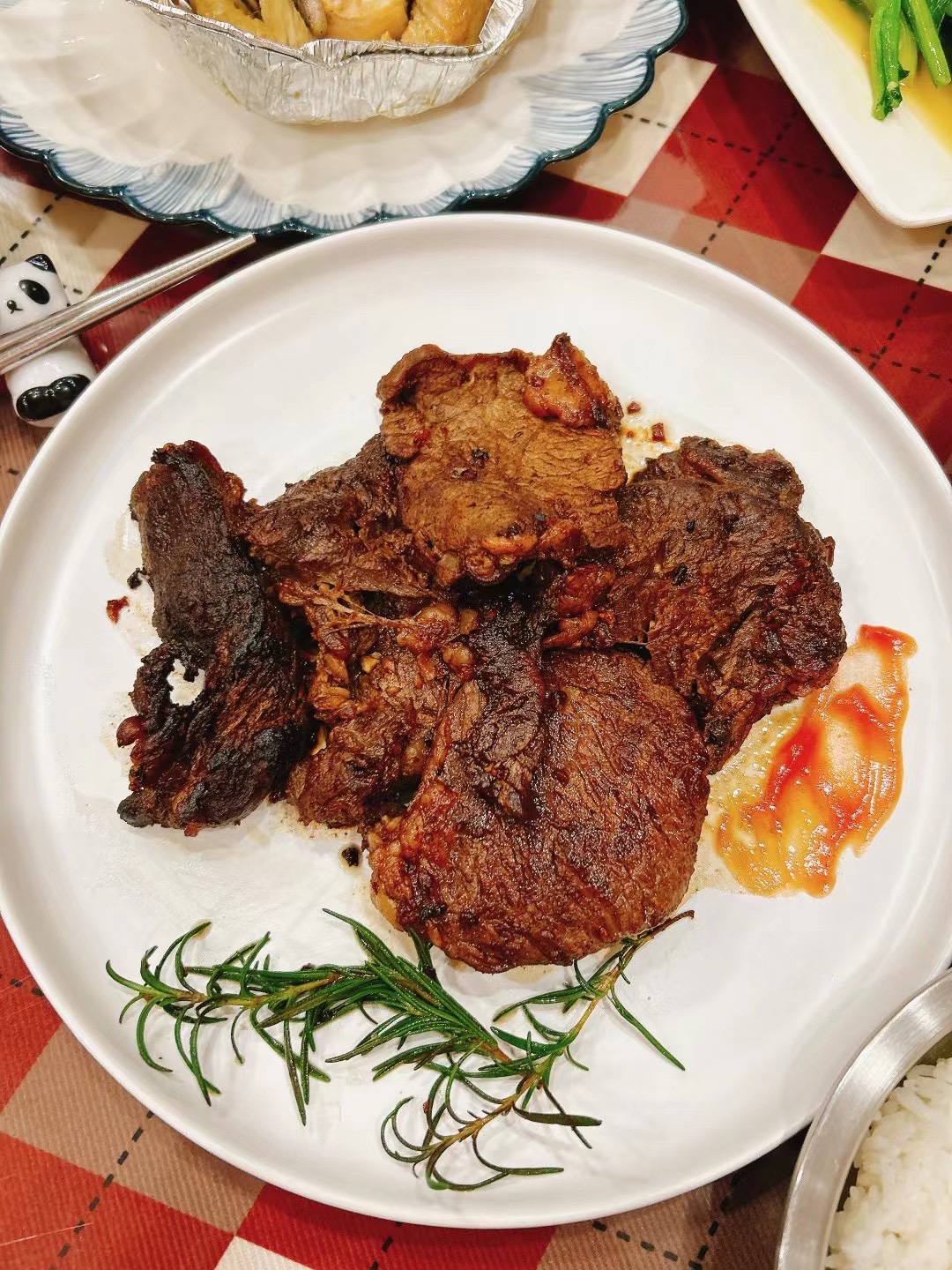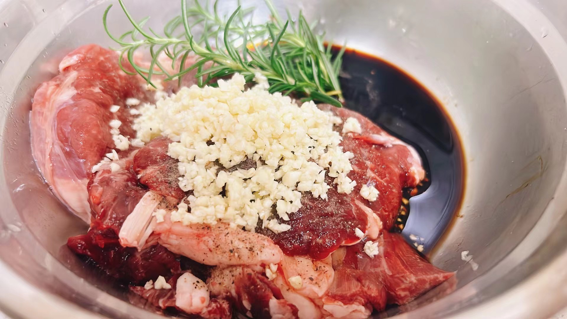 午餐菜谱|黑胡椒牛排自制分享|孩子吃到舔盘子。 牛里脊切2到3厘米厚度,洗干净,用刀背横竖交叉剁剁剁,两面都要这样,这样做是为了让牛肉更嫩,腌的时候也会更入味,然后加适量盐巴按摩均匀,再加适量生抽,一滴老抽,按摩均匀,加蒜蓉,黑胡椒再按摩,腌制20分钟以上,锅烧热,放油,中小火慢煎至两面金黄就可以了,中途也可以再加点点生抽,装饰我一般是用薄荷叶或者迷迭香的叶子,也可以不加。