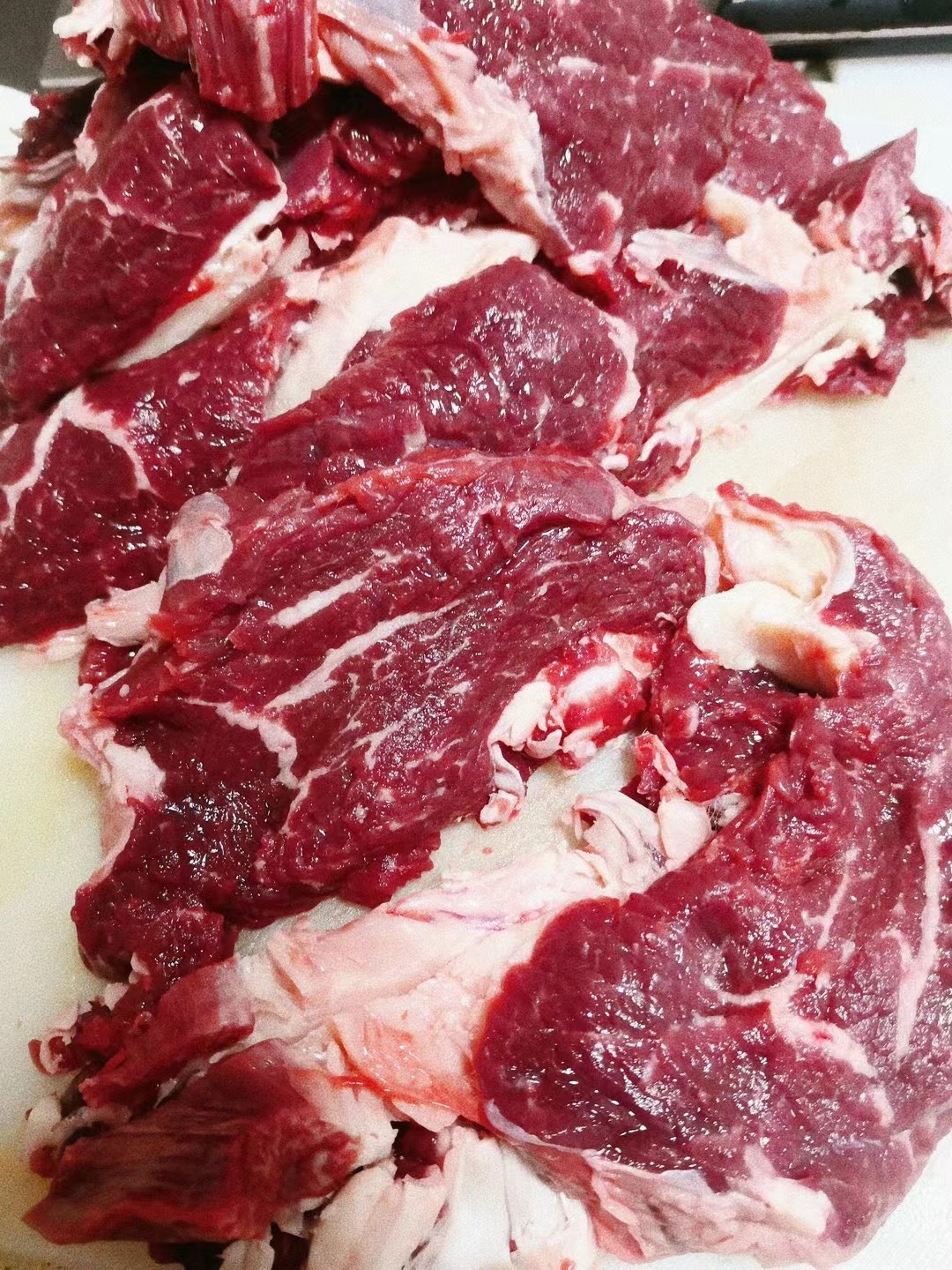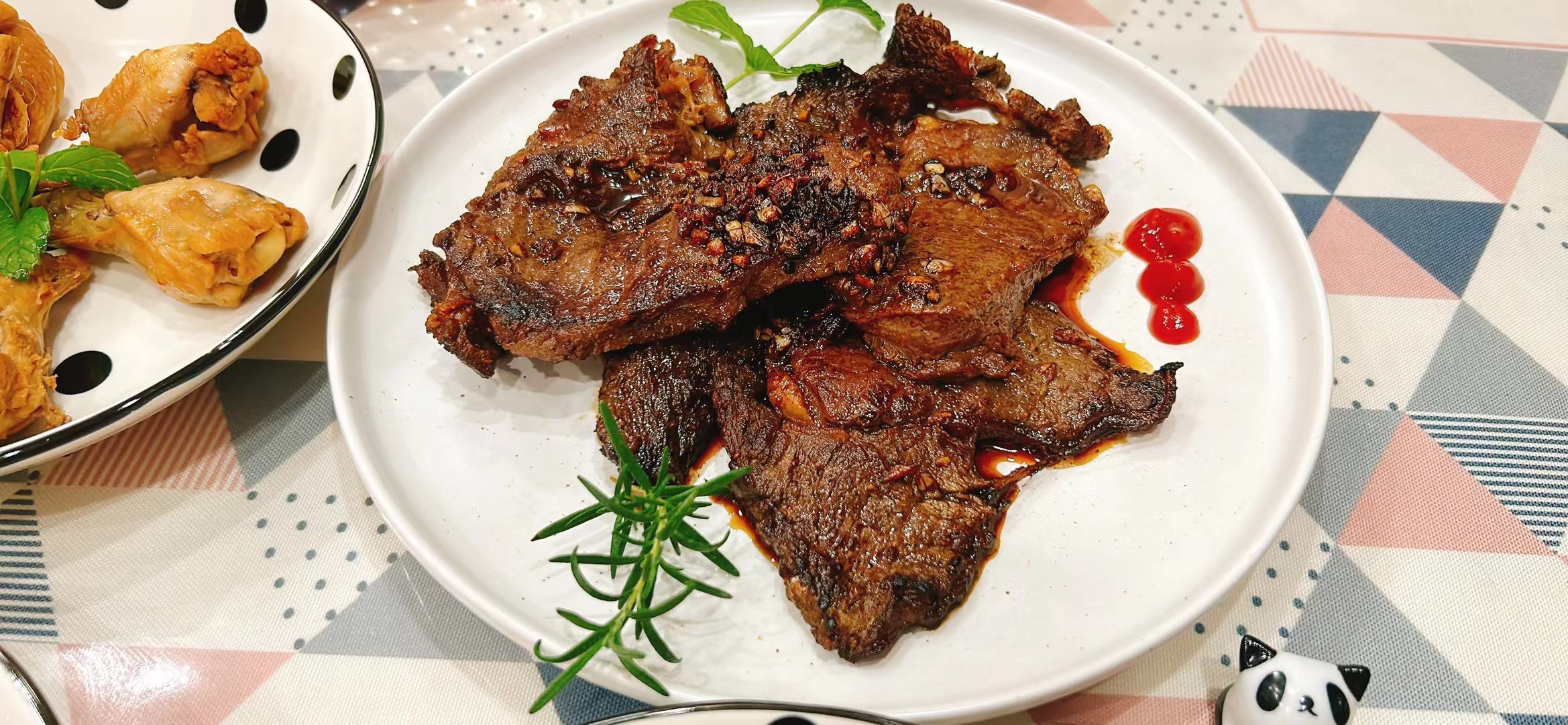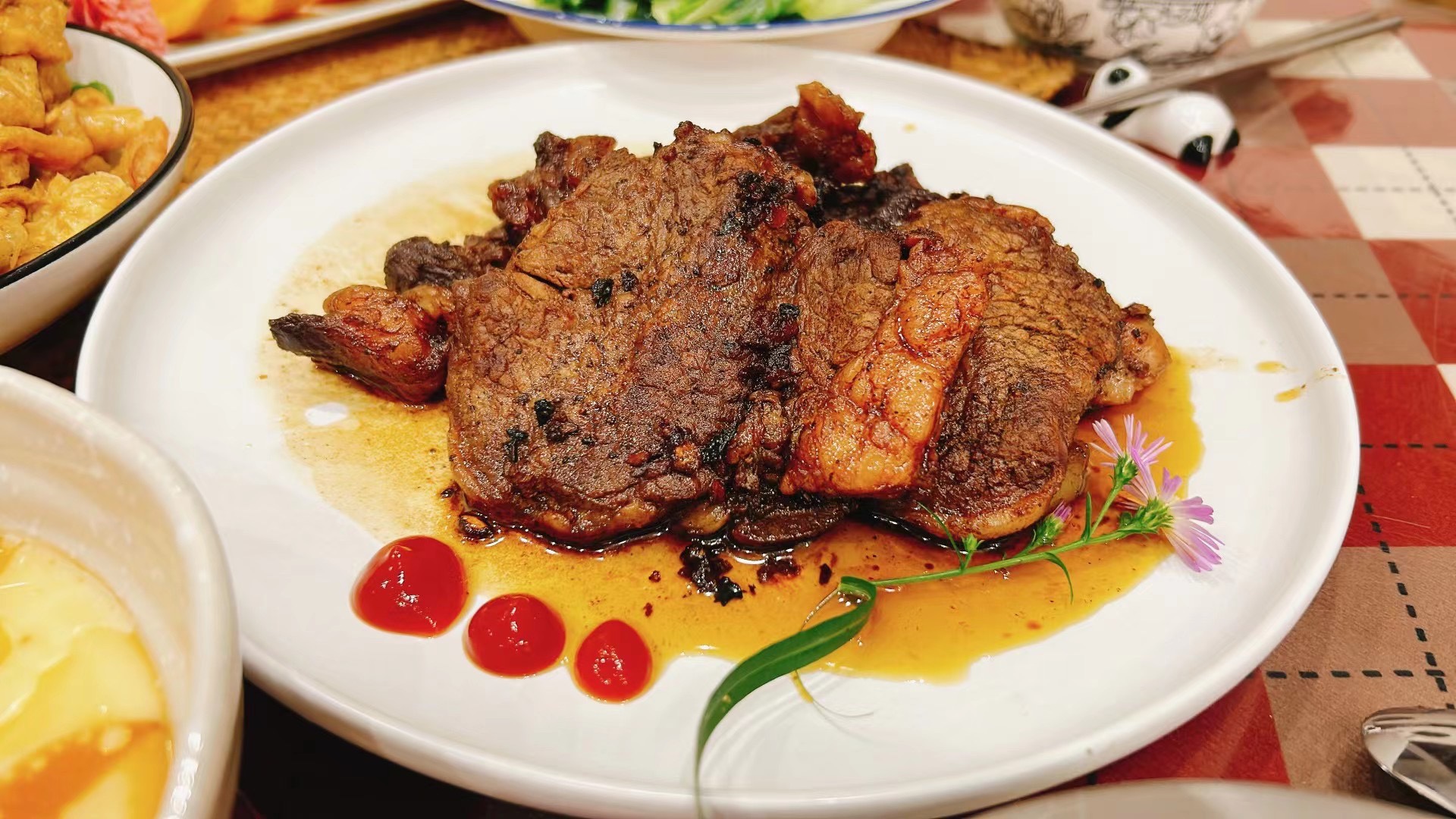 午餐菜谱|黑胡椒牛排自制分享|孩子吃到舔盘子。 牛里脊切2到3厘米厚度,洗干净,用刀背横竖交叉剁剁剁,两面都要这样,这样做是为了让牛肉更嫩,腌的时候也会更入味,然后加适量盐巴按摩均匀,再加适量生抽,一滴老抽,按摩均匀,加蒜蓉,黑胡椒再按摩,腌制20分钟以上,锅烧热,放油,中小火慢煎至两面金黄就可以了,中途也可以再加点点生抽,装饰我一般是用薄荷叶或者迷迭香的叶子,也可以不加。
