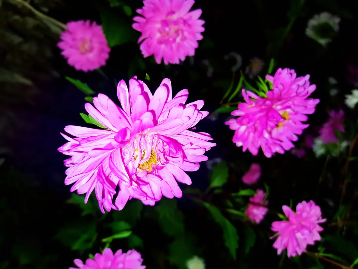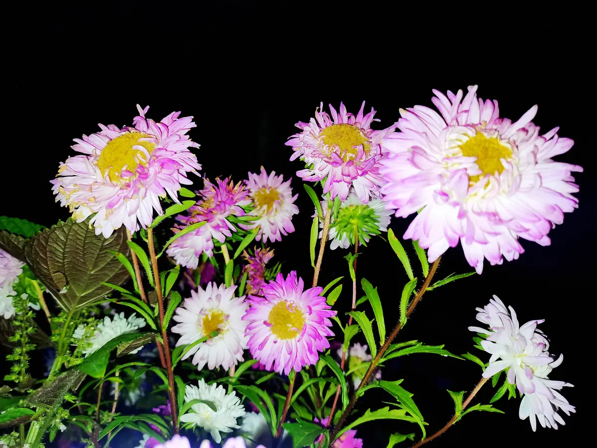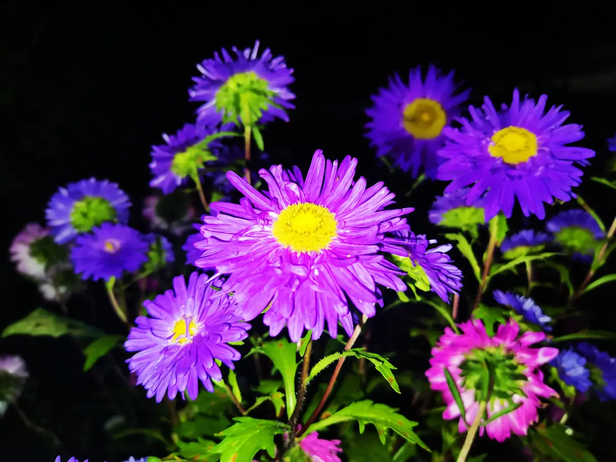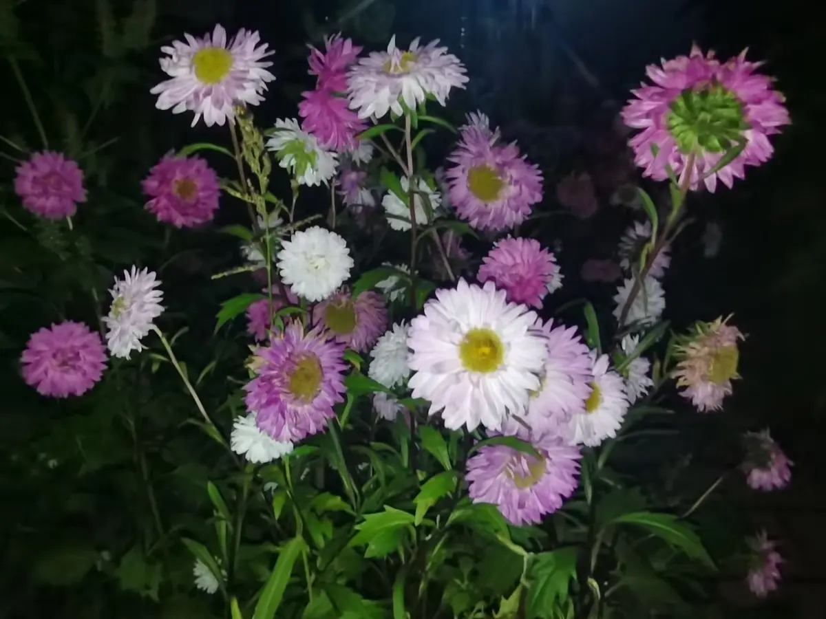 七绝•夜幕下的翠菊 夜幕低垂笼翠芳, 轻寒微露染幽香。 此身非属东篱客, 一样高风傲雪霜。 注:翠菊(学名:Callistephus chinensis (L.) Nees),别名姜丝腊,八月菊,草菊等,是一年生或二年生草本植物。高(15)30-100厘米。茎直立,单生,被白色糙毛。叶子卵形或长椭圆形,头状花序。两性花花冠黄色。瘦果长椭圆状倒披针形,稍扁,花果期:5-10月。 翠菊花色鲜艳,花色、花型多样,花朵数量繁多,花期长,是国内外园艺界非常重视的观赏性植物。 翠菊的花语是坚定不移的信念、默默守护的爱情。 此外,不同颜色的翠菊还有各自独特的花语: 红色翠菊:代表着主动的热恋。 蓝色翠菊:象征着永恒的爱情。 紫色翠菊:表示狂热的追求。 白色翠菊:代表着纯洁的爱恋。 黄色翠菊:象征友情加爱情。