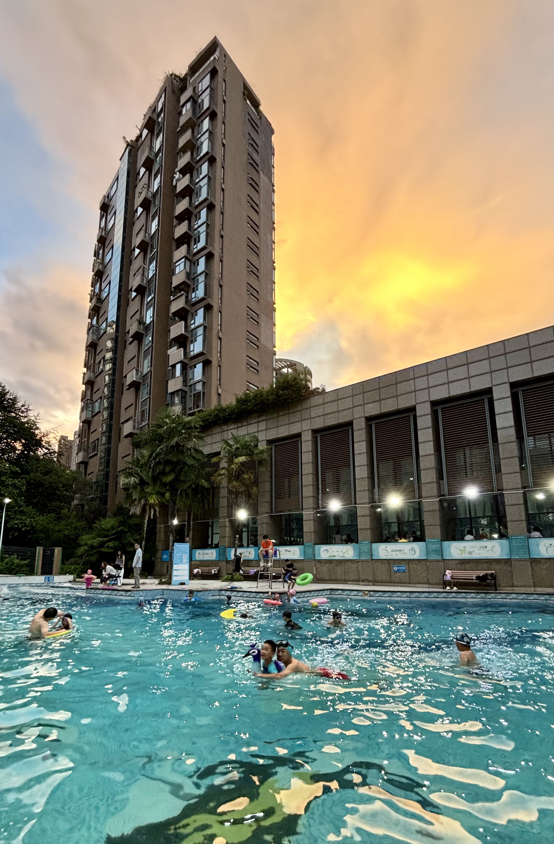 晚霞如火,泼洒于天际,将池水染成一幅流动的油画。