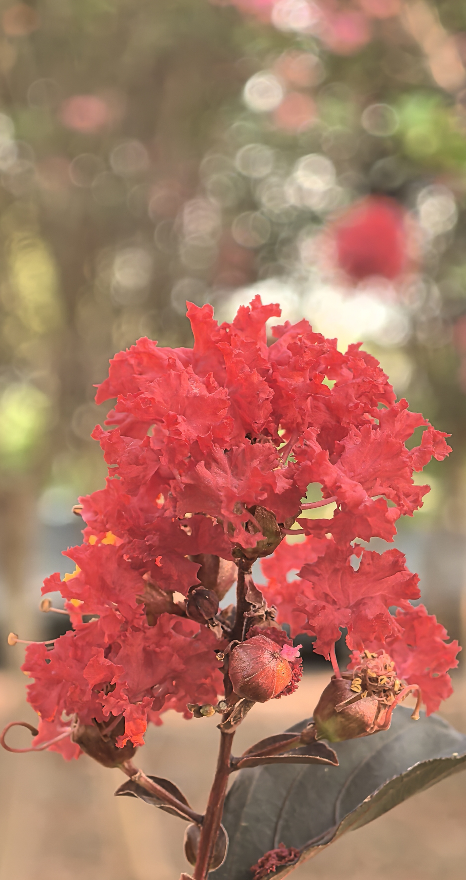 紫薇,品种异,花色异,一样的绿叶,不同的红花,一般粉红、梅红、桃红等居多。然,这个中国红,热烈如血似火,不大常见。 炎炎炙夏,因水、肥不足,大多花儿,都或蔫或枯,甚以休眠之法,穿土地避暑气护根本,也不失良策。紫薇,却战暑斗热,正午时分,最是精神,一树满枝头是花,迎白日可仰天而笑。 昨为中华胜利日,国曾有外来风雨,摧枯拉朽,却激发民族精神,同仇敌忾,万众一心,似淬火而重耀光芒。 今晨,偶见中国大红,有感发之。[微笑]