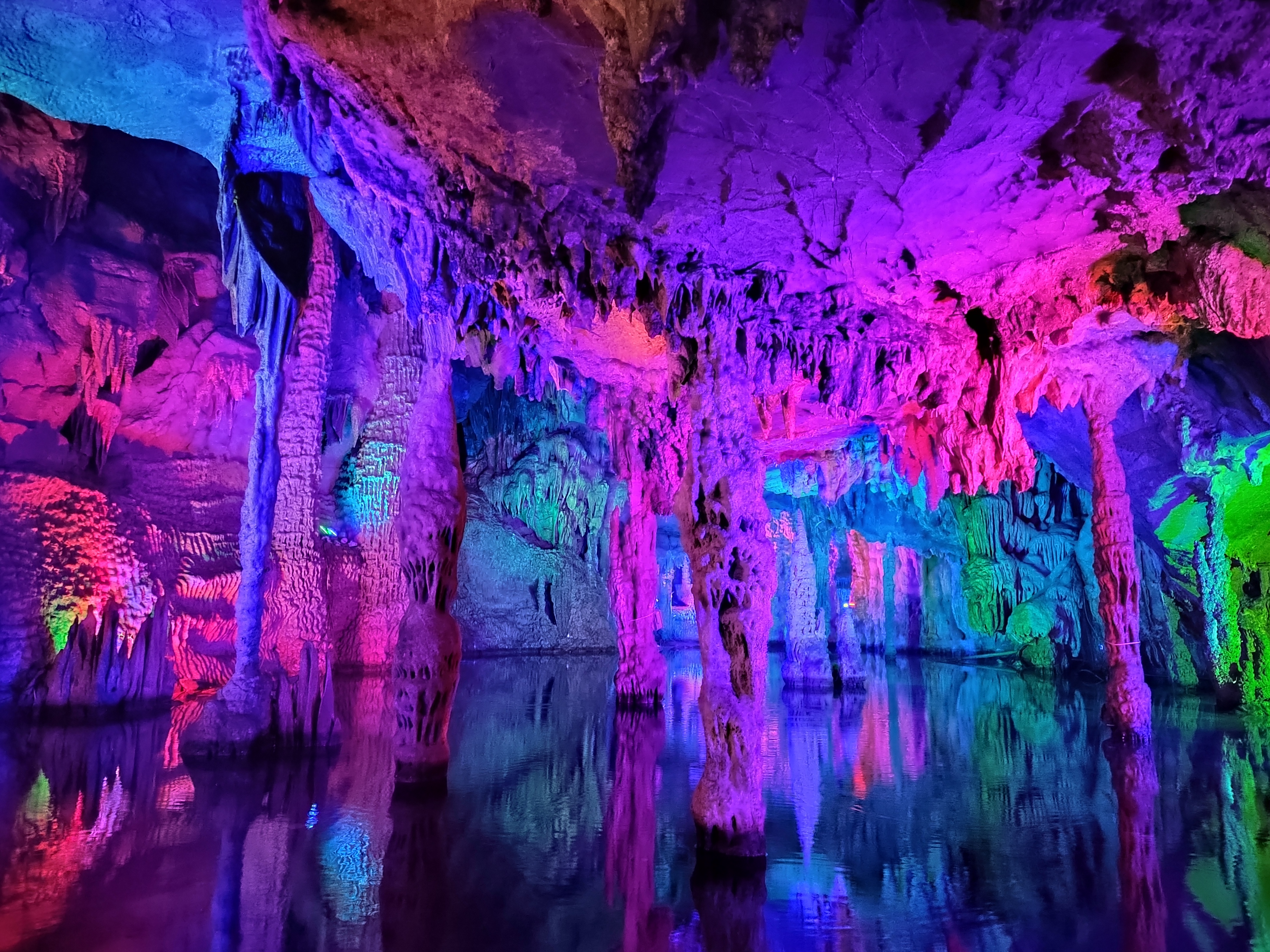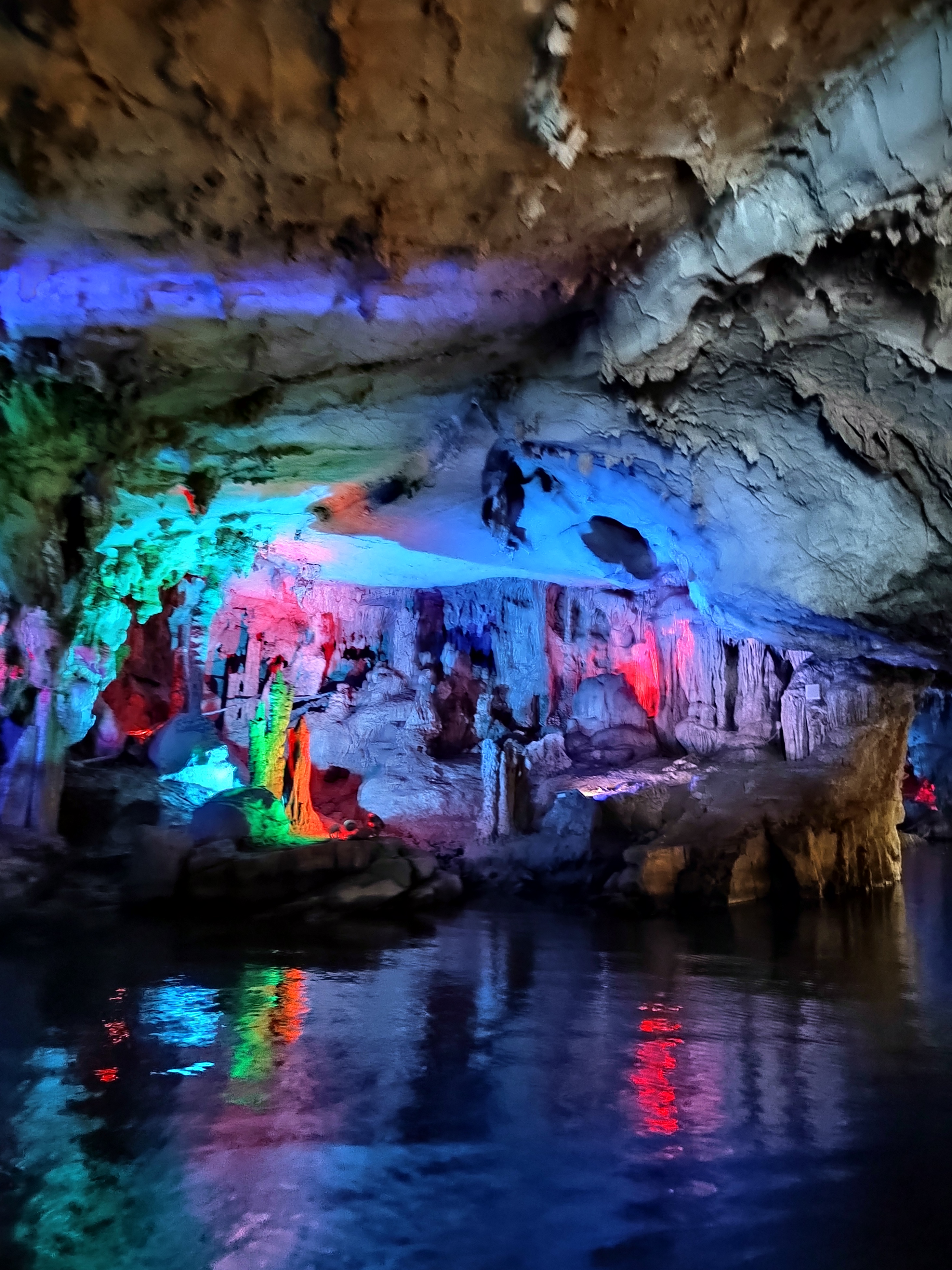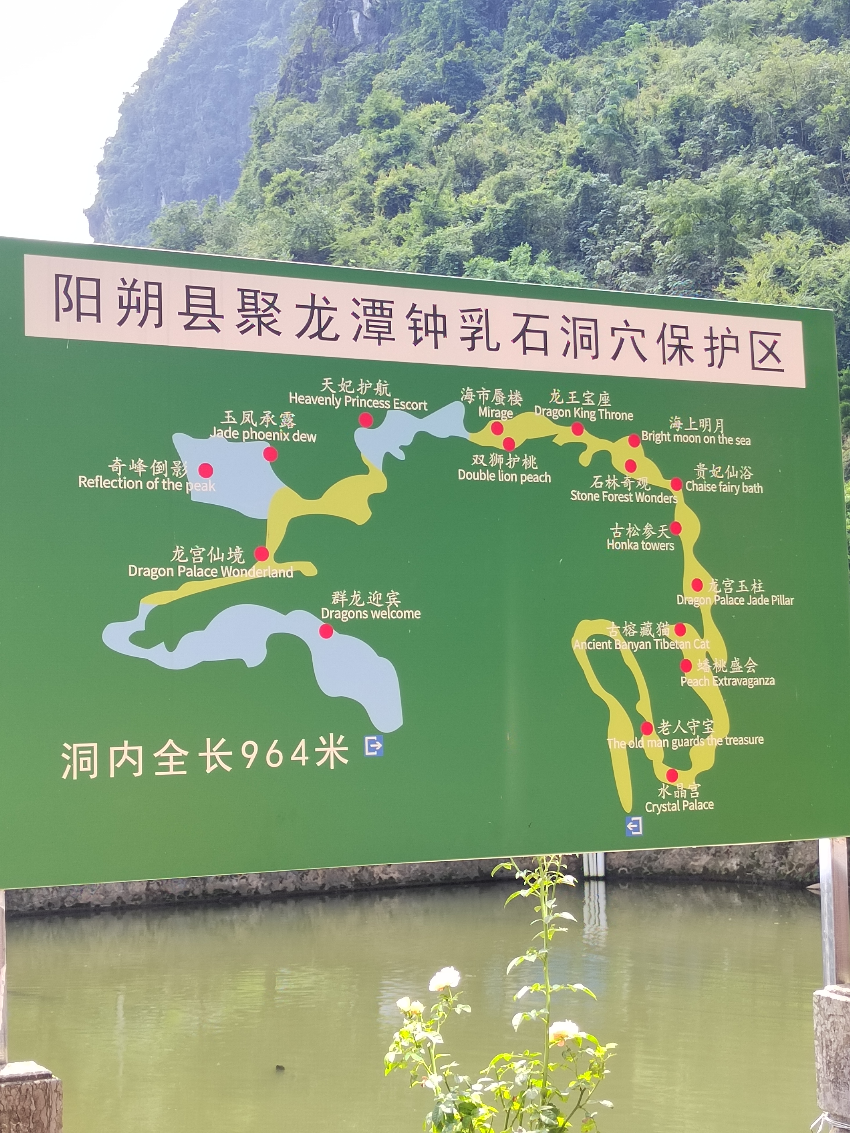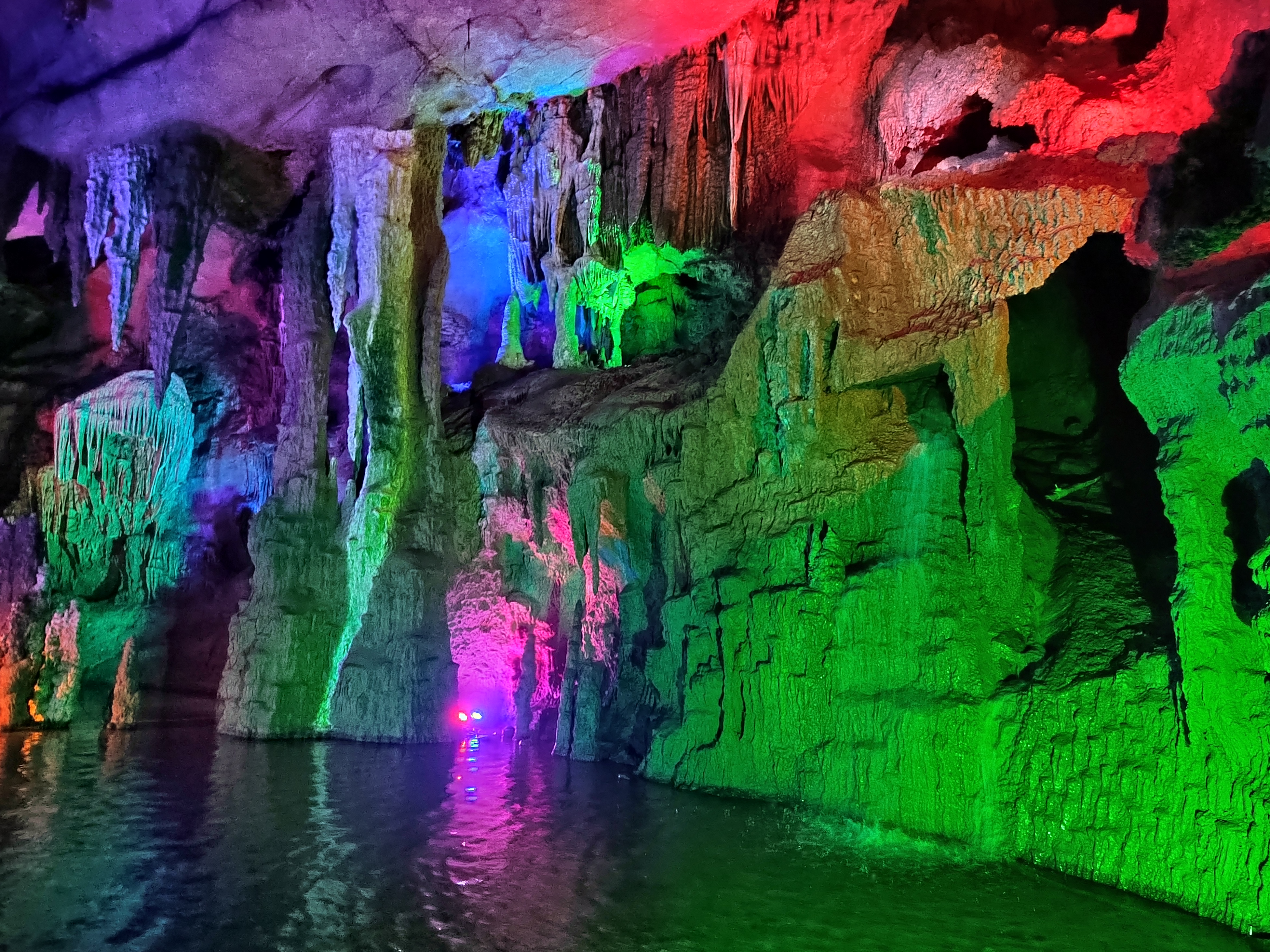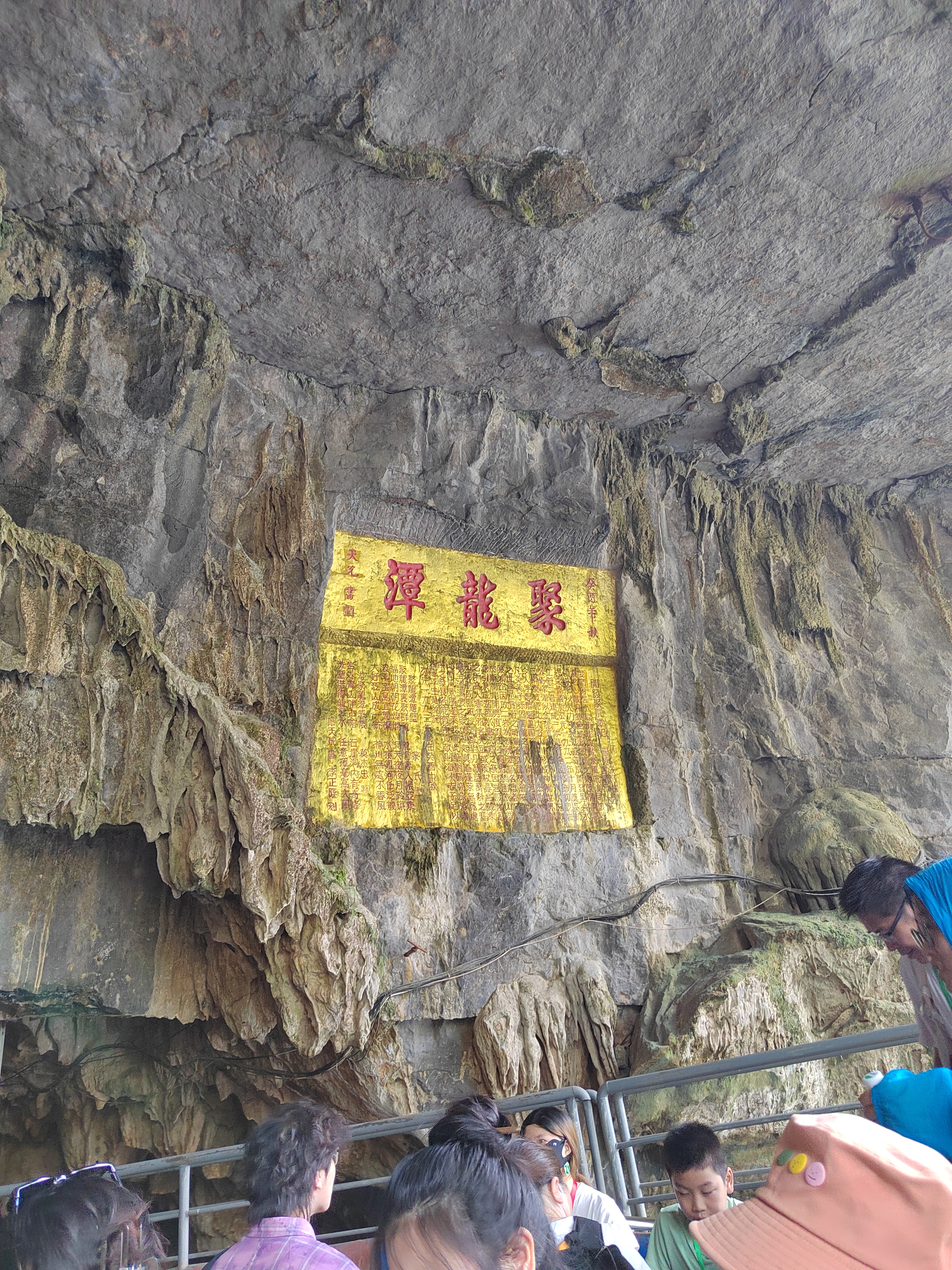 聚龙潭位于广西阳朔十里画廊沿线,地处古榕公园与月亮山之间,是阳朔境内唯一可兼水陆游览的溶洞。 聚龙潭由黑岩,水岩组成,全长约一千米,洞内穹顶高处约 25 米。因岩外奇峰竞秀宛如神龙腾云,岩内乳石多姿巧似游龙戏水而得名。 洞内钟乳石历经亿万年的化学,物理反应而形成,景物全系鬼斧神工,不假人力雕饰,是大自然创造的奇迹。 踏入溶洞,仿佛进入一个奇幻世界,各种钟乳石琳琅满目,形态各异,有卧龙,盘龙,游龙等众多似龙的造型,栩栩如生,景区内景点密密集。 在近千米长的游道中,前段游程乘船进洞,头顶钟乳石倒挂而下,触手可及,船行之处,波光粼粼,倒映着洞内五彩斑斓的灯光,如梦如幻。