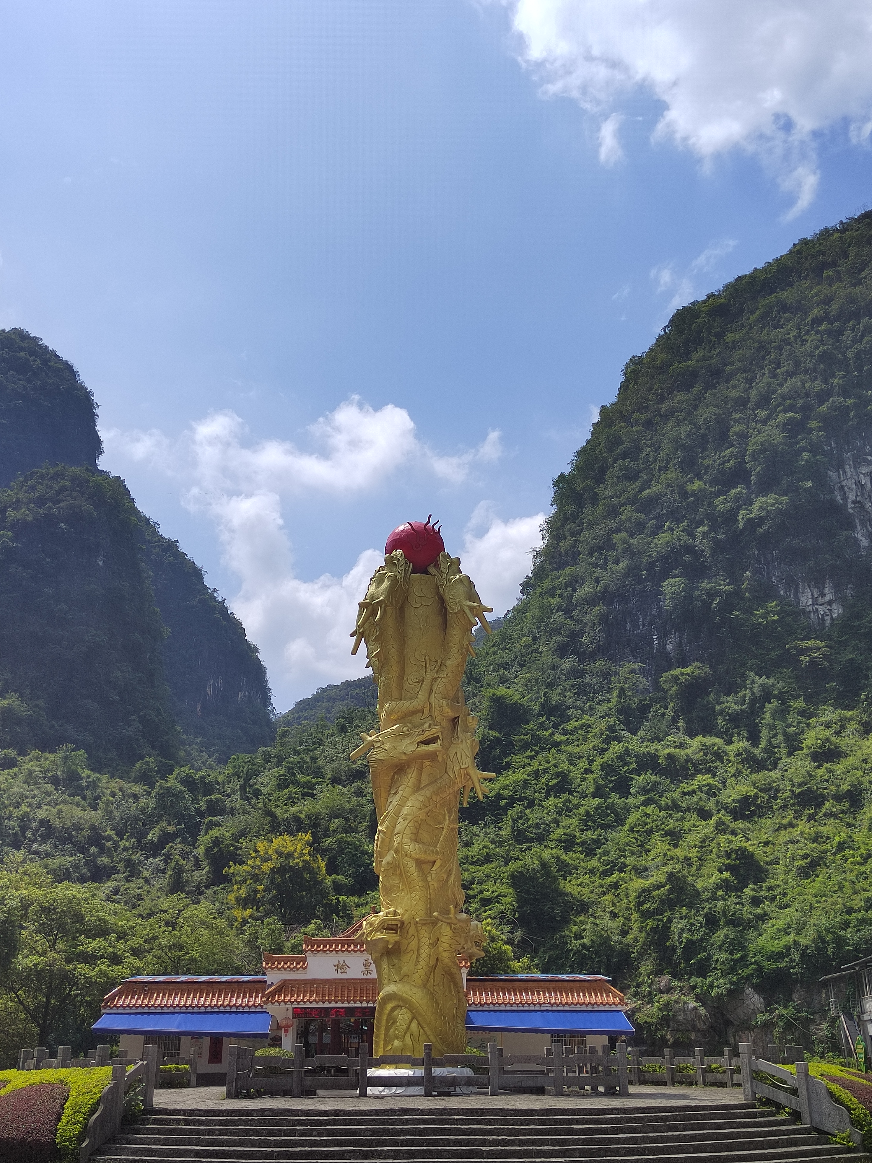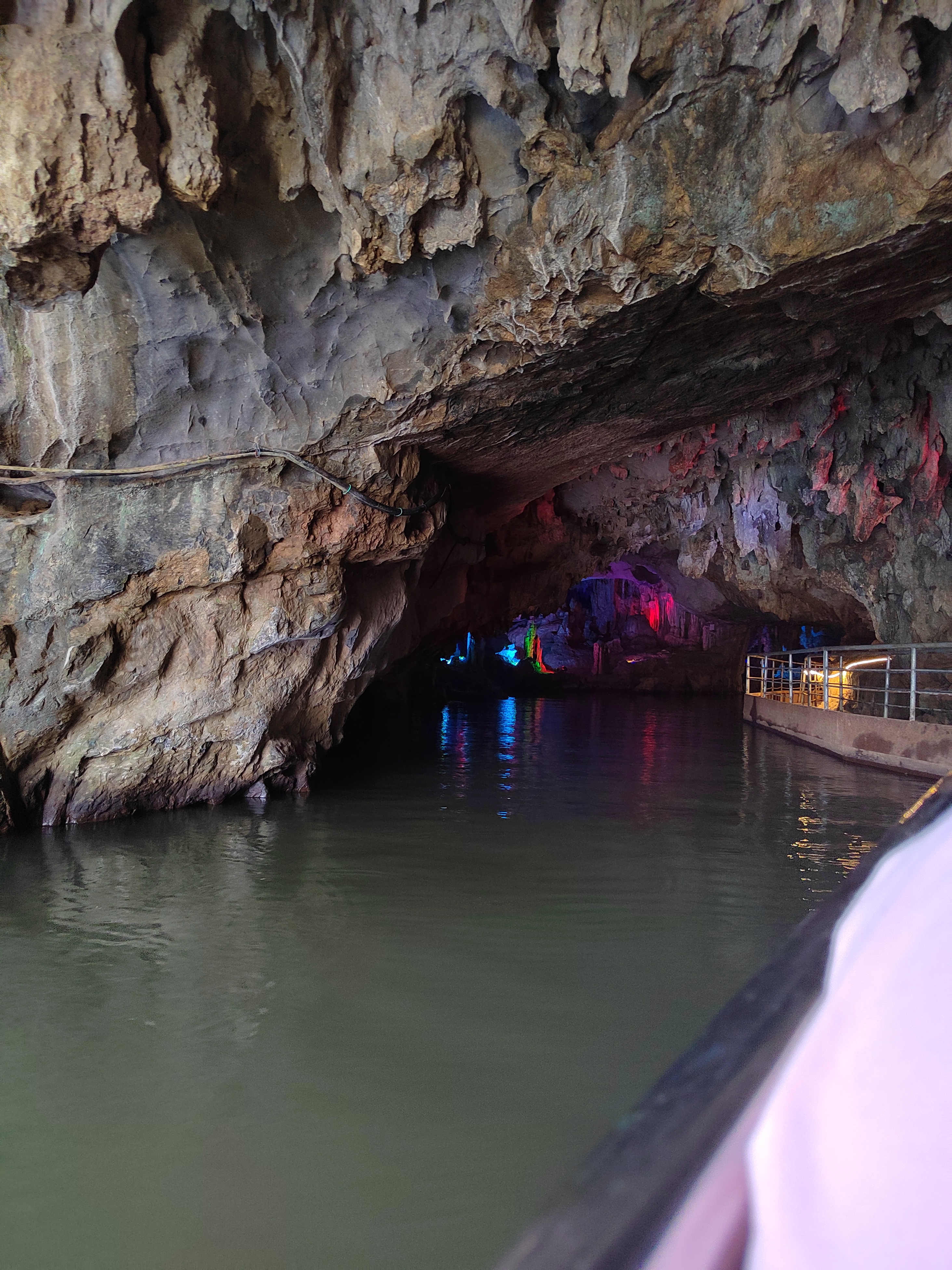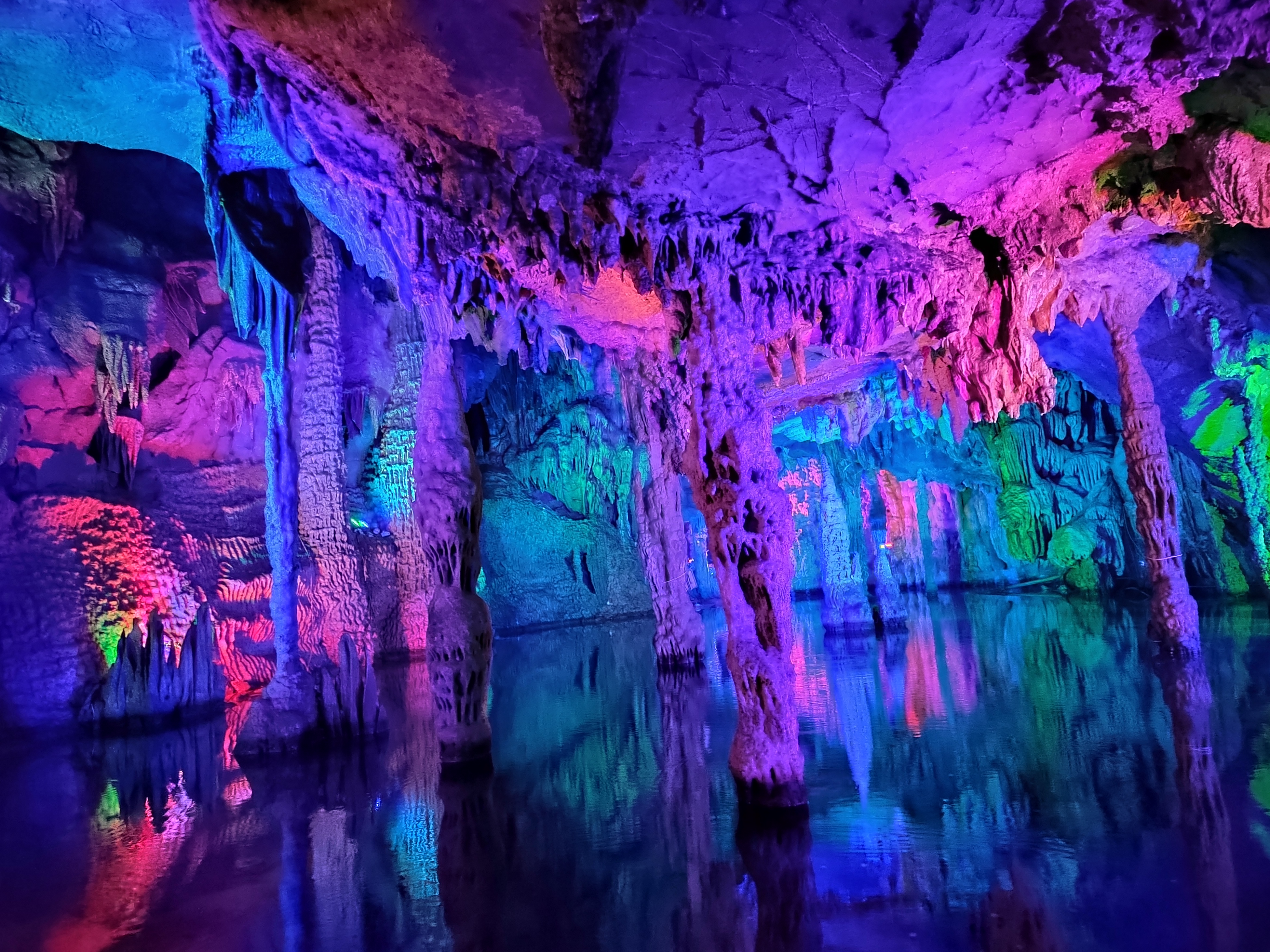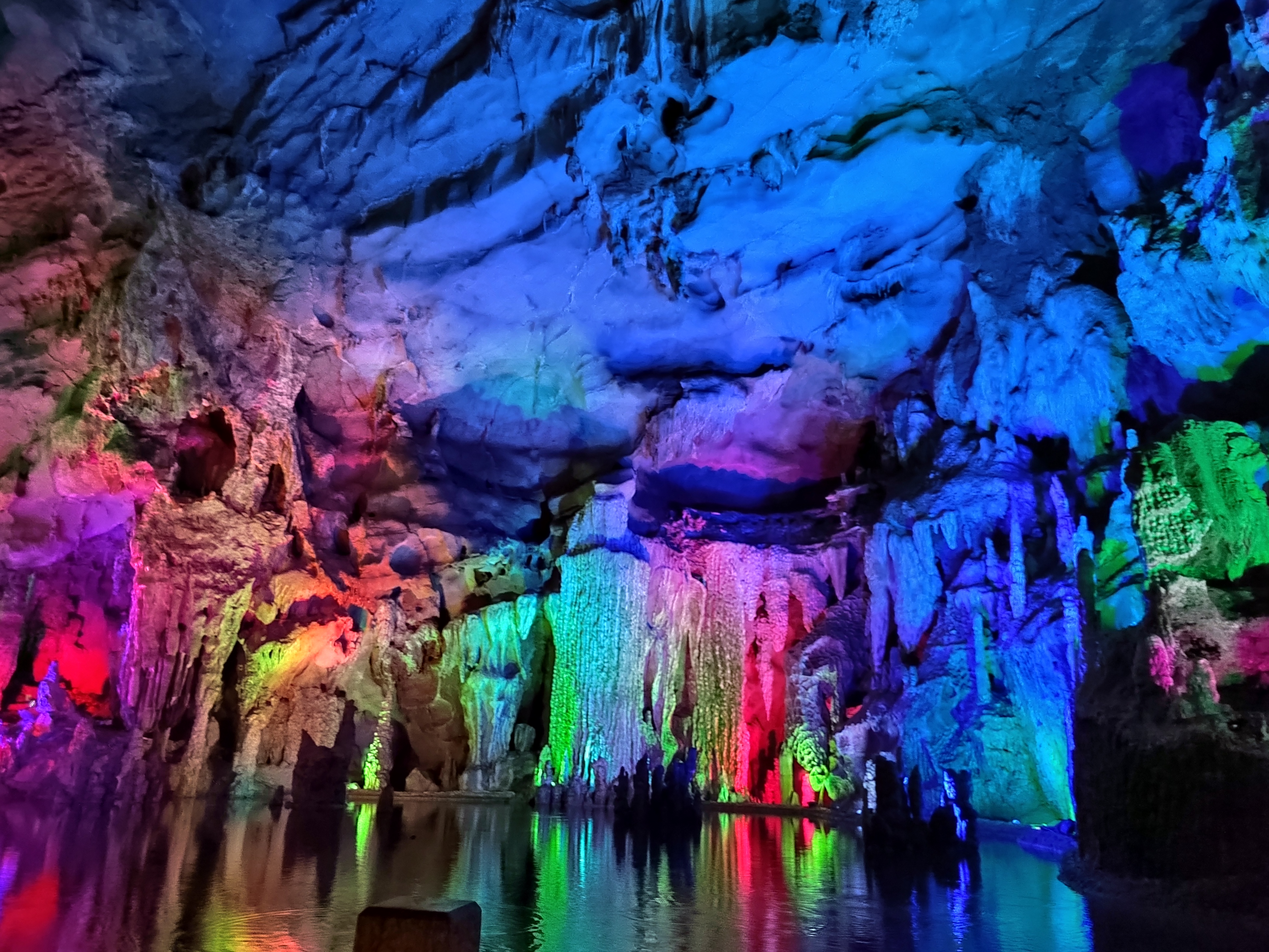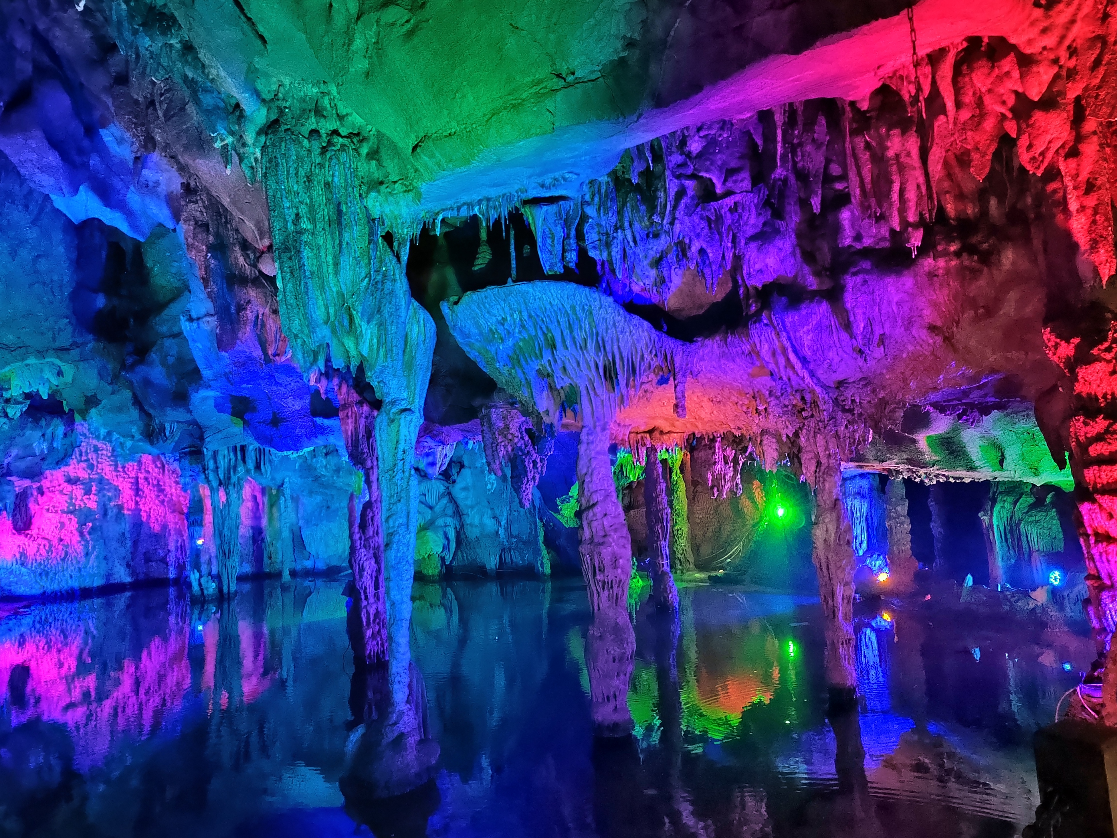 聚龙潭位于广西阳朔十里画廊沿线,地处古榕公园与月亮山之间,是阳朔境内唯一可兼水陆游览的溶洞。 聚龙潭由黑岩,水岩组成,全长约一千米,洞内穹顶高处约 25 米。因岩外奇峰竞秀宛如神龙腾云,岩内乳石多姿巧似游龙戏水而得名。 洞内钟乳石历经亿万年的化学,物理反应而形成,景物全系鬼斧神工,不假人力雕饰,是大自然创造的奇迹。 踏入溶洞,仿佛进入一个奇幻世界,各种钟乳石琳琅满目,形态各异,有卧龙,盘龙,游龙等众多似龙的造型,栩栩如生,景区内景点密密集。 在近千米长的游道中,前段游程乘船进洞,头顶钟乳石倒挂而下,触手可及,船行之处,波光粼粼,倒映着洞内五彩斑斓的灯光,如梦如幻。
