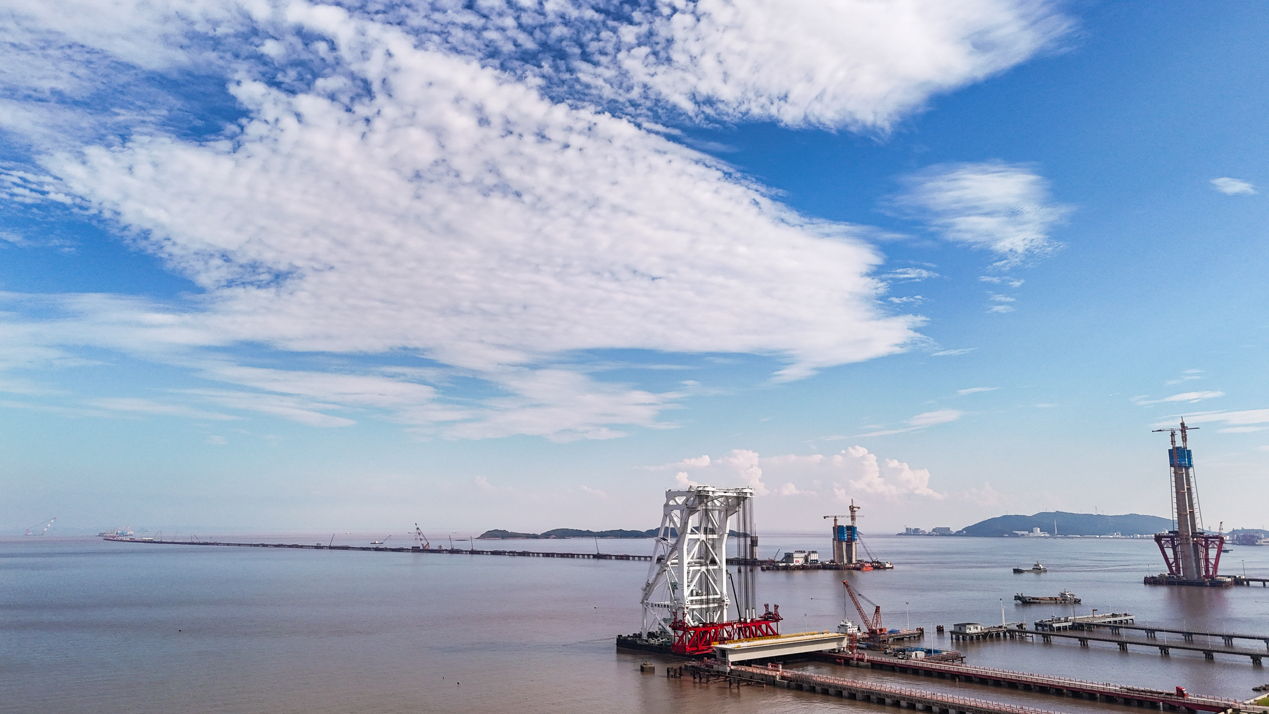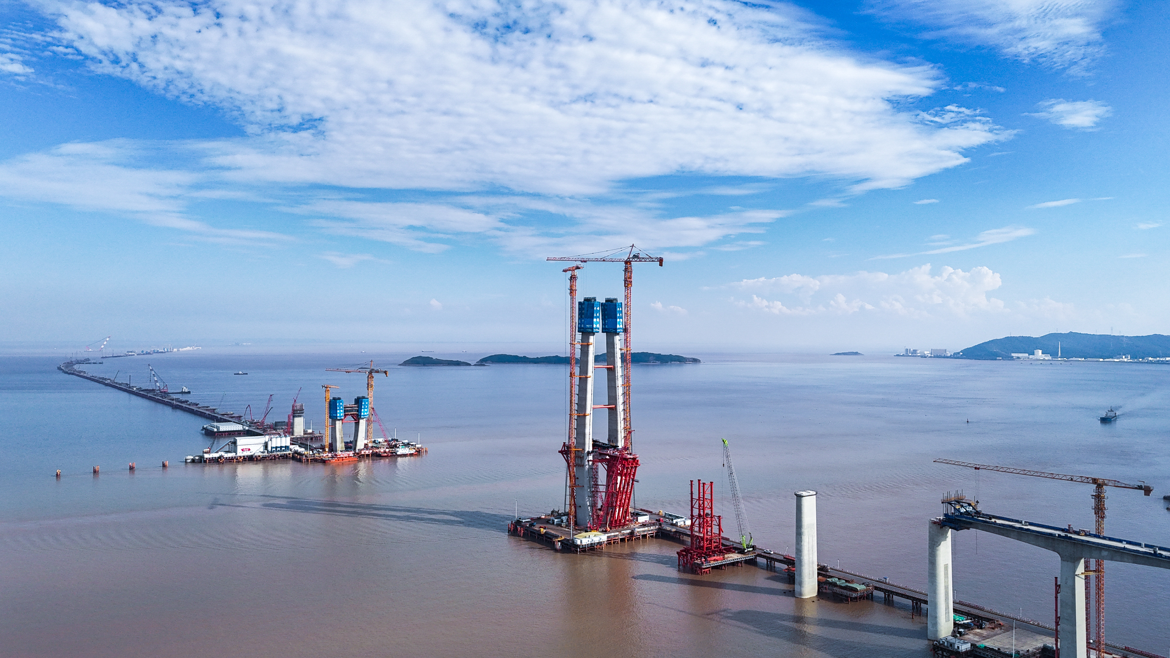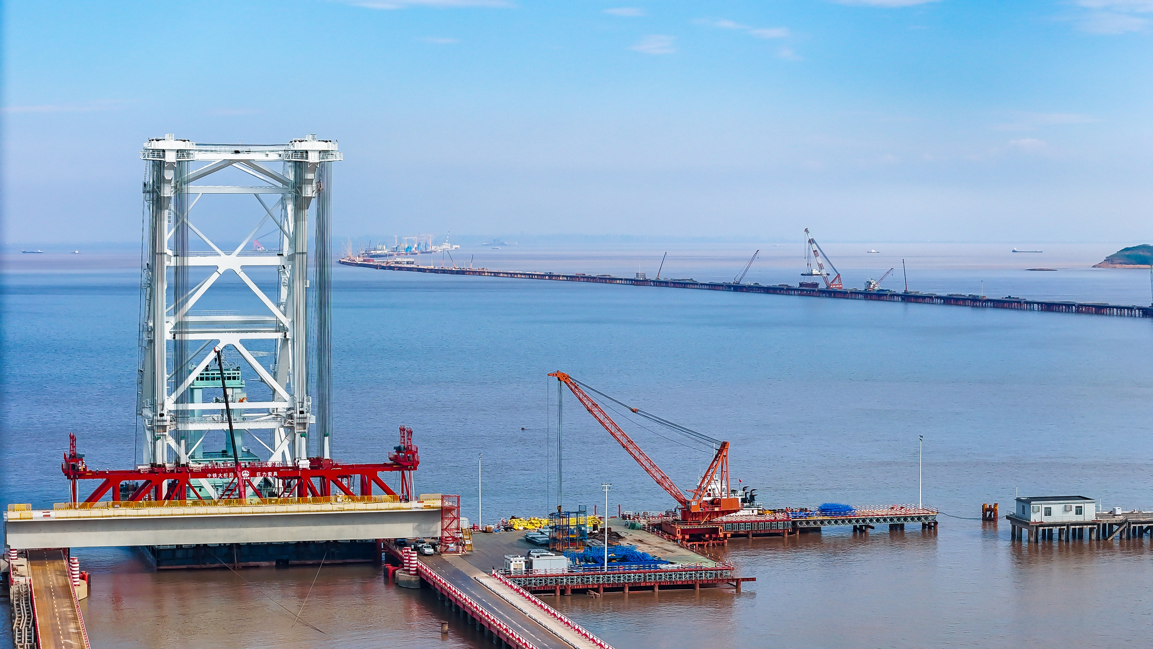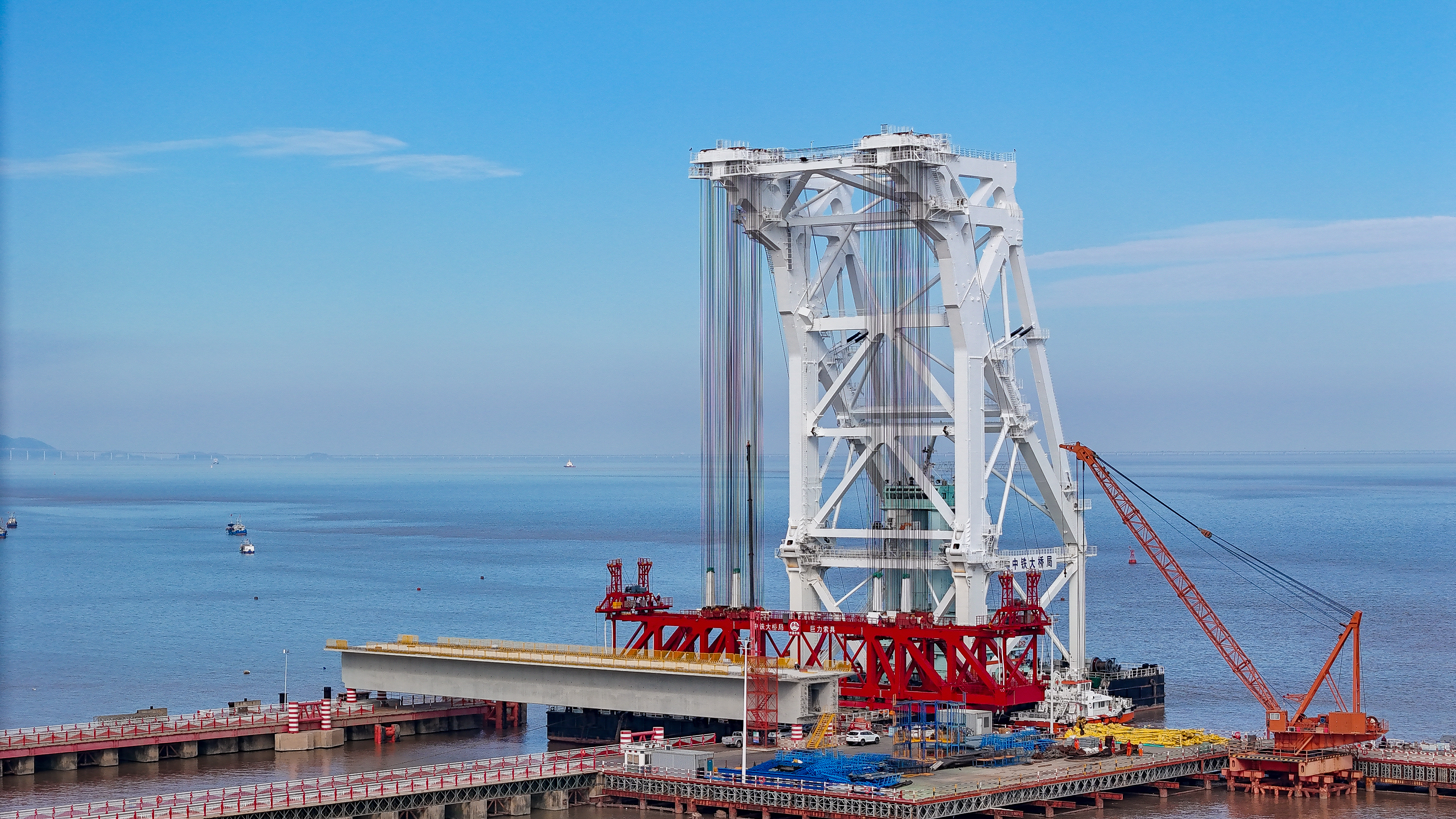 站在位于浙江海盐的通苏嘉甬高铁大桥工程现场,看海上大桥建设正酣。桥塔施工、缆索吊装,橙色起重机与蓝色防护罩交织。远眺海景,蓝天白云下,水天一色。这里是中国桥梁建设的奇迹,是长三角一体化交通枢纽,更是未来城市的美好愿景!