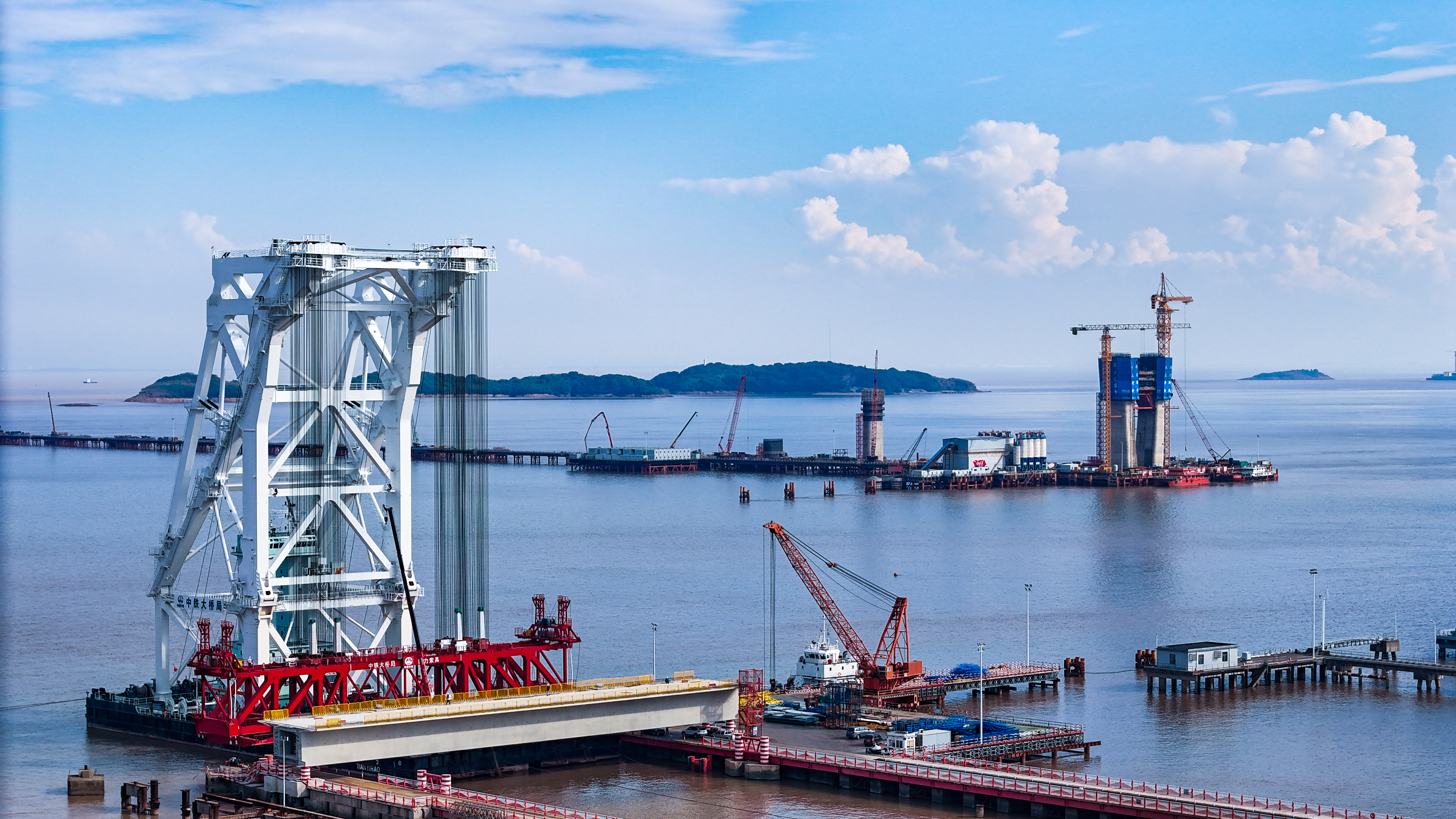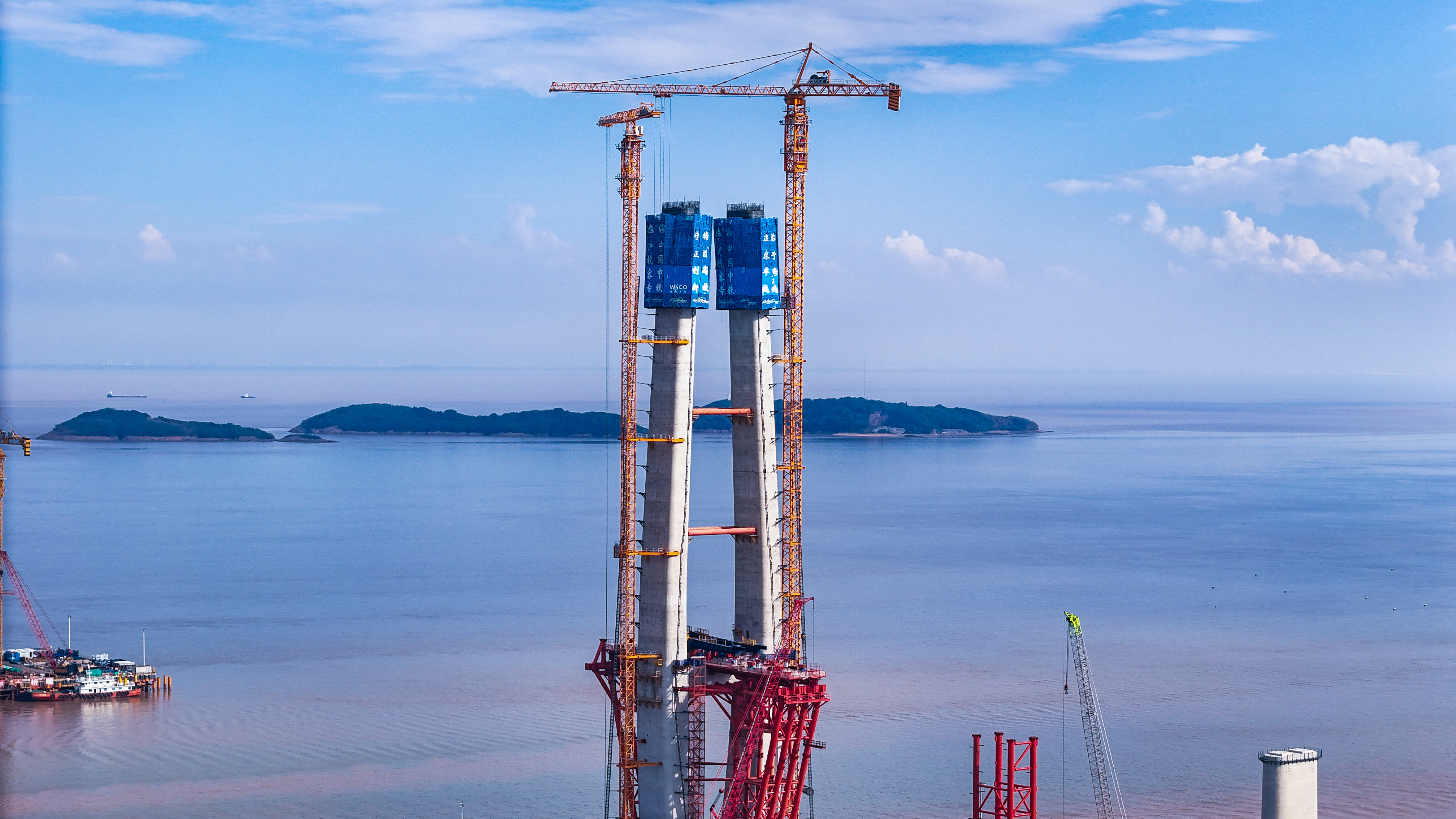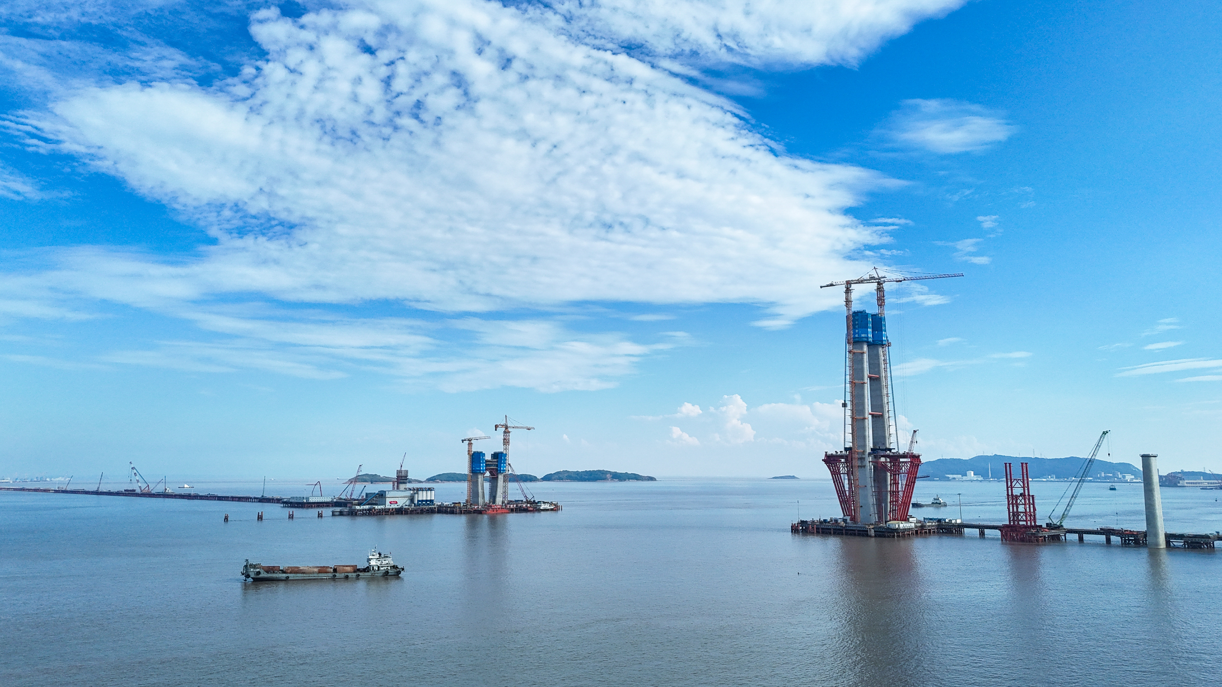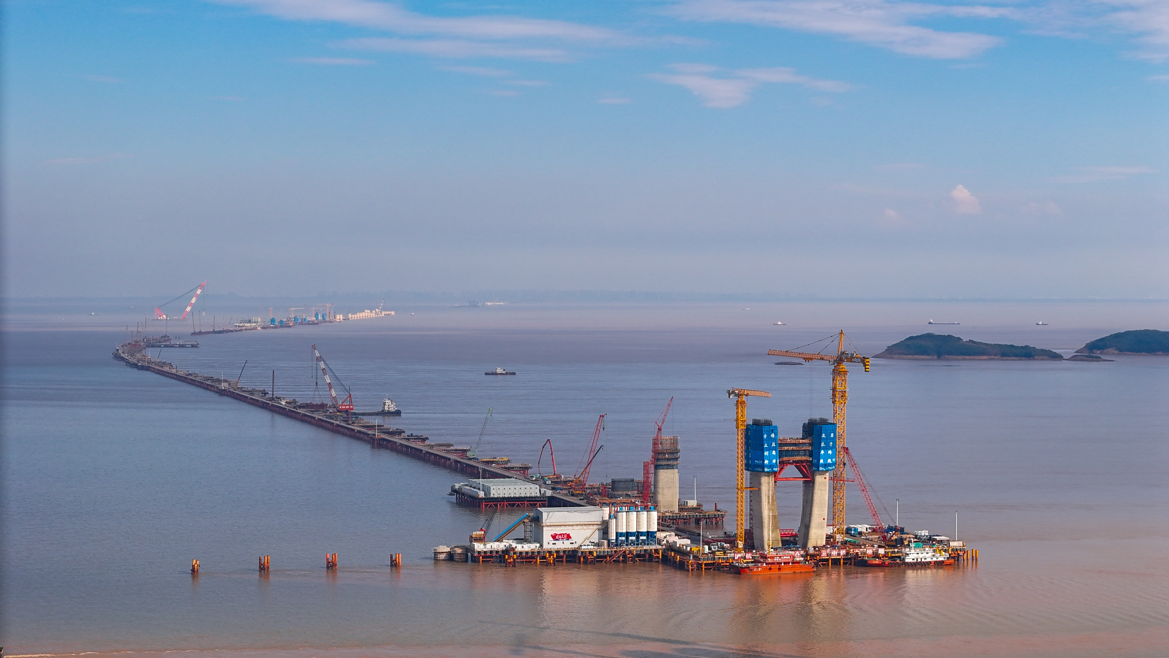 站在位于浙江海盐的通苏嘉甬高铁大桥工程现场,看海上大桥建设正酣。桥塔施工、缆索吊装,橙色起重机与蓝色防护罩交织。远眺海景,蓝天白云下,水天一色。这里是中国桥梁建设的奇迹,是长三角一体化交通枢纽,更是未来城市的美好愿景!