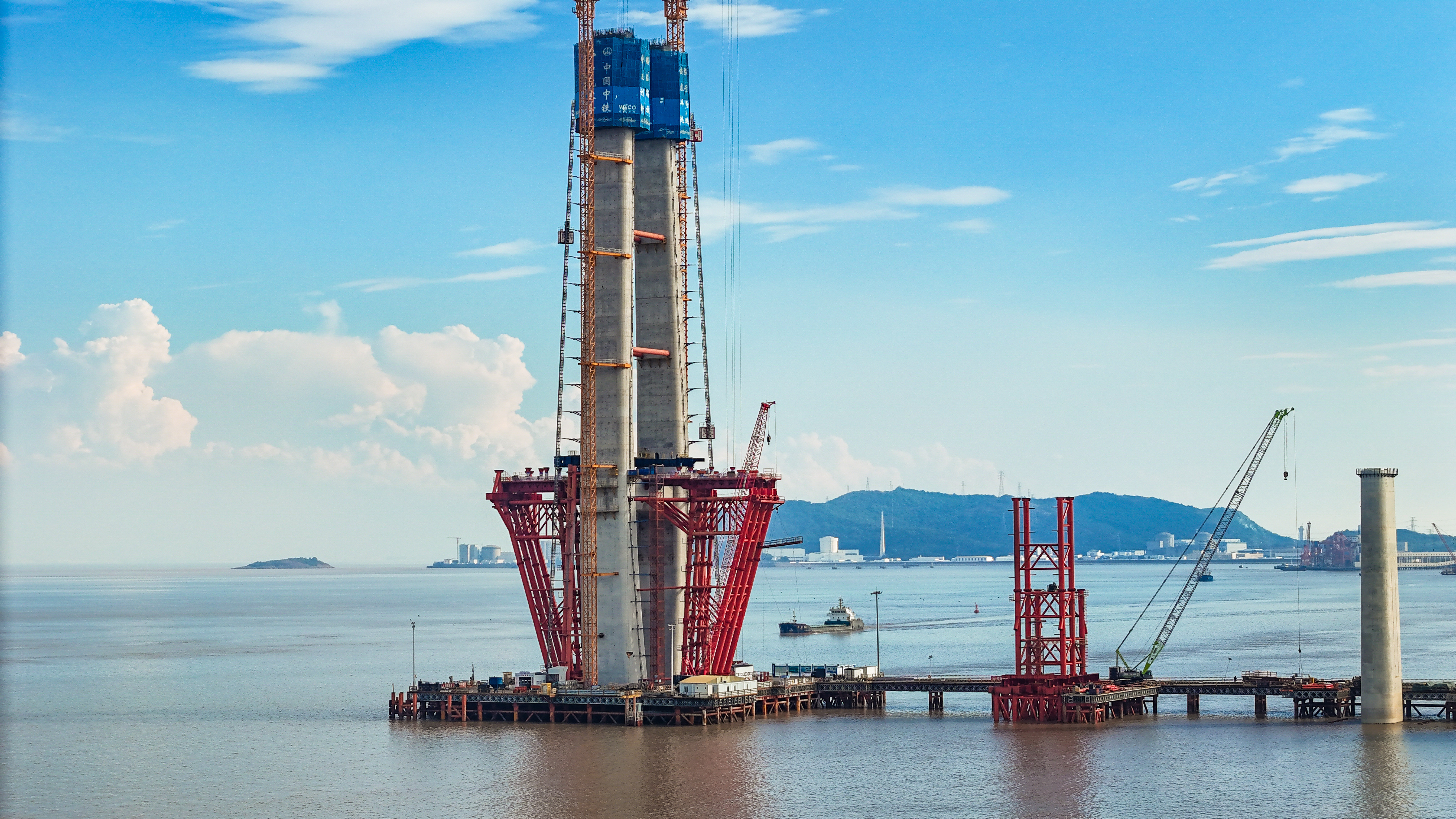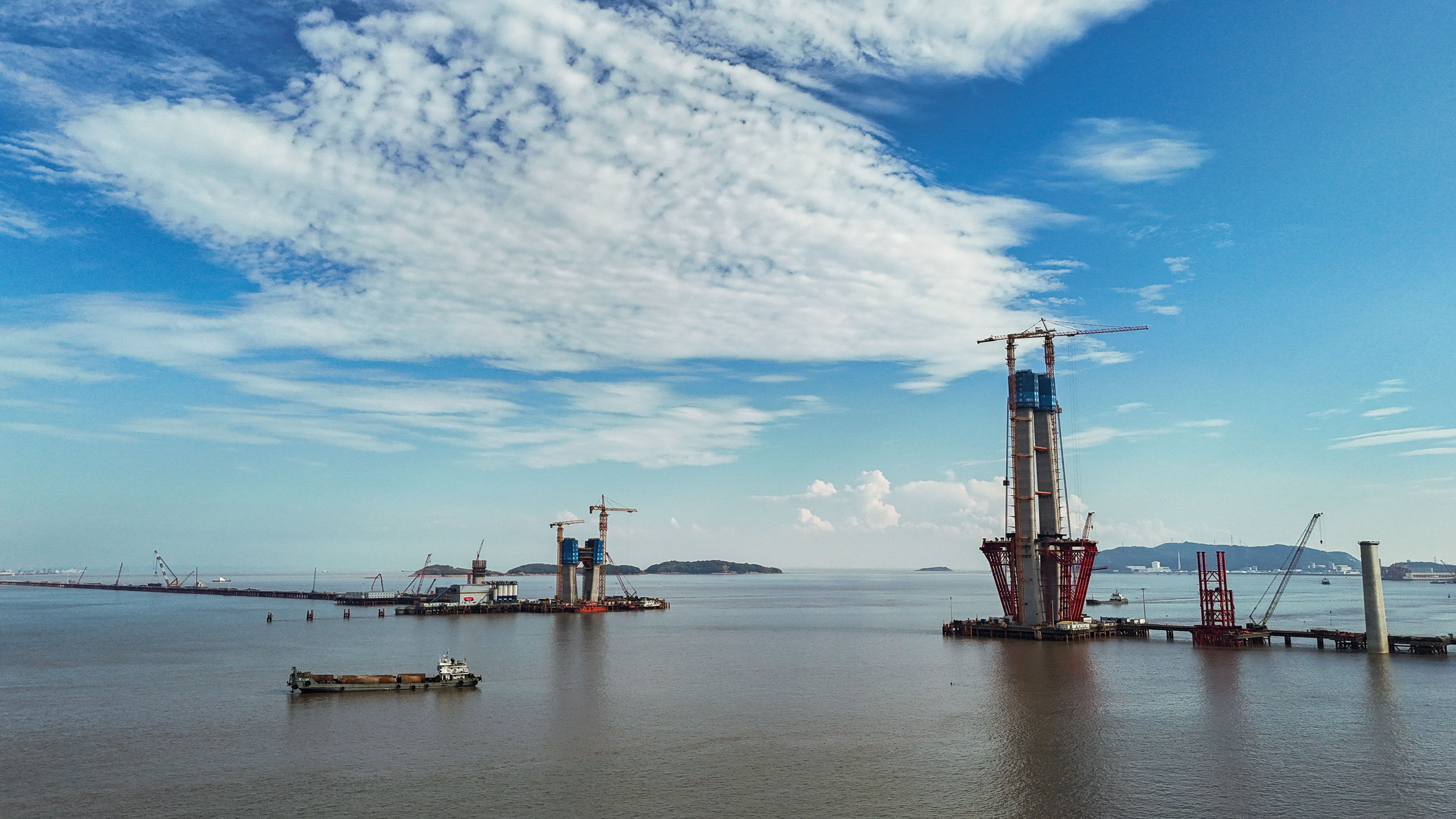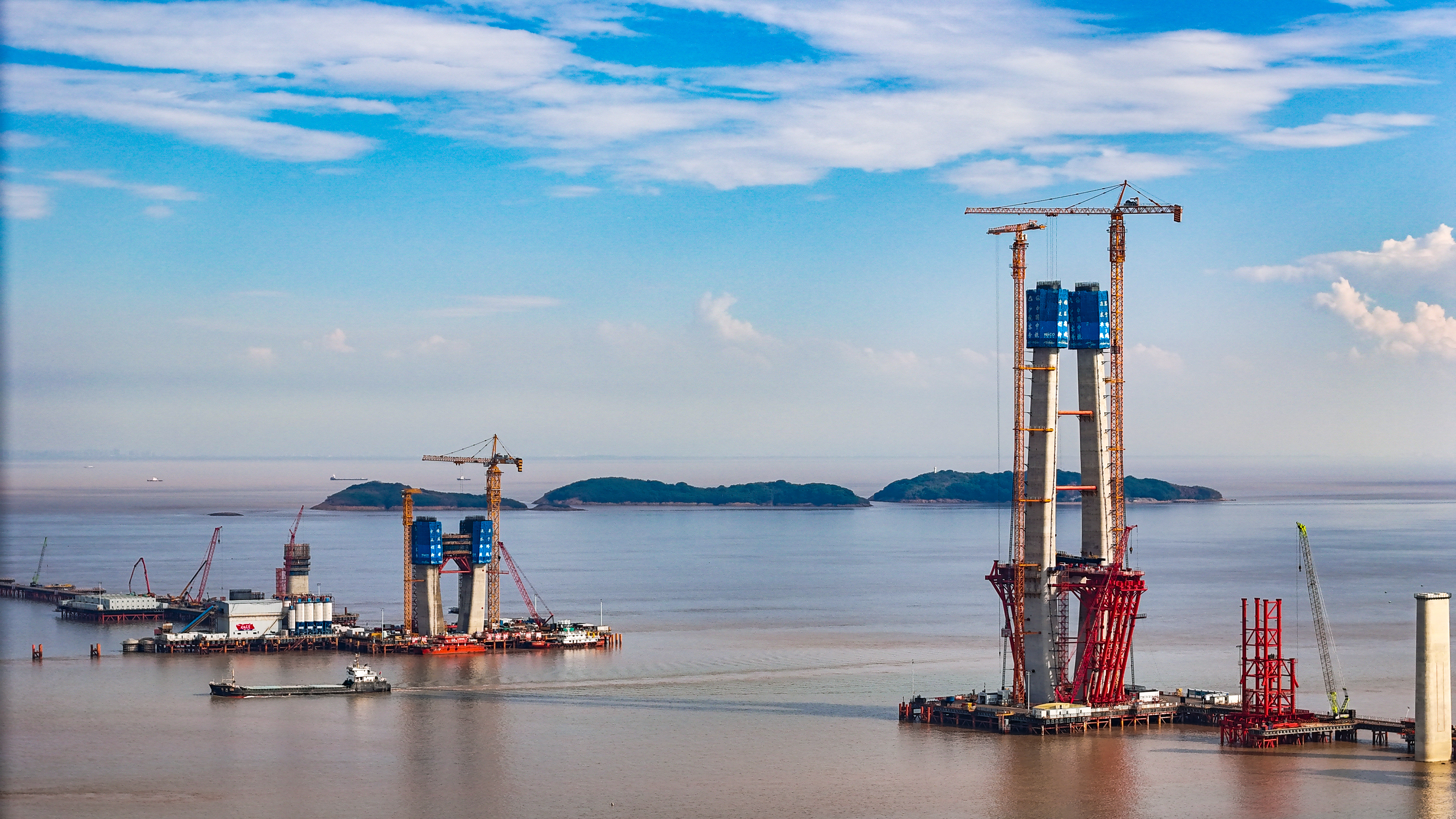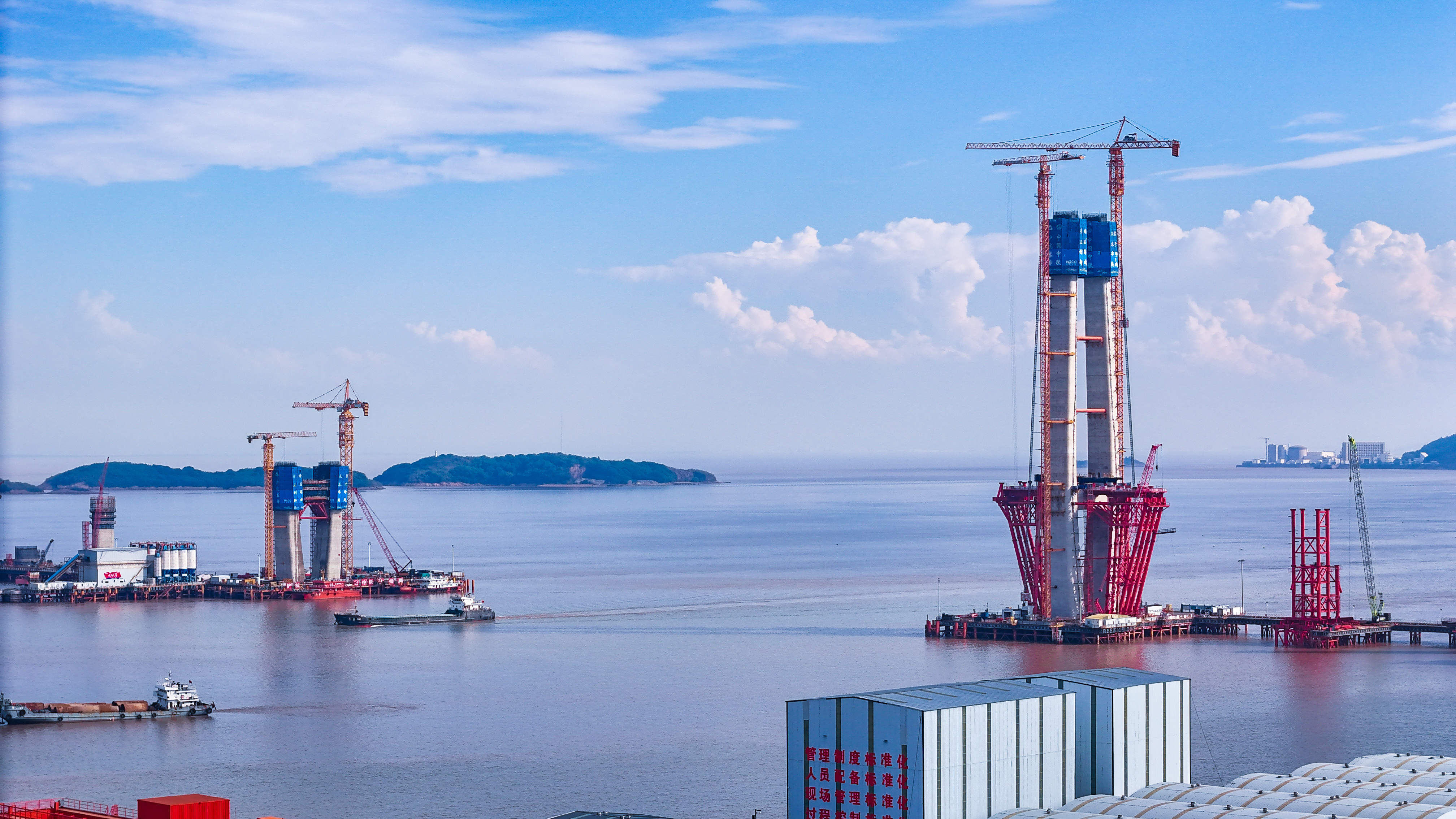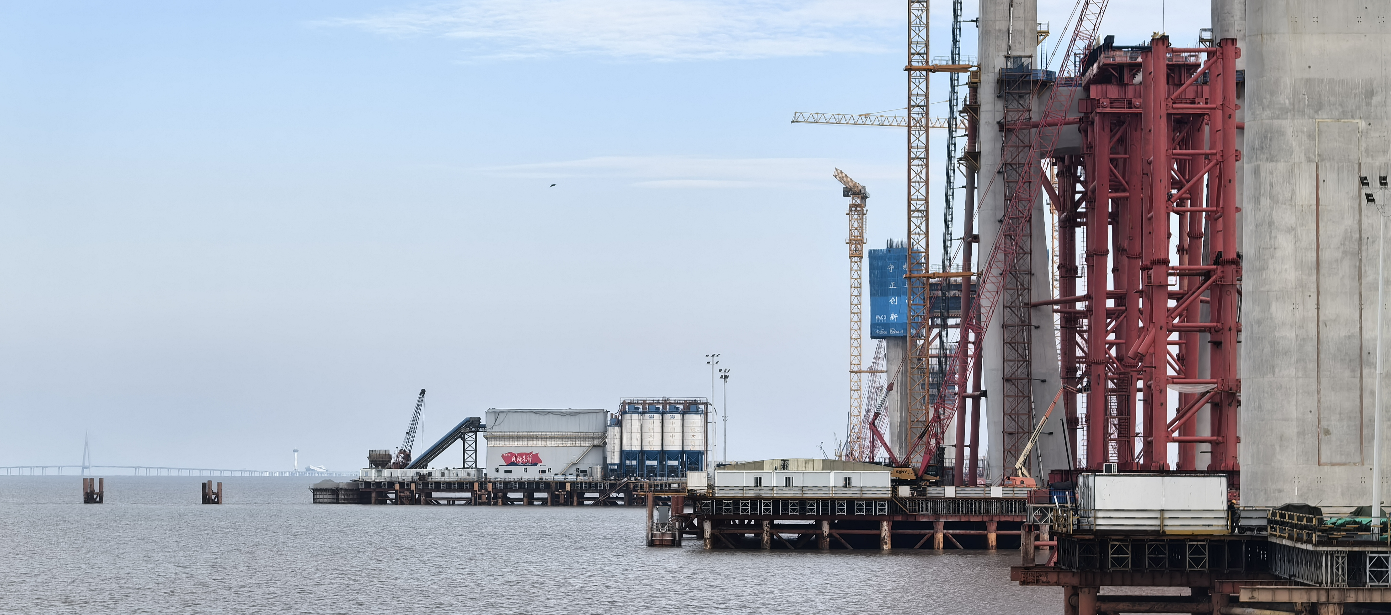 站在位于浙江海盐的通苏嘉甬高铁大桥工程现场,看海上大桥建设正酣。桥塔施工、缆索吊装,橙色起重机与蓝色防护罩交织。远眺海景,蓝天白云下,水天一色。这里是中国桥梁建设的奇迹,是长三角一体化交通枢纽,更是未来城市的美好愿景!