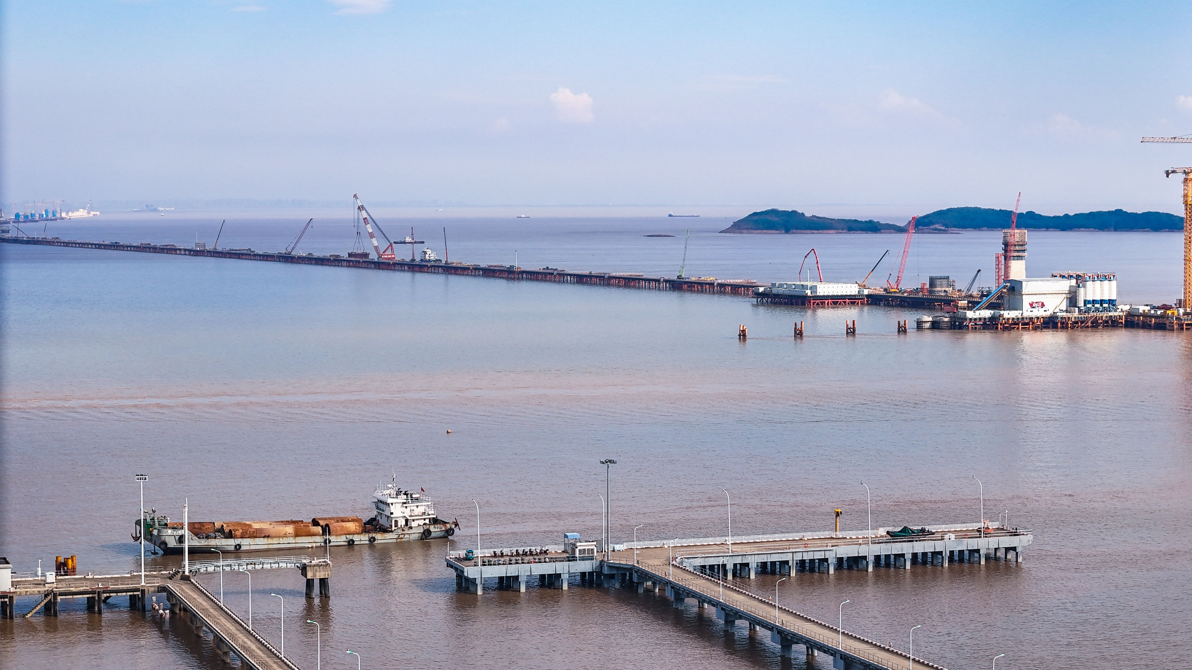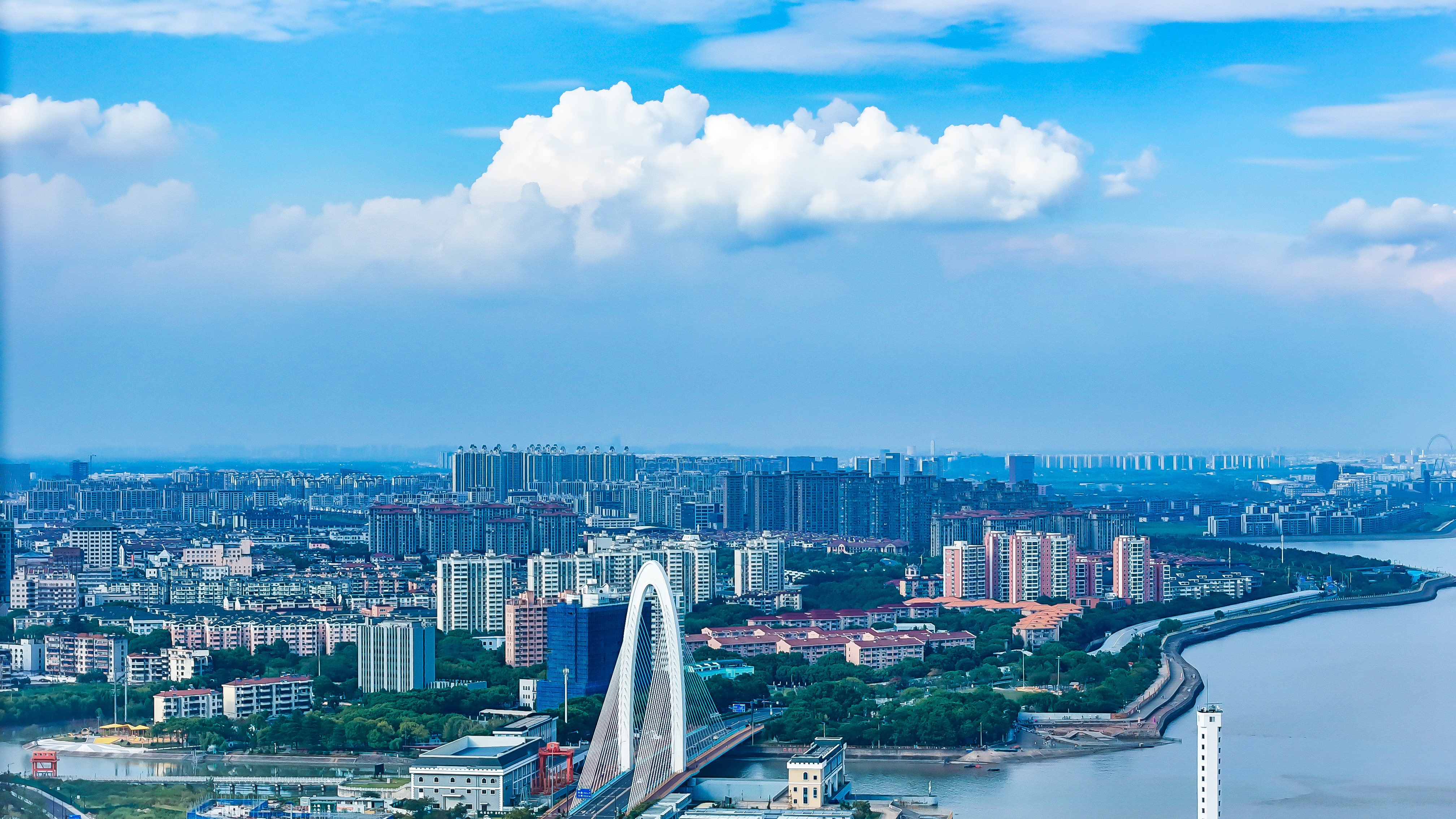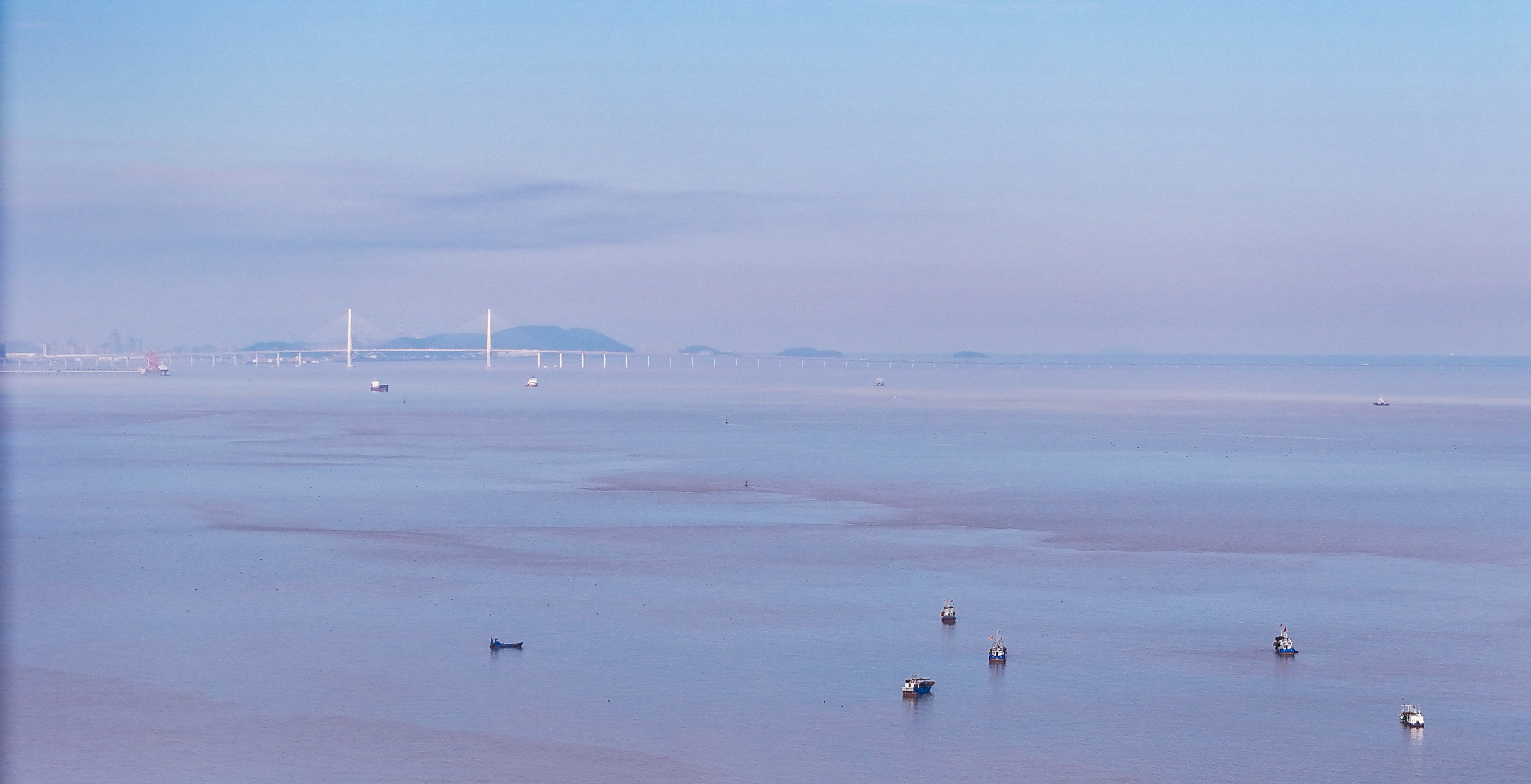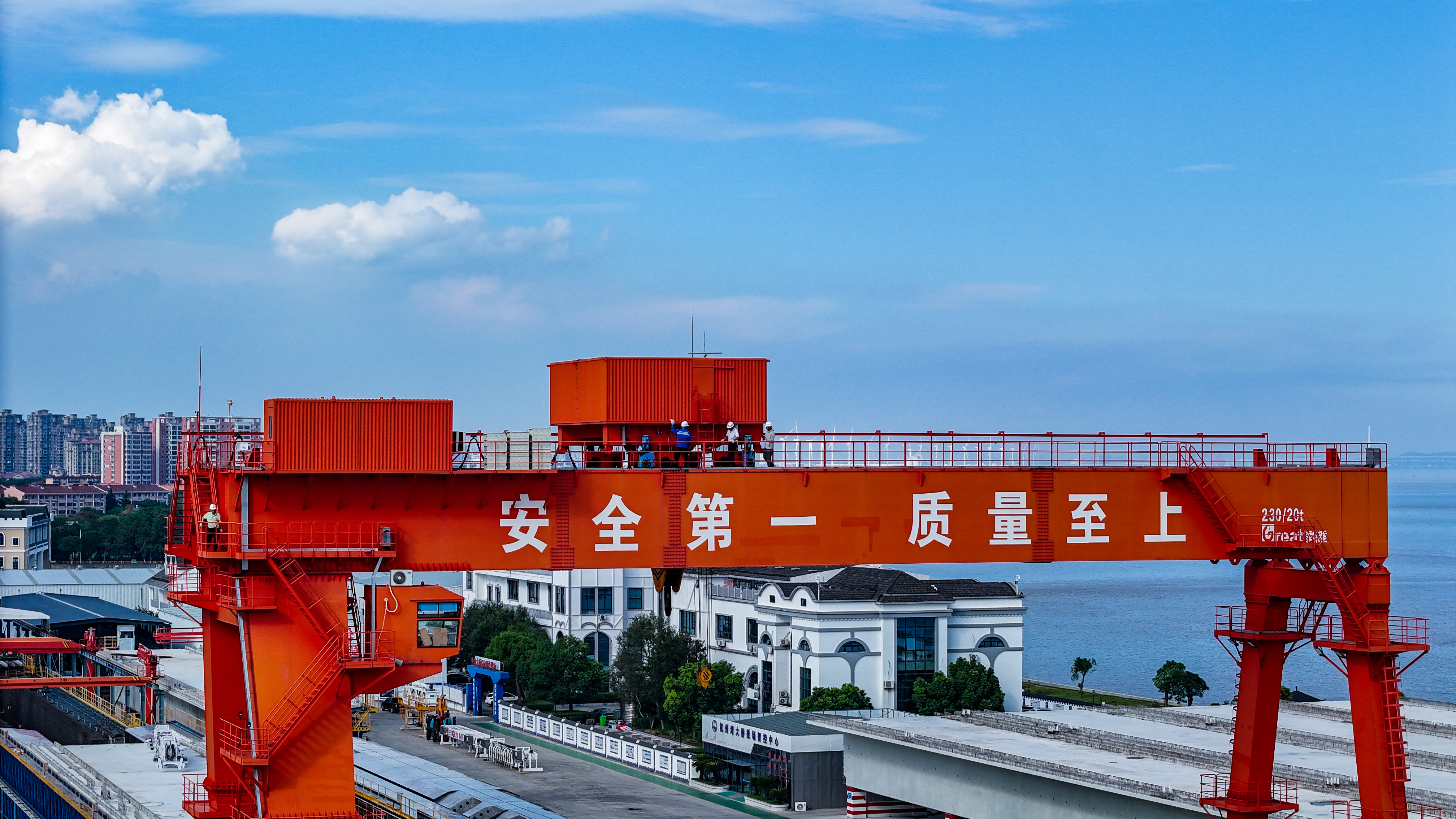 站在位于浙江海盐的通苏嘉甬高铁大桥工程现场,看海上大桥建设正酣。桥塔施工、缆索吊装,橙色起重机与蓝色防护罩交织。远眺海景,蓝天白云下,水天一色。这里是中国桥梁建设的奇迹,是长三角一体化交通枢纽,更是未来城市的美好愿景!