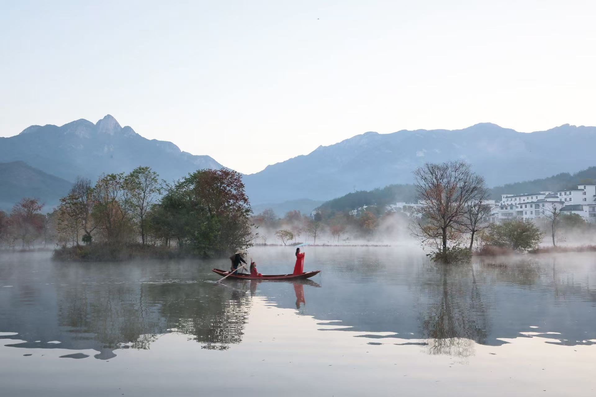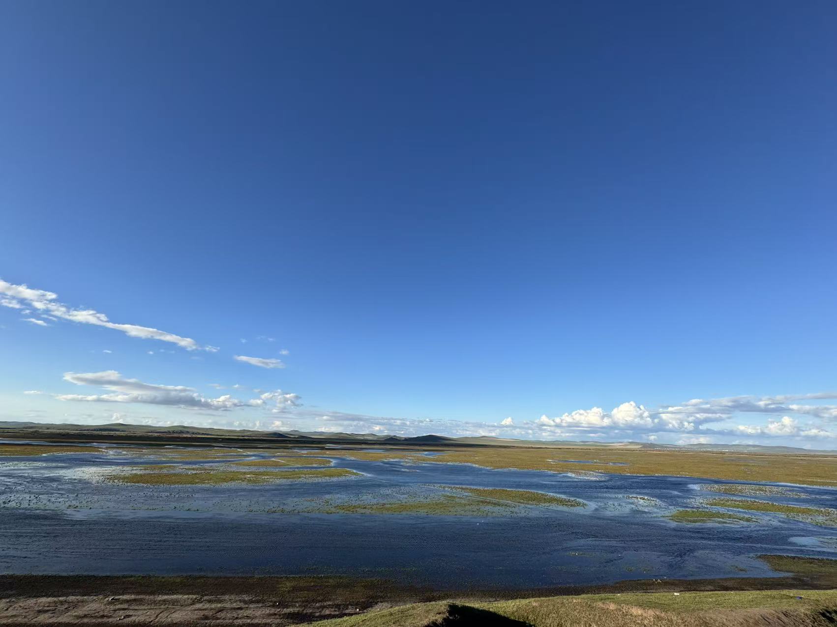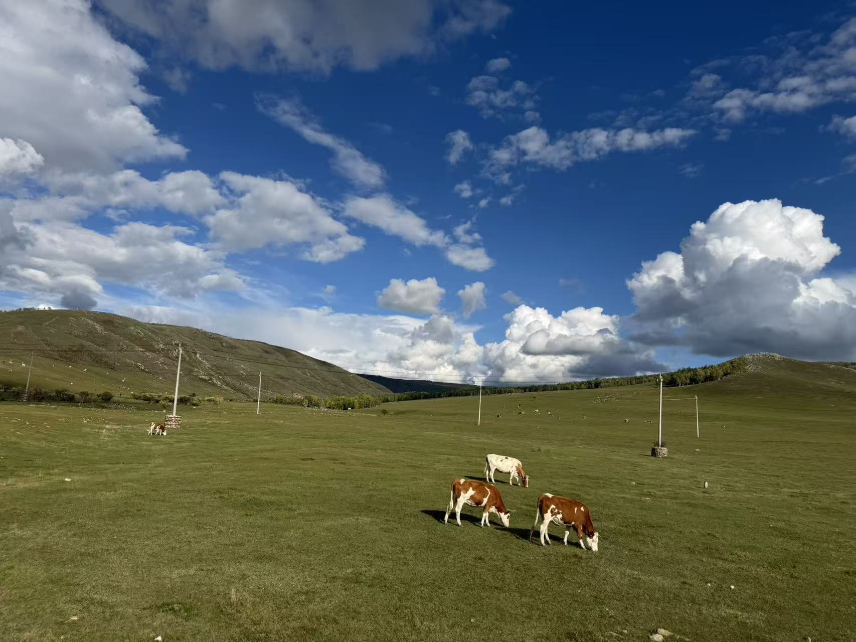 #美景分享#秋日,是草原与天际的私语。牛群悠然,蓝天白云轻吻着七卡湿地;雪山静默,倒映在宁静湖面,水天一色。电线杆与路牌轻诉过往,我划船湖上,偶遇红衣女子,仿佛画中游。此情此景,风景如画,美不胜收。