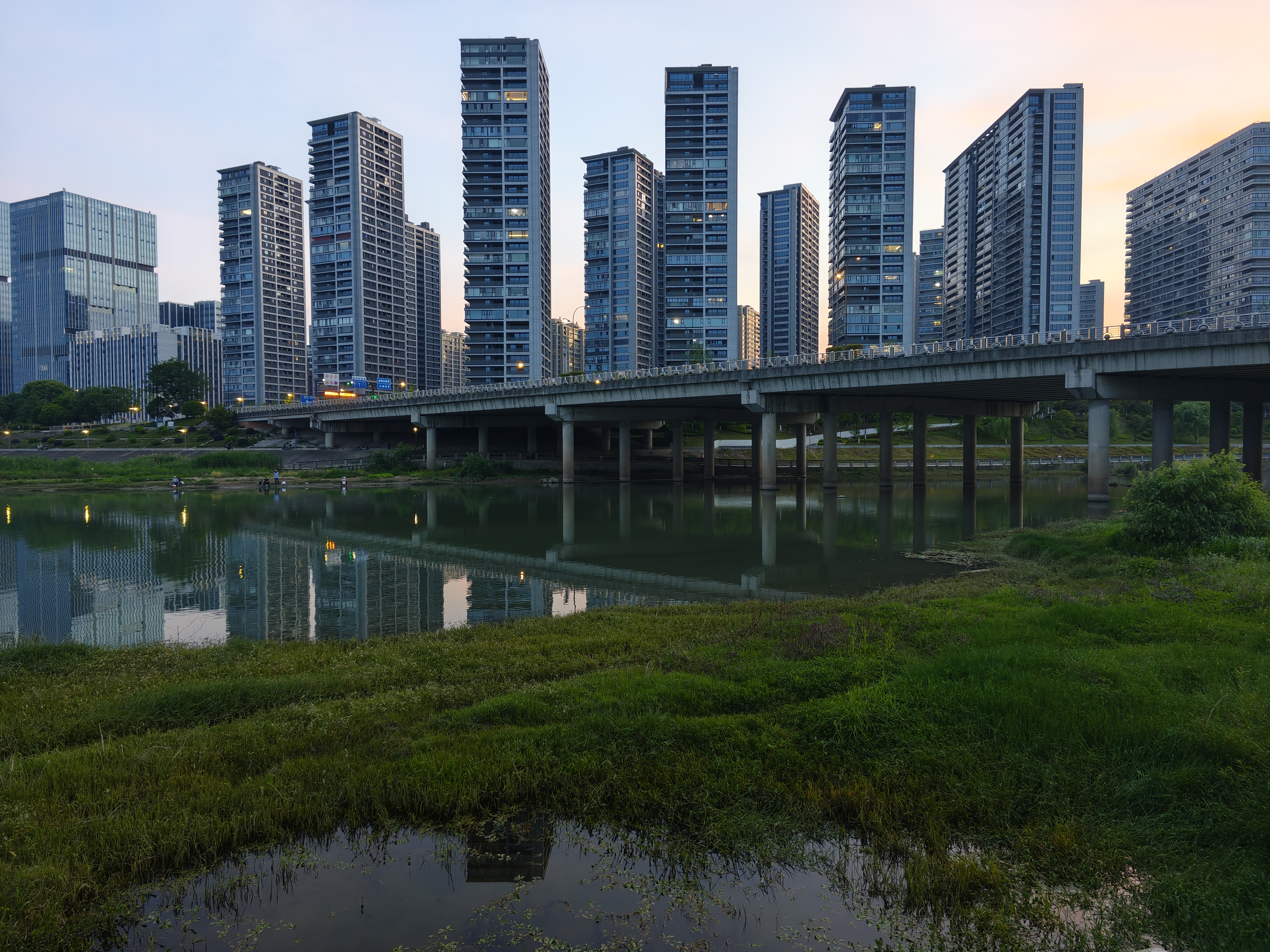 散步滨湖天地,随手一拍都是生活该有的样子。 高层住宅楼与现代建筑群交织。桥梁横跨河流,混凝土桥墩映于水面,湿地植被环绕。灯光初上,城市与自然完美融合,静谧水景中尽显都市生活生态之美。