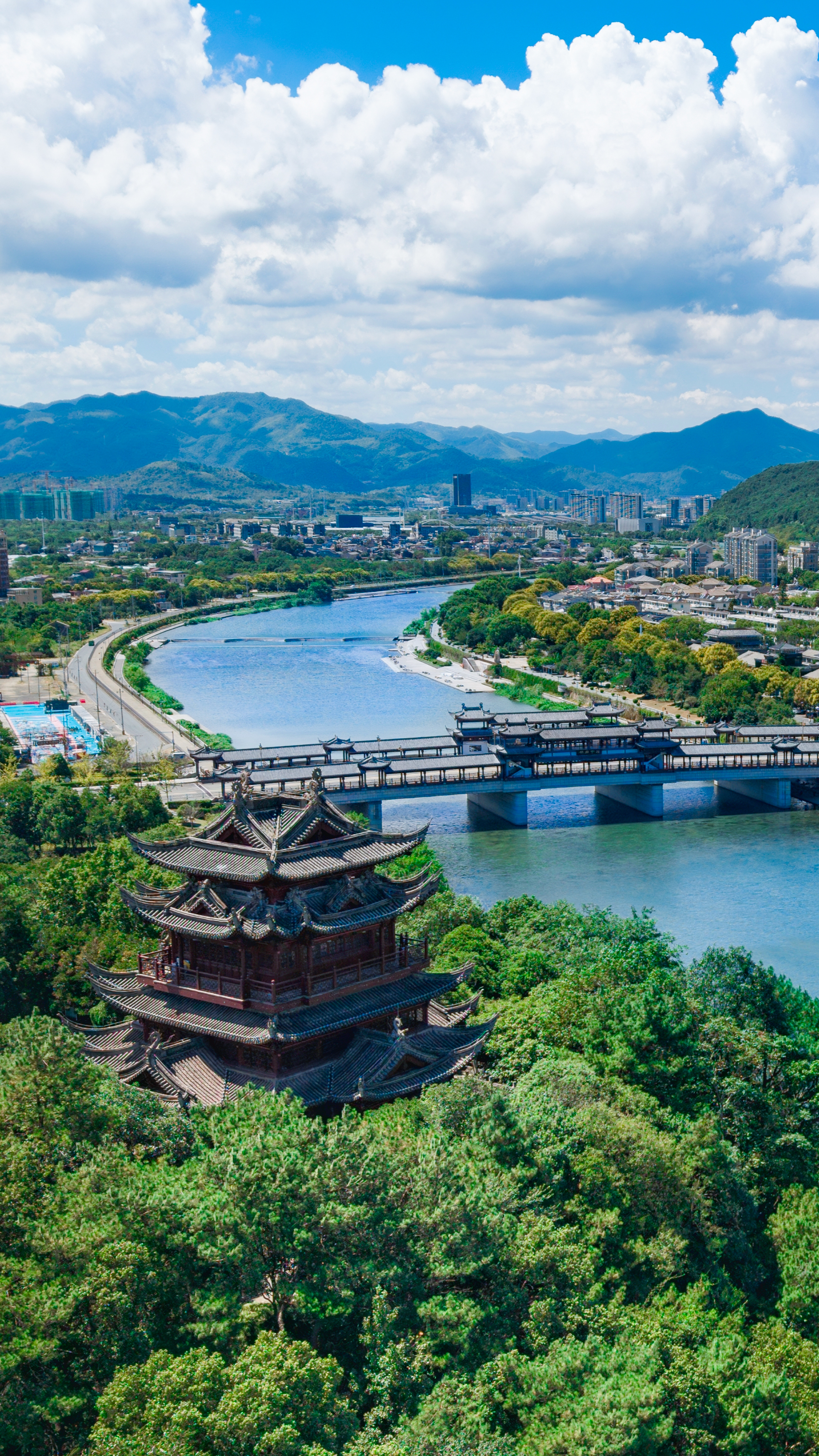 远眺城市风光 沐浴着微风,看向远方,蓝天白云温柔地笼罩着蜿蜒的大桥与繁华的城,那一刻,时光静谧,万物可爱。(兴宁廊桥 人间客/摄)