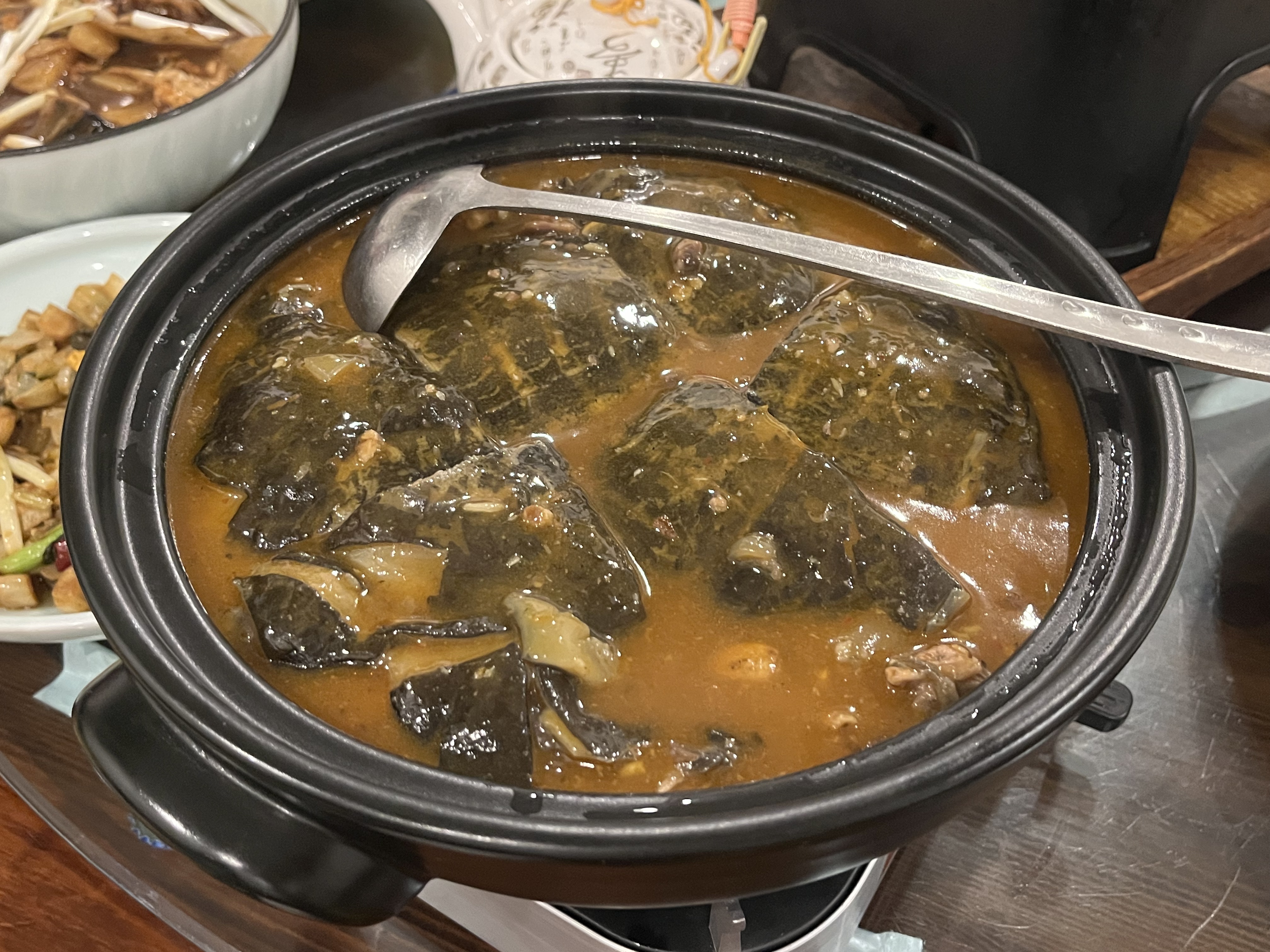 再探福缘居,还是那个老味道。多年前带朋友家人来吃福缘居,必点菜都有油淋鸡和脆皮大肠,这次总算尝到了不一样的新鲜菜。 一落座就先上了一圈丰富的凉菜,卤鸭、素烧鹅咸香入味,凉拌芹菜非常爽口,一口惊艳!吃了一圈凉菜,肚子都已经半分饱。 到了热菜部分,最爱的还是油淋鸡,没有哪家店可以超越。鸡皮炸的酥酥脆脆,泡了一会儿汤汁,又有一些软糯的口感,鸡肉也不会柴,一口咬下去就在嘴里散开。做了那么多年的油淋鸡,还是那口味道。 当然,甲鱼饭和醉蟹也让大家啧啧称赞。醉蟹特别鲜甜,还有黄色的蟹膏,甲鱼汤很浓稠,让人忍不住库库炫饭。还有“三臭”吃了也让人频频点头,臭豆腐浸满汤汁,特别上头,和油炸的比,是不一样的体验,鱼肉也出奇的鲜嫩,转了一圈,鱼都只剩下了半边骨头,可见大家对这道菜的喜爱。还有最后的板栗烧鸡,鸡肉很嫩滑,没有骨头,应该是用了鸡腿肉,板栗香甜,提前入秋了。 下次可以订个包厢,再请家人豪吃一顿😋😋