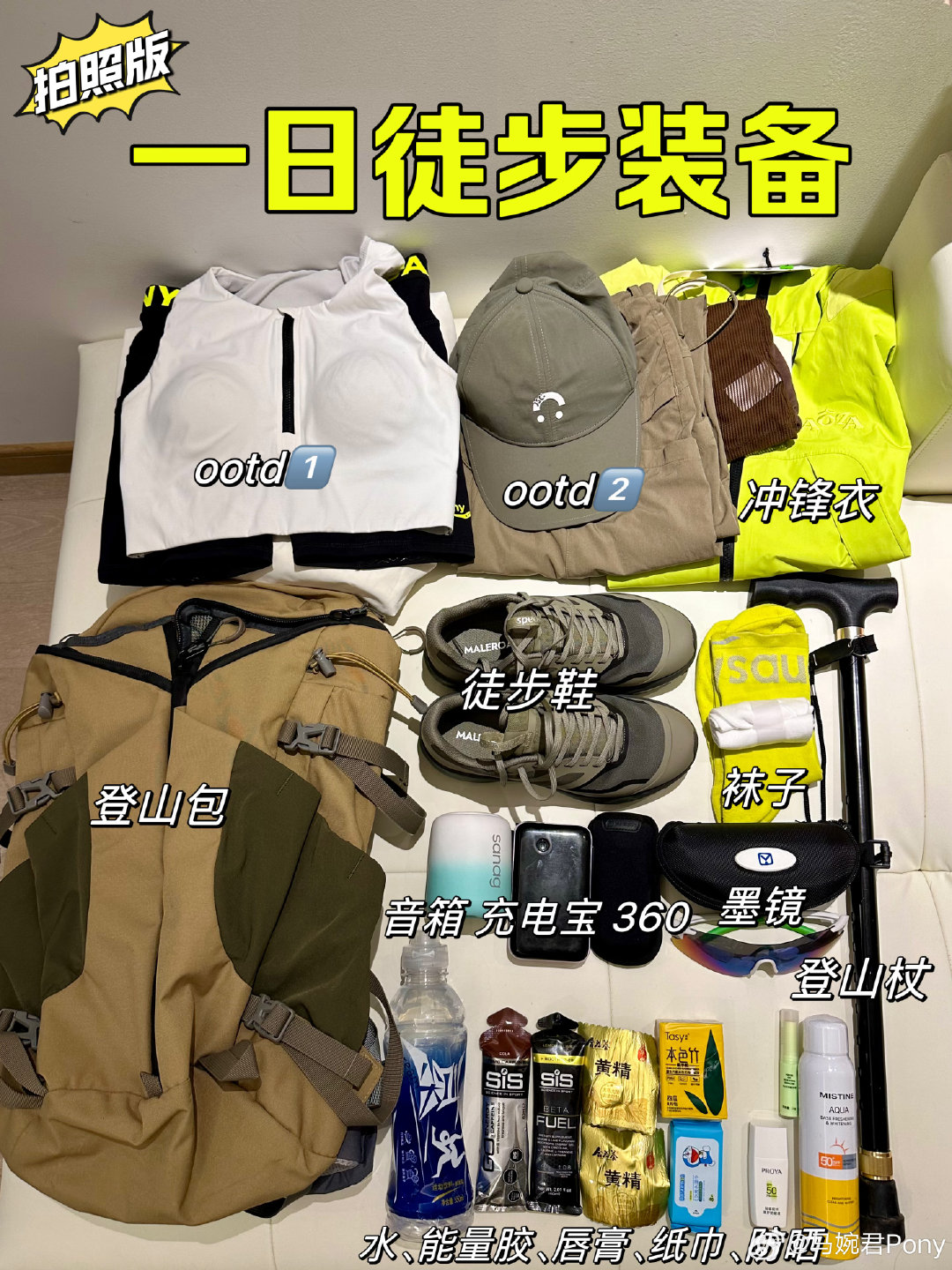 徒步装备|午潮山一日徒步装备清单,含攻略!天气降温了20多度正适合徒步路线:我们走了19.77公里可以两步路app搜:午潮山豆腐皮大环线带的装备1️⃣ootd拍照look必须:登山包、徒步鞋、工装裤、冲锋衣、登山杖墨镜️等 根据天气看要不要带一套换的look 尤其是运动bra 可以放在车里 爬完了换Brooks彳亍迈路士冲锋衣:AOZA2️⃣充电宝 蓝牙音箱有的地方没有信号 一天徒步下来也容易手机没电 充电宝是一定要带 蓝牙音箱就可以路上放歌3️⃣补剂尖叫:喝着方便能量胶 蛋白棒这些4️⃣拍摄基础的就手机 也可以带360 GoPro 大疆等 看个人需求5️⃣其他防虫驱蚊纸巾湿巾唇膏 防晒霜 防晒喷雾有必要的创可贴 碘伏棉签这些
