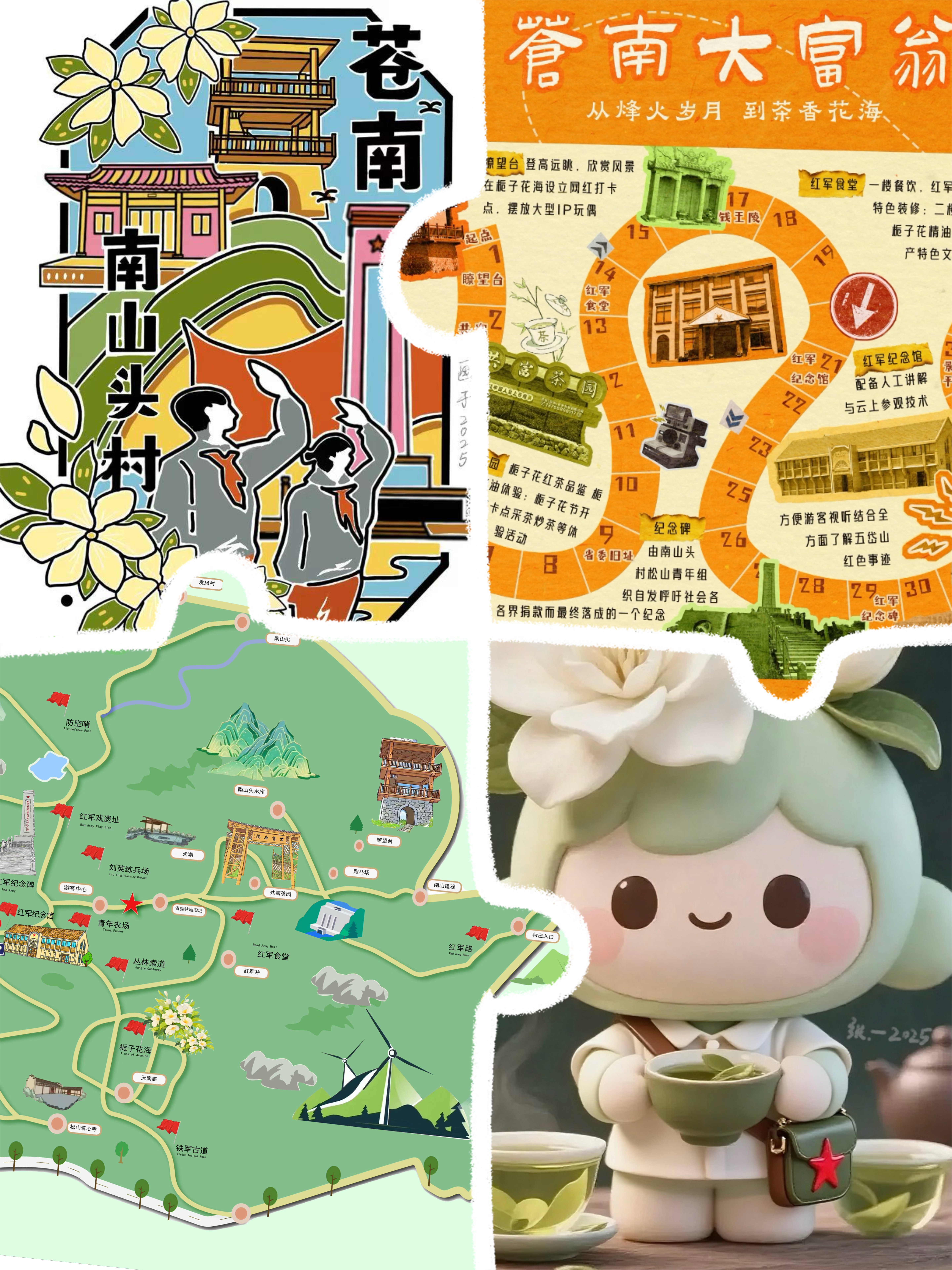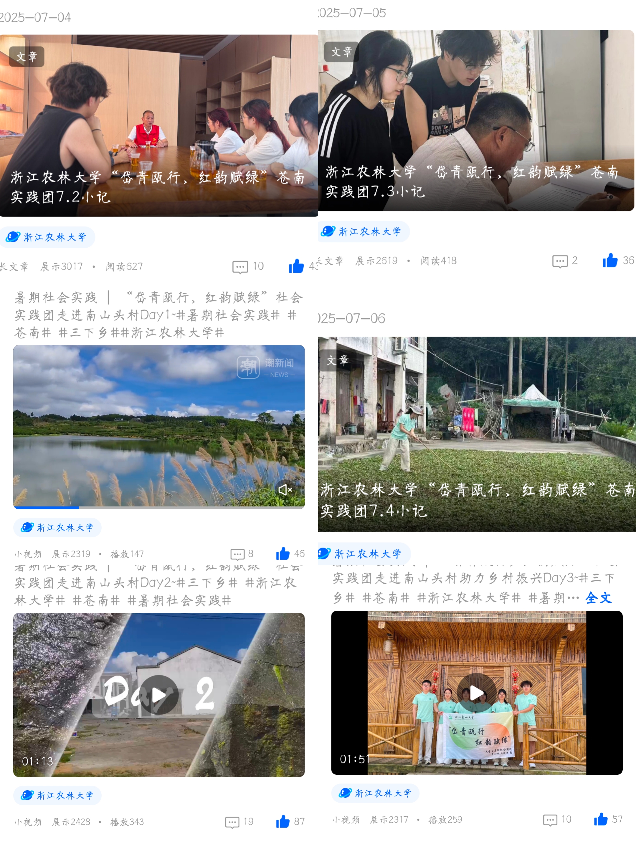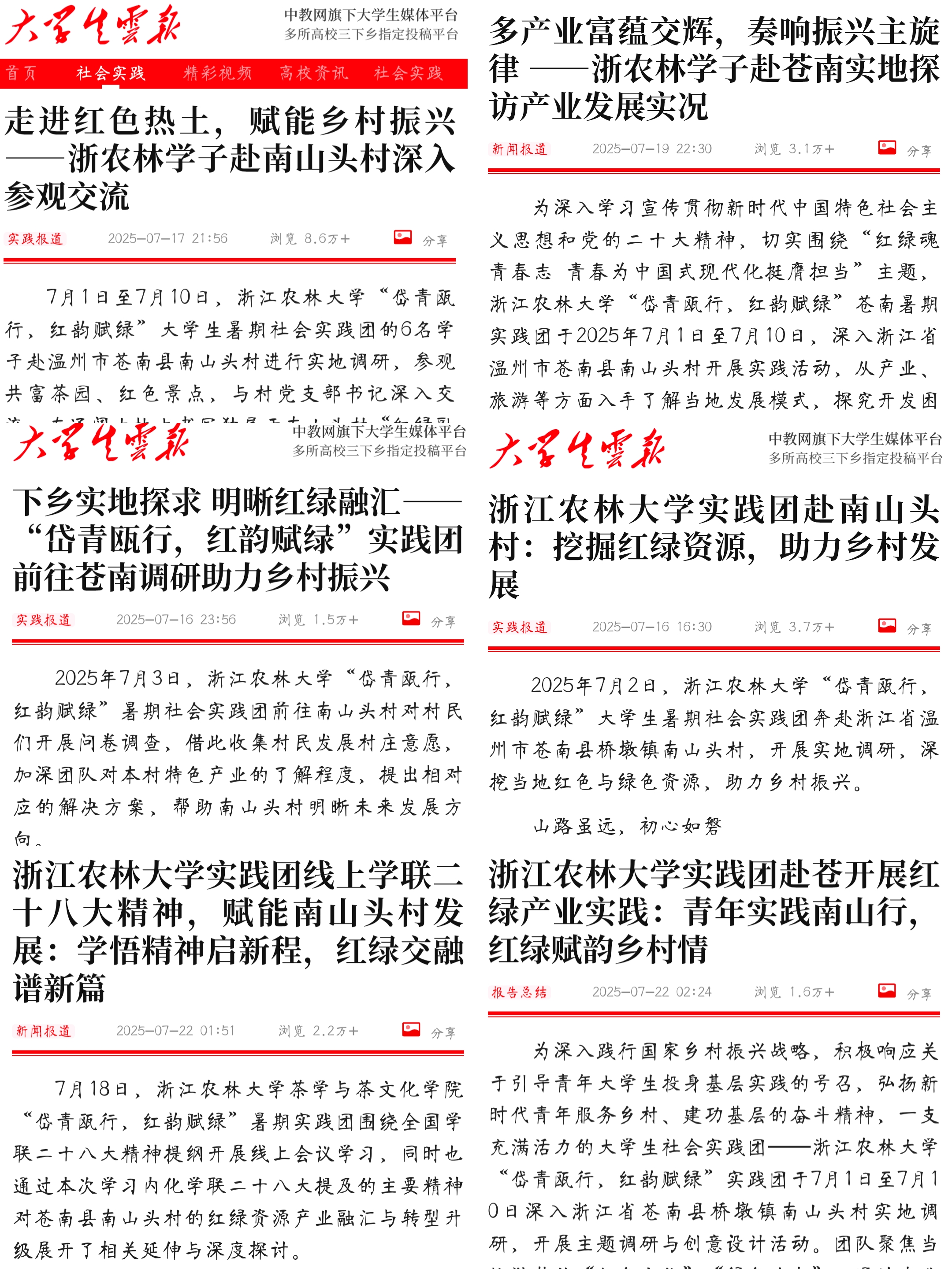 浙江农林大学“岱青瓯行,红韵赋绿”暑期社会实践团正在参加潮新闻客户端举办的“2025大学生暑期实践”30强进10强pk赛,欢迎大家来给我们点赞! 团队名称:浙江农林大学“岱青瓯行,红韵赋绿”暑期社会实践团 团队口号:岱青寻绿赋红韵,振歌扬瓯南山行 团队简介 该团队分工清晰、目标明确,实地调研组前往温州市苍南县桥墩镇南山头村展开调研,文案扩写组负责新闻稿撰写与媒体宣传,艺术设计组负责成果输出转化,三位一体发挥专业优势,多元探究该地红绿融合赋能乡村振兴路径,探索绿色产业开发的潜力与价值,并深入挖掘“苍南井冈山”的红色革命历史与先辈事迹。本团队采用调查问卷、走进访谈及历史案例研究的方法,基于宏-微视角剖析南山头村的红绿资源的赋能情况,探索南山头村红绿资源进一步的开发利用,并提出实际有效的解决方案,剪辑宣传视频以及设计相关文创周边、独特IP形象。实践团队贯彻浙江农林大学“肯干实干能干”的三干精神,希望能够通过阶段性深耕,将南山头村打造成红色与绿色共同发展的文旅综合体,促进实现乡村持续发展。 团队成果 艺术设计方面:本团队通过实地考察与线上交流相结合的方式,在对南山头村进行初步考察后,制作了南山头村发展优劣势的SWOT图与村民期望图;在了解当地特色之后,设计了独特IP形象,并起名为南小栀;对当地景点考察后,设计绘制了旅游导览图;在文创产品方面,设计了可与旅游路线结合的套色印章;同时,本团队详细分析了南山头村存在的问题,探讨并给出了一份具有可行性的调研报告与南山头村全域旅游振兴发展策划案,以期为南山头村的可持续、良性发展作出贡献。 媒体宣传方面:此次实践通过潮新闻、大学生云报、中教网等多平台宣传累计24w阅读量,8000+点赞,单篇最高浏览量8.6w。团队以实践角度展示南山风采,用青春创意将绿色生机融入红色记忆,为南山头村提升知名度提供青春智慧,为拓宽产业发展路径贡献青春力量。