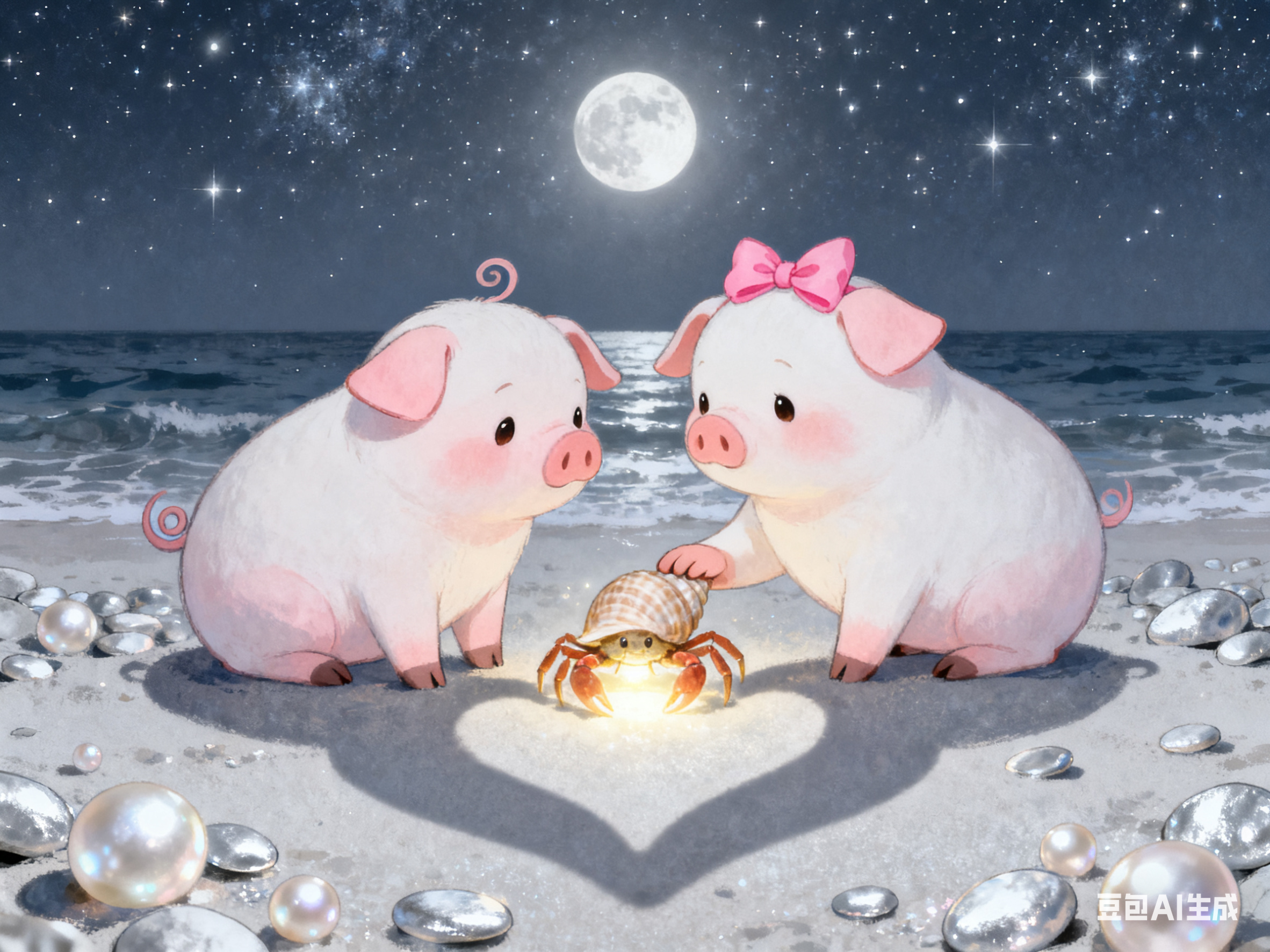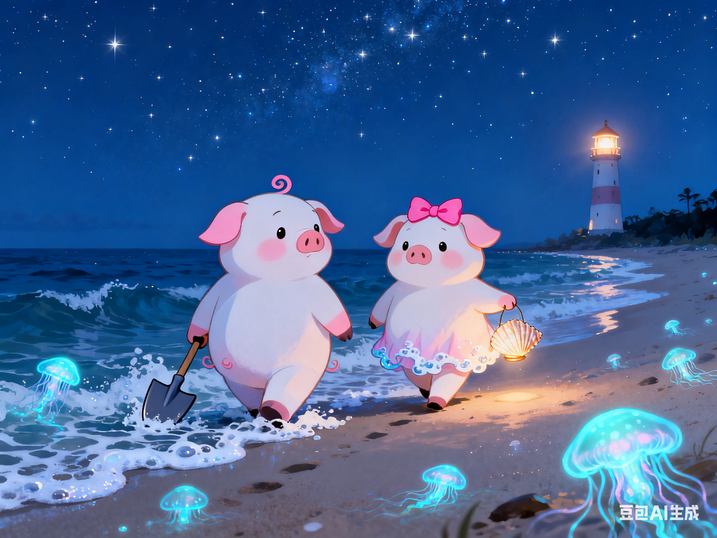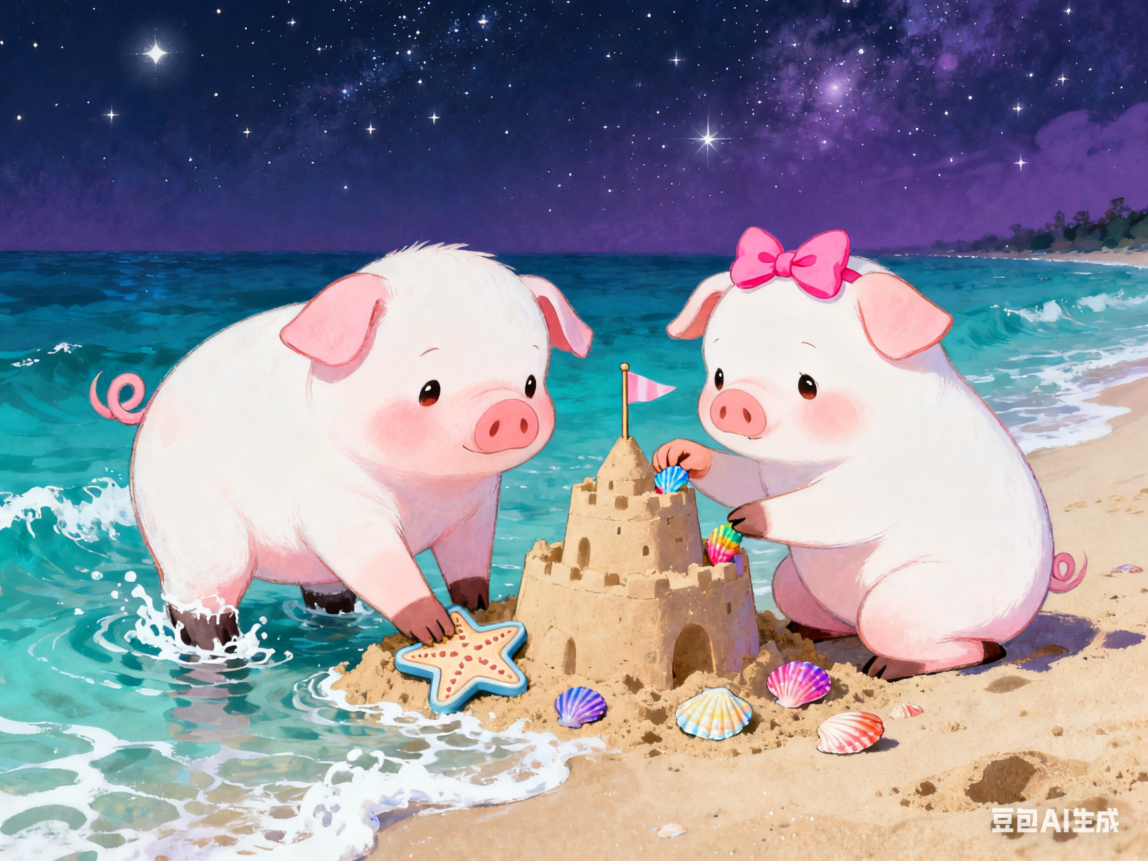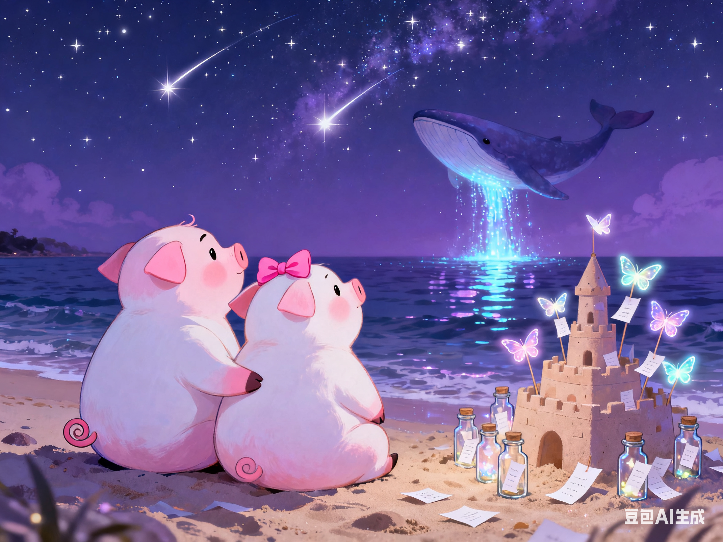 在海边星空下,小猪情侣提着贝壳灯笼走向沙滩。猪猪王子拖着小铲子,猪小妹裙摆沾着海浪泡沫,远处灯塔闪烁暖光。他们蹲在浅水区堆沙堡,猪猪王子用海星模具压花纹,猪小妹往沙堆插彩色贝壳,浪花轻漫小蹄子。猪小妹发现发光的寄居蟹,猪猪王子用手护住,影子在月光下叠成爱心。他们依偎看流星入海,沙堡旁许愿瓶飘出夜光蝴蝶,远处鲸鱼喷出荧光水柱,浪漫又温馨。