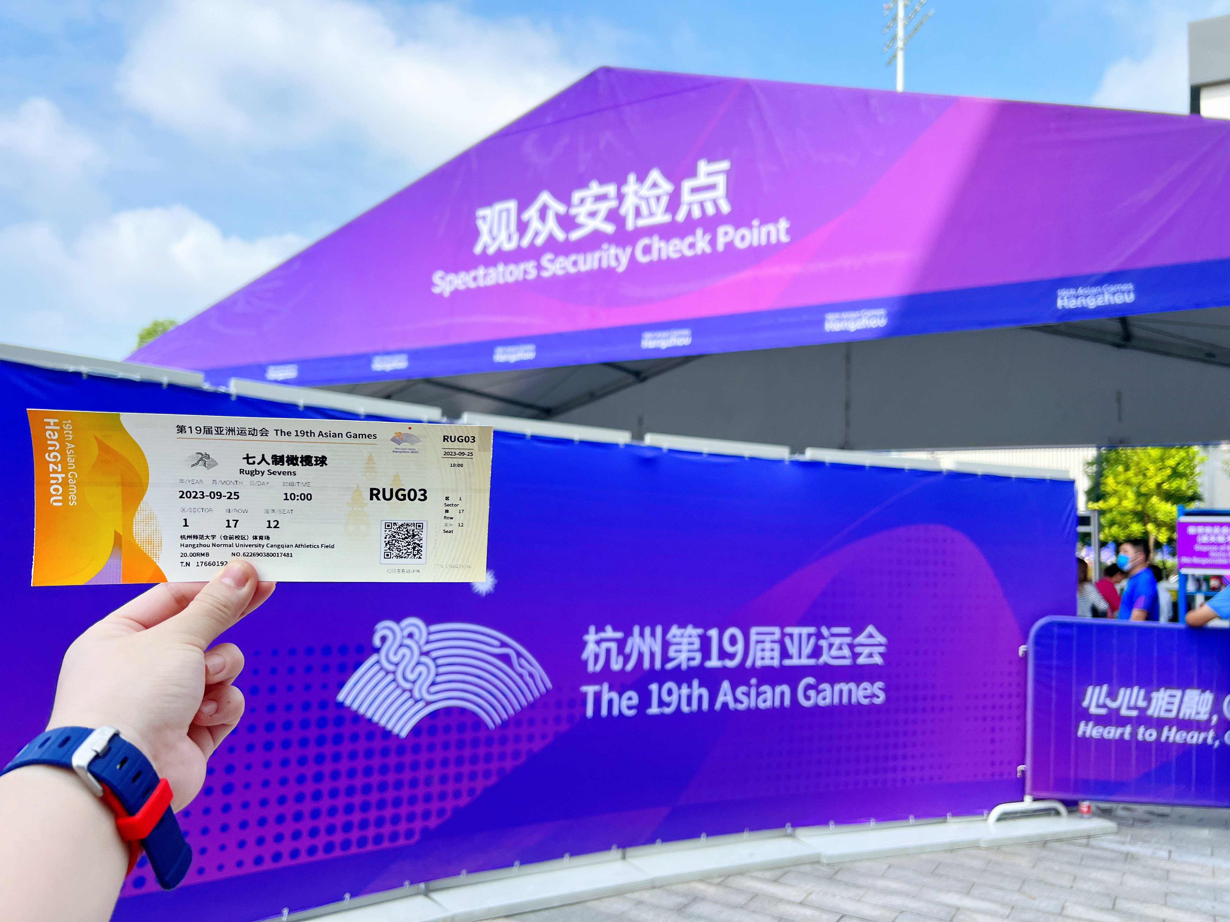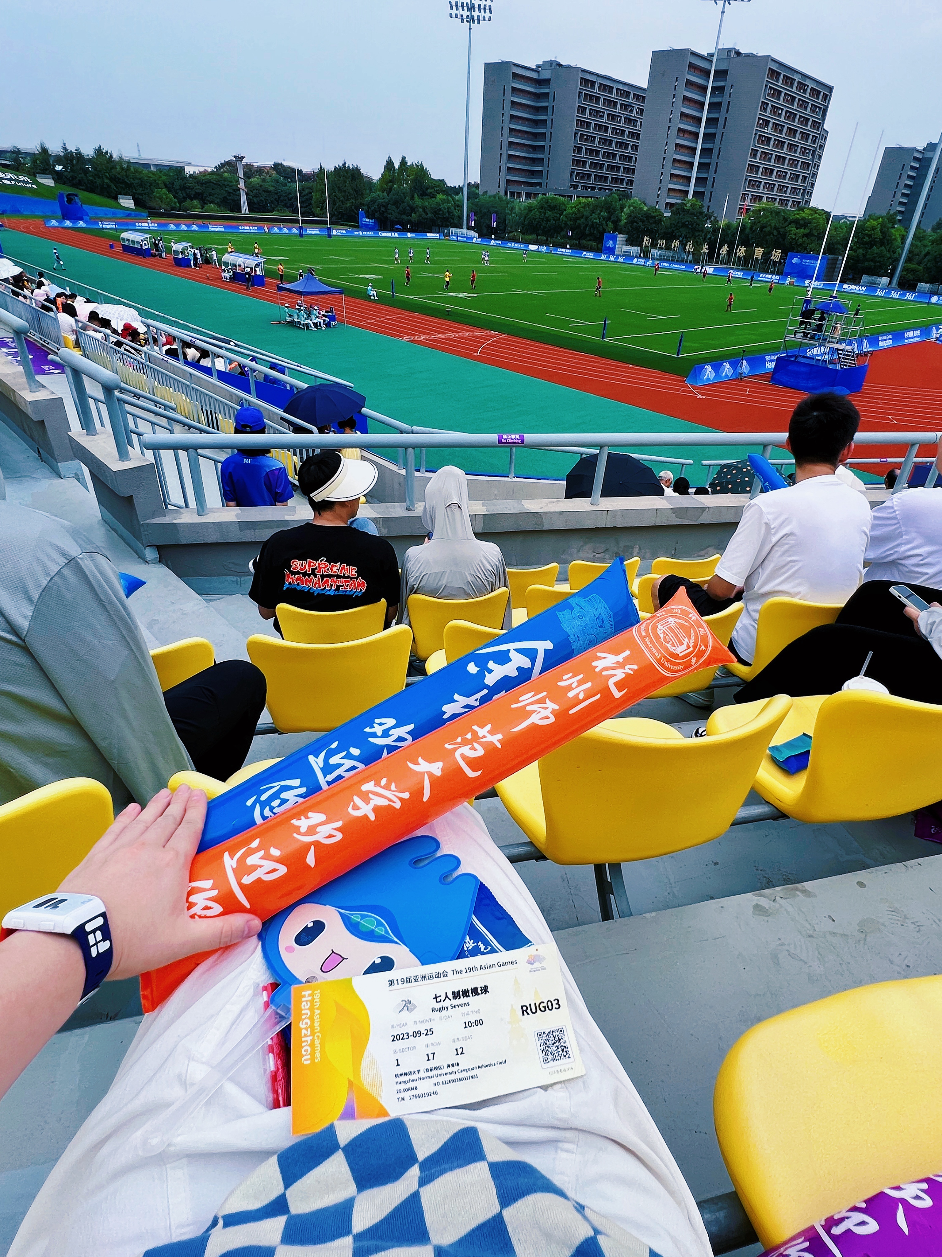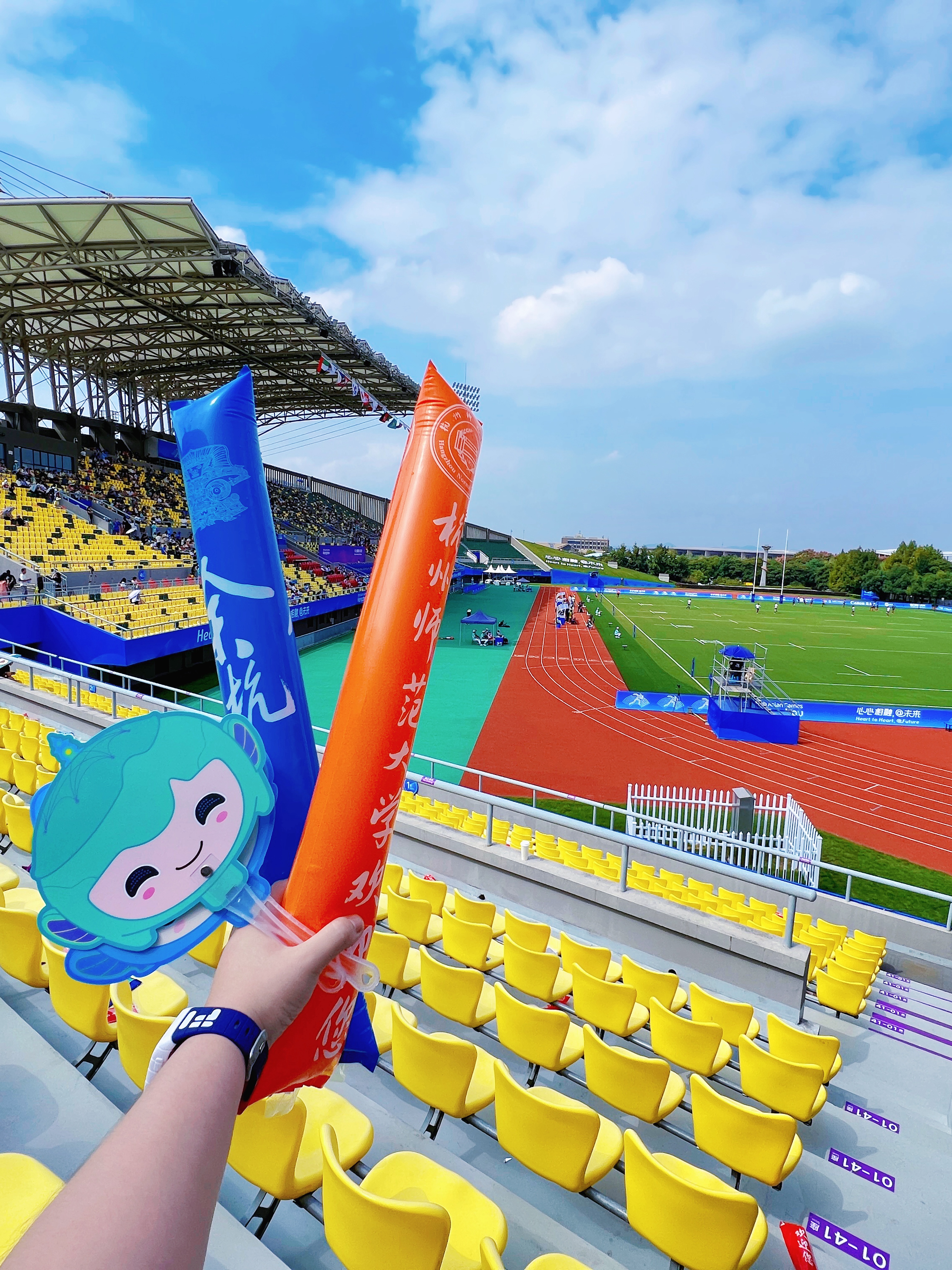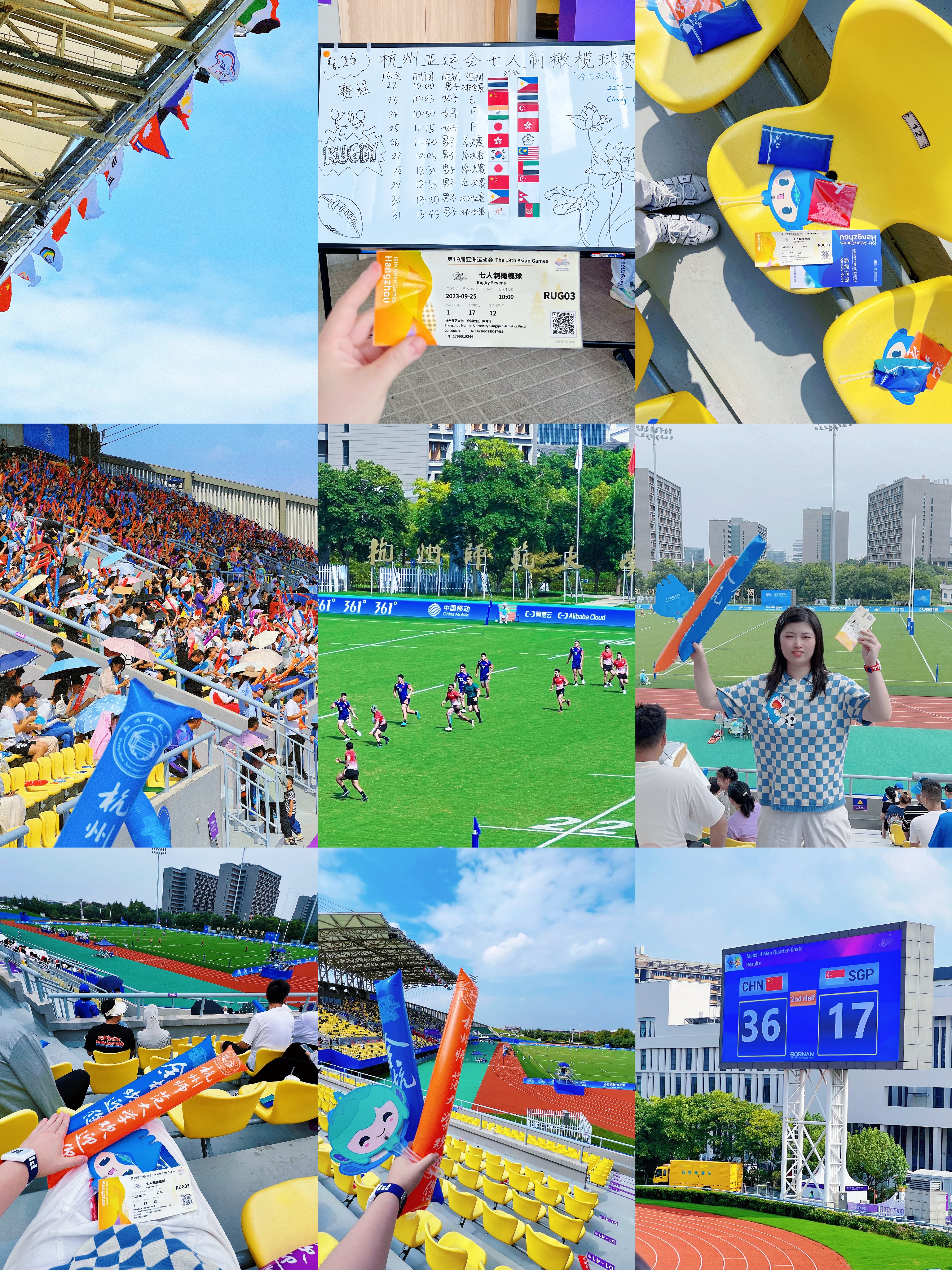 2023.09.25在杭州师范大学仓前校区我在现场观看七人制橄榄球赛程,这是属于户外体育场的竞赛。我在现场总共观看了十场比赛,其中有中国队参与的比赛,我最难忘的亚运瞬间就是当中国队上场的时候,全场欢呼沸腾起来了,当时真的很激动很热烈地和大家一起加油呐喊,在杭州师范大学的操场上我们浙江人很自豪很兴奋地在家门口观看亚运比赛好幸福啊!虽然全天暴晒晒得通红通红,但是还是觉得一切很值得,因为这是看完亚运会橄榄球比赛后的功勋章颜色。 蓝天白云,彩旗飘飘,绿荫操场,红色跑道 这是一场在大学校园里举办的亚运赛事 到处是青春活力的气息,当时更值得一提的是服务于赛事观众席的杭师范仓前校区的小青荷们,很热情互动交流并乐于助人。从他们的身上能感受到学生时代的自己,如果当时还有空还想逛一逛他们的校园。