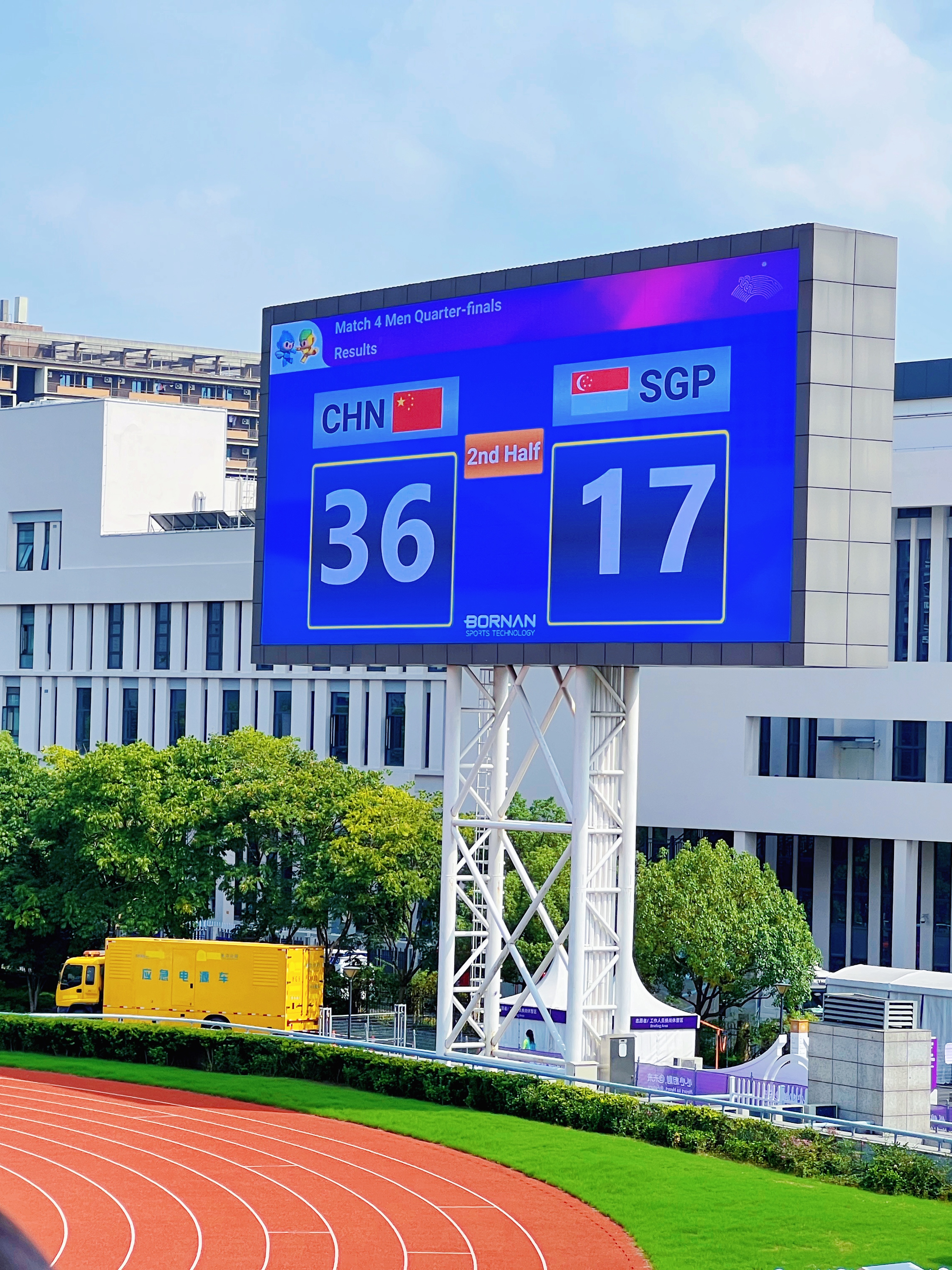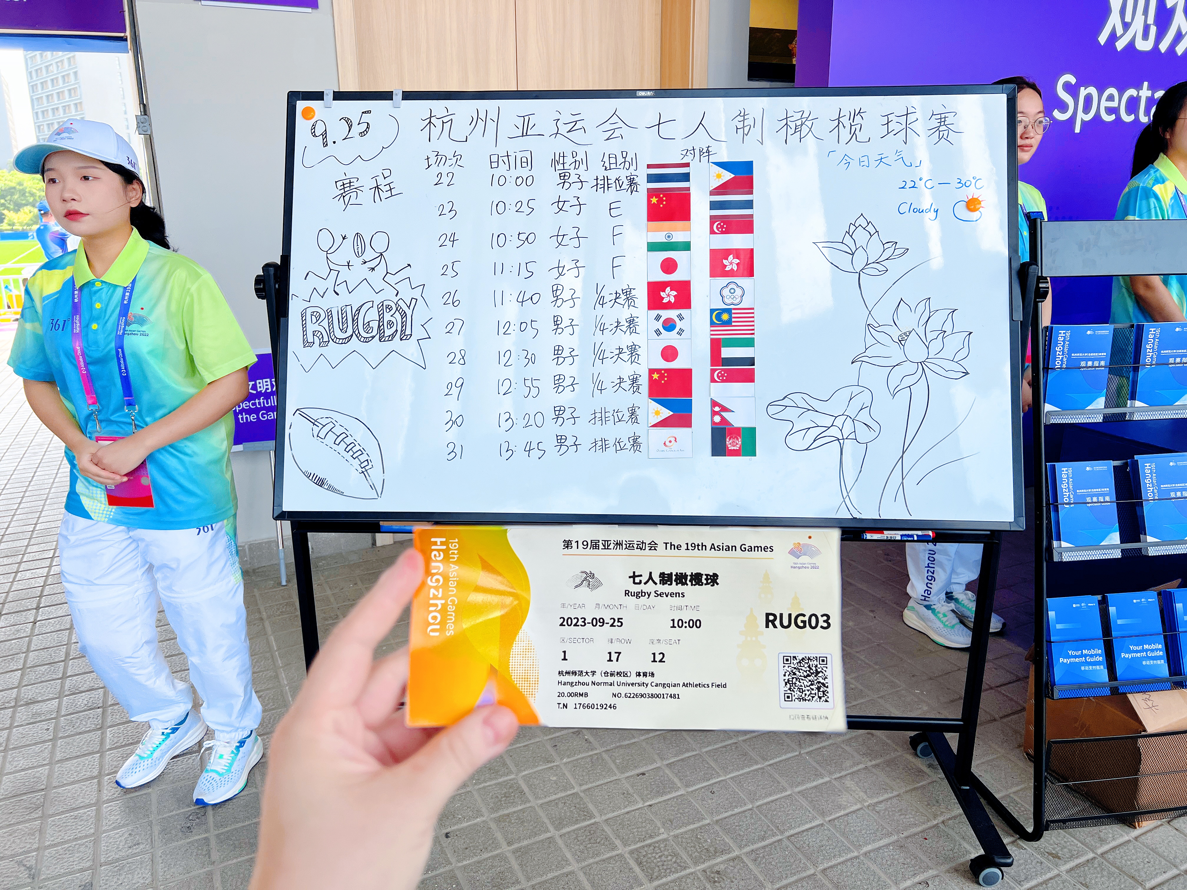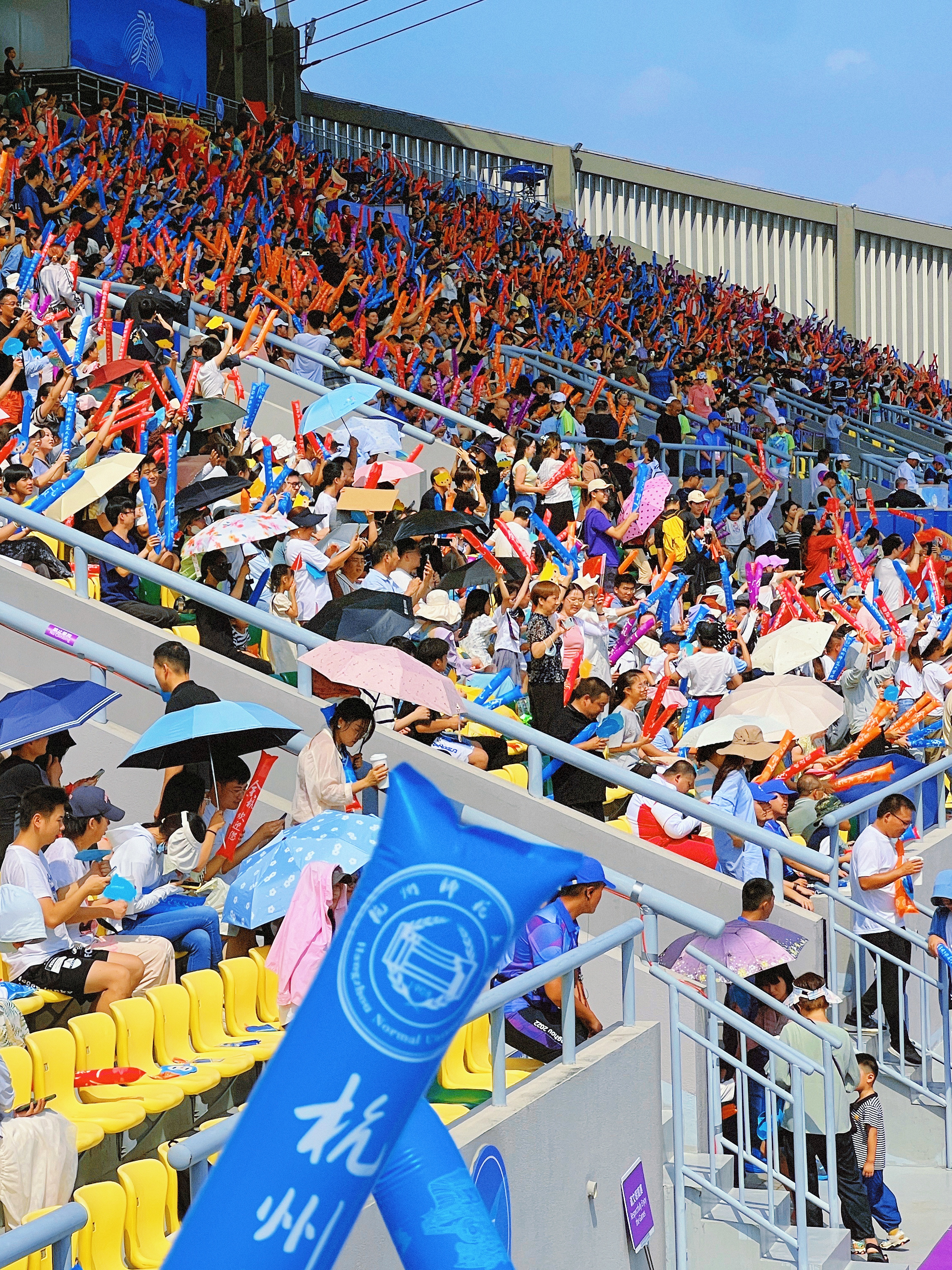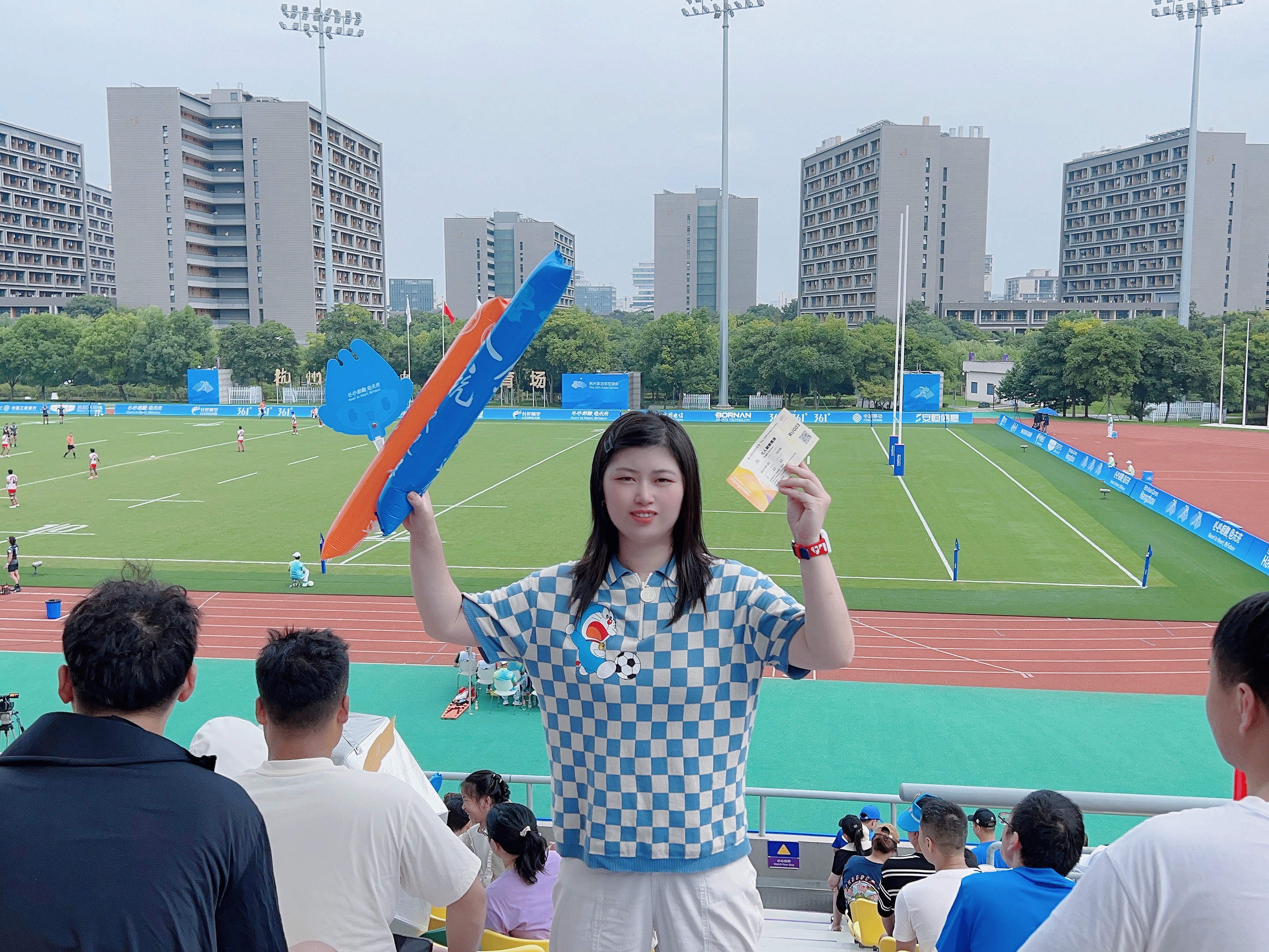 2023.09.25在杭州师范大学仓前校区我在现场观看七人制橄榄球赛程,这是属于户外体育场的竞赛。我在现场总共观看了十场比赛,其中有中国队参与的比赛,我最难忘的亚运瞬间就是当中国队上场的时候,全场欢呼沸腾起来了,当时真的很激动很热烈地和大家一起加油呐喊,在杭州师范大学的操场上我们浙江人很自豪很兴奋地在家门口观看亚运比赛好幸福啊!虽然全天暴晒晒得通红通红,但是还是觉得一切很值得,因为这是看完亚运会橄榄球比赛后的功勋章颜色。 蓝天白云,彩旗飘飘,绿荫操场,红色跑道 这是一场在大学校园里举办的亚运赛事 到处是青春活力的气息,当时更值得一提的是服务于赛事观众席的杭师范仓前校区的小青荷们,很热情互动交流并乐于助人。从他们的身上能感受到学生时代的自己,如果当时还有空还想逛一逛他们的校园。