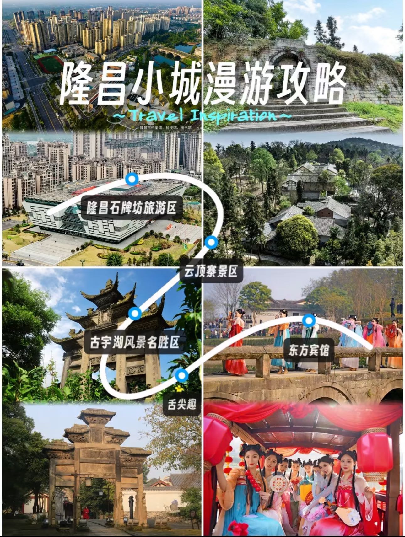 隆昌漫游指南 | 川南青石小城,藏着六百年人间烟火🏮 假期出行,再不要去挤人潮!当川西人潮如织,不如转身探访川南这座被时光眷顾的青石小城——隆昌。没有喧嚣,只有青石板上回荡的脚步声,和牌坊群间流淌的静谧历史。 🚄交通指南: 成都/重庆/内江出发,高铁1小时左右直达,周末说走就走无压力! 🗺️推荐景点 🏯隆昌石牌坊群 “中国石牌坊之乡”的核心地标,17座明清牌坊沿街而立,像一本立体的史书。傍晚时分灯光亮起,青石雕刻在光影间更显沧桑质感。 🏚️云顶寨 川东第一寨,坐落在云顶山上。清晨云雾缭绕时最美,古老寨墙、庄园群若隐若现,还能听说这里特有的“鬼市”传统,氛围感拉满。 💦 古宇湖 免费开放的城市湖泊,四季皆景。夏天可泛舟游湖,冬季成群的候鸟飞来,是观鸟摄影的好去处。 🍜舌尖隆昌: ▫️必尝一碗隆昌羊肉汤 ,汤色奶白、肉质鲜嫩,秋冬来一碗暖心又暖胃。 ▫️想一站式吃遍本地味,推荐 #隆昌新街里# ,集合了盐帮菜、烧烤等地道美食。 ▫️如果遇上隆昌稻田虾音乐美食节,别忘了体验钓虾、吃虾的田园乐趣! 🎨特色体验: ▪️亲手制作 #隆昌土陶# ,感受非遗技艺的温度 ▪️夜晚漫步石牌坊,看灯光为历史建筑披上梦幻外衣 🏨住宿推荐: 隆昌东方宾馆,位置便利,闹中取静,适合作为探索小城的大本营。 📅行程建议: 𝐃𝐚𝐲𝟏:午后抵达→石牌坊群→晚餐羊肉汤→牌坊夜景 𝐃𝐚𝐲𝟐:云顶寨晨雾→土陶体验→新街里美食探索 𝐃𝐚𝐲𝟑:古宇湖漫步→品尝稻田虾→返程 Tips: ✅秋季气候宜人,适逢美食节,是来访好时节 ✅小城不大,适合慢节奏2-3日游,感受时光停滞的宁静 隆昌的美,藏在青石的纹路里,飘在羊肉汤的热气中,也闪烁在古寨的晨雾间。这个秋天,来这里开启一场治愈系的小城漫游吧✨