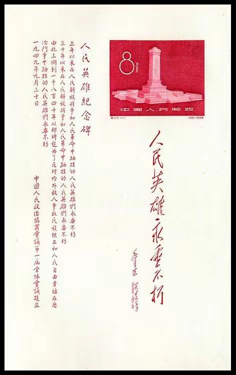 邮你分享(五) 高瞻远瞩的人民英雄纪念碑碑文 . 今天9月30日,是我国第12个烈士纪念日。党和国家领导人将在北京天安门广场,向人民英雄纪念碑敬献花篮。 人民英雄纪念碑奠基于1949年9月30日,1958年4月落成,5月1日隆重揭幕。 纪念碑正面(北面)镌刻着毛泽东同志的题词“人民英雄永垂不朽”8个馏金大字;背面(南面)是周恩来同志书写的、中国人民政治协商会议第一届全体会议通过的碑文:“人民英雄纪念碑。三年以来,在人民解放战争和人民革命中牺牲的人民英雄们永垂不朽!三十年以来,在人民解放战争和人民革命中牺牲的人民英雄们永垂不朽!由此上溯到一千八百四十年,从那时起,为了反对内外敌人,争取民族独立和人民自由幸福,在历次斗争中牺牲的人民英雄永垂不朽!” 这篇碑文,是毛泽东同志挥笔撰成的,在这100多字碑文中,何以没有“中国共产党”一词?. 原来,在讨论纪念碑时,身为中国共产党主席的毛泽东曾提出三个要求: 首先,在碑文中不写中国共产党。其次,纪念碑上的浮雕不出一个英雄人物,以表现重大历史事件。落成后的纪念碑上的浮雕,果然没有一个英雄人物,表现的“虎门焚烧鸦片”、“金田起义”、“武昌起义”、“五四运动”、“五卅运动”、“南昌起义”、“抗日游击战争”、“人民解放军胜利渡长江”和“支援前线”、“庆祝解放”等10幅装饰性浮雕。 其三,突出人民主导性地位。一篇百来字碑文,连出九个“人民”两字,真是主题突出,导向明确,高瞻远瞩,光耀千秋! 崇仰-高瞻远瞩的纪念碑碑文! 致敬-永垂不朽的人民英雄们!