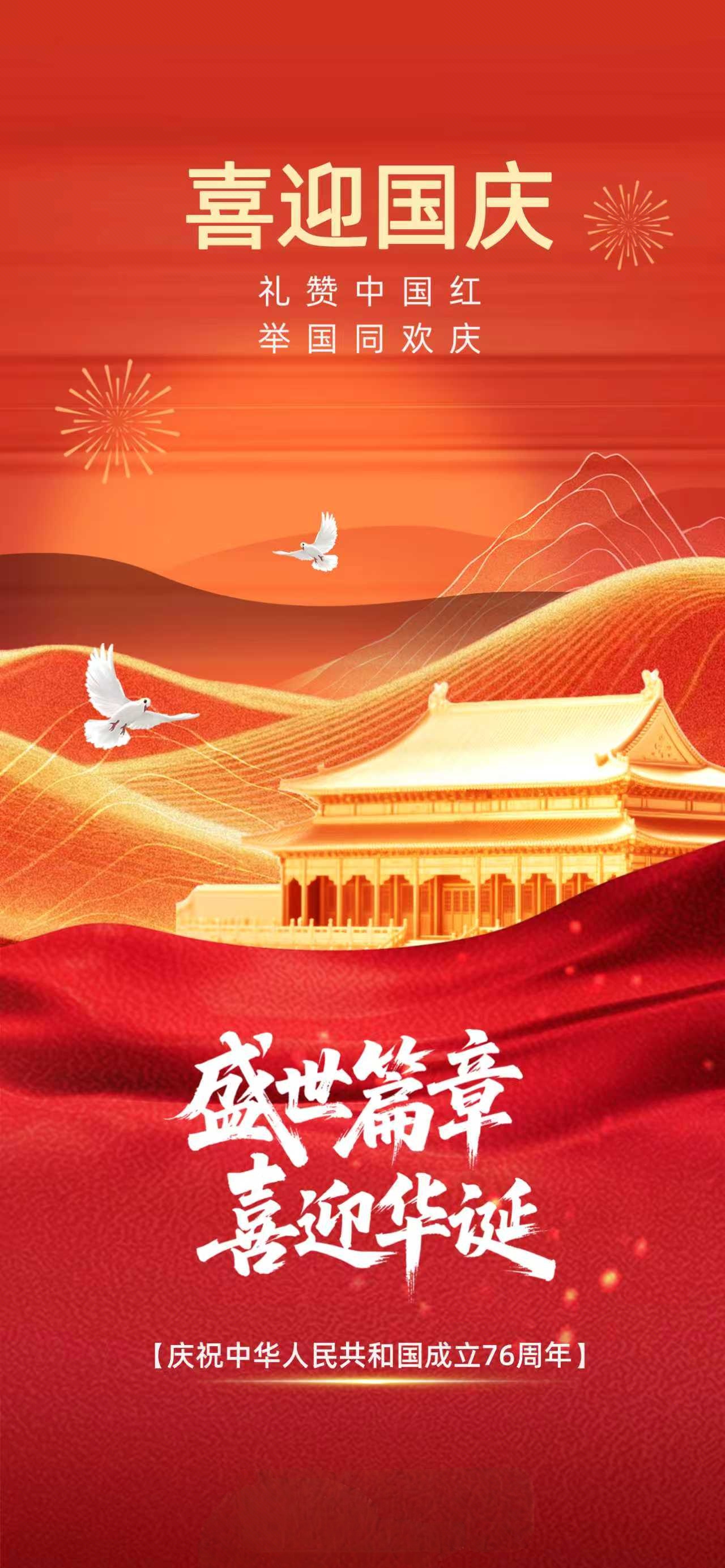 喜迎华诞,礼赞中国红。山河锦绣,共祝繁荣昌盛。