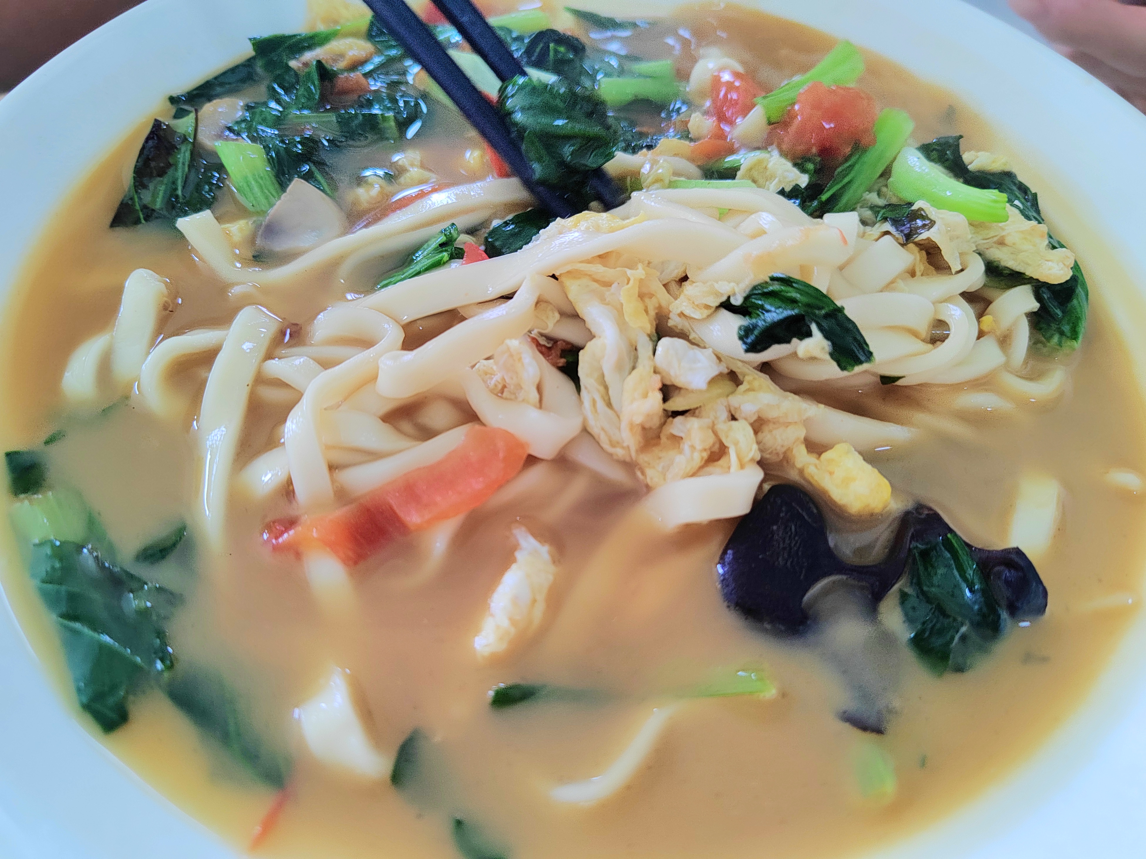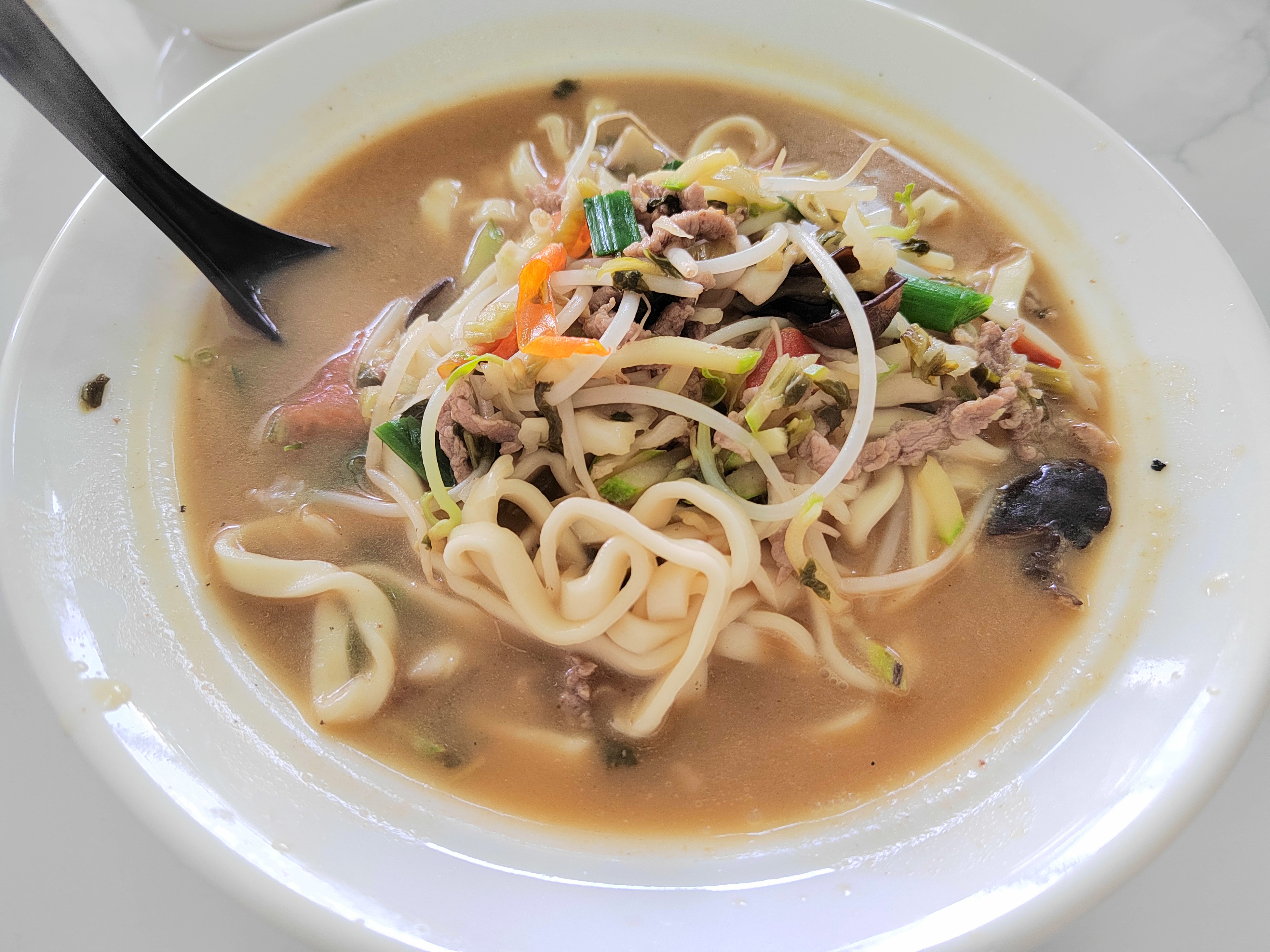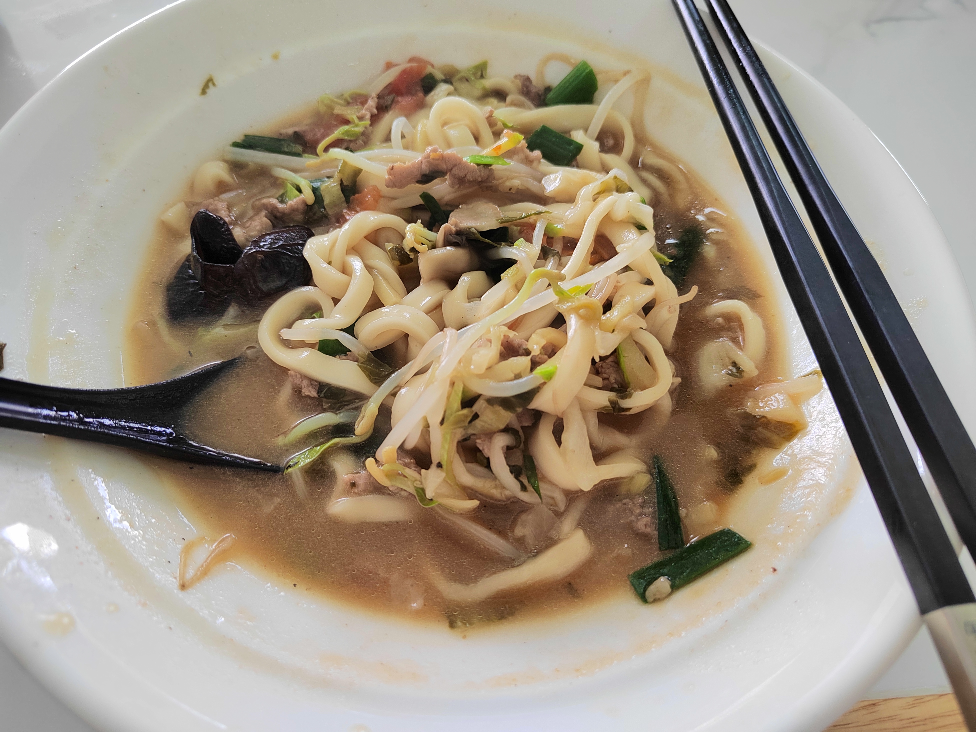 诸暨次坞打面,手擀面搭配清爽可口的肉丝、香菇、木耳、豆芽、胡萝卜丝、青菜等家常炒菜,浇上浓郁的高汤肉汁,嘬面的快乐不言而喻!