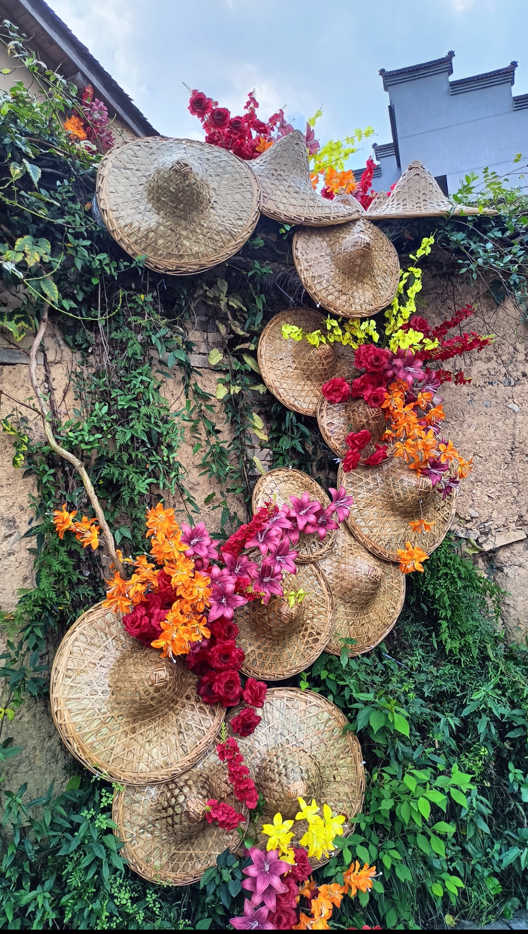 院墙上竹编的圆形斗笠,在仿真花和鲜活藤蔓的映衬下,农家趣味十足。