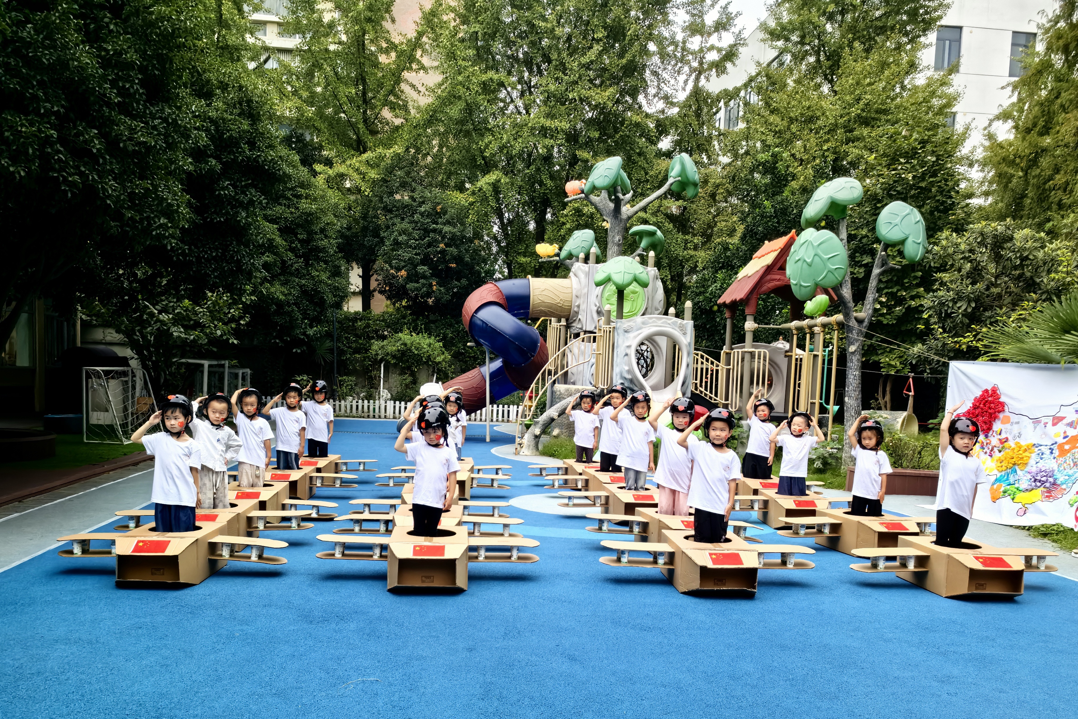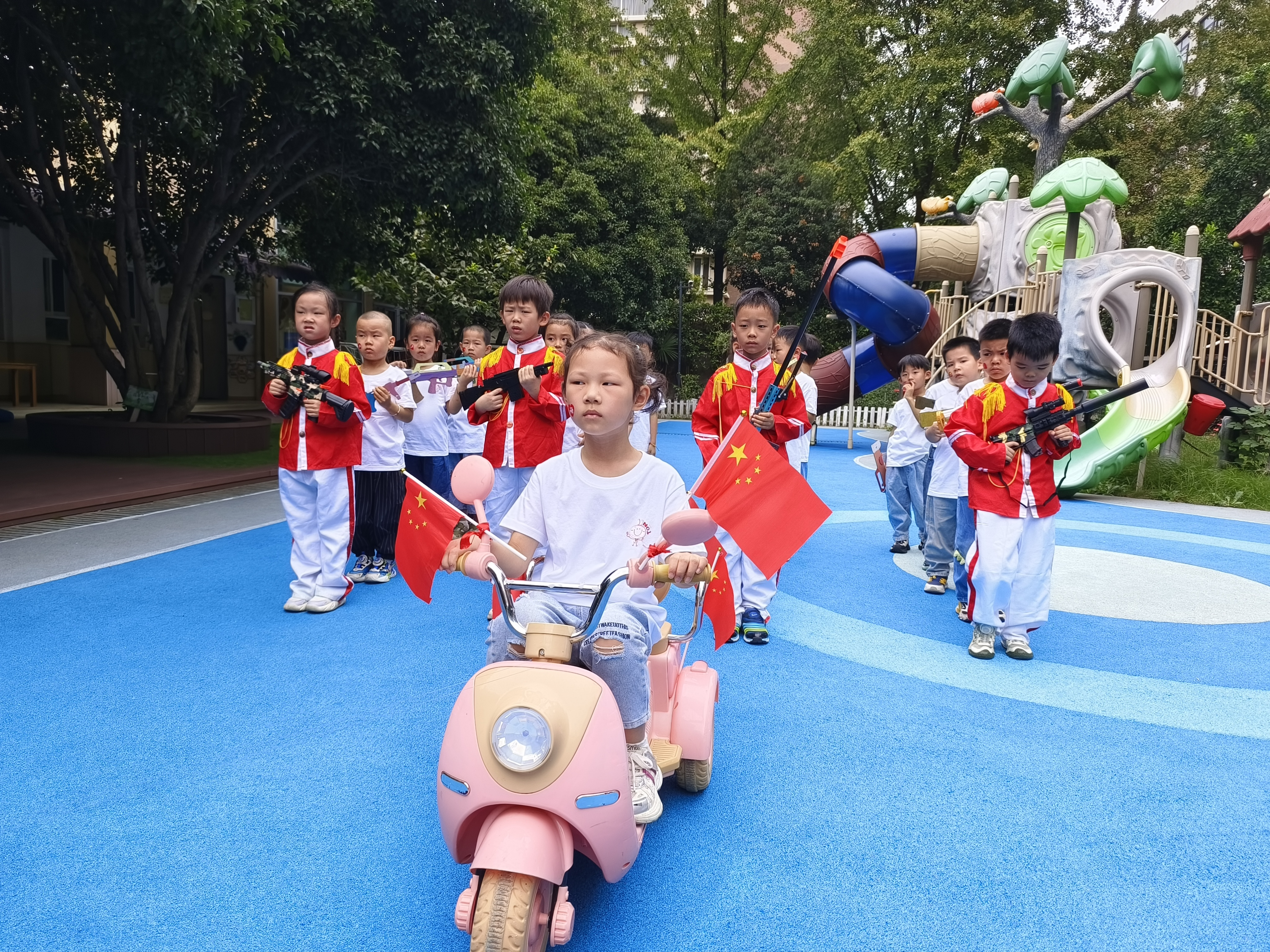 童心向祖国 ·星火永相传 ——杭州市贾家弄幼儿园迎国庆系列活动 为庆祝中华人民共和国成立76周年,弘扬爱国主义精神,杭州市贾家弄幼儿园近日围绕“童心向祖国,重走长征路”主题,组织开展了形式多样的迎国庆系列活动,让孩子们在沉浸式体验中萌发爱国情感。 童趣阅兵扬志气,科技筑梦向未来 9月29日,幼儿园操场上红旗招展,国旗下讲话拉开了活动序幕。孩子们组成“护旗仪仗队”,齐唱国歌,爱国情怀悄然生根。随后,幼儿们化身“仪仗队”“空军”“火箭军”“海军”等方阵,大班孩子手持自制科技武器,中小班幼儿神气亮相,接受退伍老兵检阅。活动在《歌唱祖国》的歌声中达到高潮,孩子们挥舞国旗,齐声祝福祖国生日快乐。 老兵故事润童心,童真敬意献真情 抗战老兵金爷爷走进幼儿园,以生动语言讲述抗战故事,孩子们深受触动,连连称赞“爷爷好勇敢”。了解到金爷爷曾在东极岛艰苦训练,孩子们亲手采摘并装饰自己种植的茄子、秋葵等蔬菜,表达对英雄的敬意与感谢。 重走长征炼意志,游戏体验悟精神 幼儿园结合运动特色,以长征历史事件为背景,设计了系列挑战游戏。大班幼儿体验“运送军粮”“飞夺泸定桥”,中班参与“翻越大雪山”“四渡赤水”,小托班则在“地道战”中钻爬前行。孩子们在奔跑、协作中锻炼体魄,初步感知长征精神,体会革命先辈的勇敢与坚韧。 亲子同庆暖家园,共筑爱国童心梦 幼儿园发挥示范辐射作用,开展社区亲子活动。1岁半至2岁半的幼儿在家长陪伴下,撕贴红色纸条装饰“生日蛋糕”,共唱《生日快乐》歌,在温馨氛围中感受祖国生日的喜悦。 此次国庆系列活动以幼儿为本,将爱国教育融入阅兵、故事、运动、亲子等多种形式,让孩子们在体验中认识祖国、热爱祖国。杭州市贾家弄幼儿园将持续探索生动德育路径,让爱国种子在童心深处生根发芽,让红色星火代代相传。