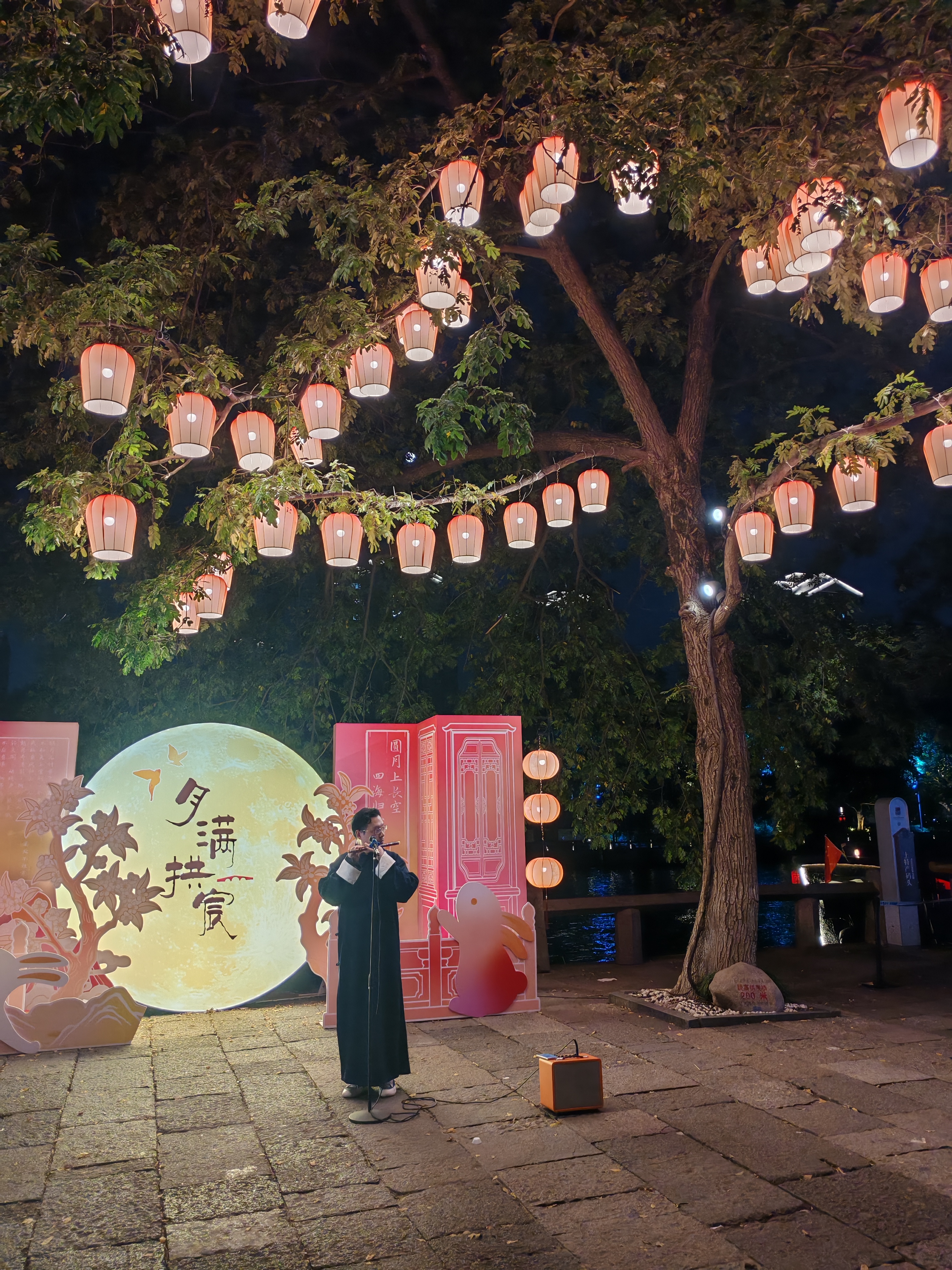 月满拱宸夜,灯笼映石桥。笛声穿柳岸,一河星月醉今宵。