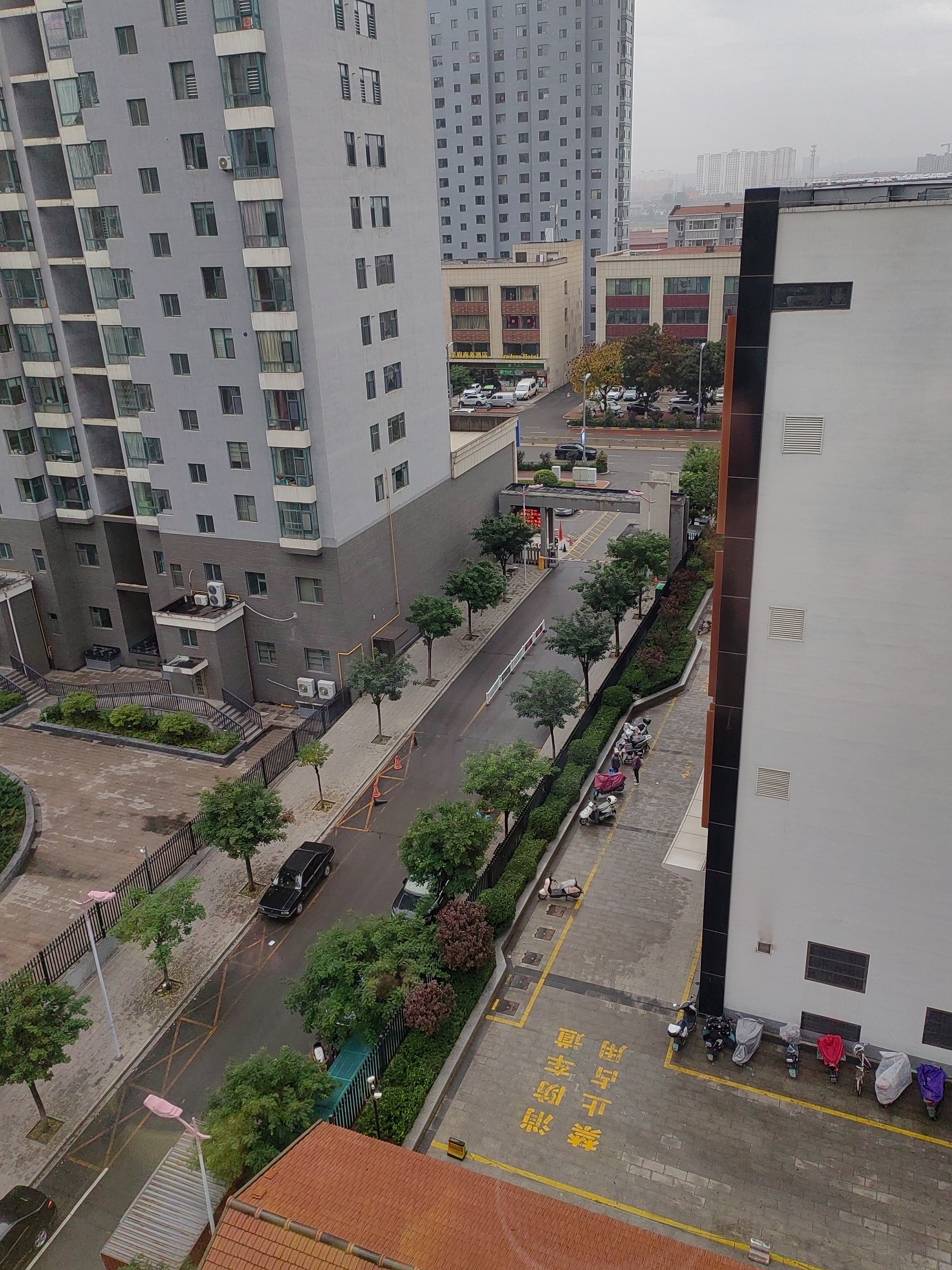 雨天的小区,灰色楼群配红屋顶,黄色标线亮得晃眼,电动车在树下躲雨,生活感拉满。