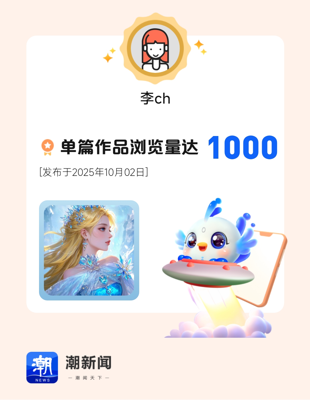 我在潮新闻发表的单篇作品浏览量达到1000!