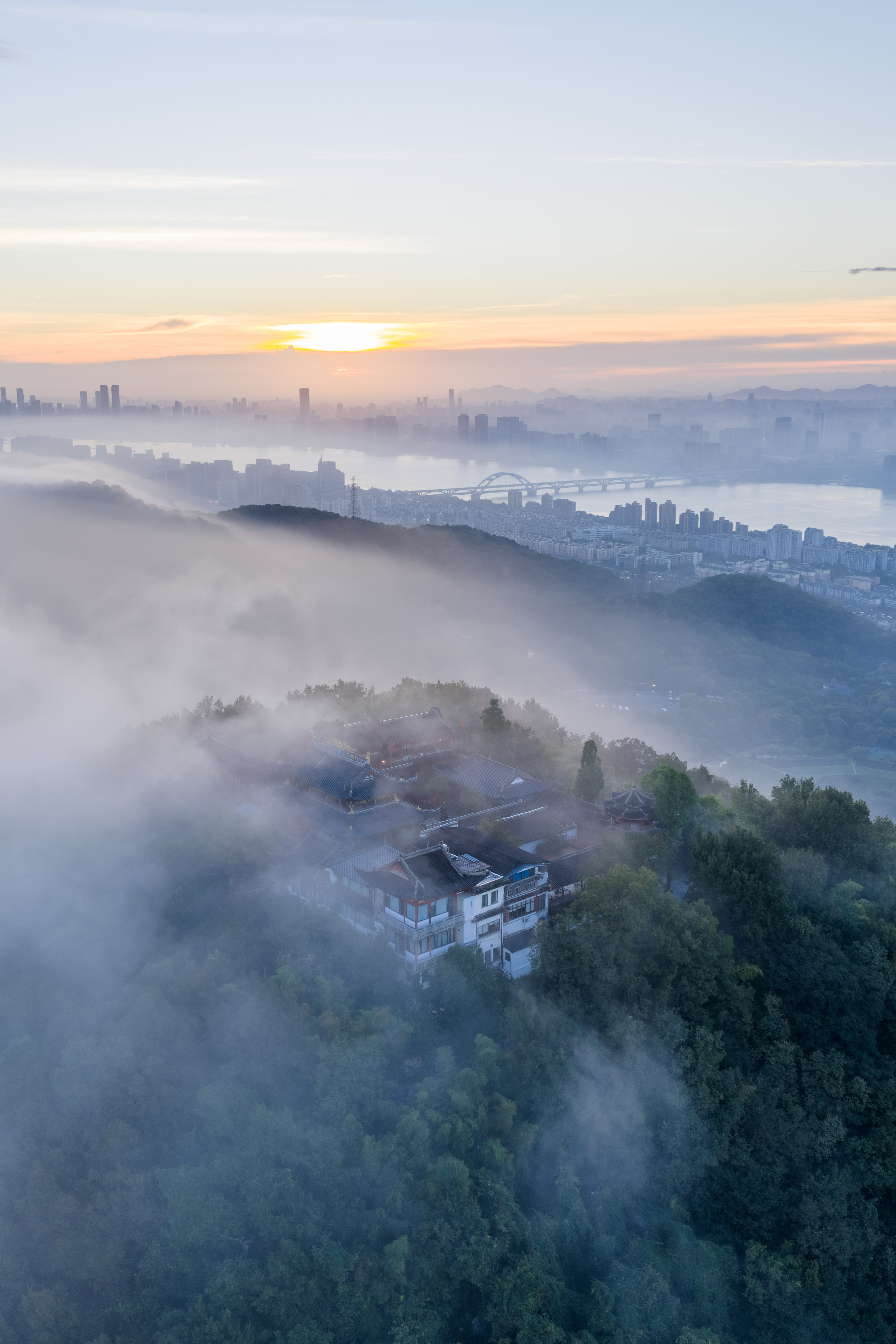 作者名称:汪一良,作品描述:杭州南高峰下,玉皇山一带云雾如飞絮翻涌,缠绕山林古建,远方城市与江桥在晨曦中若隐若现,“玉皇飞云” 之景灵动缥缈。