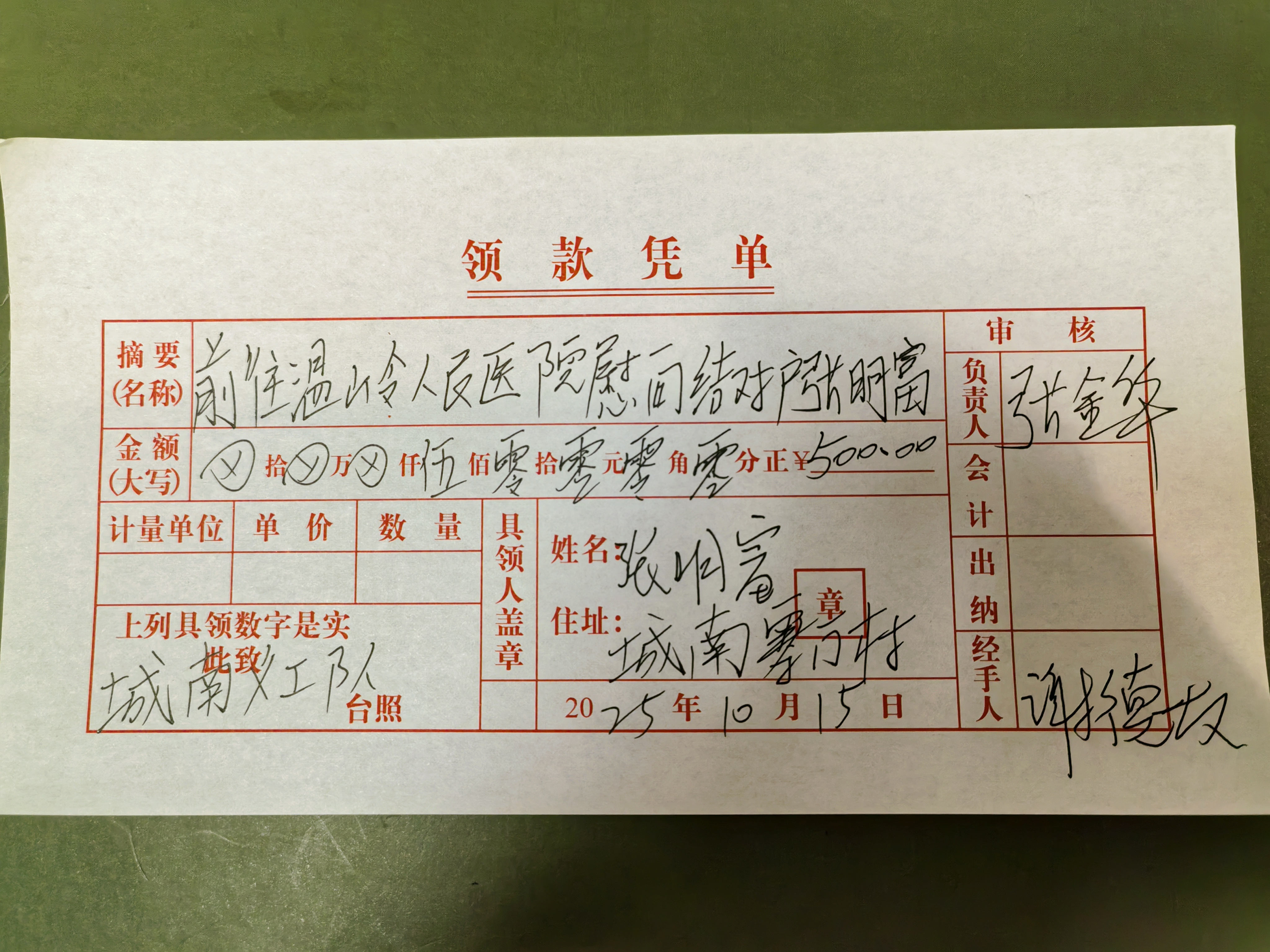10.15晚上,走进温岭市第一人民医院住院部,探望慰问城南镇寨门结对户张明富,送去慰问金500元,以及助行器一台。爱心清单:慰问金从学生马诗贻捐款的500元中支出,城南义工队爱心基金目前一共还结存2480.00元整。