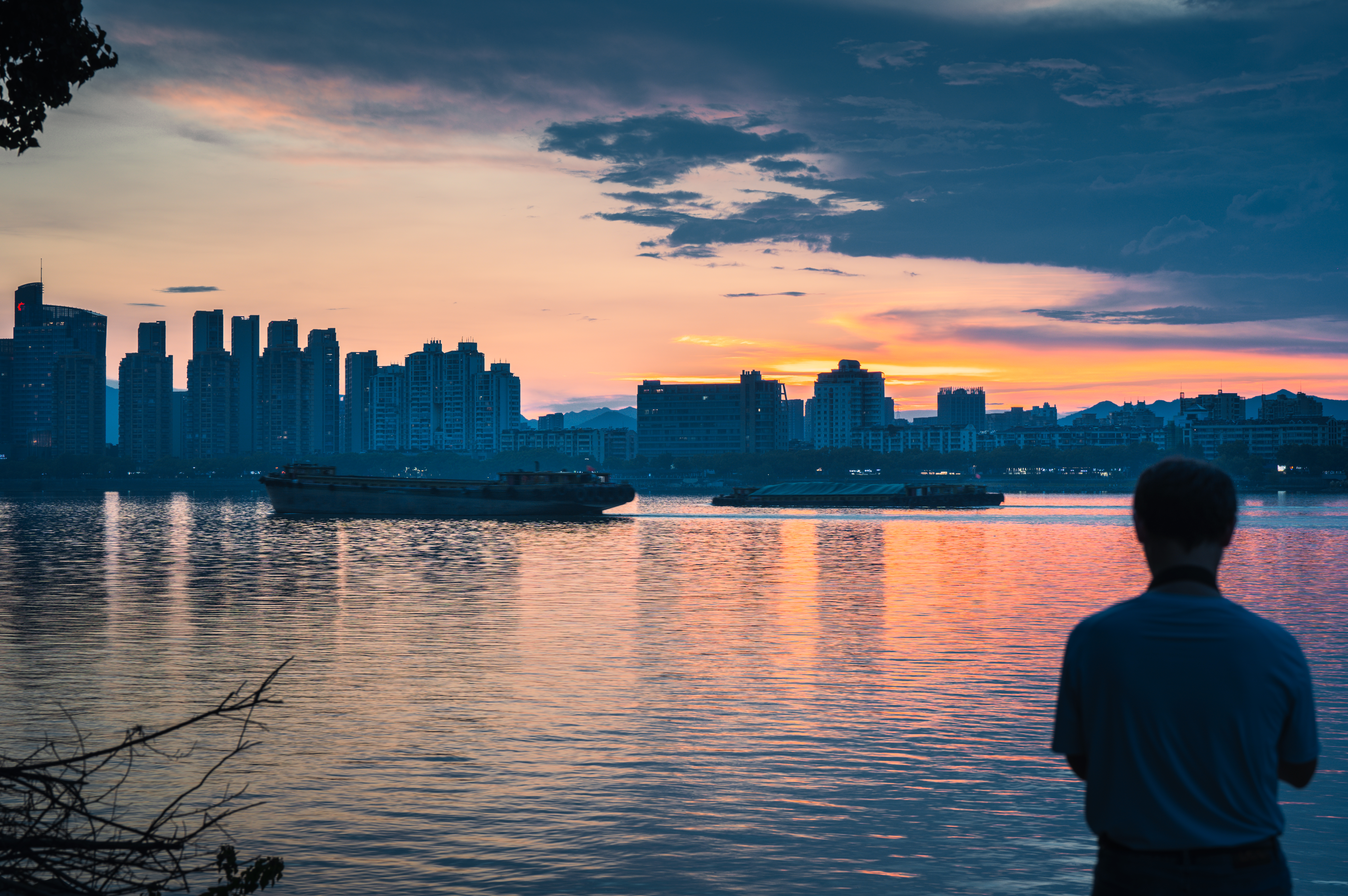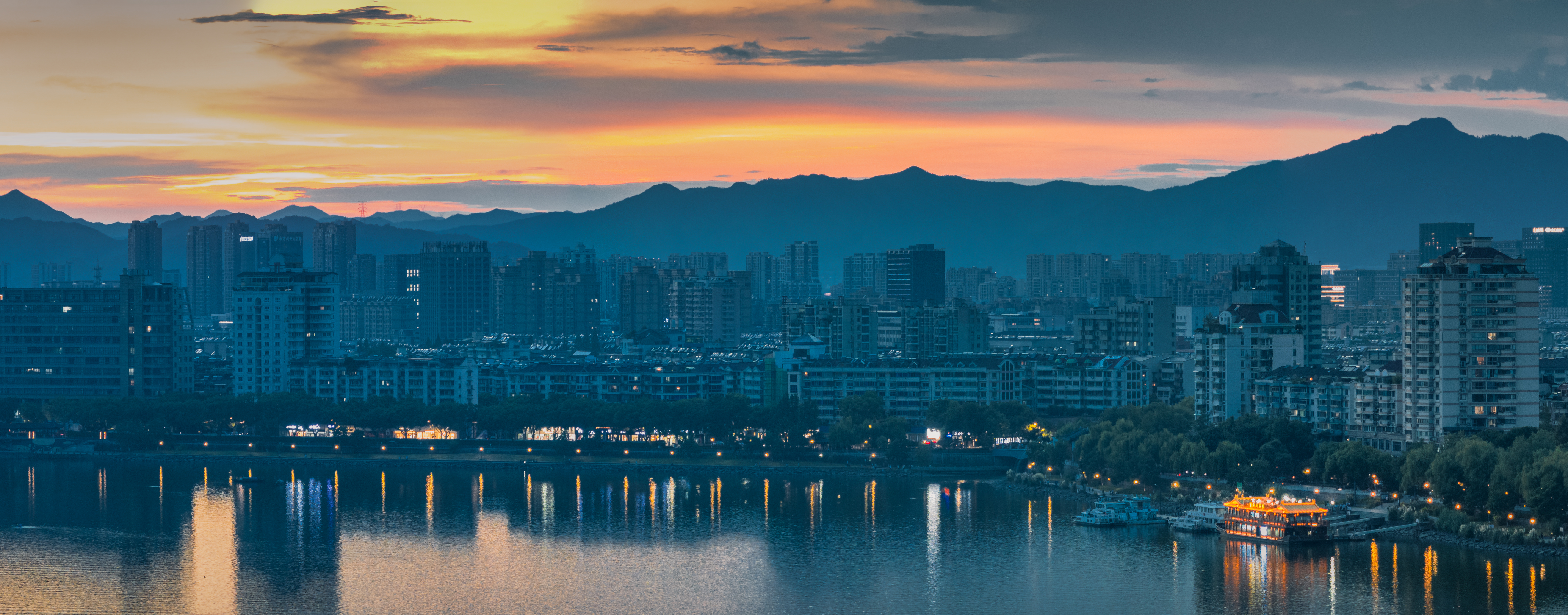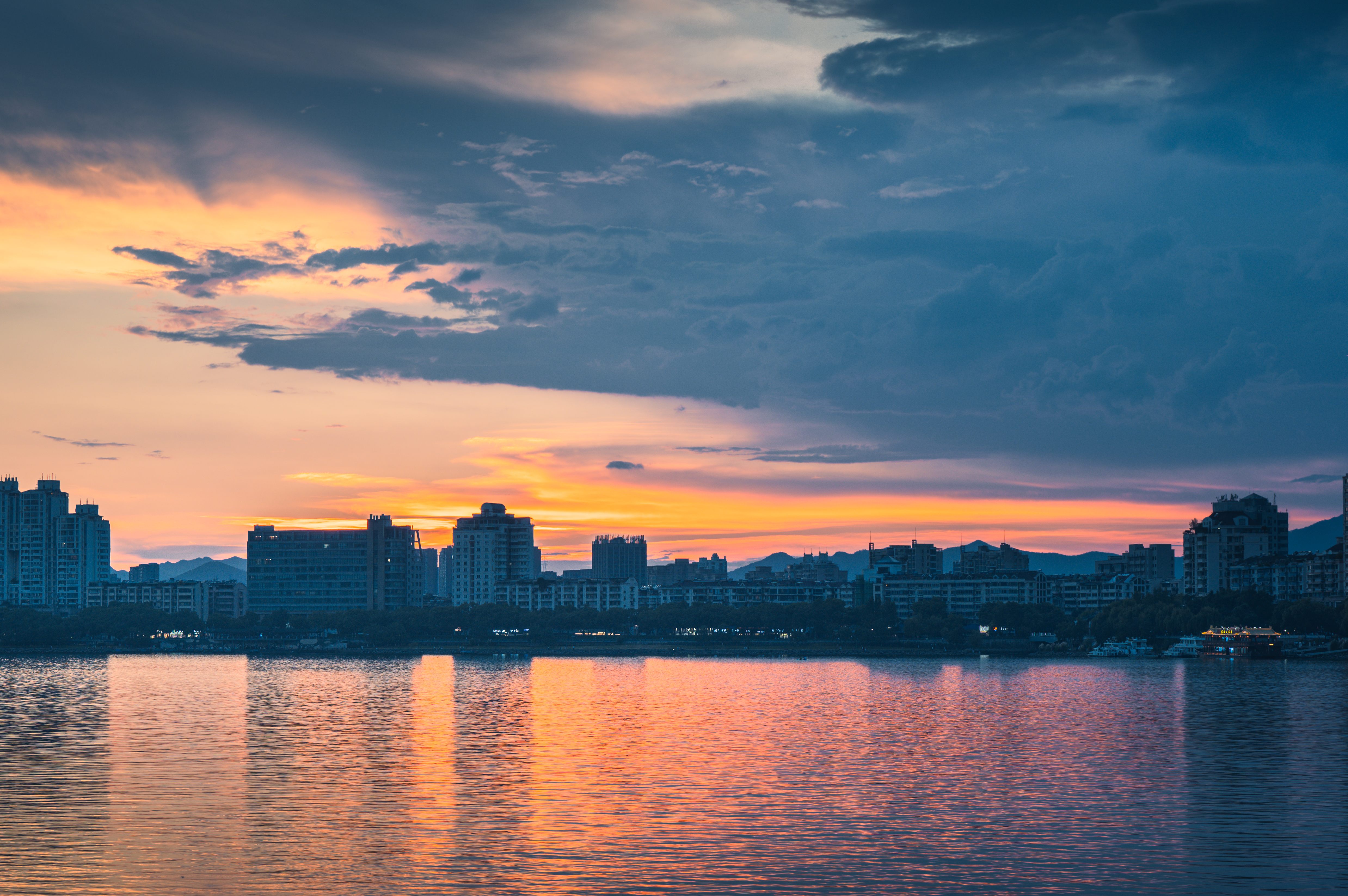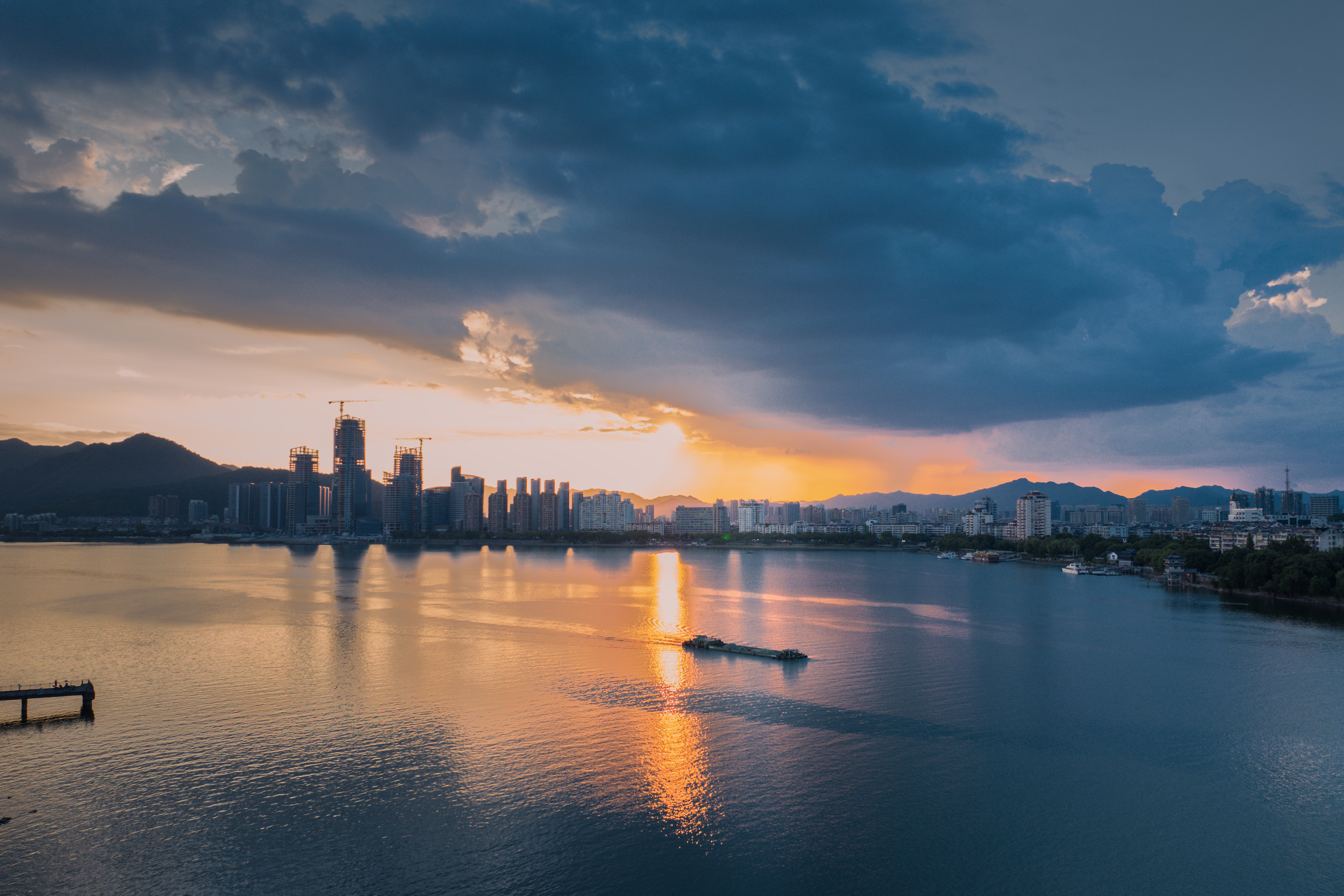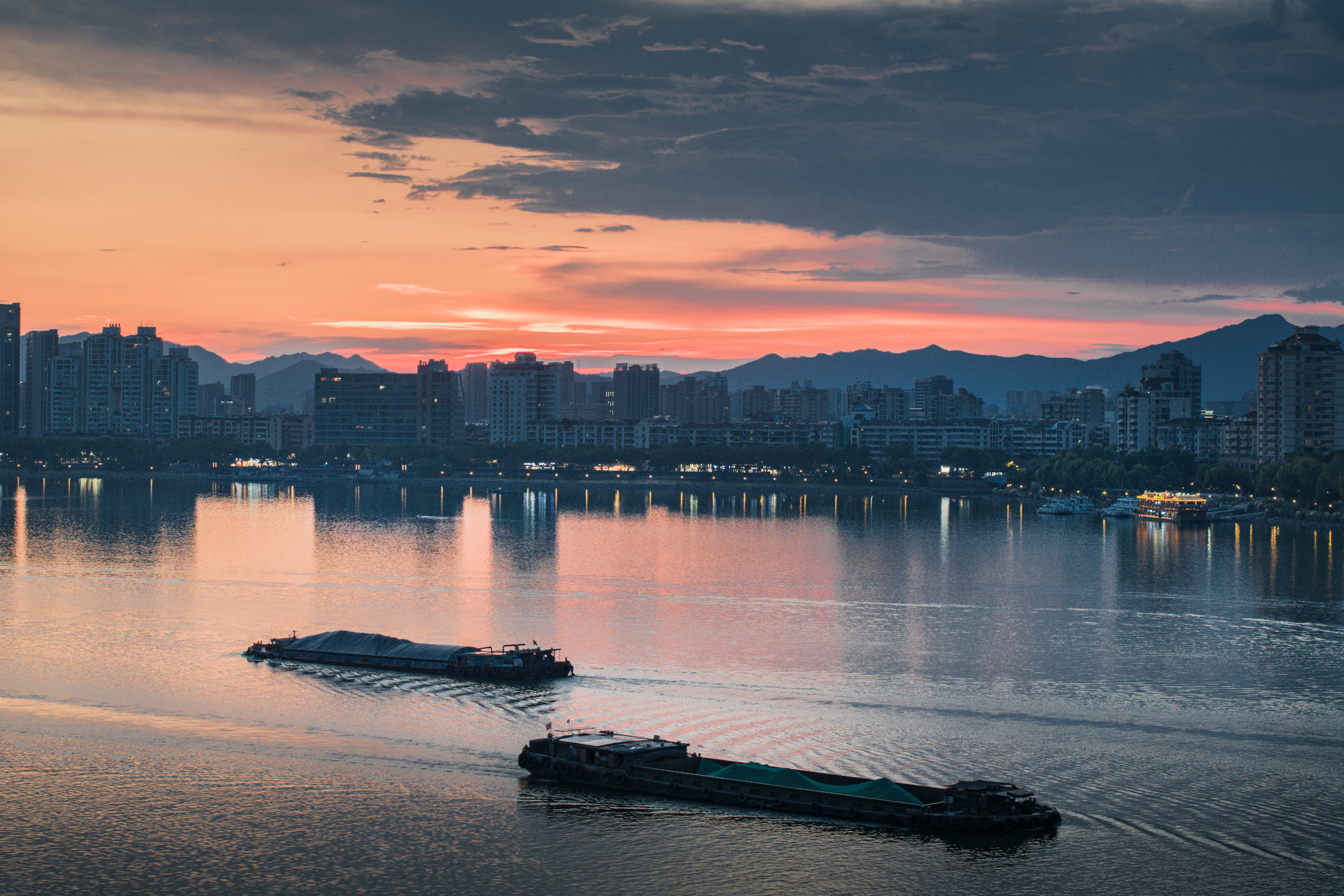 富春山水·富春江(富阳段) 真正入秋前最后的富春江黄昏,太治愈了!晚霞像被揉碎的橙红霞光,铺满天际又映亮江面,船只拖着浅浅水痕似在挽留最后一抹暮色。城里灯火次第亮起时,正好与江天的晚霞相映~