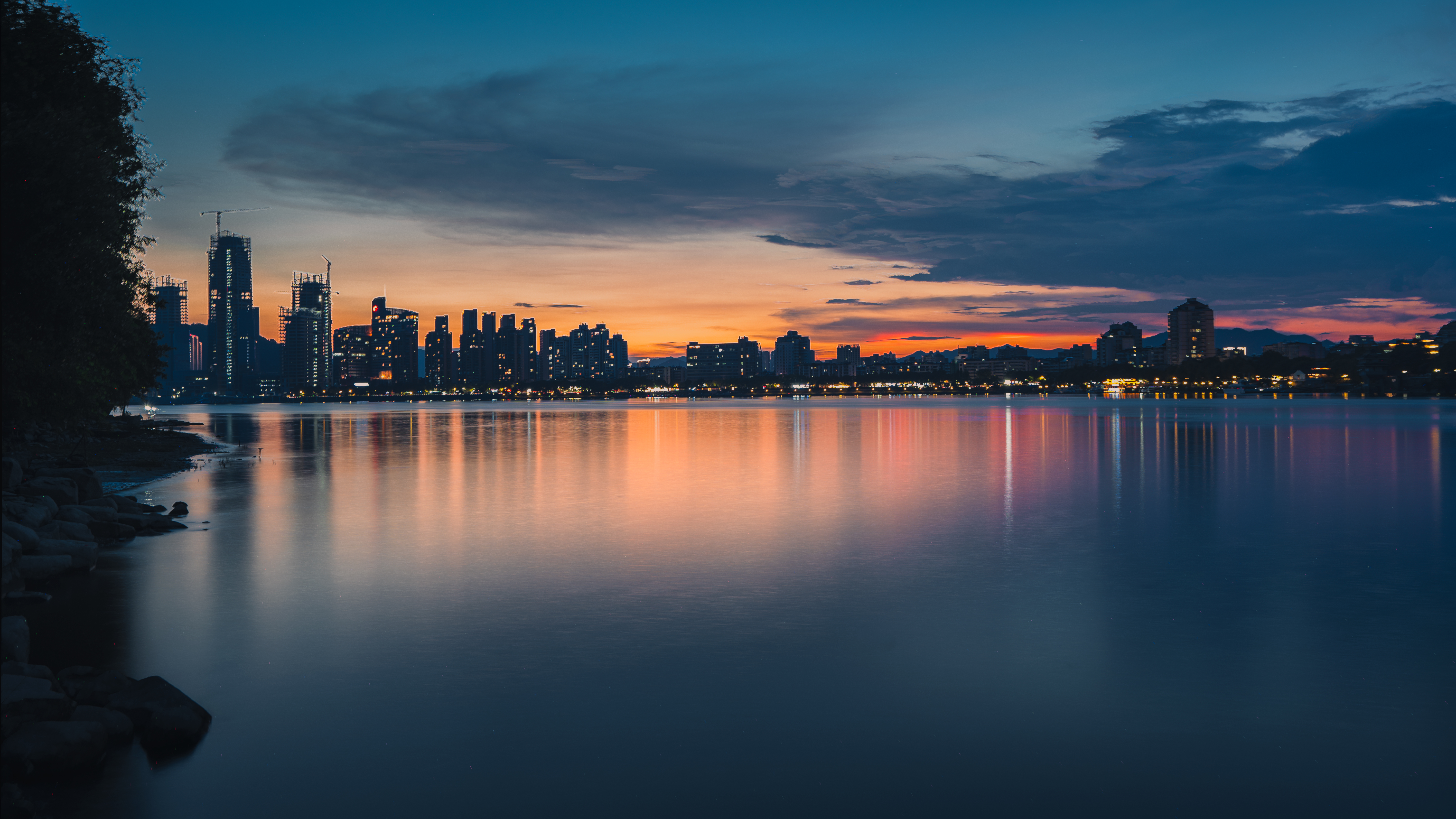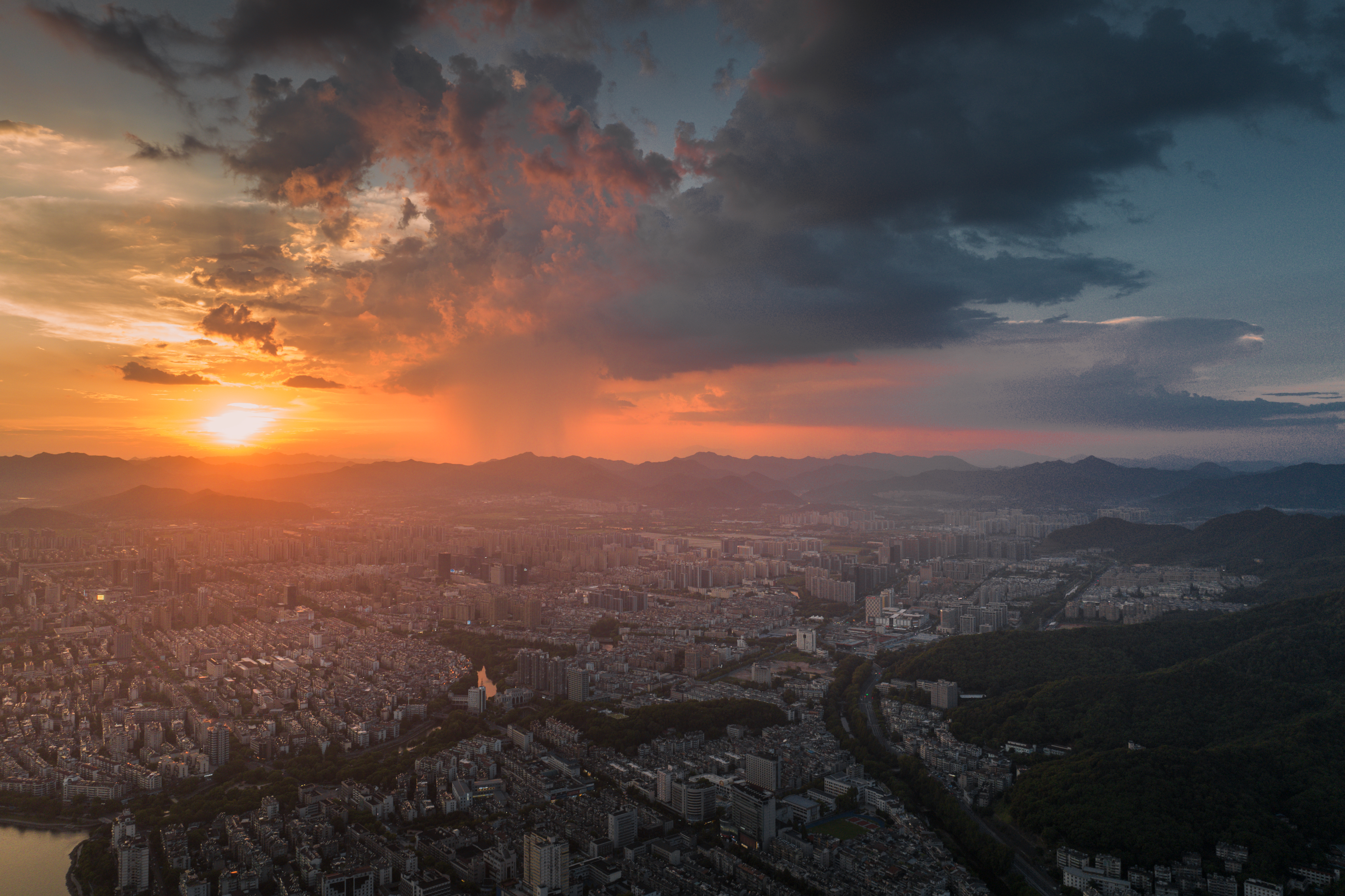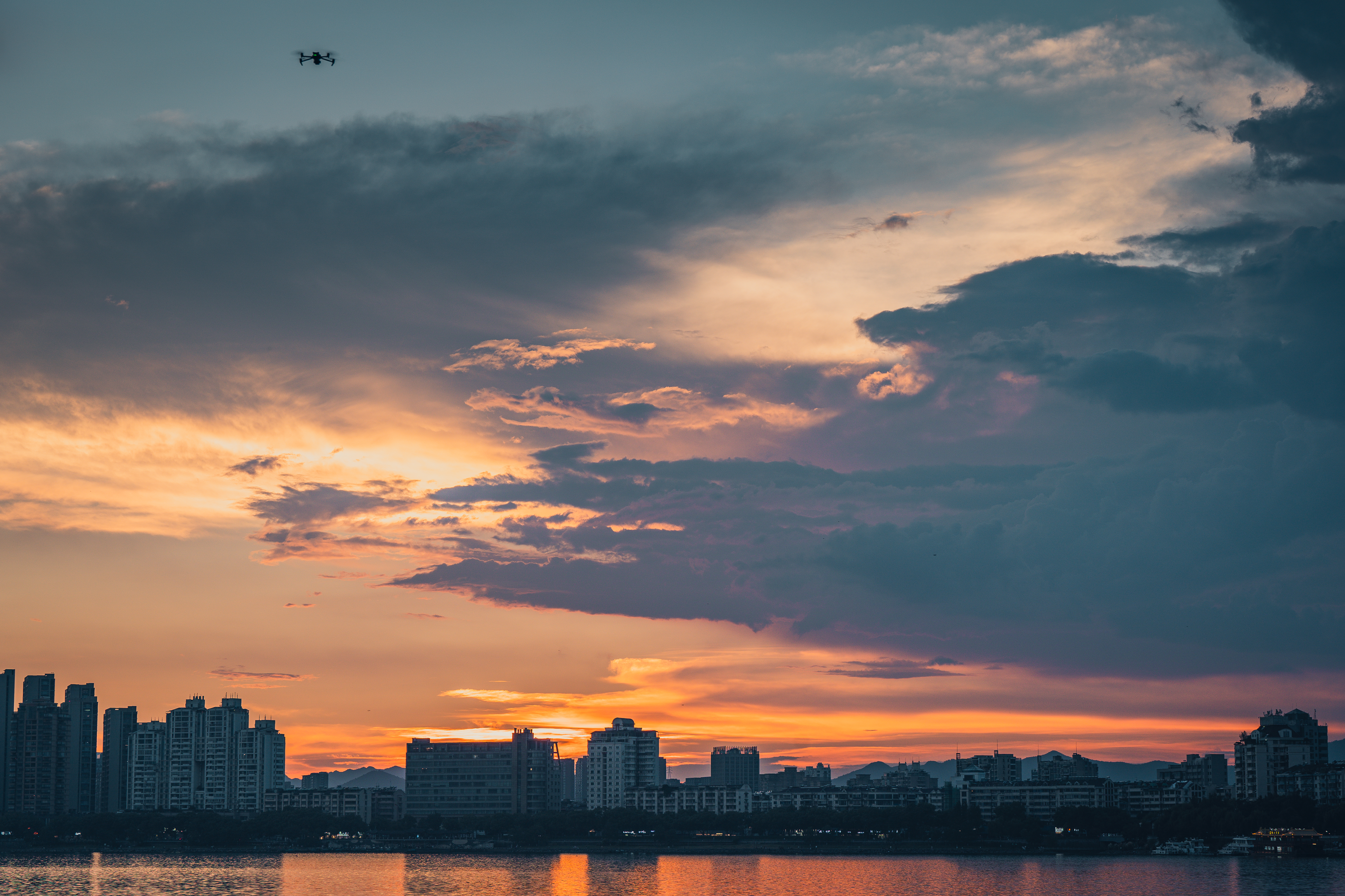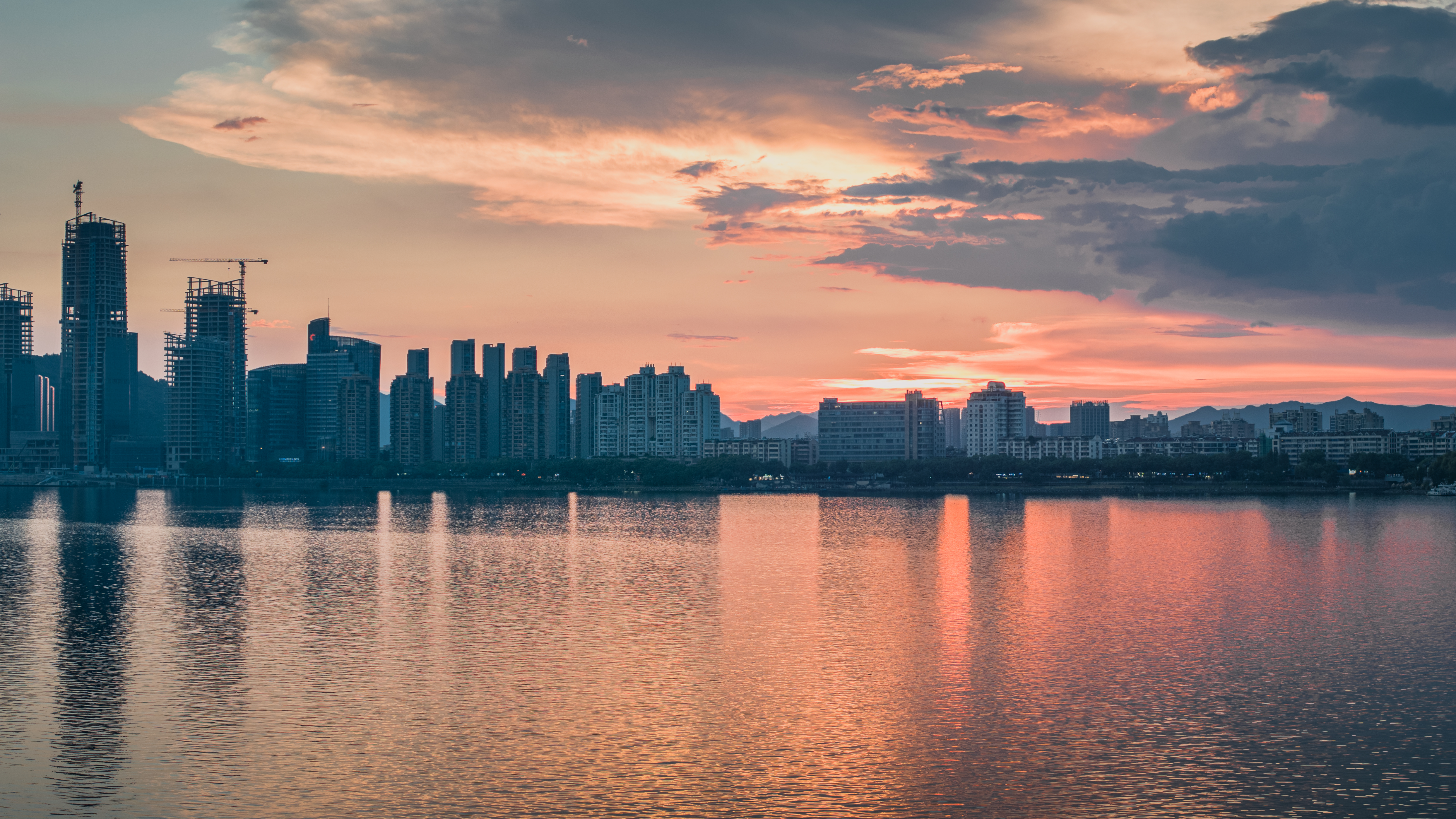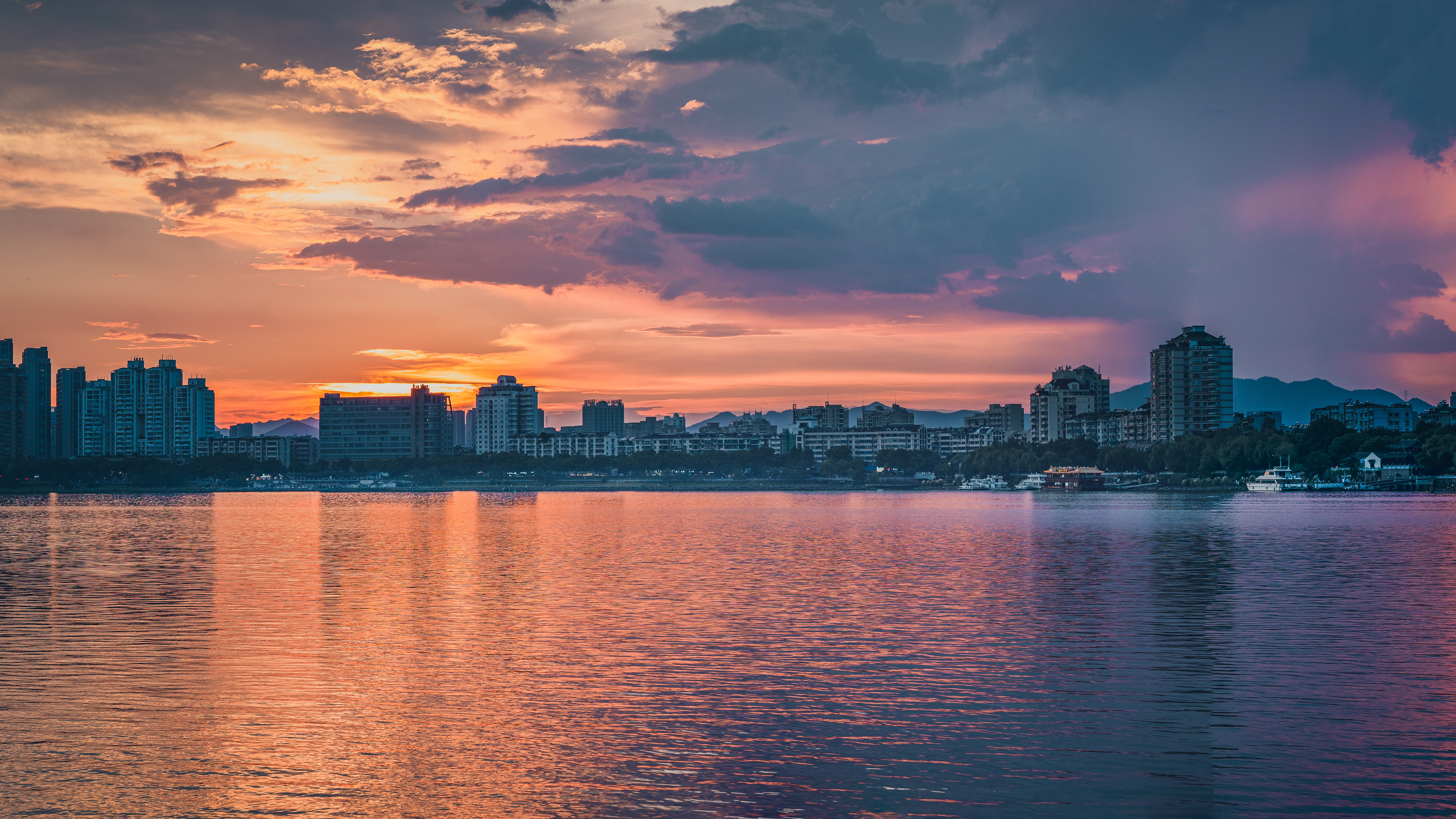 富春山水·富春江(富阳段) 真正入秋前最后的富春江黄昏,太治愈了!晚霞像被揉碎的橙红霞光,铺满天际又映亮江面,船只拖着浅浅水痕似在挽留最后一抹暮色。城里灯火次第亮起时,正好与江天的晚霞相映~