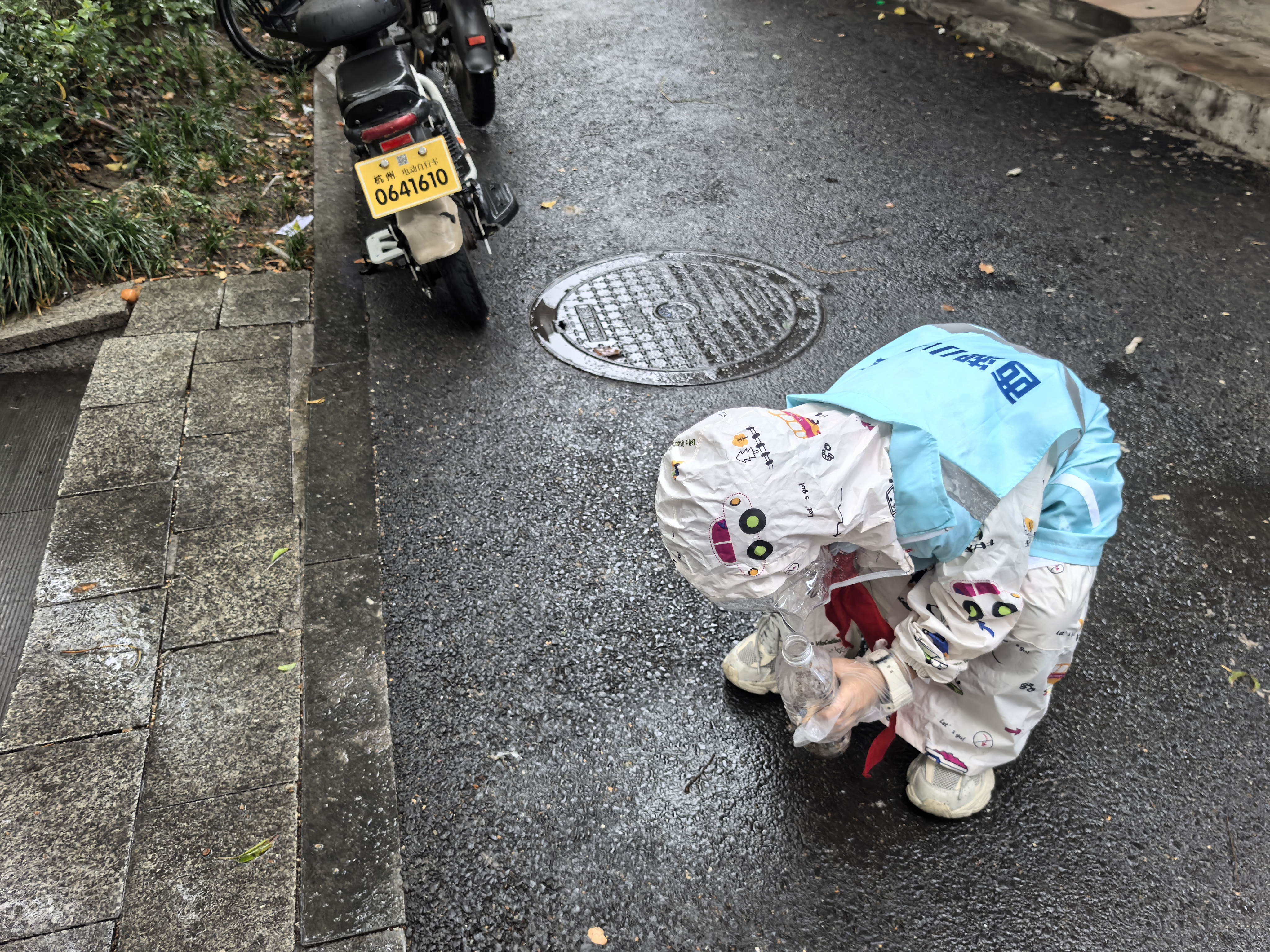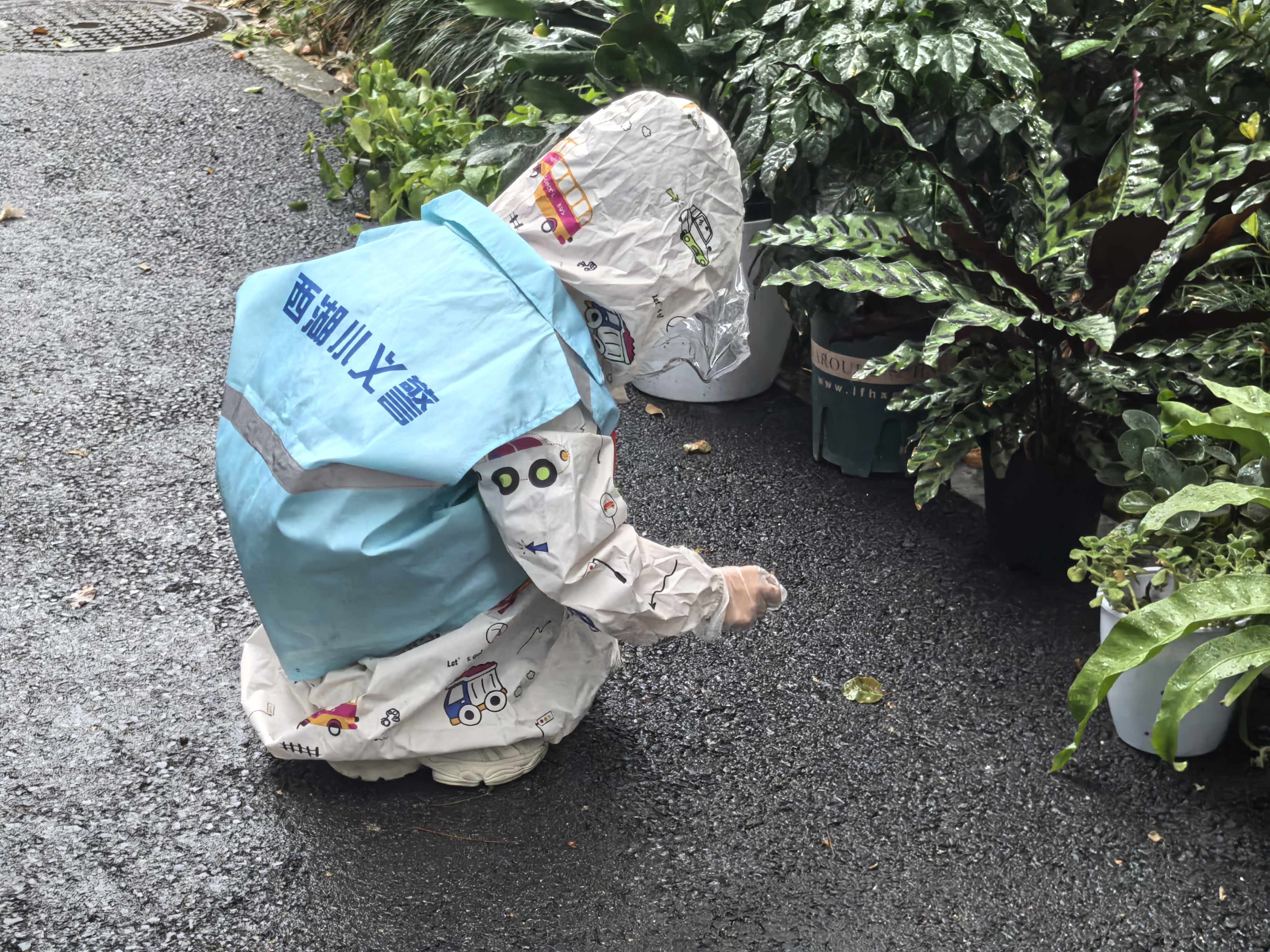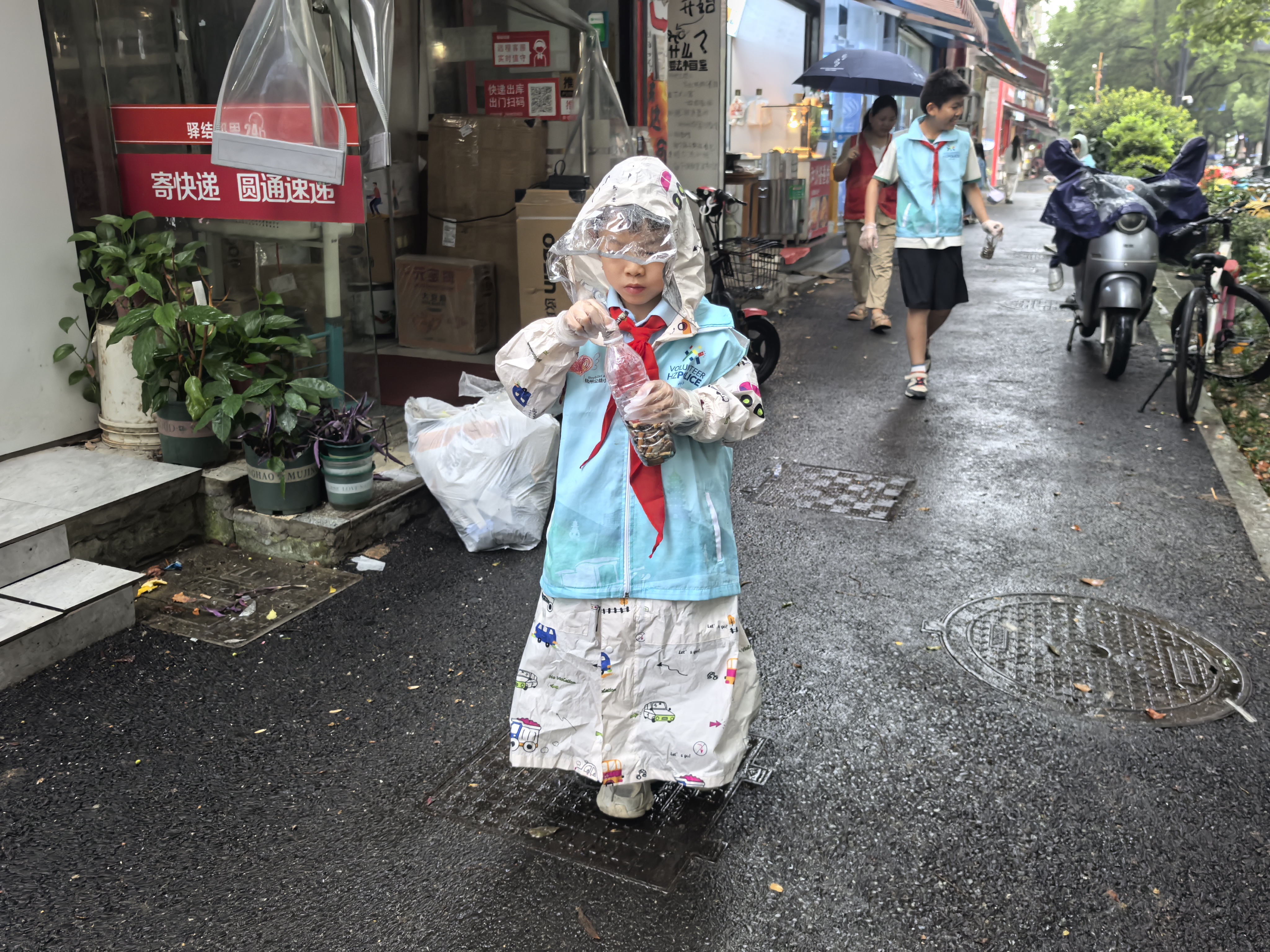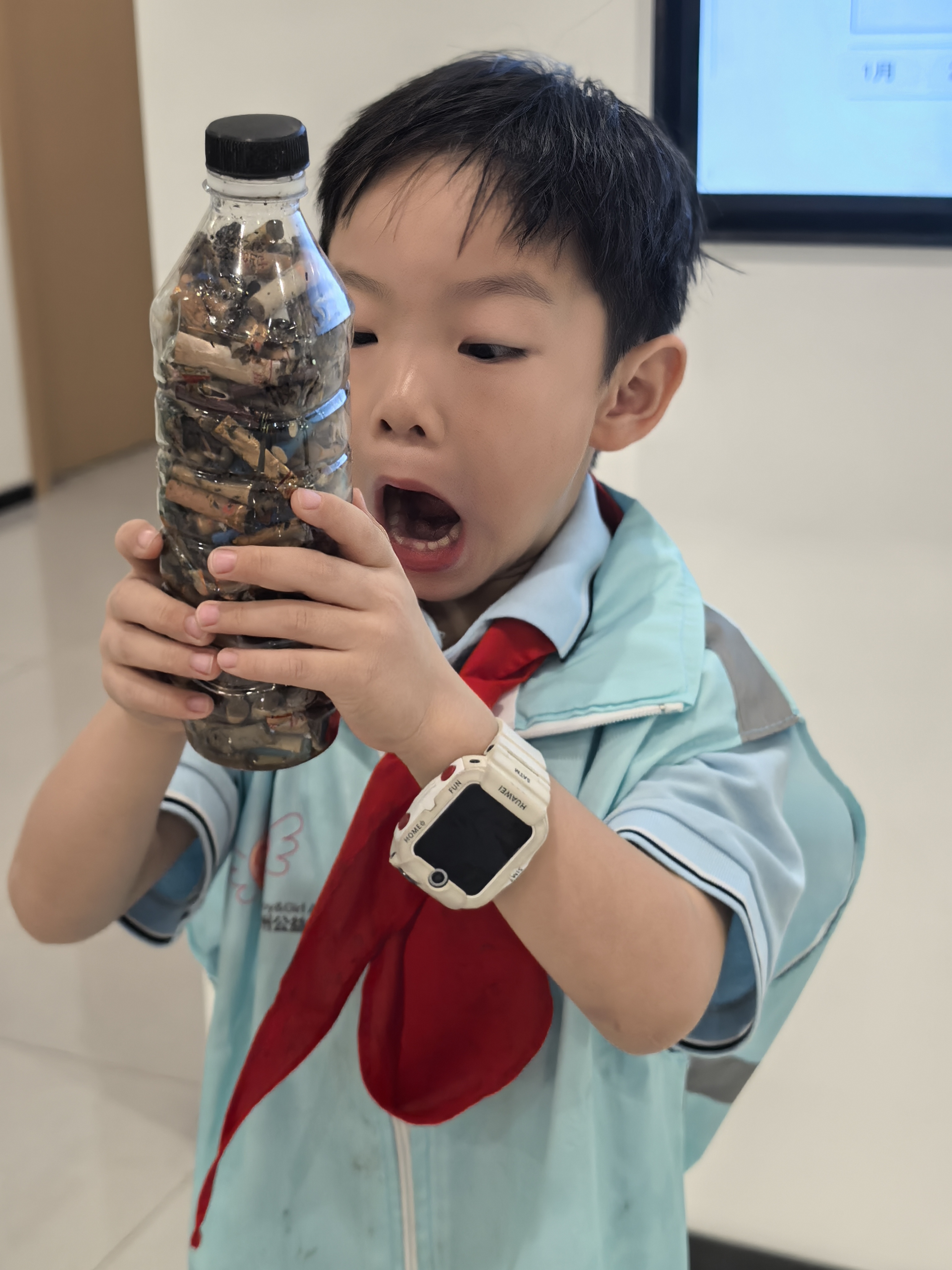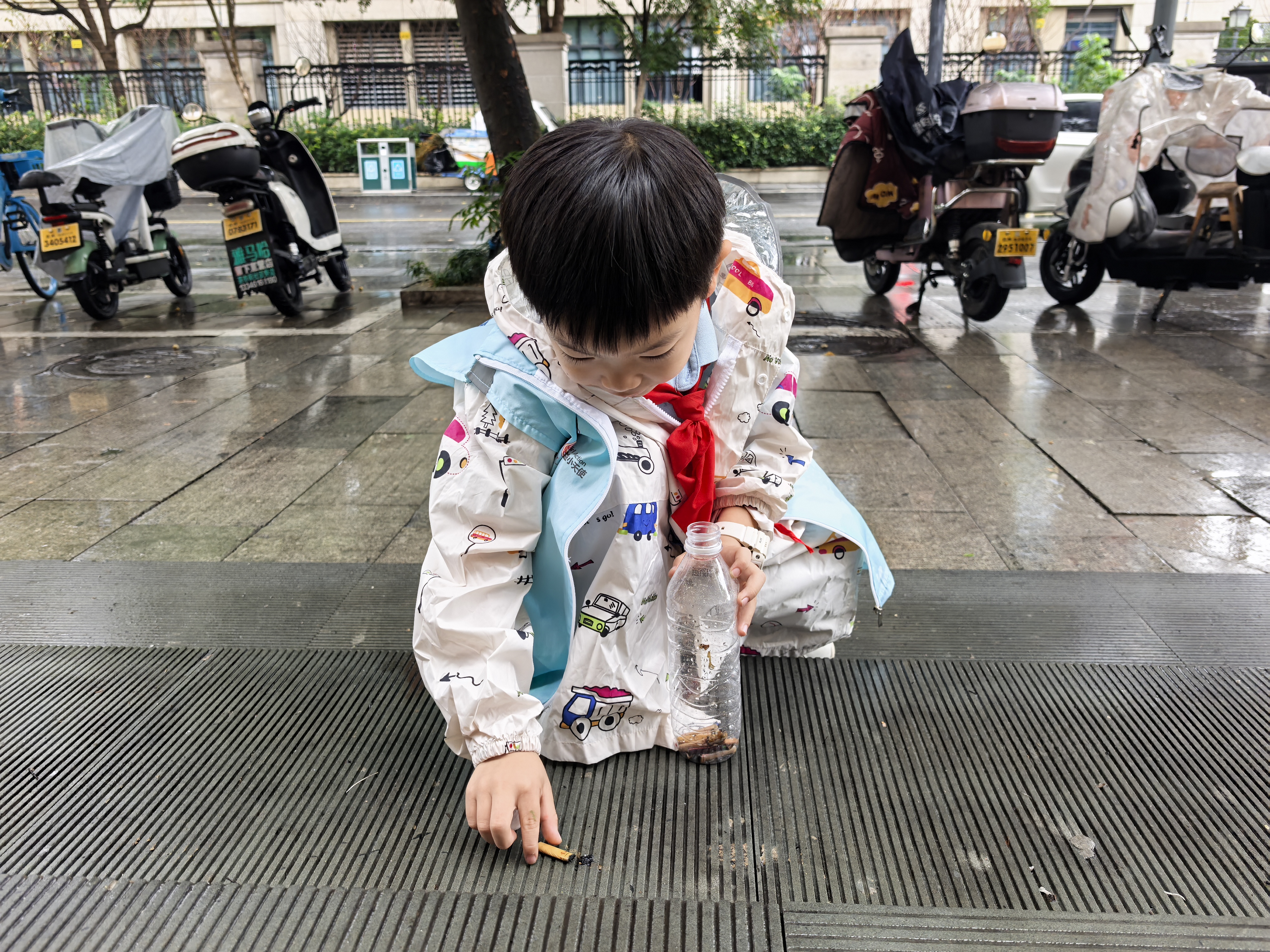 # “烟头不落地” 天阴沉沉的,蒙蒙细雨,秋风瑟瑟,可我一点都不想退缩,穿上雨衣,跟着小哥哥小姐姐们,走上街头,低头寻隐秘的烟头。 我拿着空瓶子捡烟头,没一会儿瓶子就装满了。看着满满一瓶烟头,我一点都不开心。这说明好多人会乱扔垃圾、破坏环境,也能看出吸烟的人真不少。真希望大家都能把烟头扔进垃圾桶,让我们的街道一直干干净净的,也希望爱护自己健康,远离烟草。 杭州公益小天使—陈儒晗