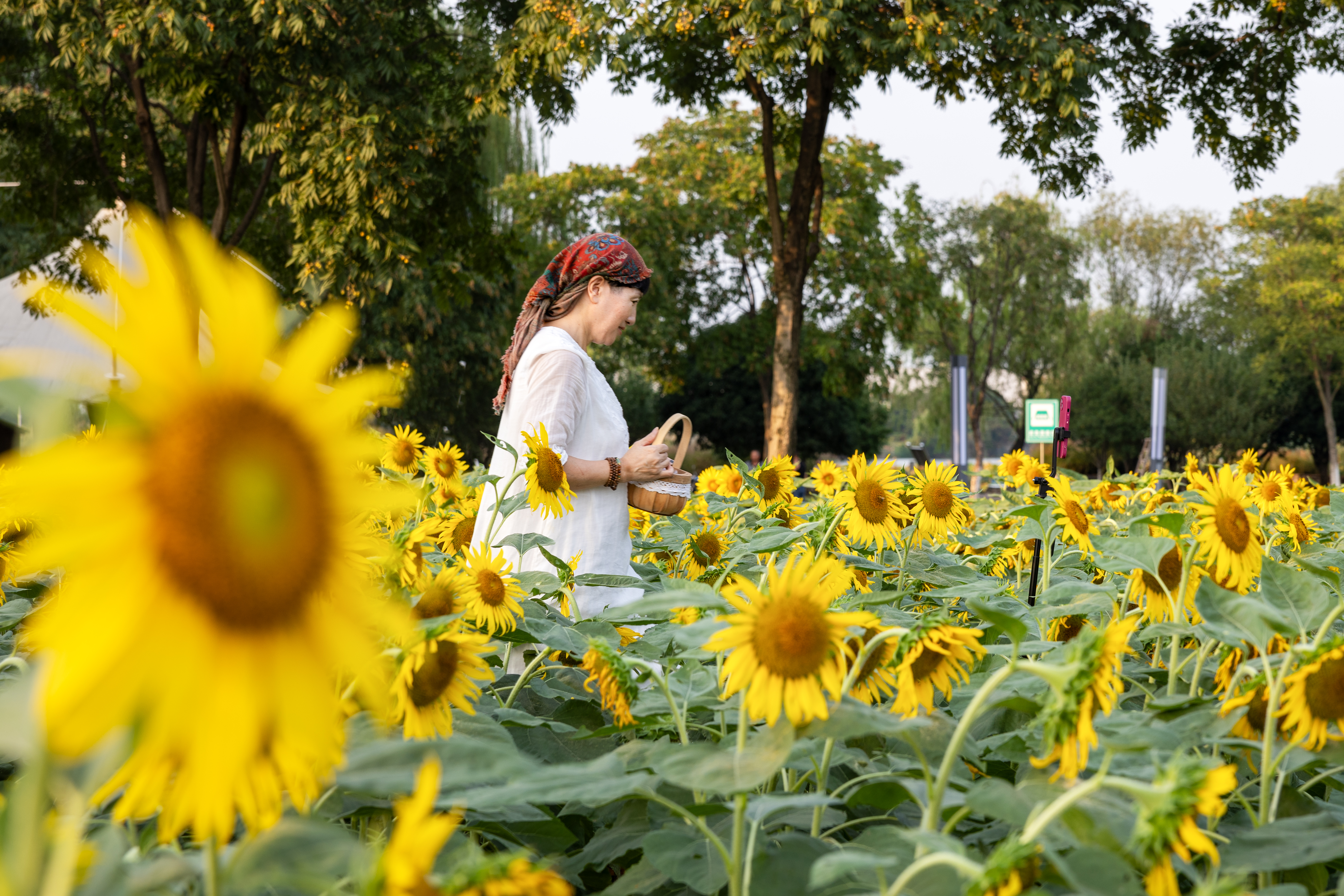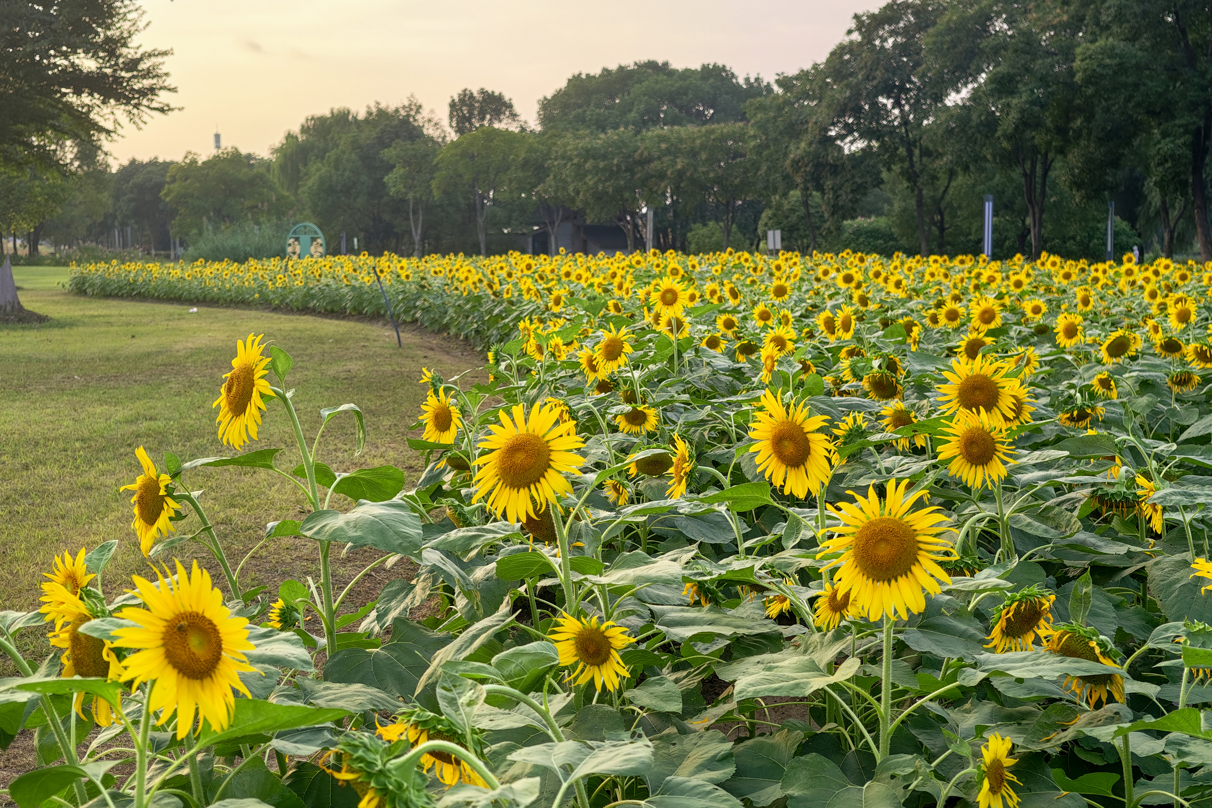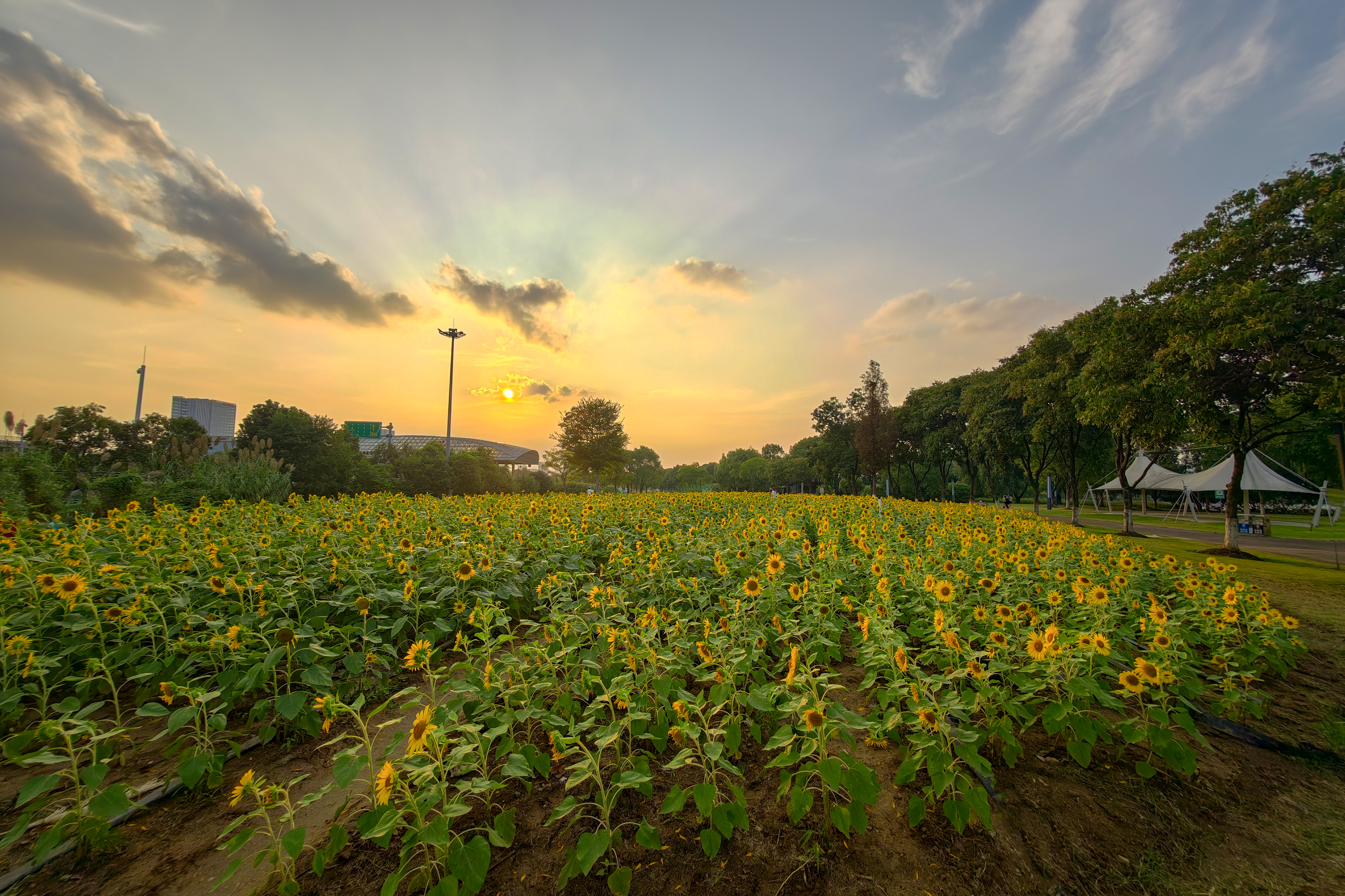 长兴三河湾看向日葵追太阳 向日葵开得正盛,花盘圆滚滚,风一吹,园盘晃悠悠,活像一个个装满阳光的圆瓷盘,外层那黄色的齿边儿齐刷刷。夕阳洒金光,向日葵治愈系!