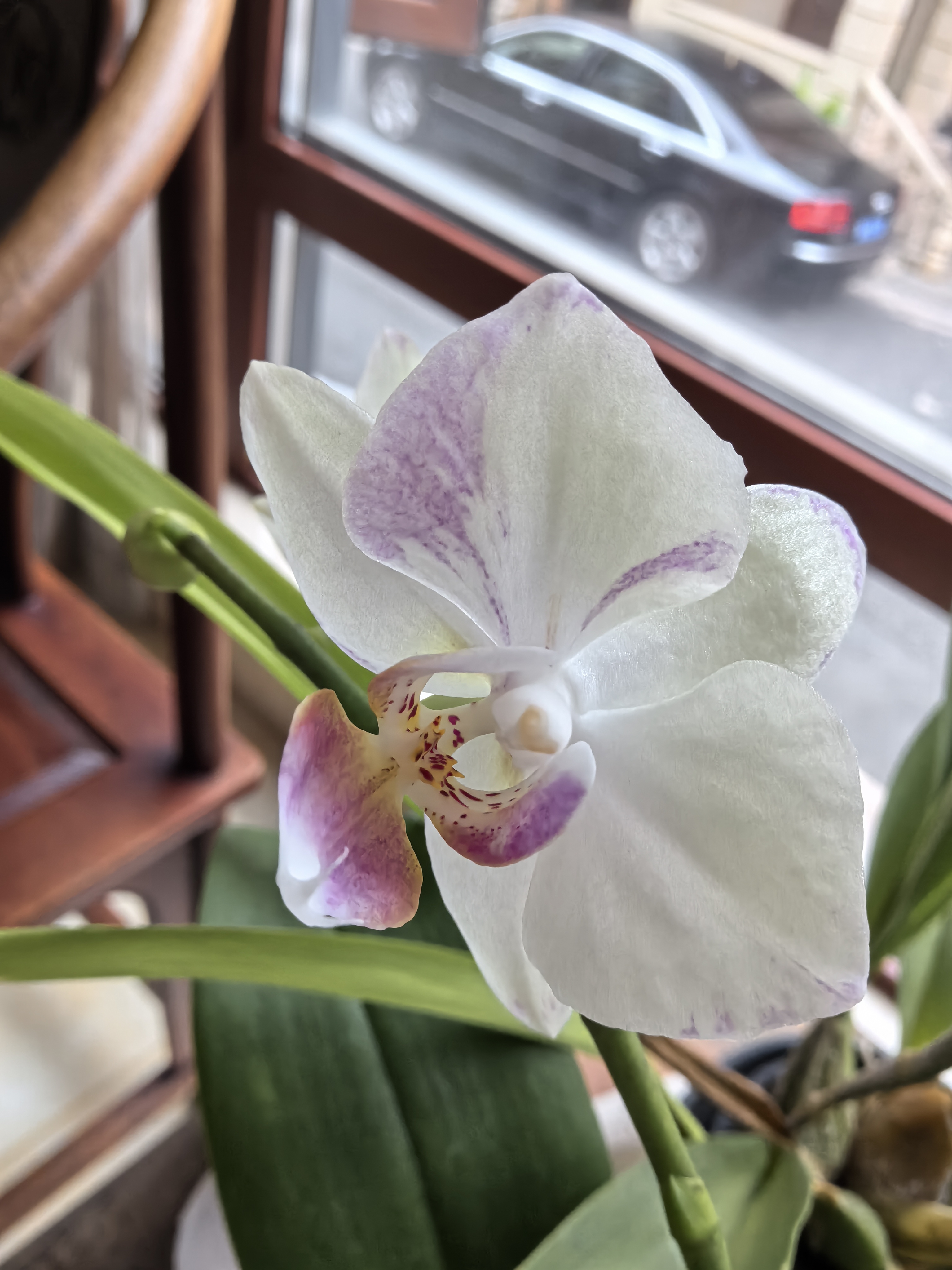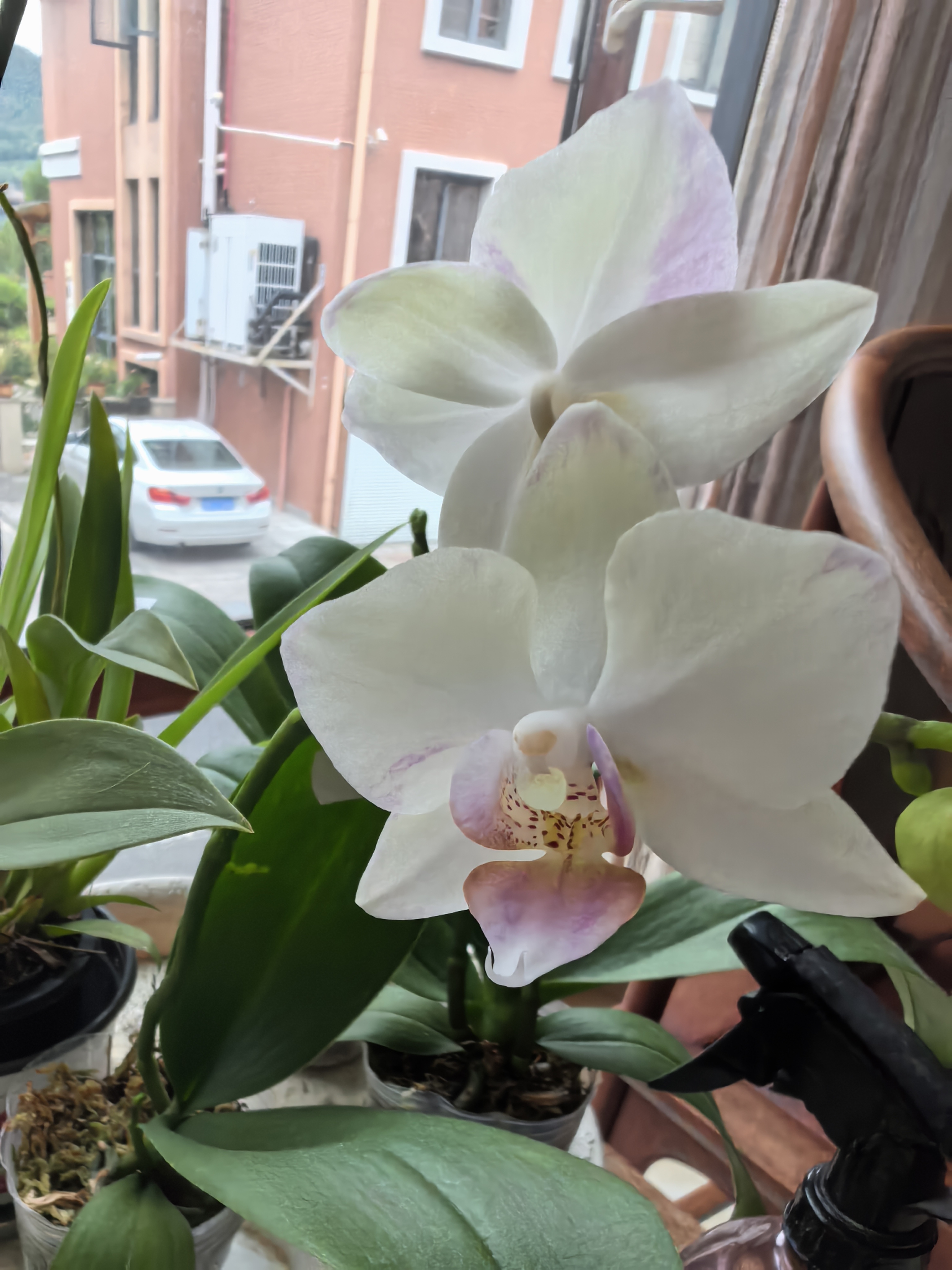 白色蝴蝶兰于窗台静绽,紫斑点染,绿叶扶疏。自然光照下,盆栽自成一隅清幽。