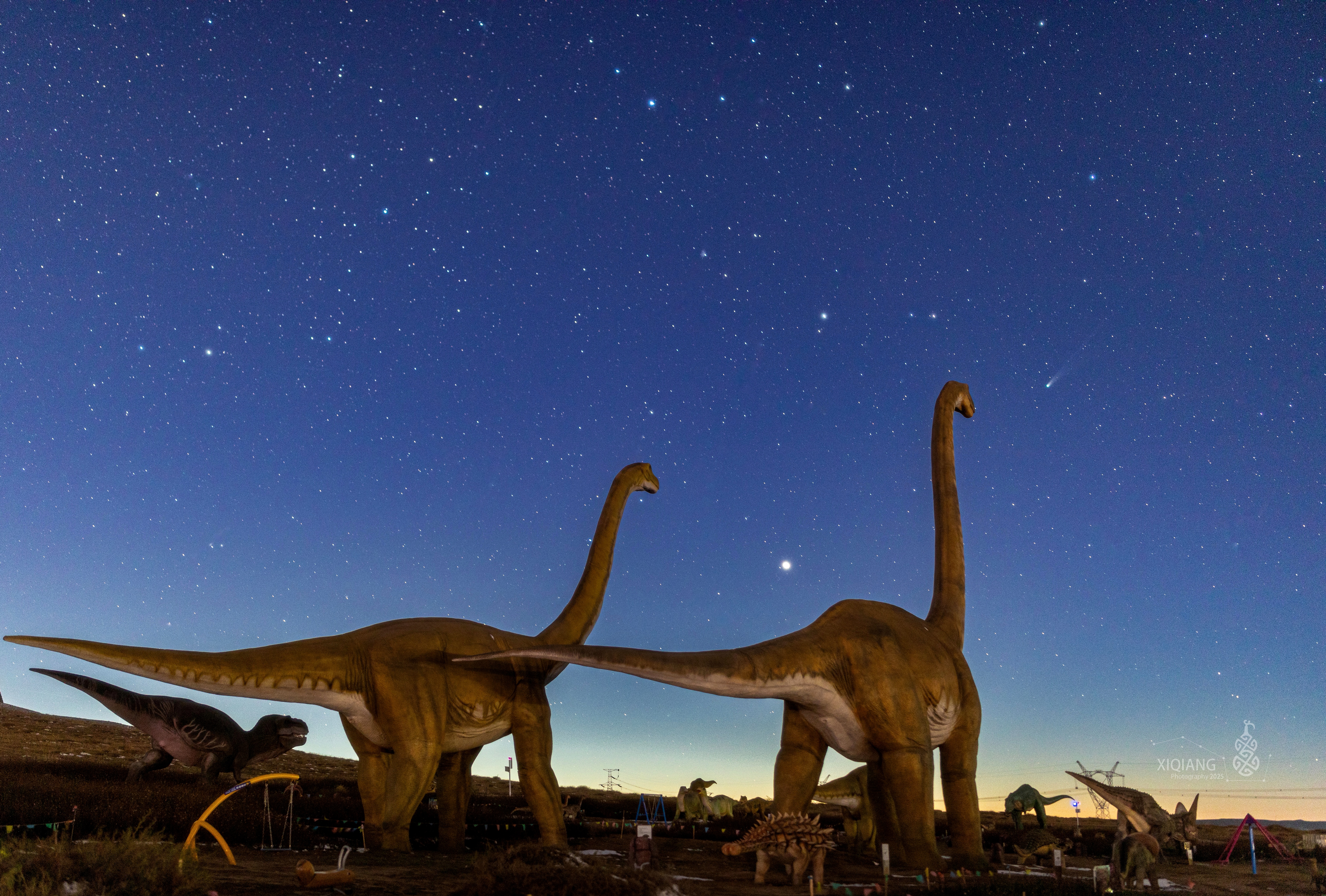在内蒙古乌兰哈达火山脚下的恐龙公园,我拍到了A6莱蒙彗星,自唐朝开始1350年后又一次光顾地球。仰天地之大,知众生之渺小。 当彗星的轨迹坠入腕龙的眼眸,远古的脉搏便在星河里震颤。它们是大地的往昔,也是星海的访客,在这一瞬的定格里,史前与星际完成了最壮丽的握手。