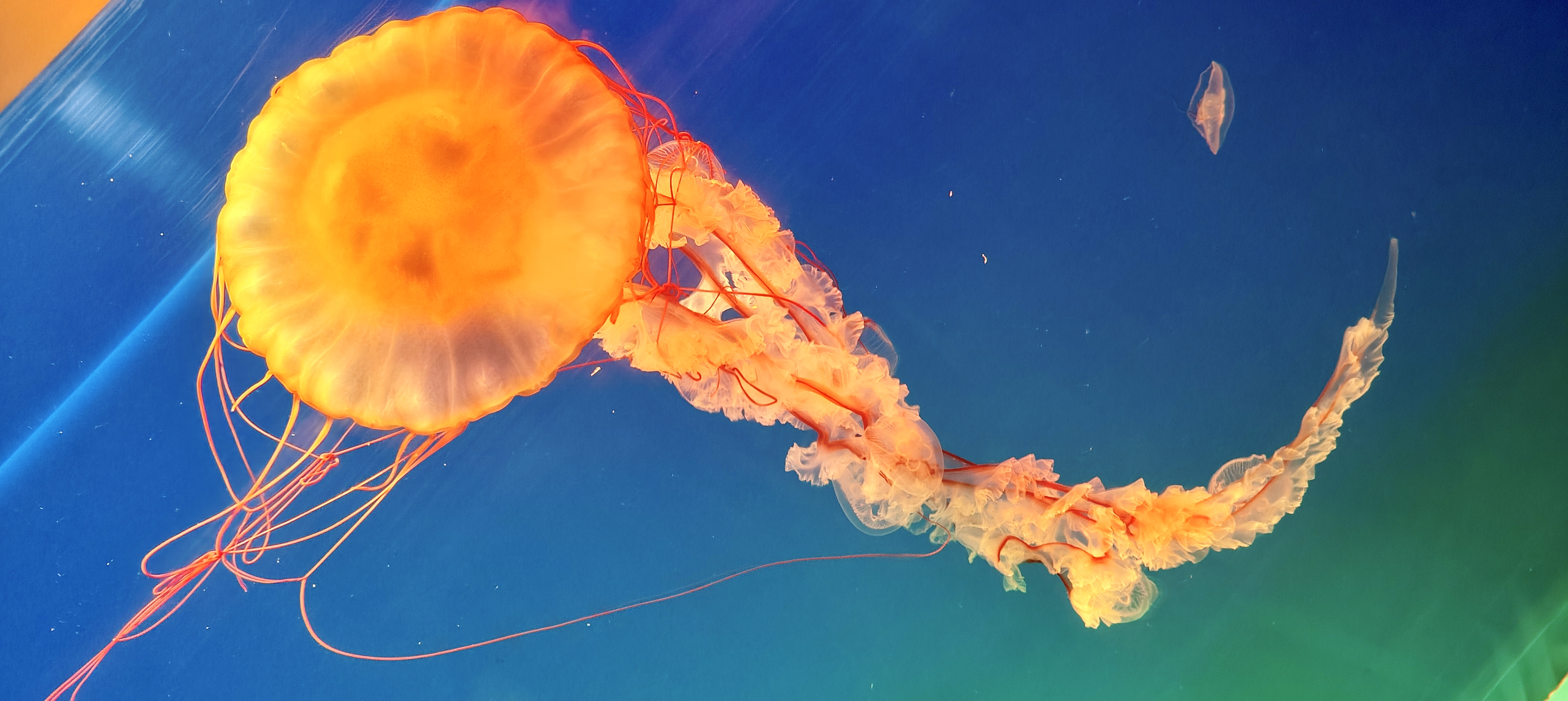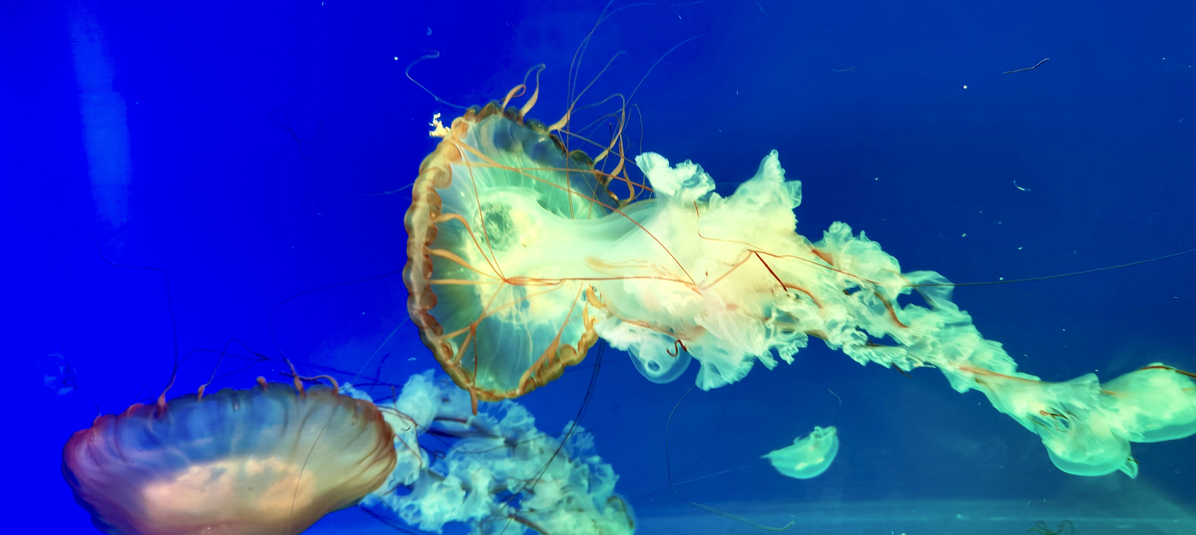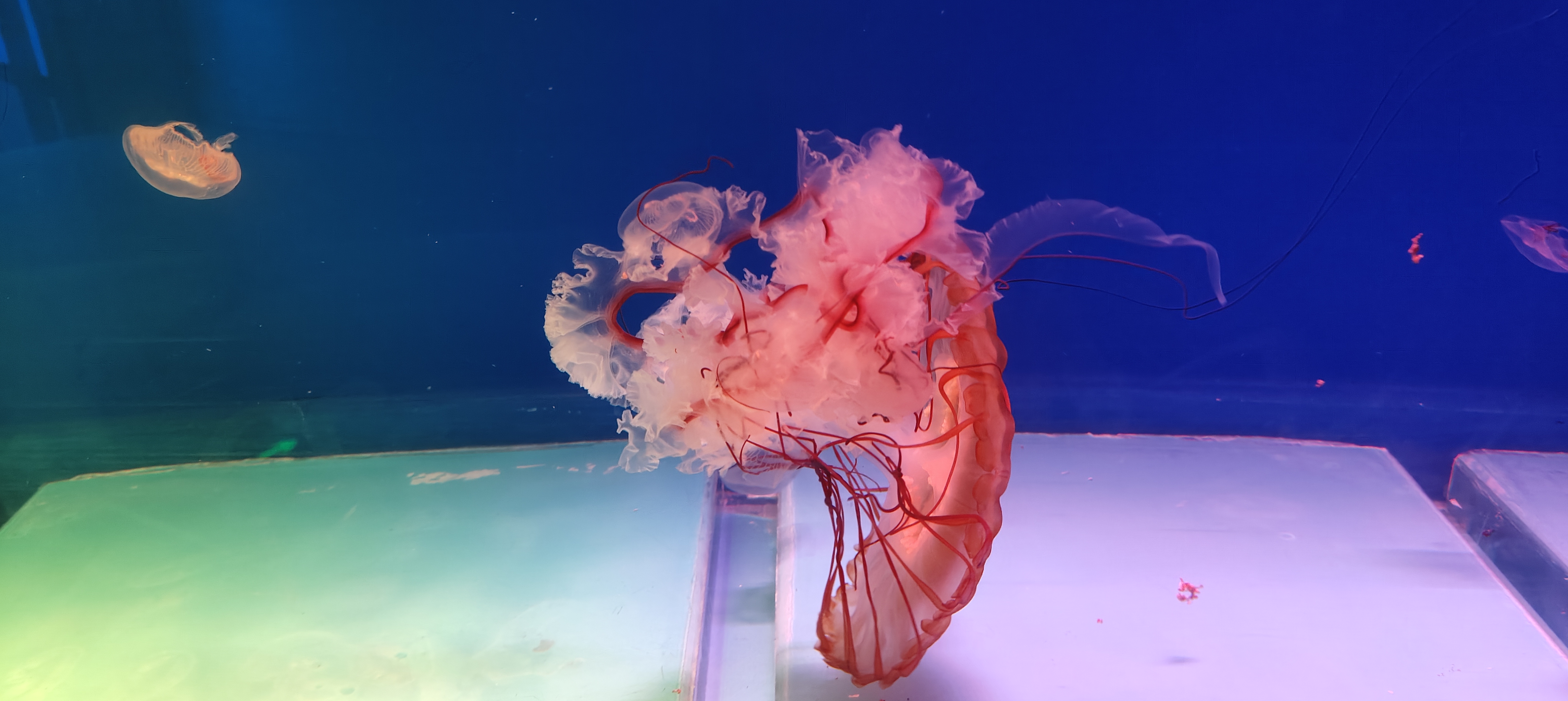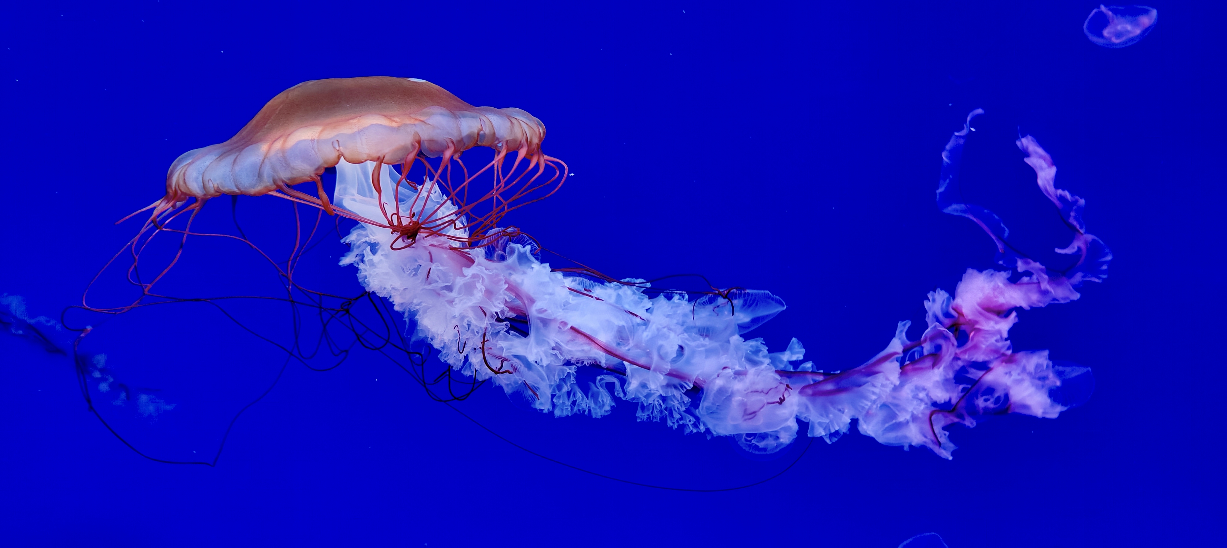 太平洋海刺水母在水中游曳,象高空中流动的白云那么闲适,似大地上春风吹拂的杨柳那么轻柔,又如少女手中挥舞的绸缎那么飘逸。令人目不暇接,美不胜收。