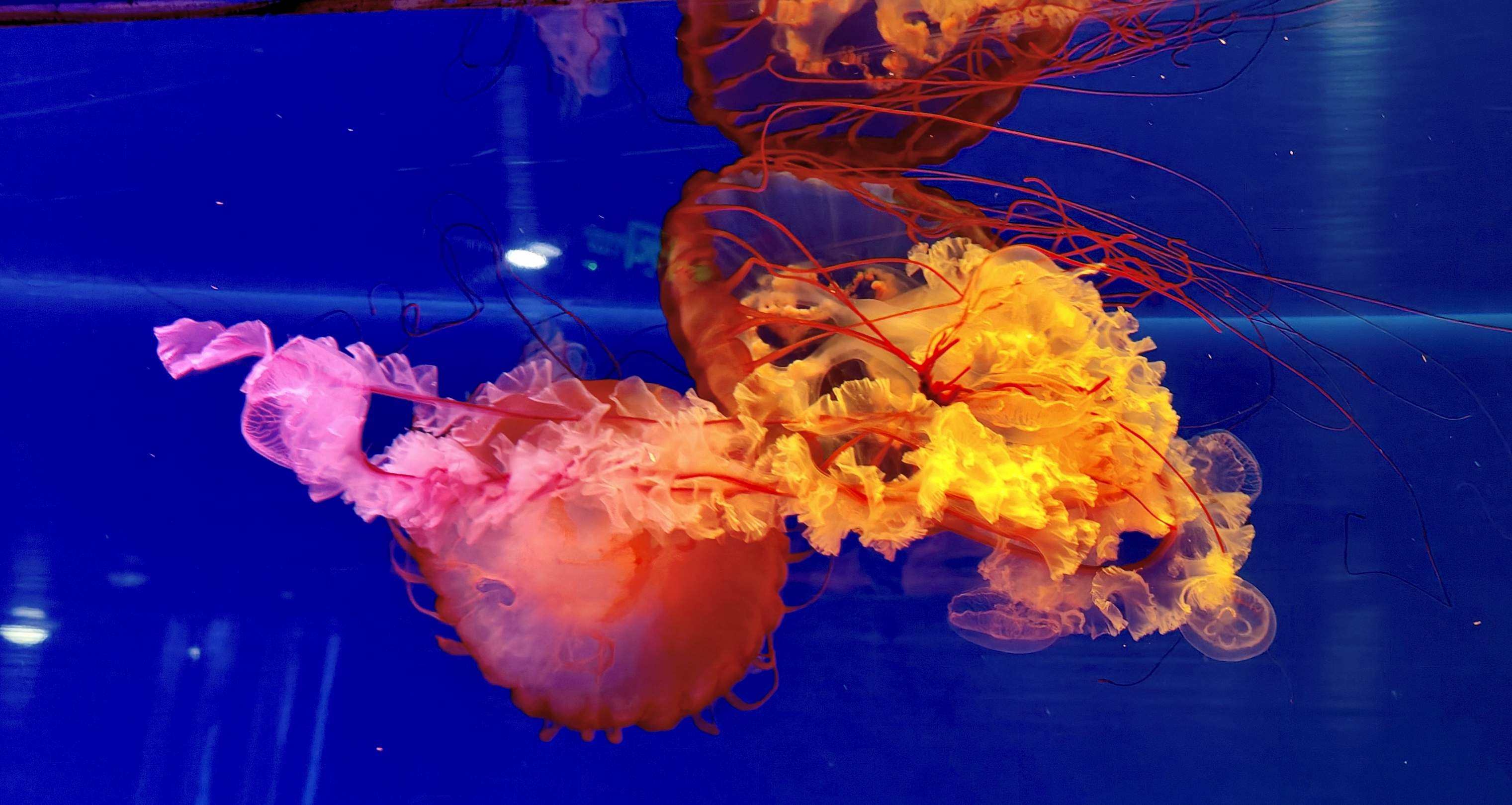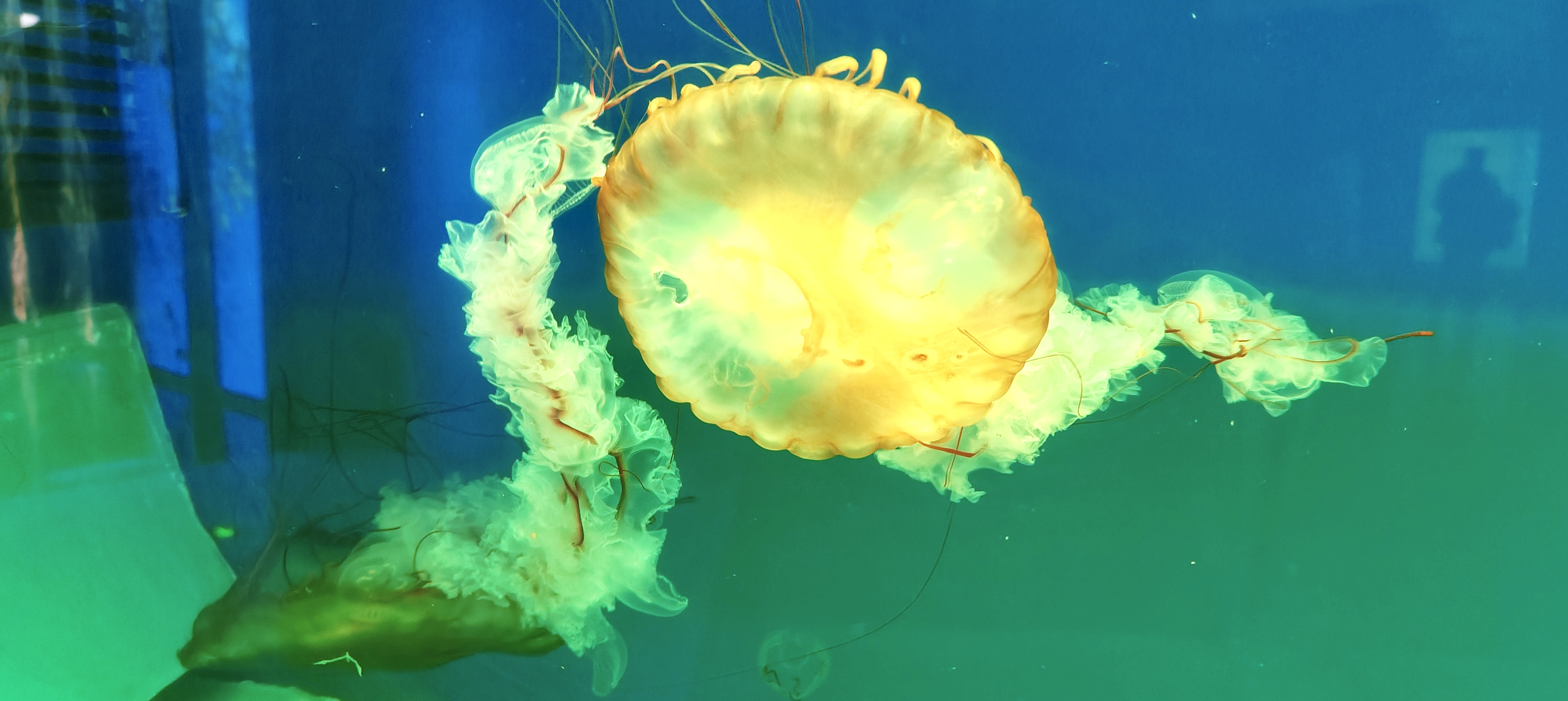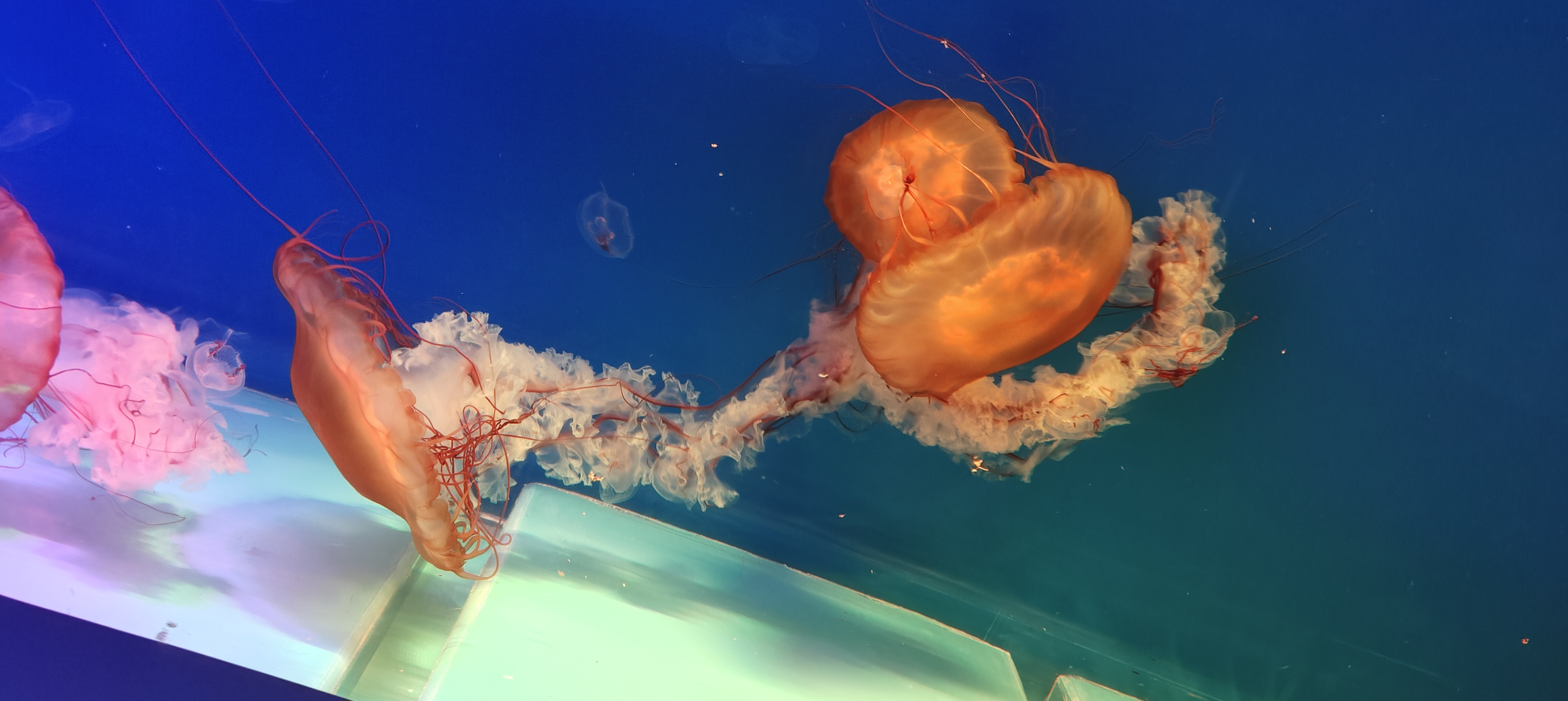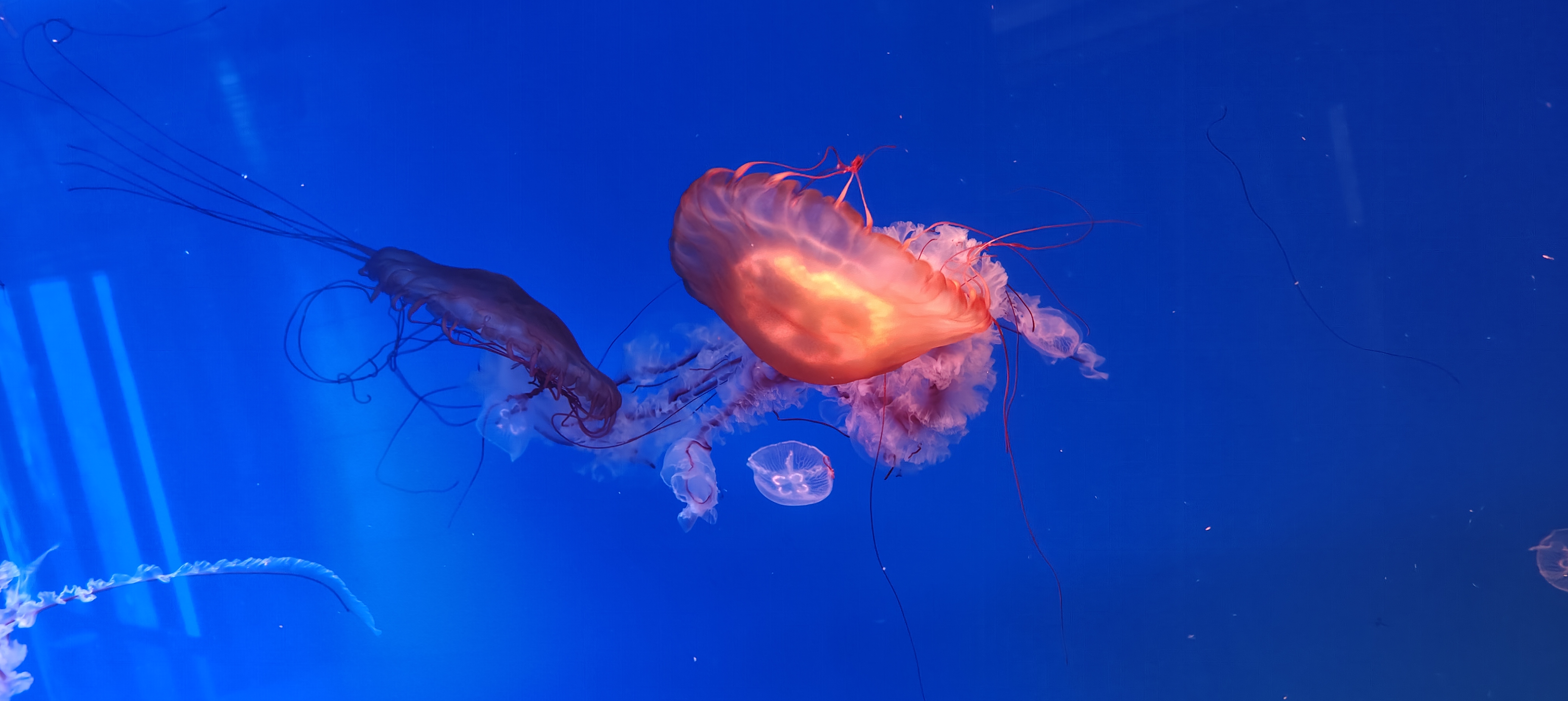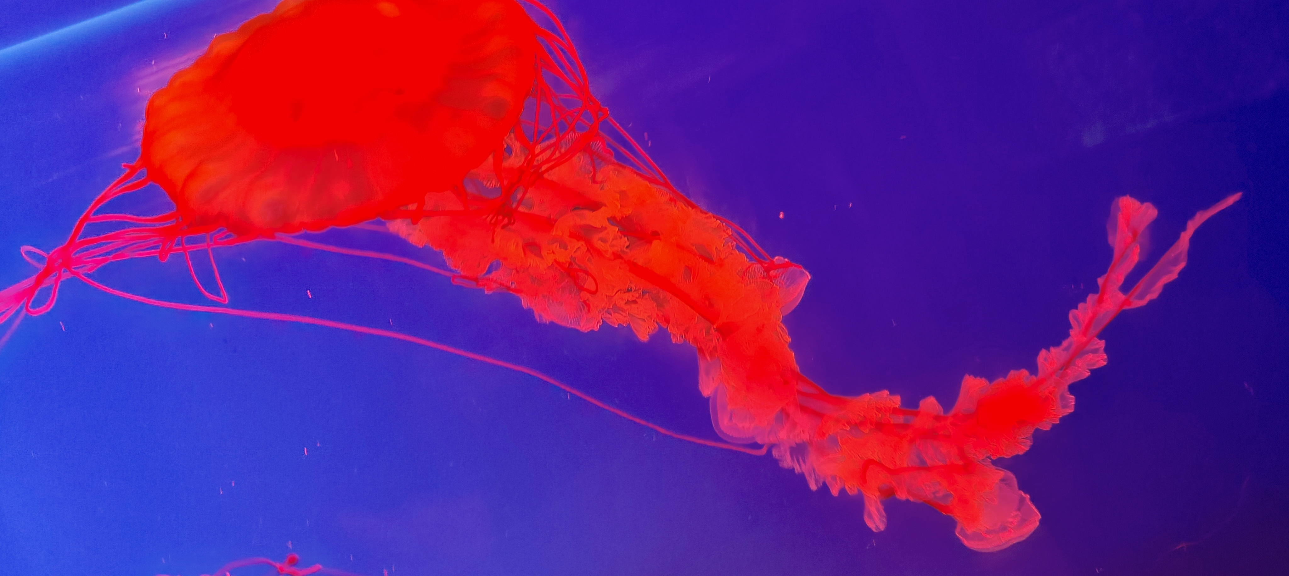 太平洋海刺水母在水中游曳,象高空中流动的白云那么闲适,似大地上春风吹拂的杨柳那么轻柔,又如少女手中挥舞的绸缎那么飘逸。令人目不暇接,美不胜收。