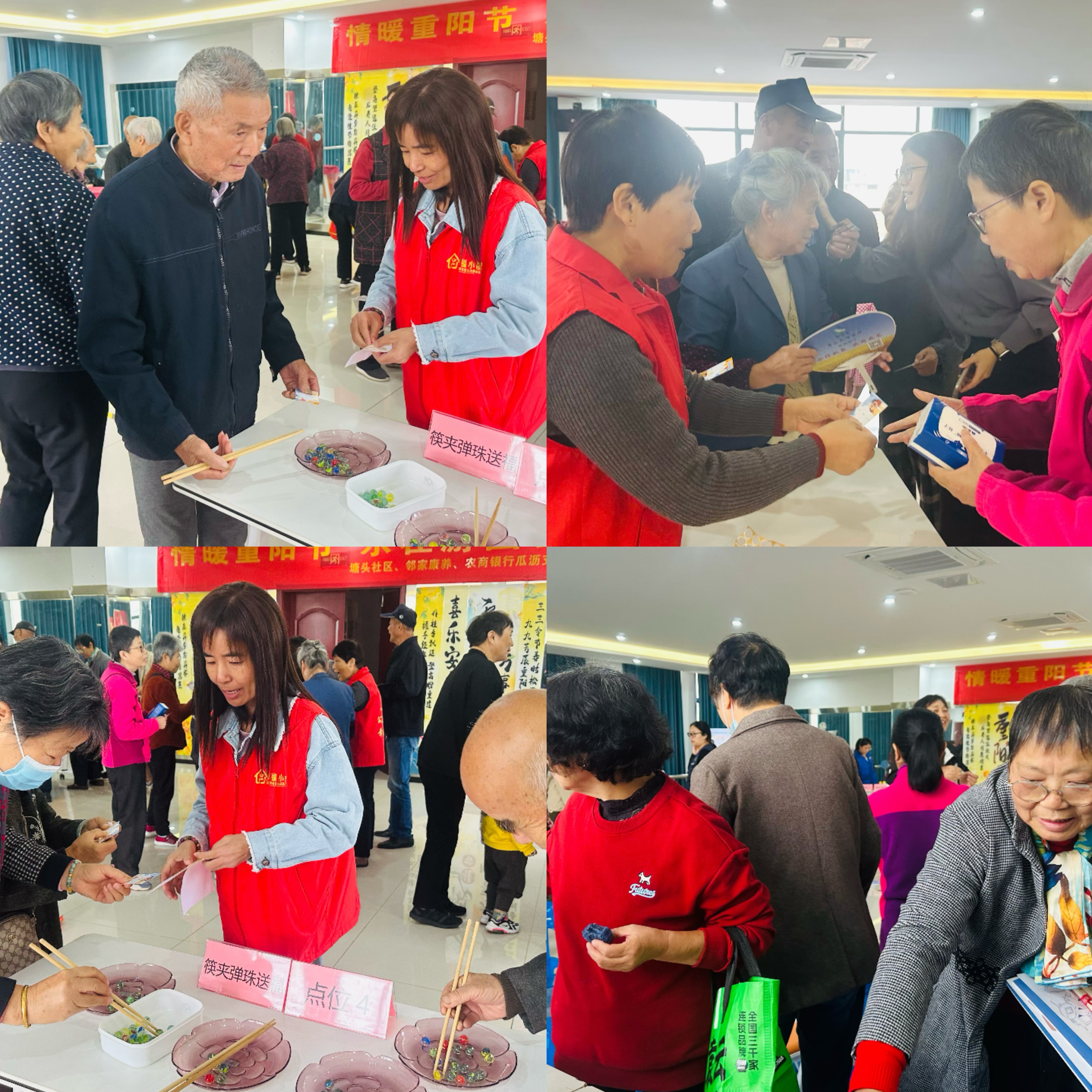 塘头社区“幸福小屋”重阳游园会温情上演,老友邻舍乐开怀 在金风送爽、丹桂飘香的重阳佳节,塘头社区“幸福小屋”精心策划并举办了一场以“敬老睦邻,乐享重阳”为主题的趣味游园会。活动旨在弘扬中华民族尊老敬老的传统美德,丰富社区长者的精神文化生活,营造和谐温馨的社区氛围。 游园会现场欢声笑语,气氛热烈。一系列精心设计的怀旧趣味游戏,让长者们仿佛回到了快乐的童年时光。在“赶鸡进笼”环节,老人们手持细杆,小心翼翼地引导“小鸡”归巢,那份专注与童趣引得周围观众阵阵喝彩;“蒙眼转圈敲锣”更是将活动推向高潮,参与者转圈后虽步履蹒跚,却依然执着地摸索前行,周围善意的方向提示与最终敲响锣声的喜悦交织在一起,充满了欢乐;“水上吹乒乓球”则考验着大家的肺活量与技巧,看着乒乓球在水杯中轻盈跳跃,成功者的脸上洋溢着自豪的笑容。 此次重阳游园会不仅让社区长者们锻炼了身体、愉悦了心情,更为他们提供了一个交流互动的平台,增进了邻里之间的情感,真正体现了“幸福小屋”提升居民幸福感与归属感的宗旨,为塘头社区的和谐画卷添上了浓墨重彩的一笔。
